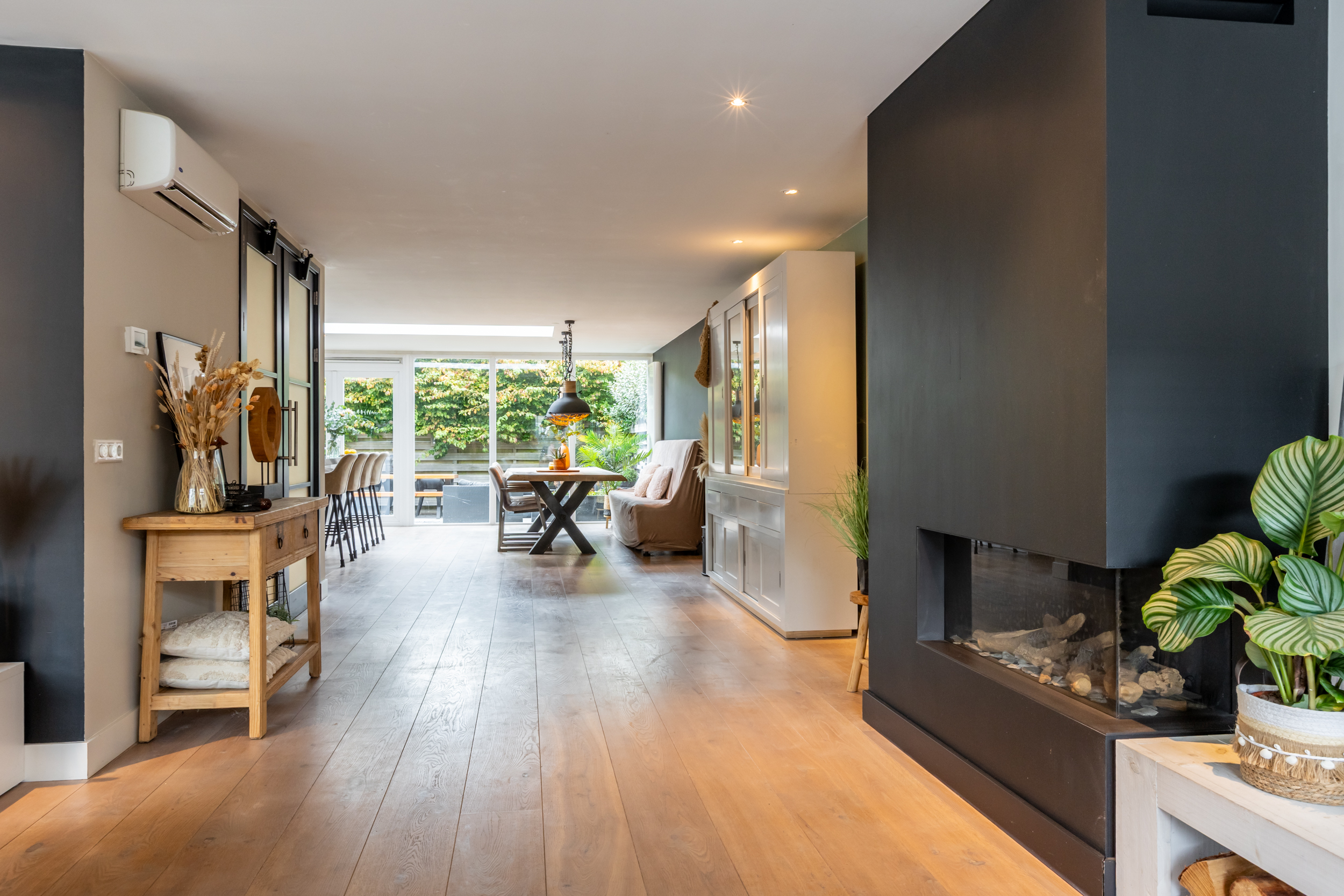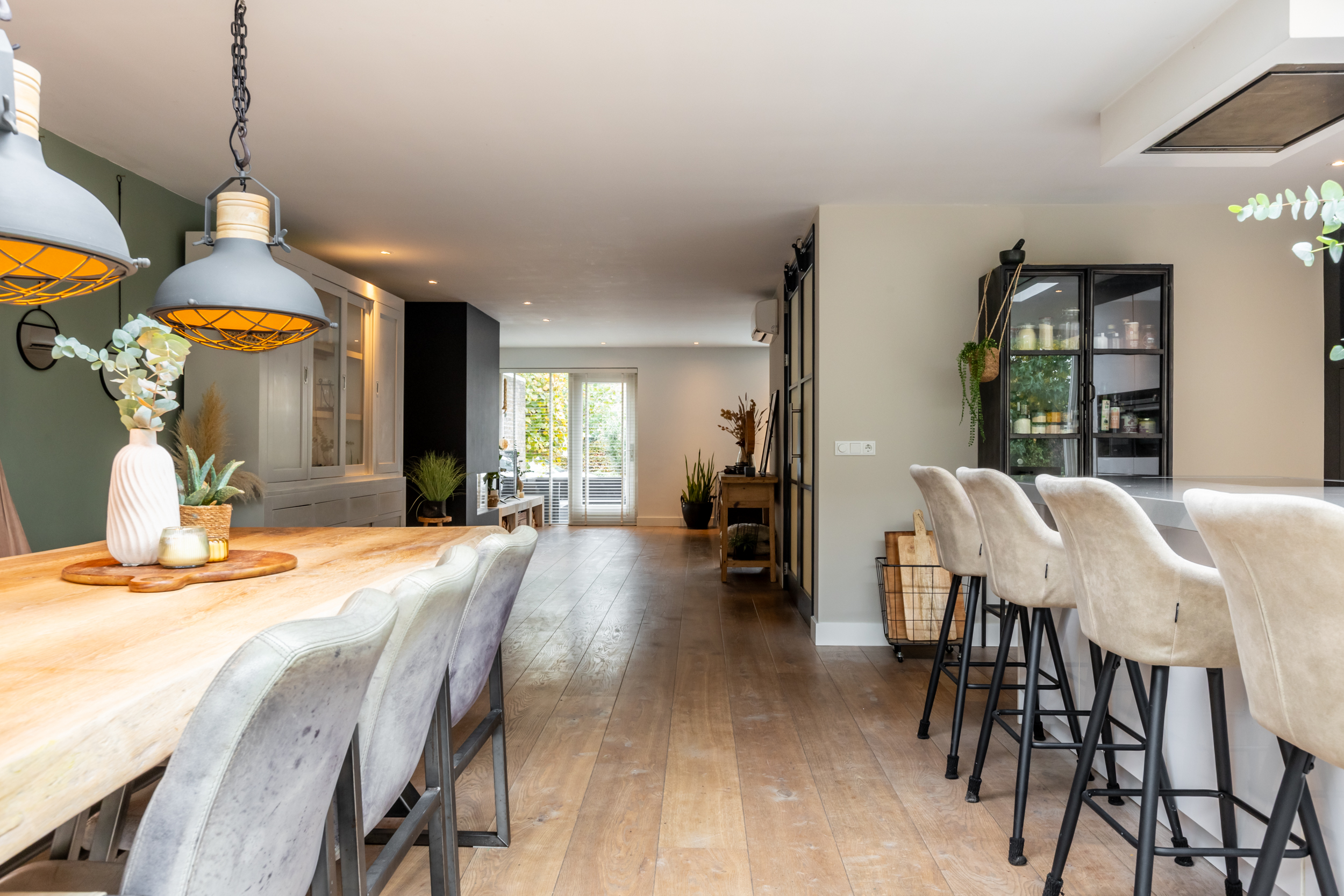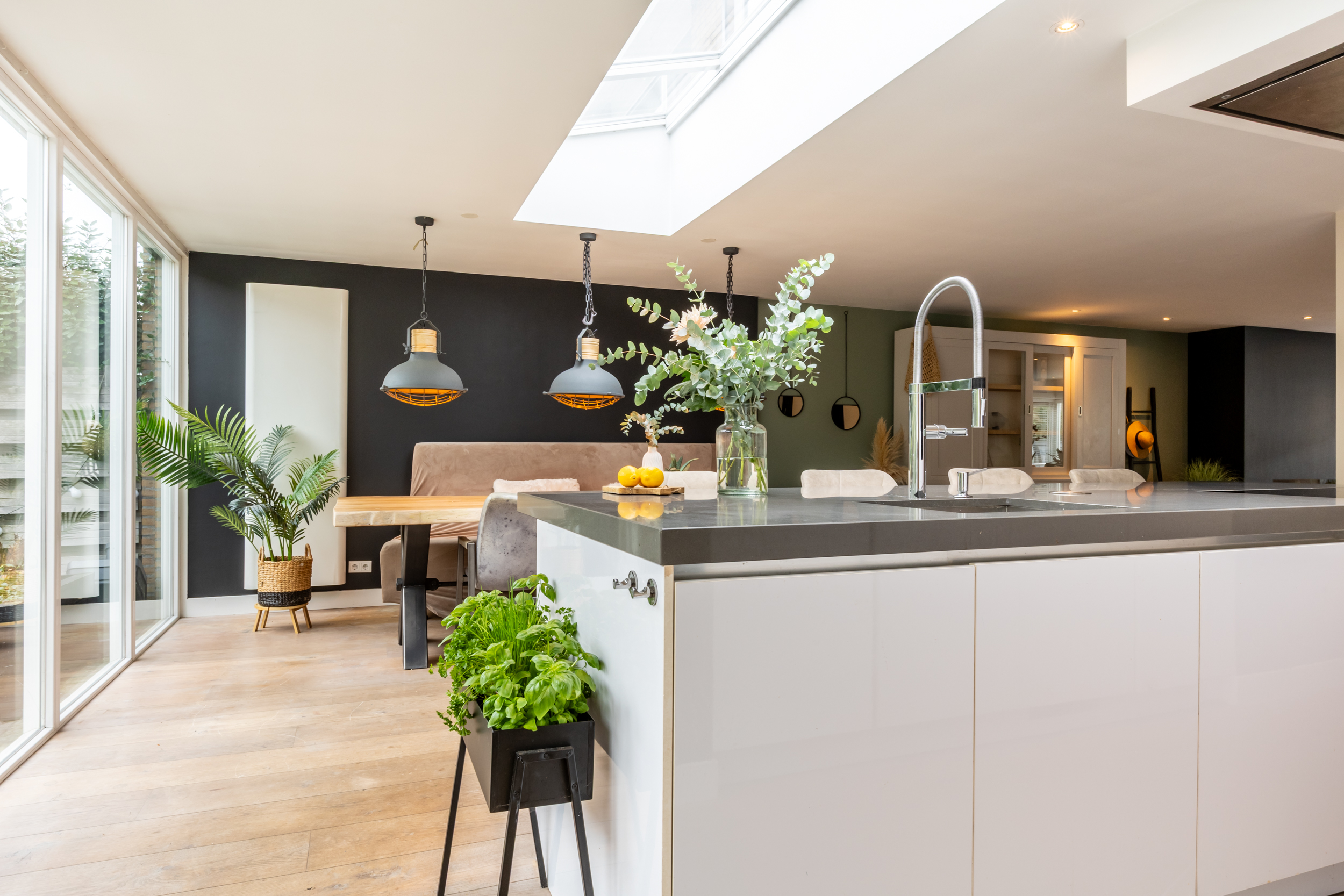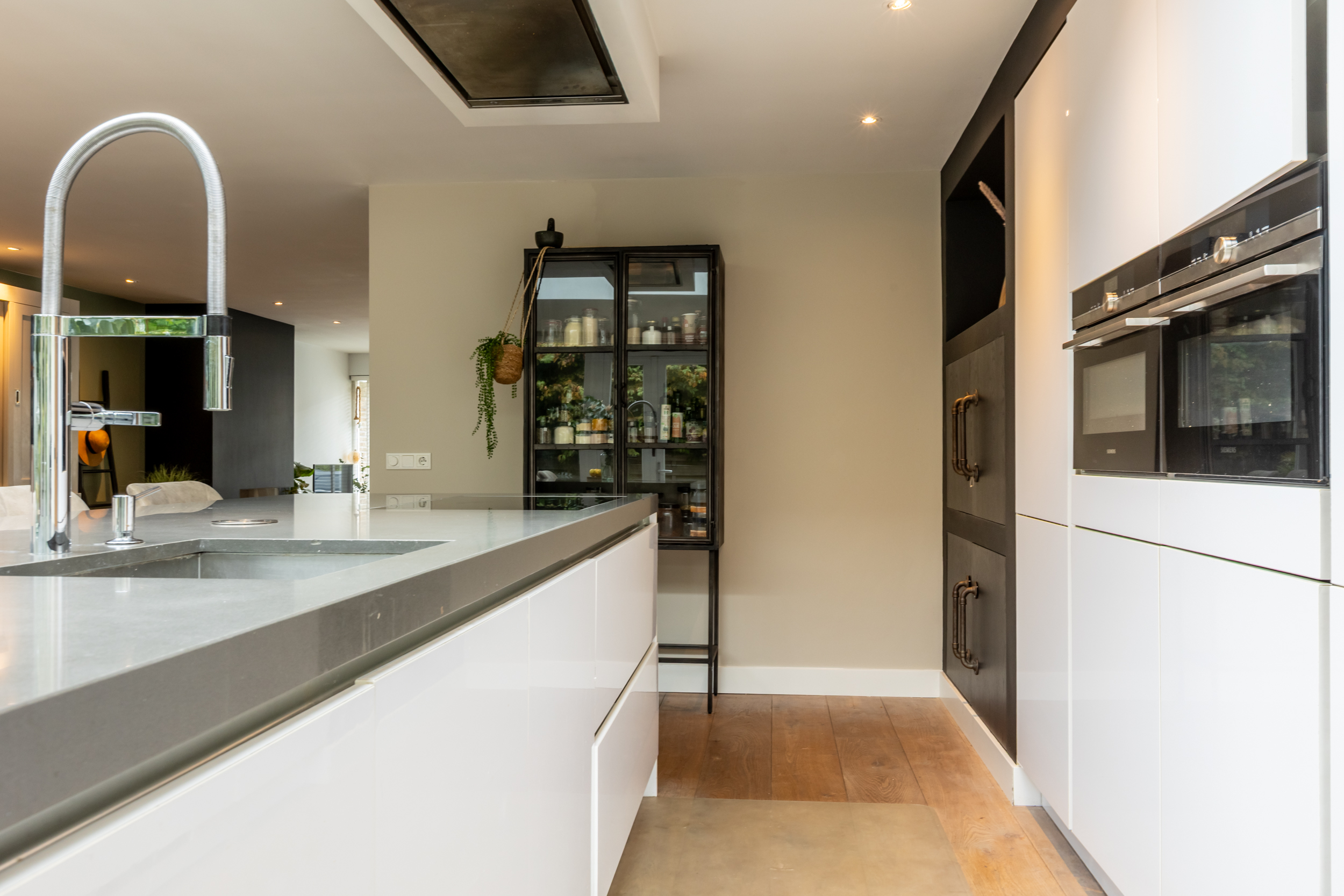 Riante, lichte woonkamer met gashaard (2016), airco, inbouwspots en openslaande deuren naar het terras aan de voorzijde. De in 2016 gerealiseerde luxe woonkeuken met aanbouw is een echte eyecatcher: grote glazen pui, lichtstraat, openslaande deuren naar de tuin en een royaal kook-/spoeleiland met Siemens-inductieplaat (5-pits), vaatwasser, composiet werkblad, close-in boiler en volop kastruimte. Daarnaast een kastenwand met onder andere koelkast, vriezer, combi-oven/magnetron, oven/stoomoven en barista-hoek.