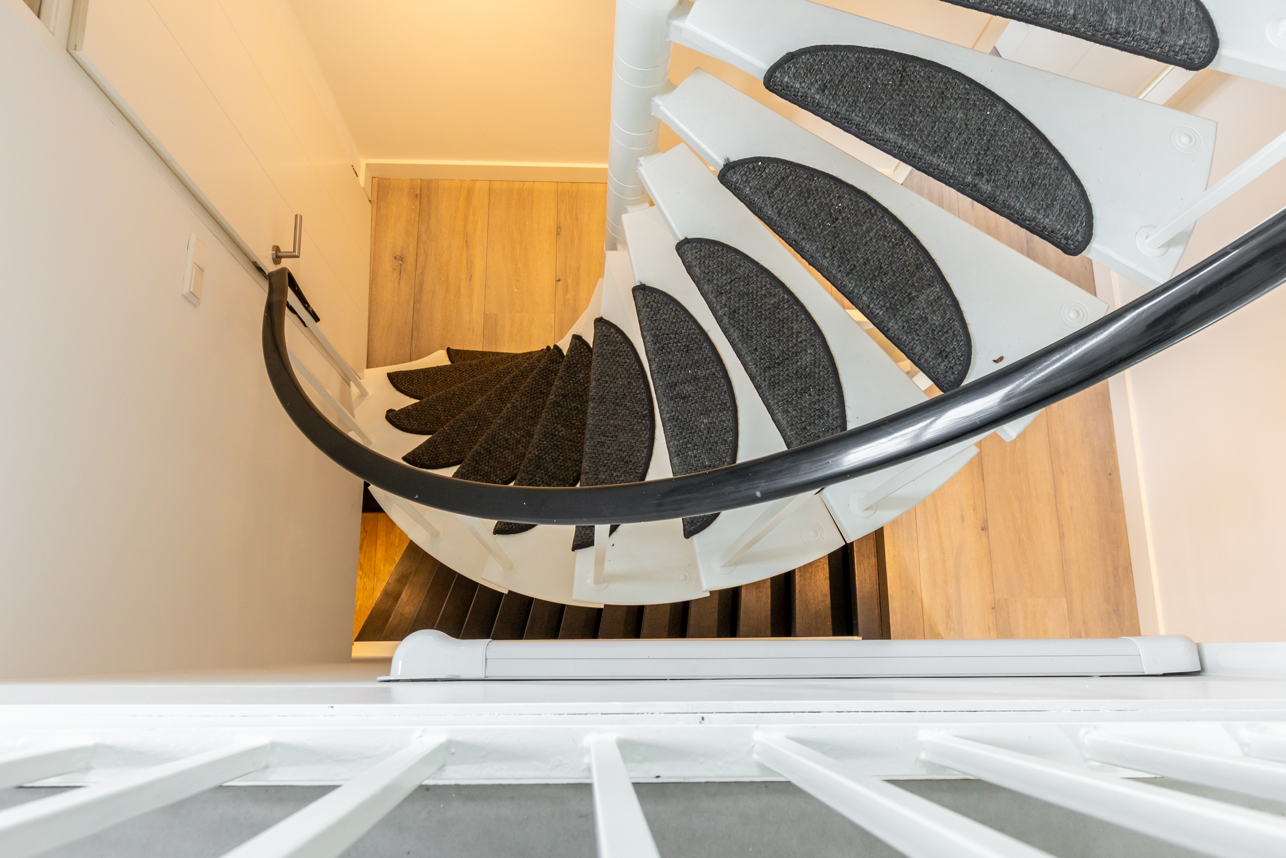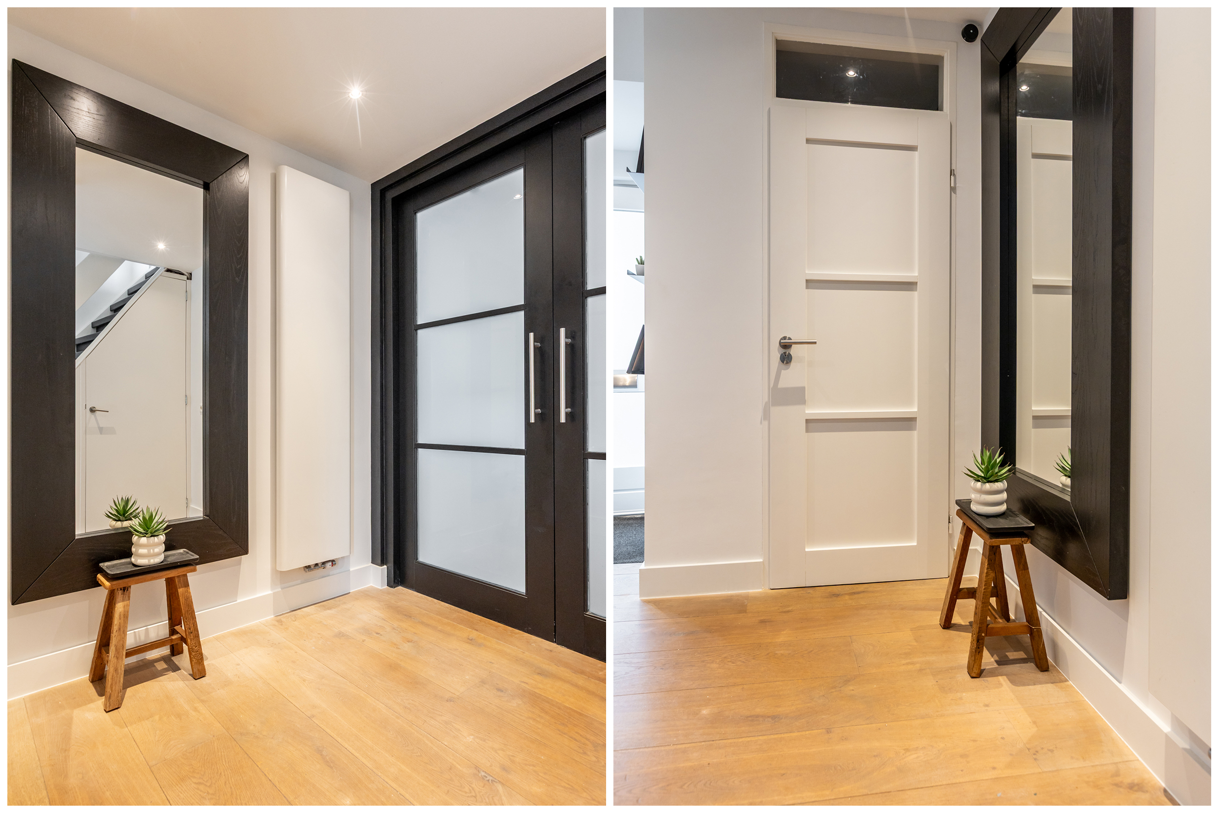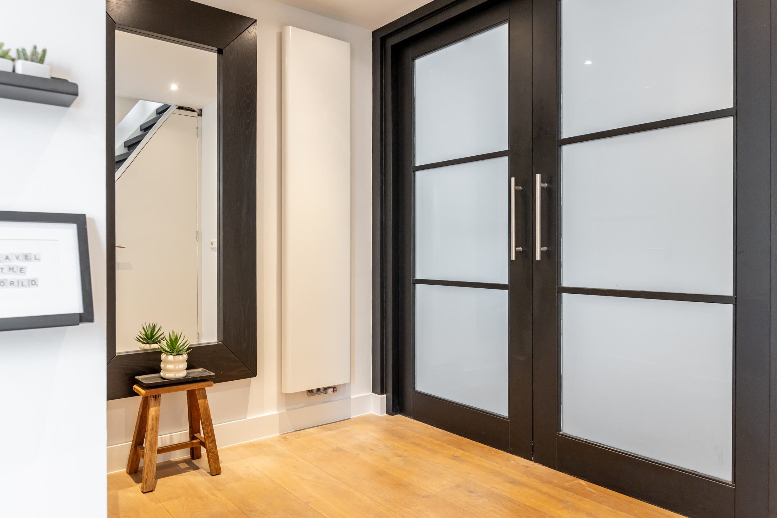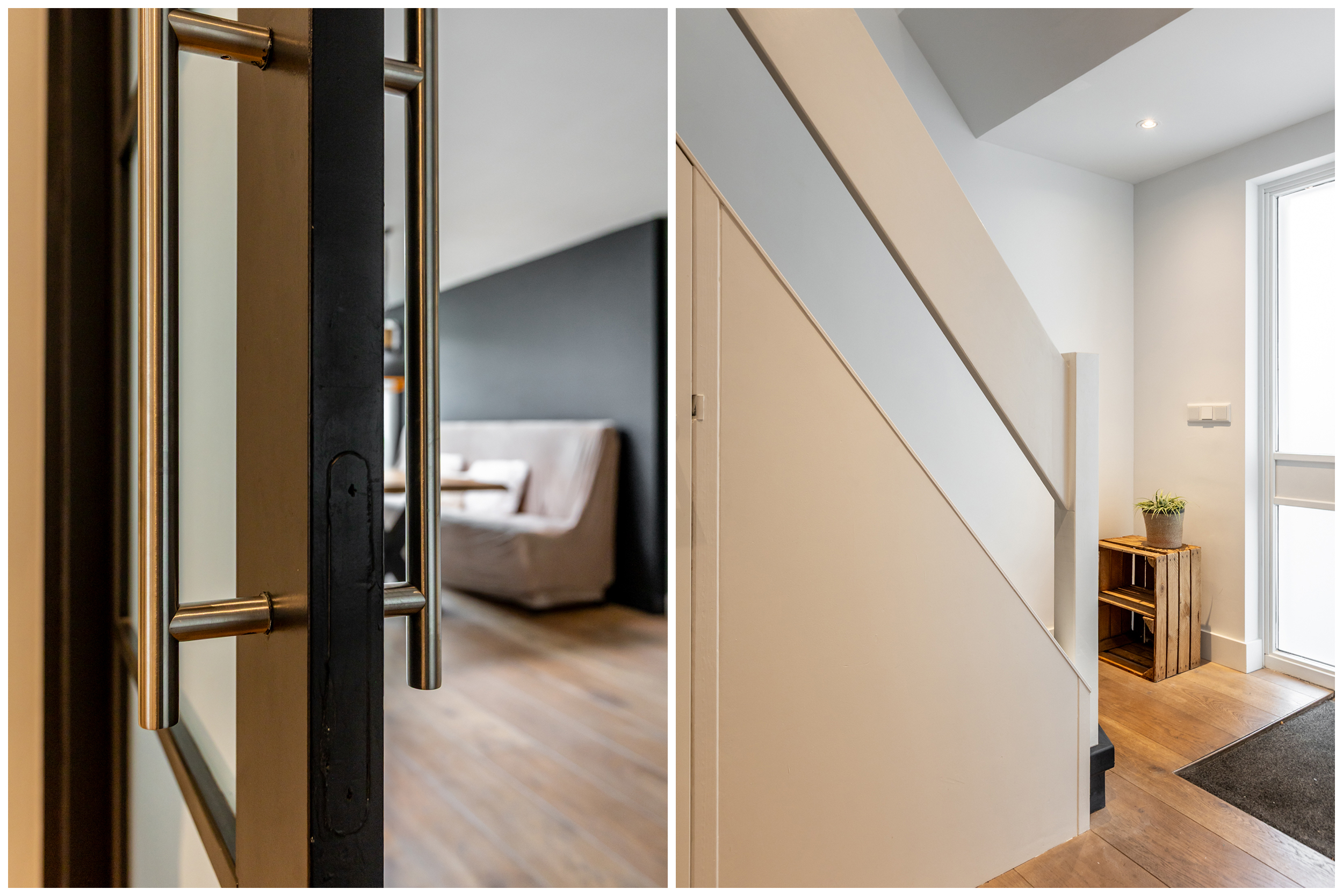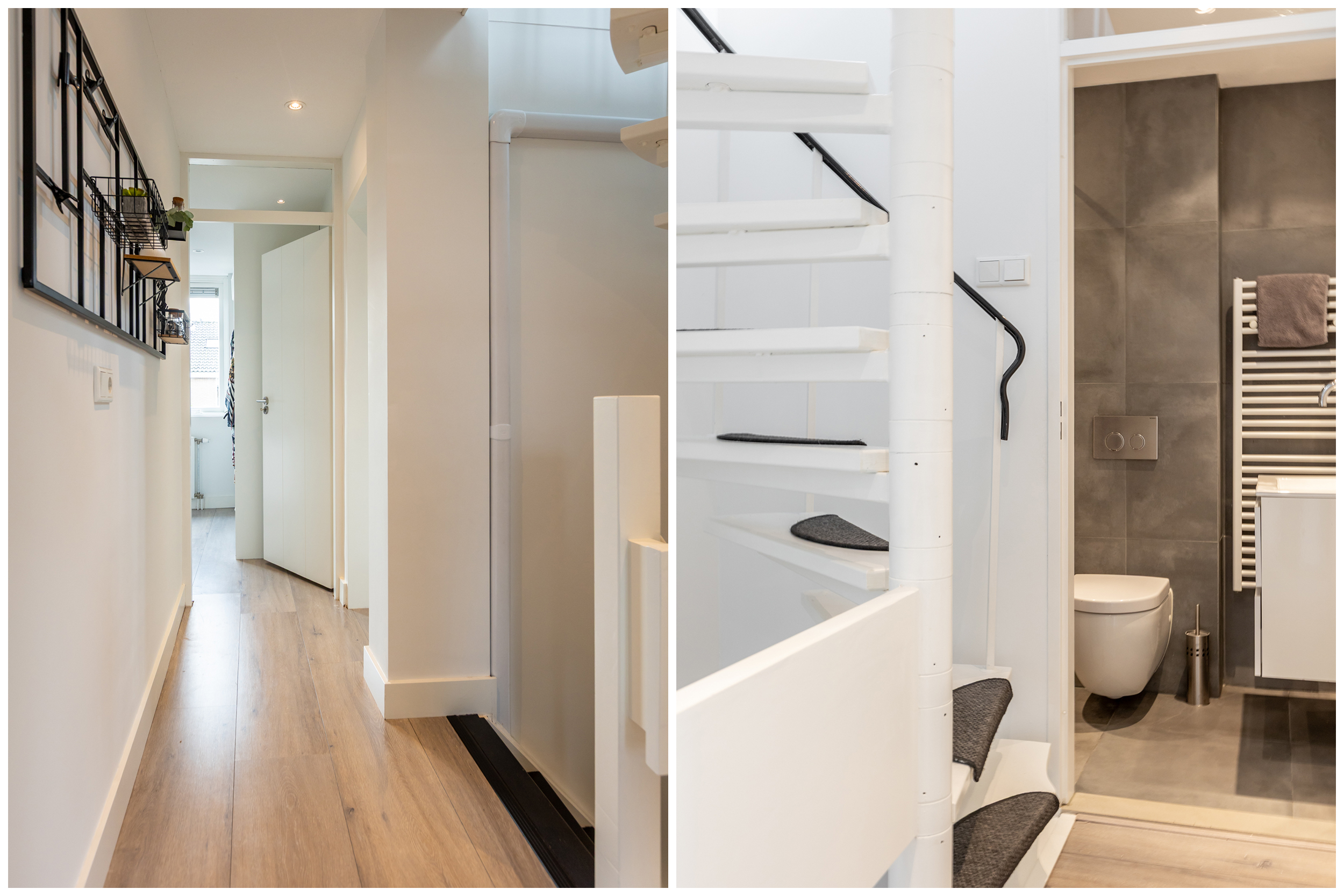 Entree met vernieuwde meterkast (11 groepen, 3 aardlekschakelaars). Hal met strak stucwerk, inbouwspots en een modern toilet, volledig betegeld in grijs-witte tinten. Trapopgang met trapkast.