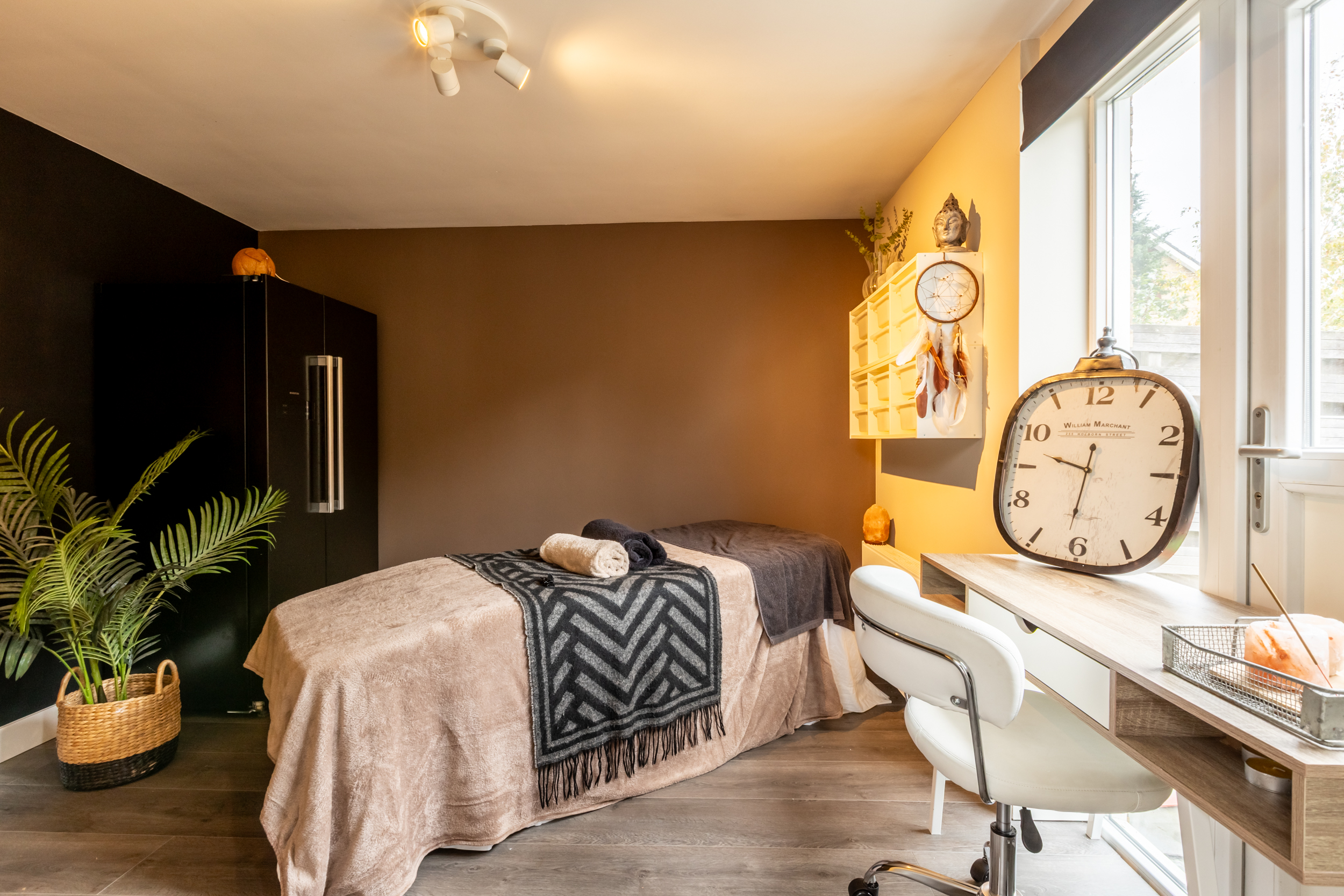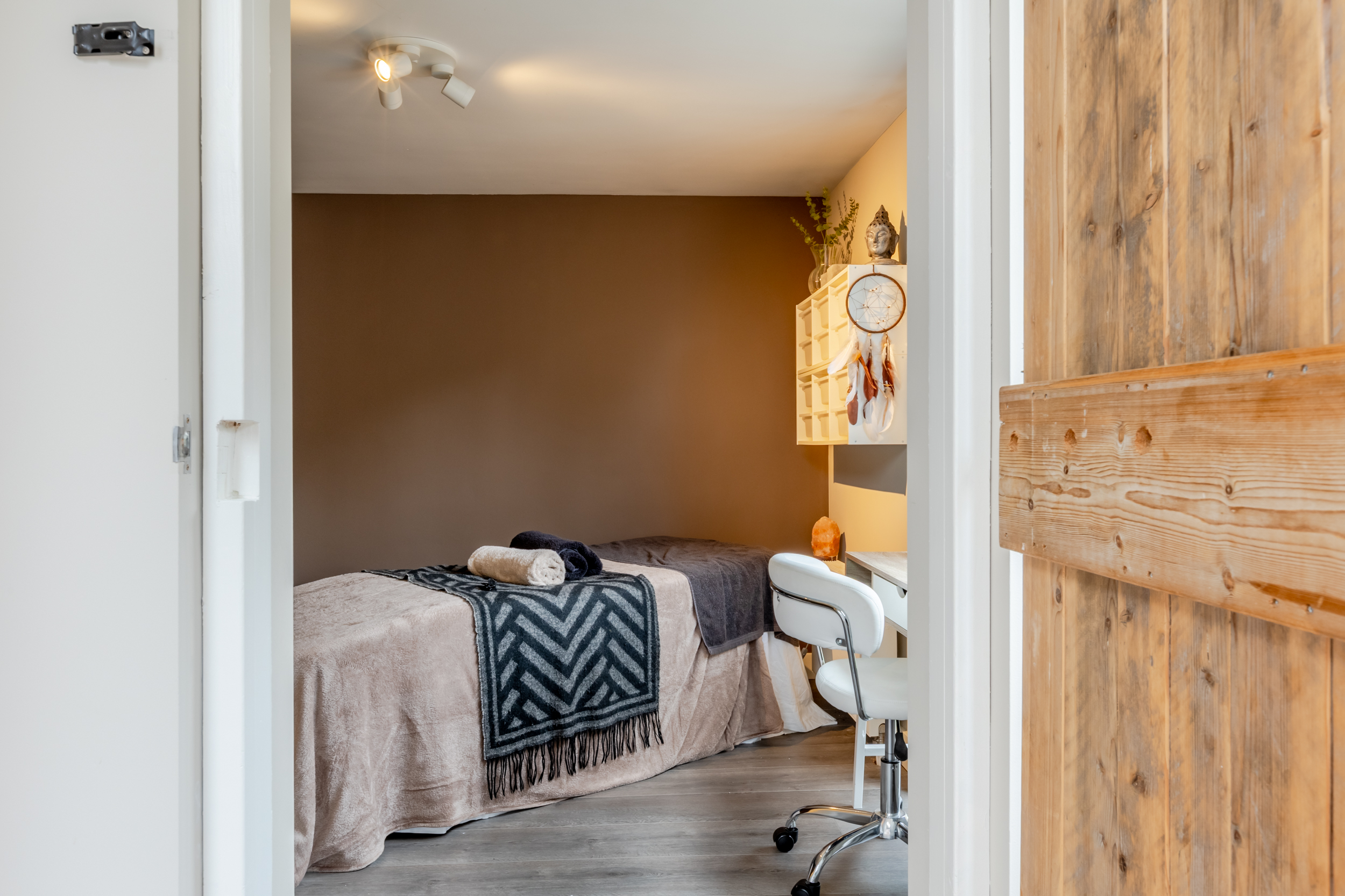 Aansluitend een multifunctionele (slaap)kamer / praktijkruimte met tuindeur en toegang tot de inpandige fietsenberging (elektra, openslaande deuren 2020).