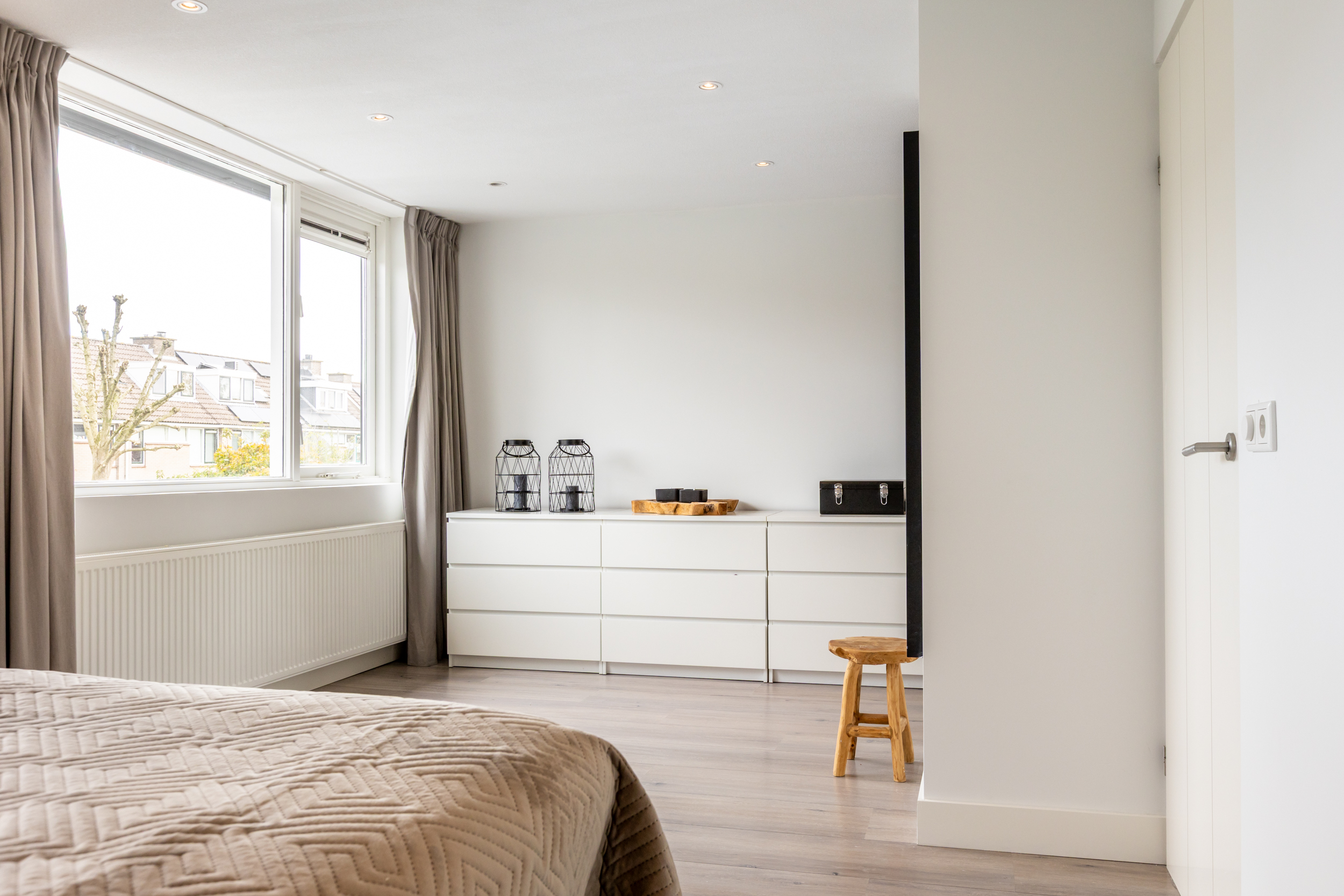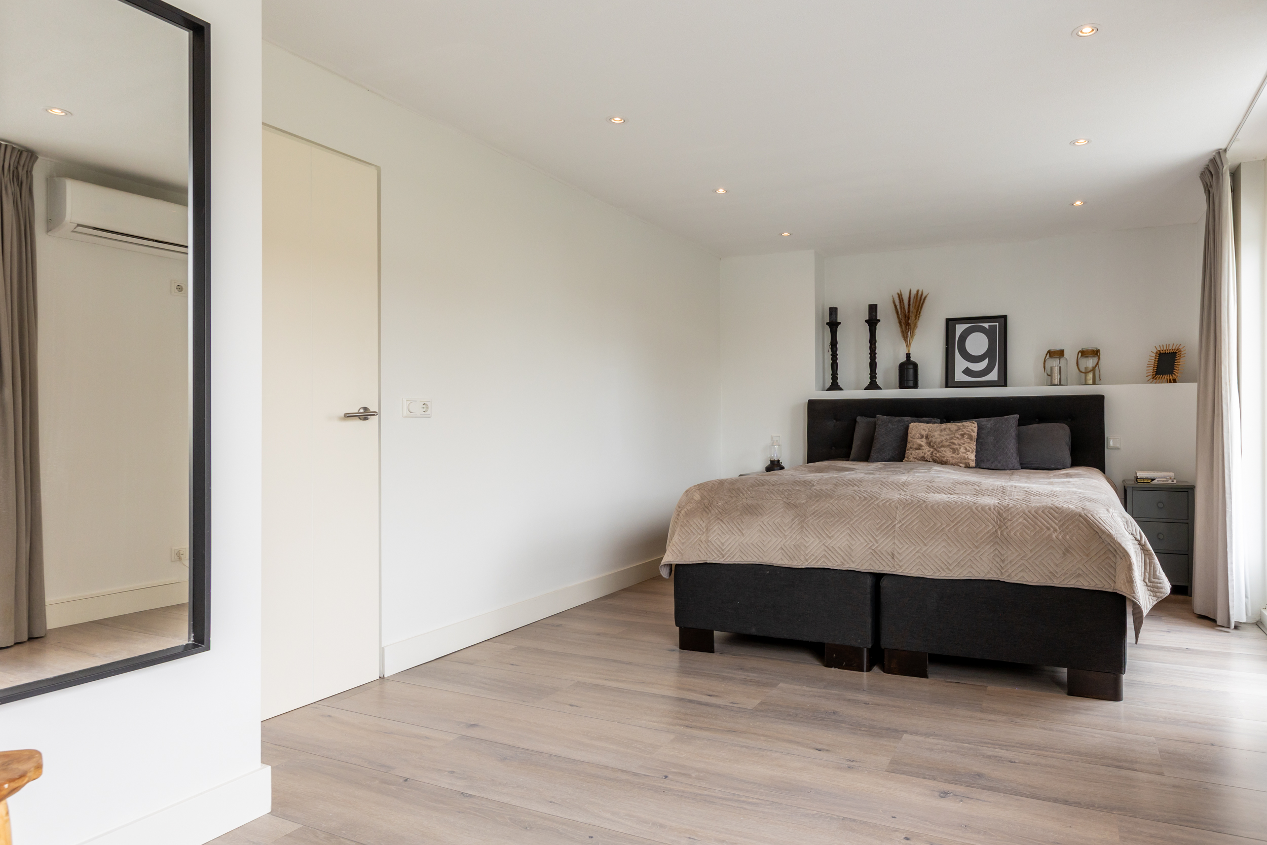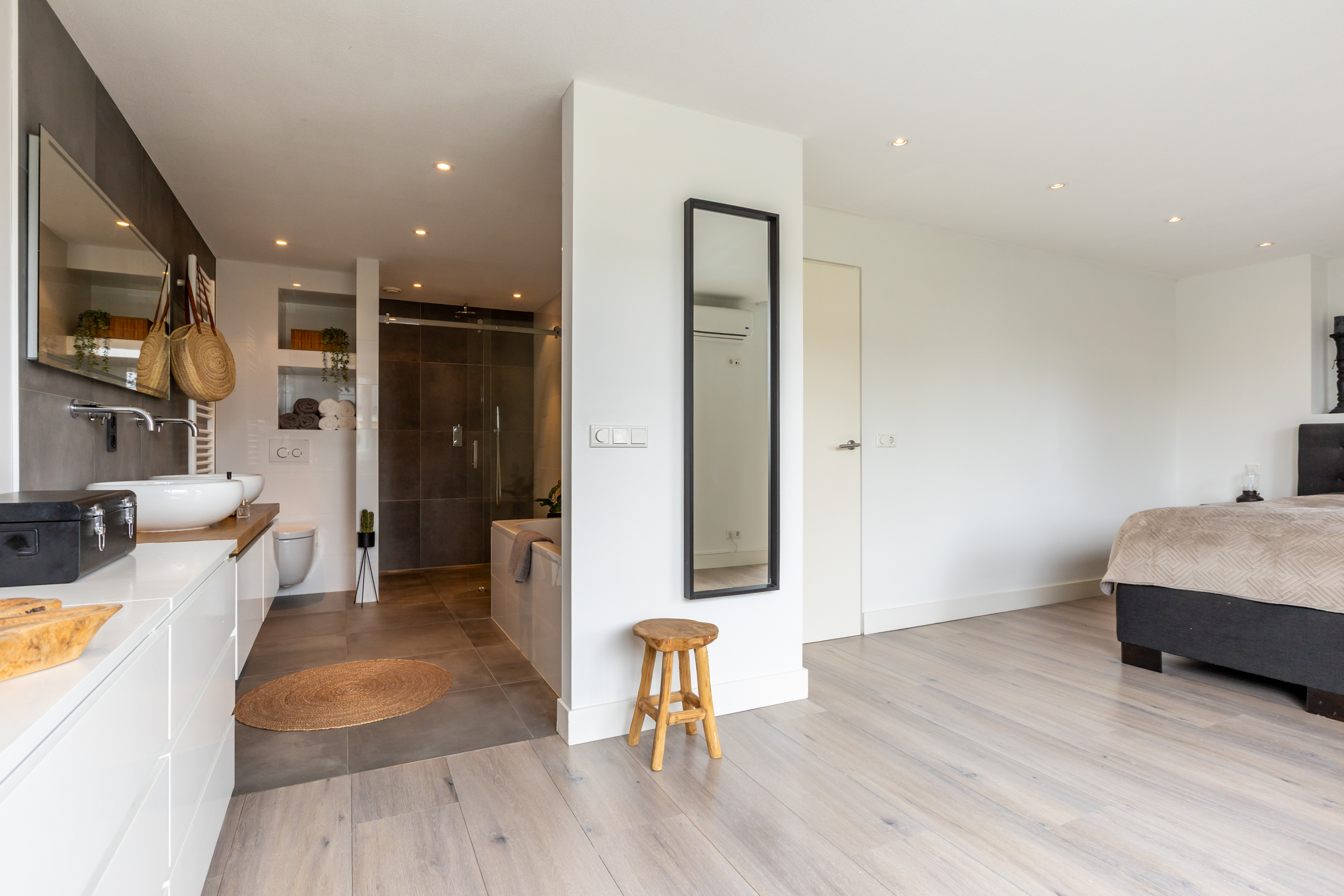 Aan de voorzijde bevindt zich een tweede, ruime slaapkamer met airconditioning. De derde slaapkamer is momenteel ingericht als royale inloopgarderobe, maar kan uiteraard weer als slaap- of werkkamer worden gebruikt. Daarnaast vindt u op deze verdieping een tweede moderne badkamer, compleet met inloopdouche, wandcloset, wastafelmeubel met opbergruimte en een designradiator.