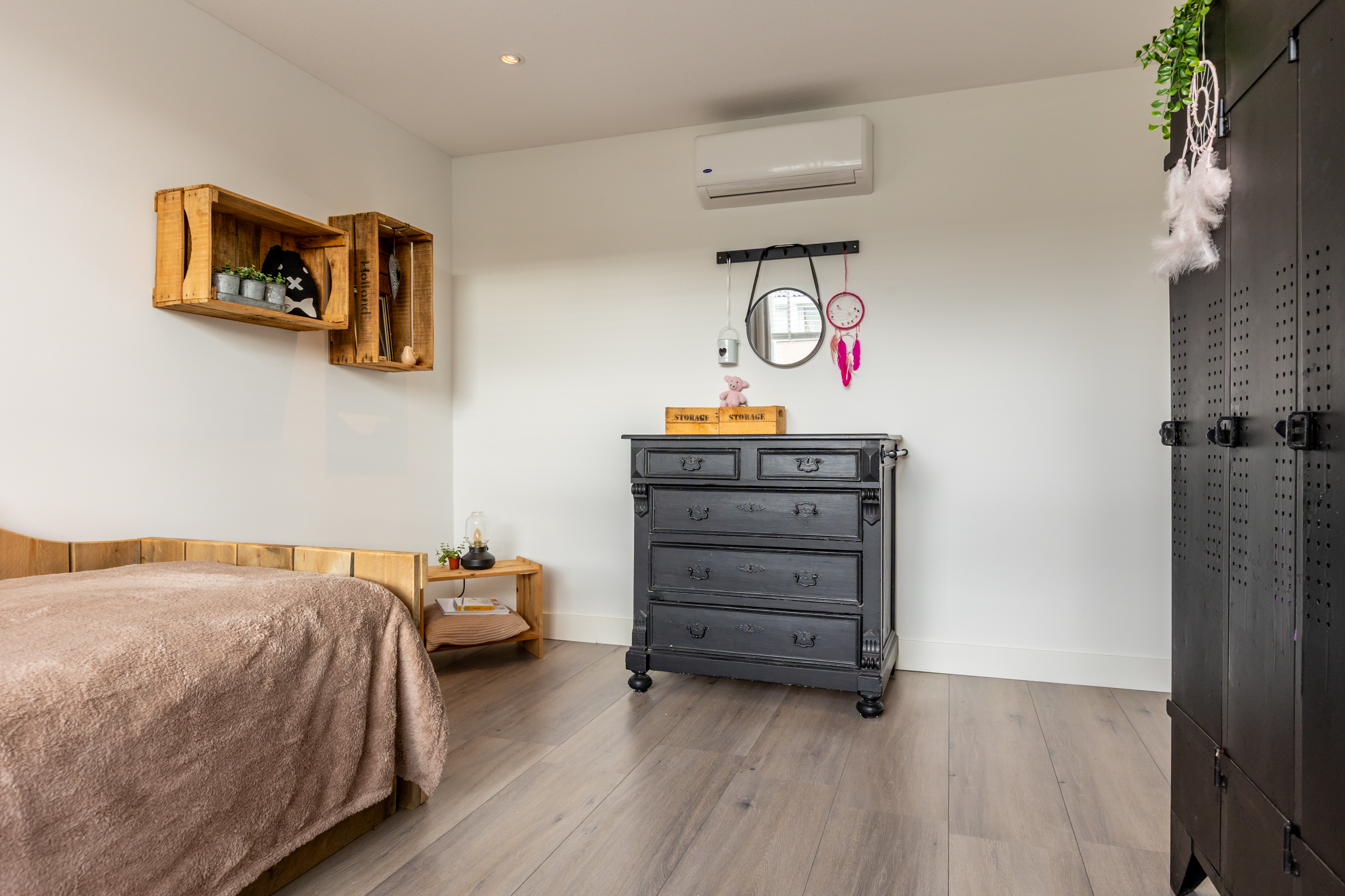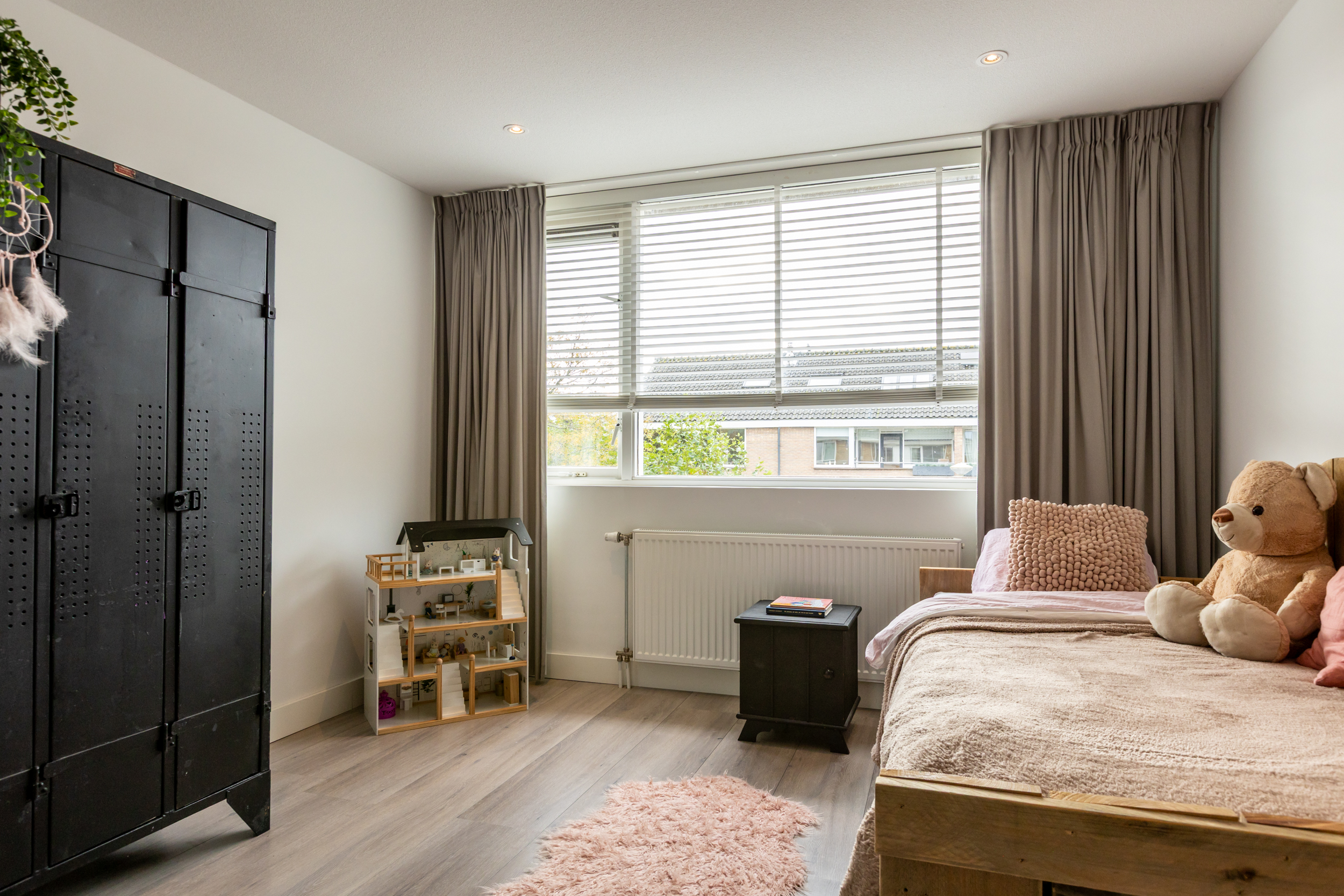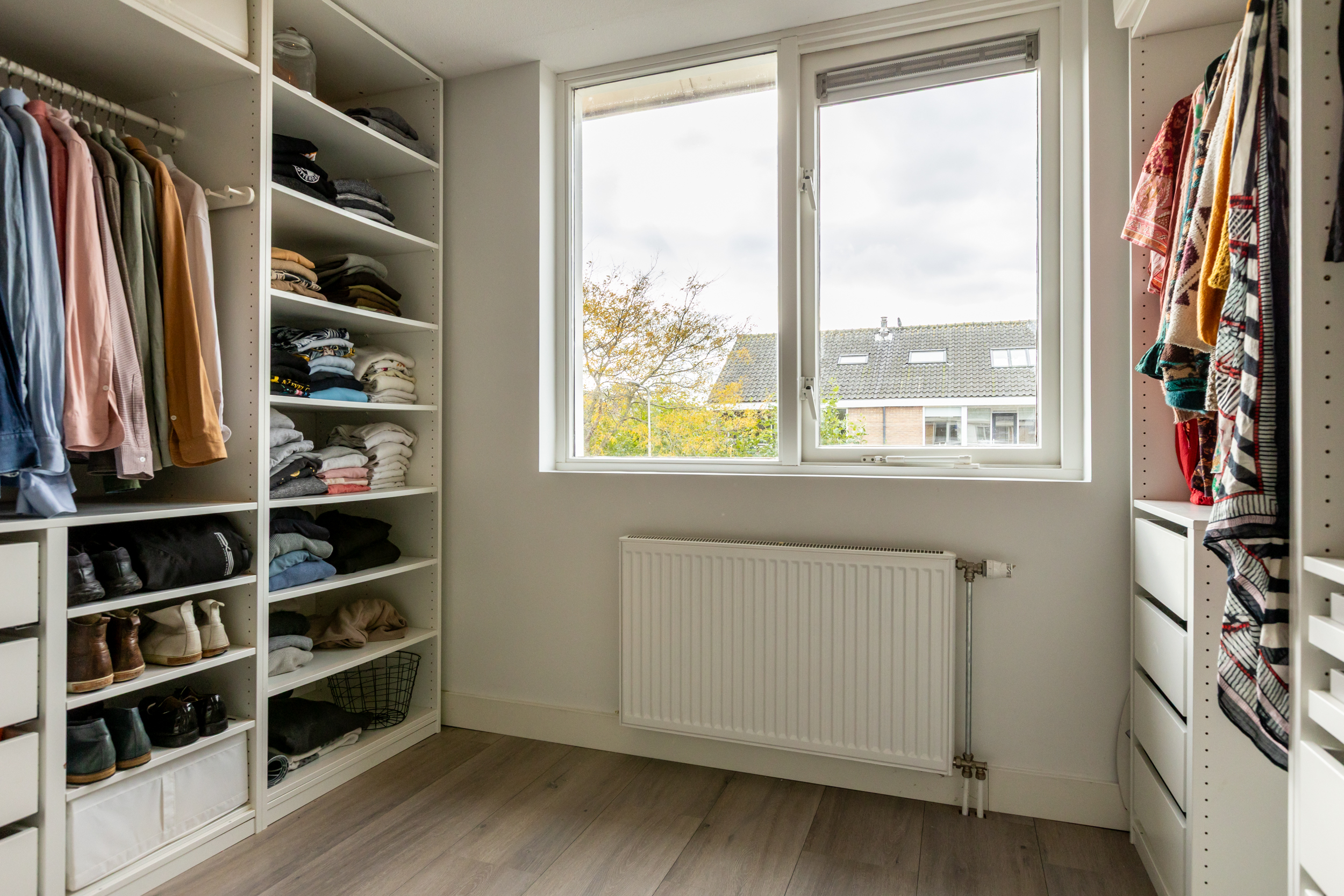 Aan de voorzijde bevindt zich een tweede, ruime slaapkamer met airconditioning. De derde slaapkamer is momenteel ingericht als royale inloopgarderobe, maar kan uiteraard weer als slaap- of werkkamer worden gebruikt. Daarnaast vindt u op deze verdieping een tweede moderne badkamer, compleet met inloopdouche, wandcloset, wastafelmeubel met opbergruimte en een designradiator.
