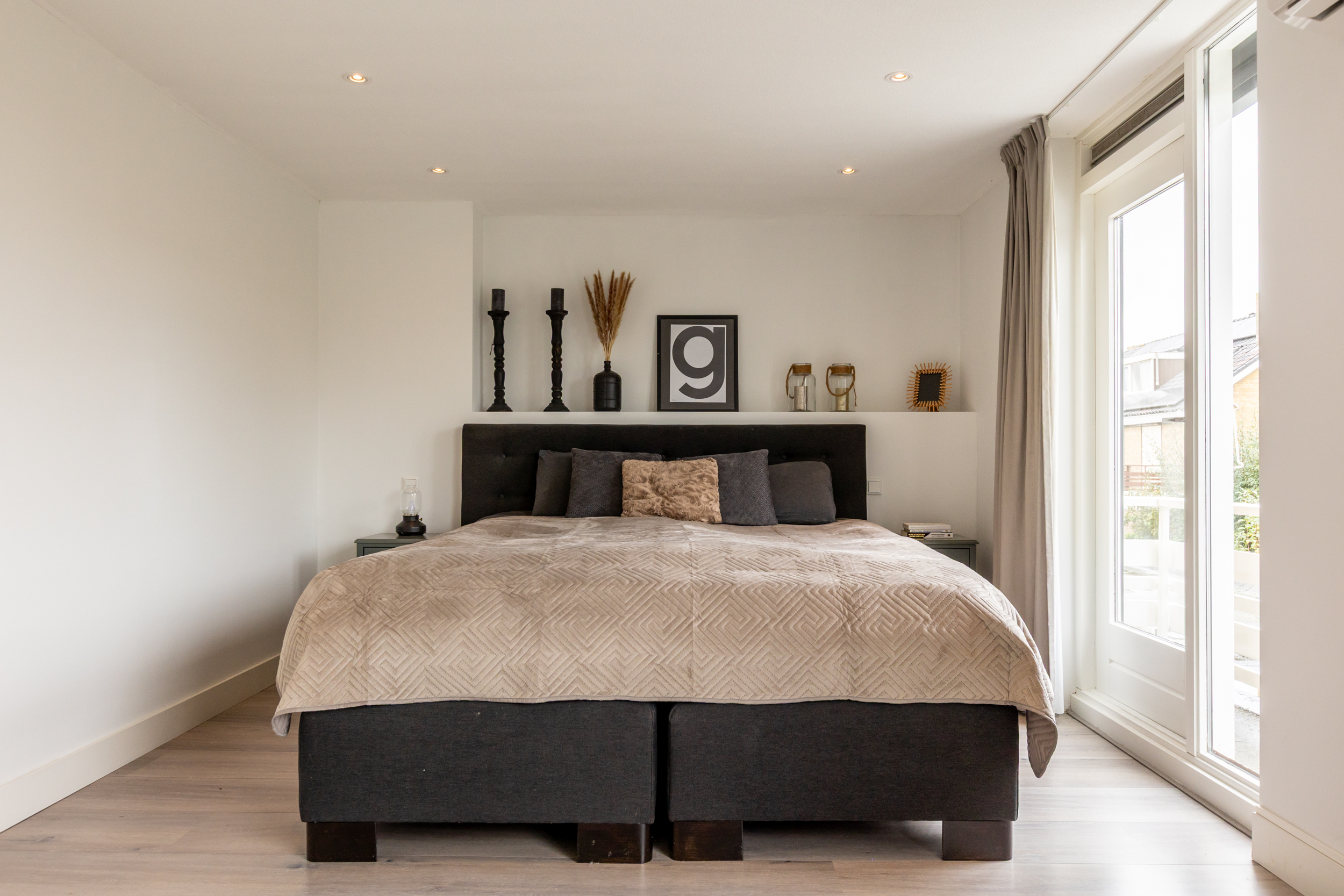 De royale hoofdslaapkamer aan de achterzijde beschikt over airconditioning, een deur naar het balkon en een prachtige en-suite badkamer. Deze luxe badkamer is volledig betegeld in stijlvolle zand/grijs/wit tinten en uitgerust met vloerverwarming, een inloopdouche met glazen wand en deur, een ligbad, wandcloset en een wastafelmeubel met dubbele waskom en softclose laden op een massieve houten plank. Deze kamer is tevens voorzien van een elektrisch rolluik, zoals alle andere slaapkamers.