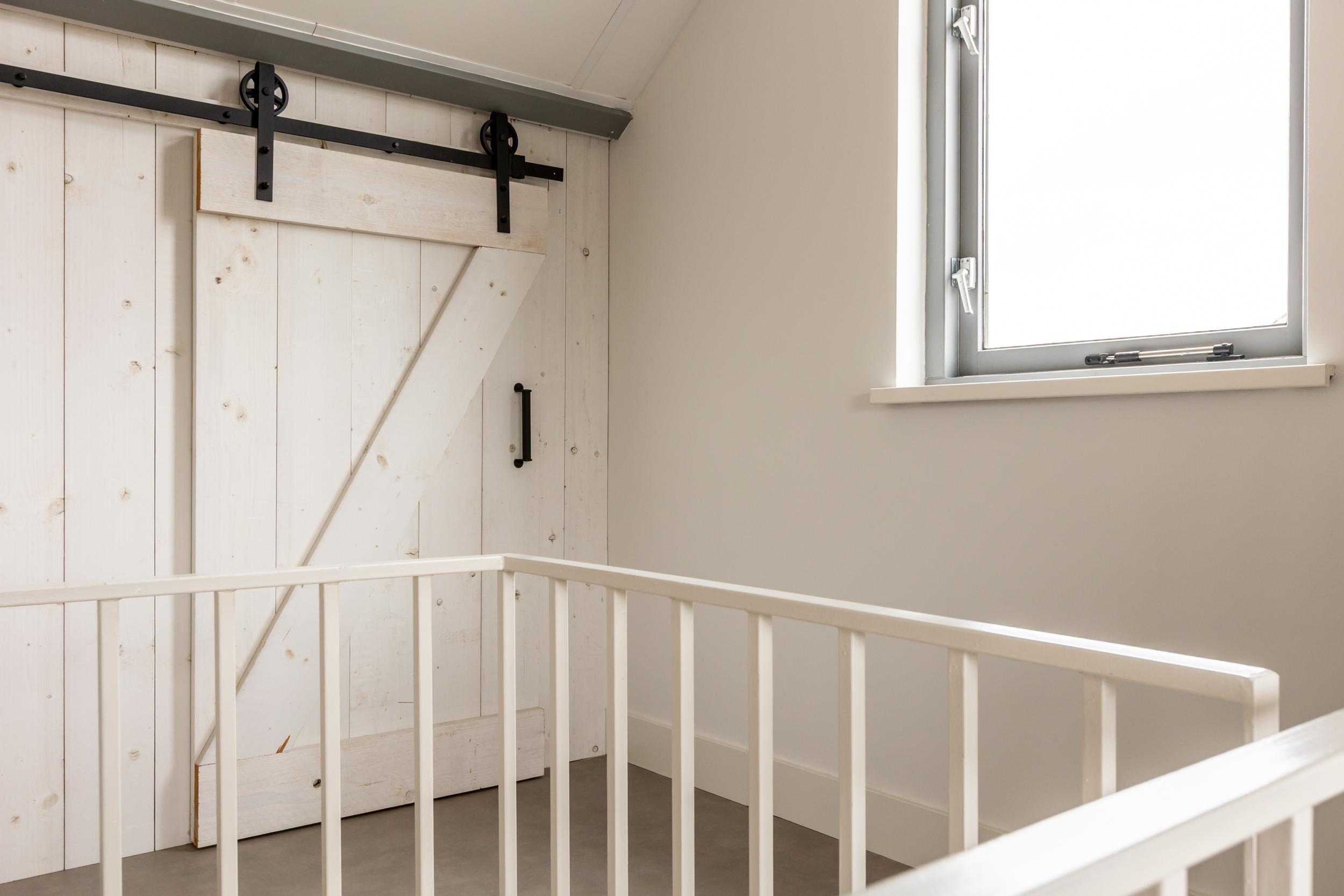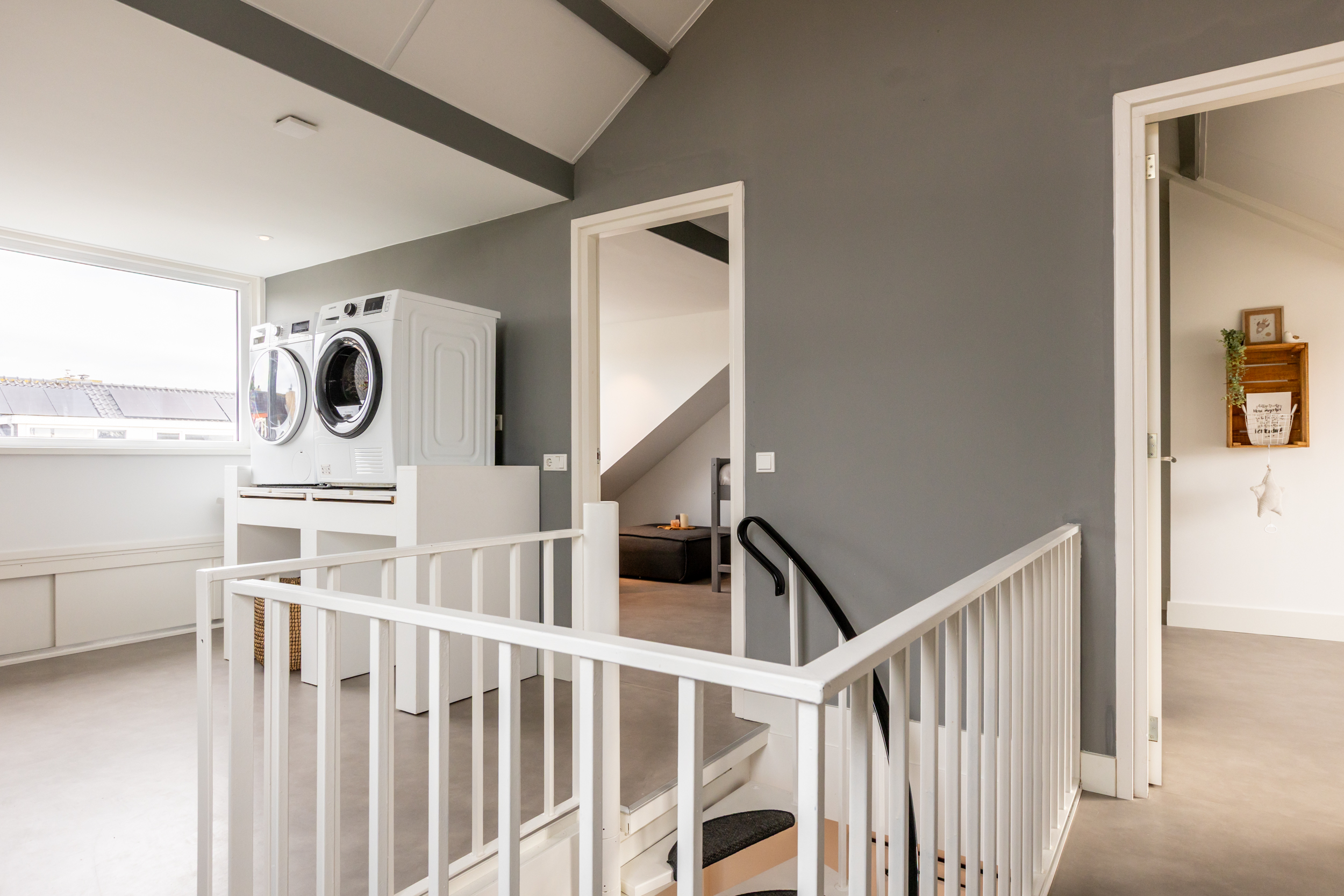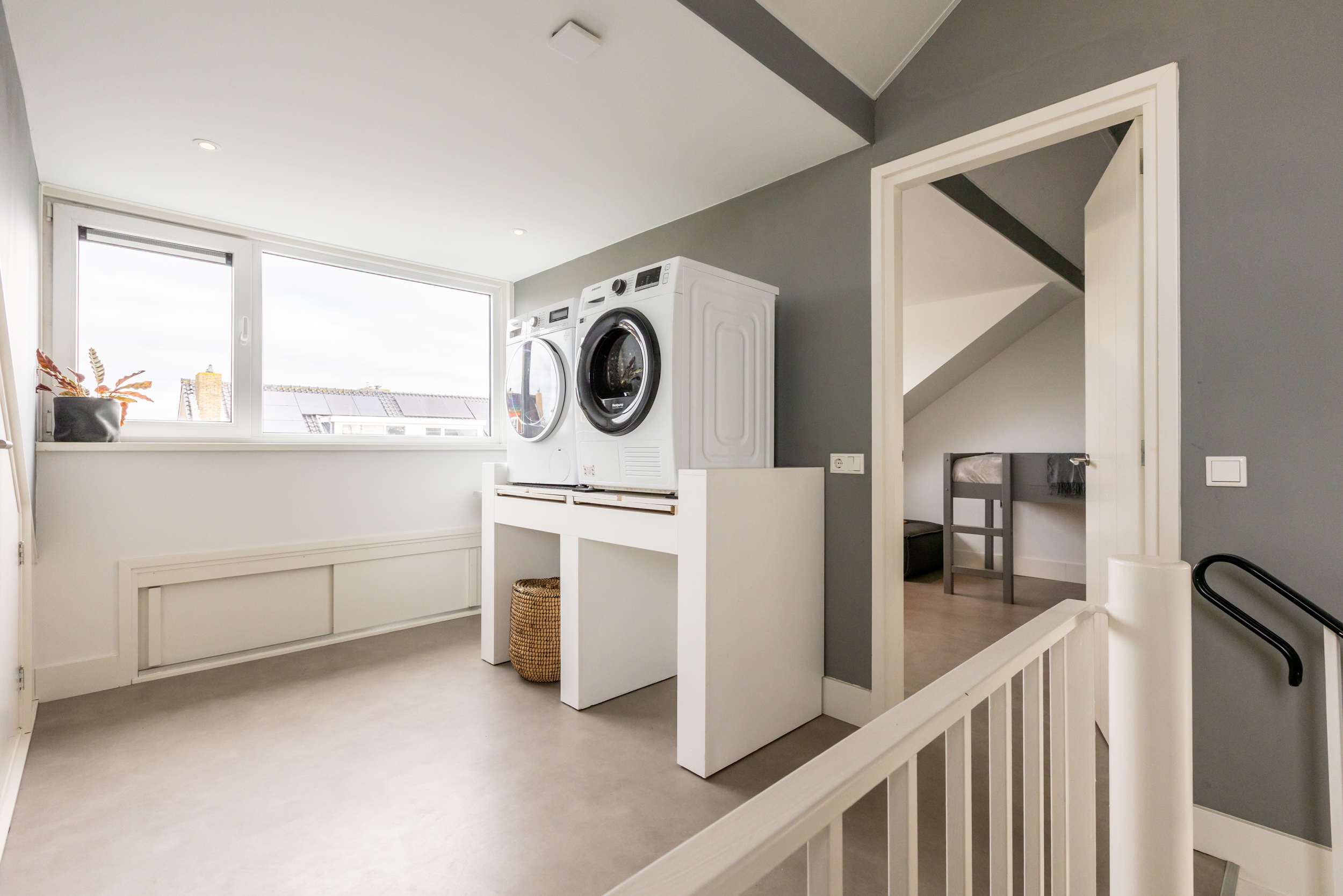 De tweede verdieping is verrassend ruim en uitstekend afgewerkt. De royale overloop is voorzien van een moderne vinylvloer in betonlook, een zijraam en een dakkapel waardoor er veel licht binnenvalt. Ook hier is een praktisch ruimte met gootsteen. een vaste kast met de opstelling van de CV-ketel (Remeha Quinta HR, 2003) en boiler, én een tweede maatwerk vaste kast onder het schuine dak: ideaal voor extra opbergruimte.
