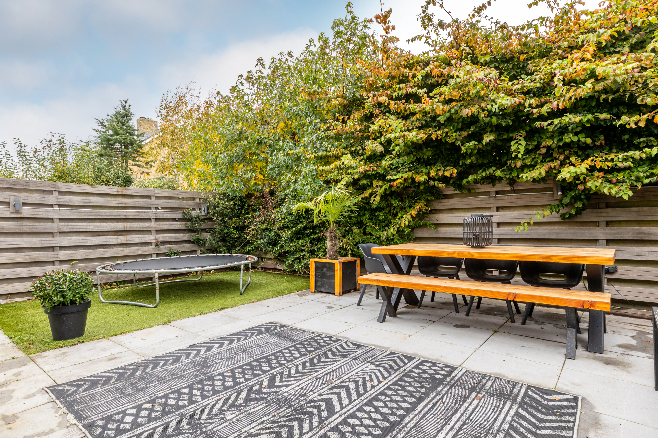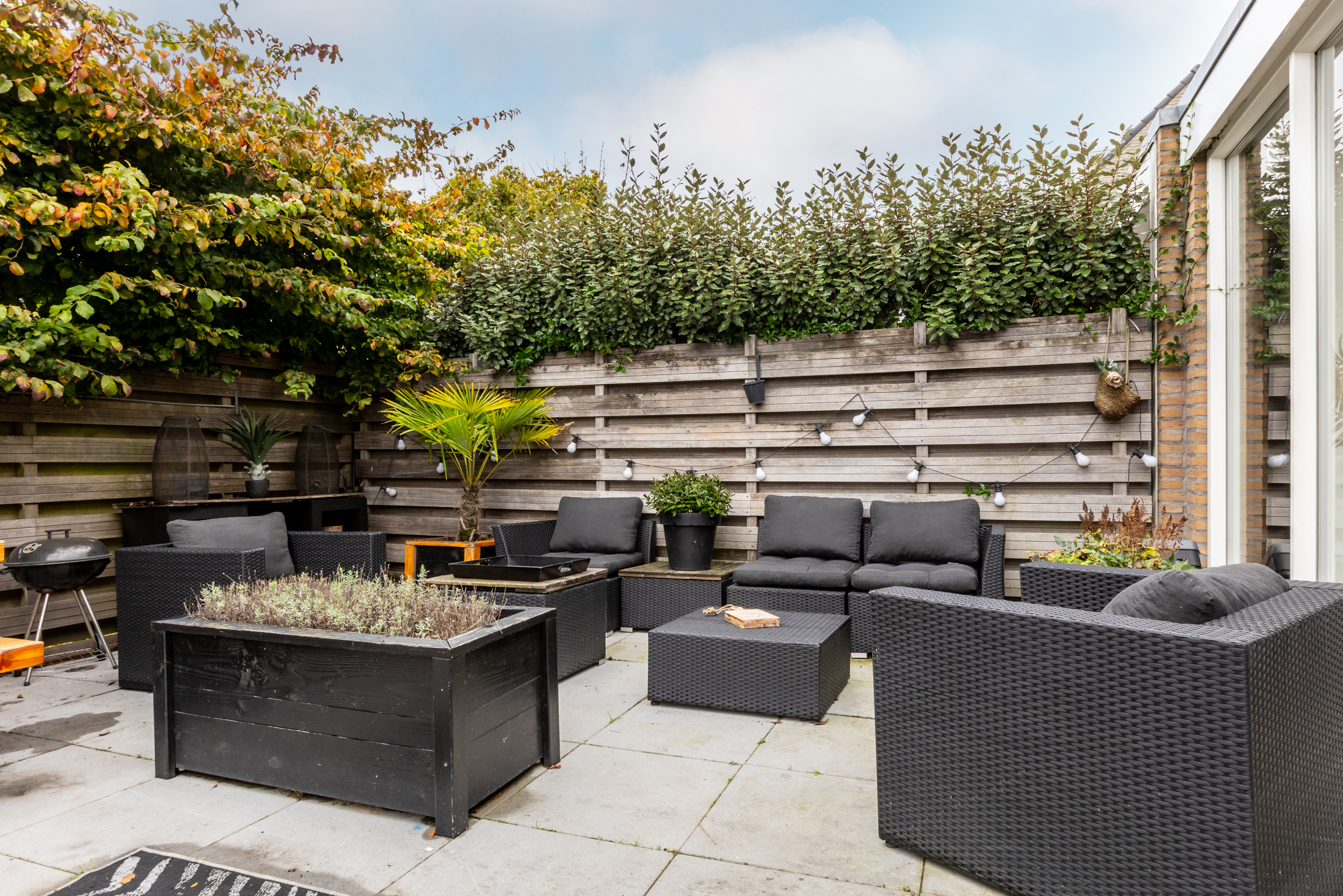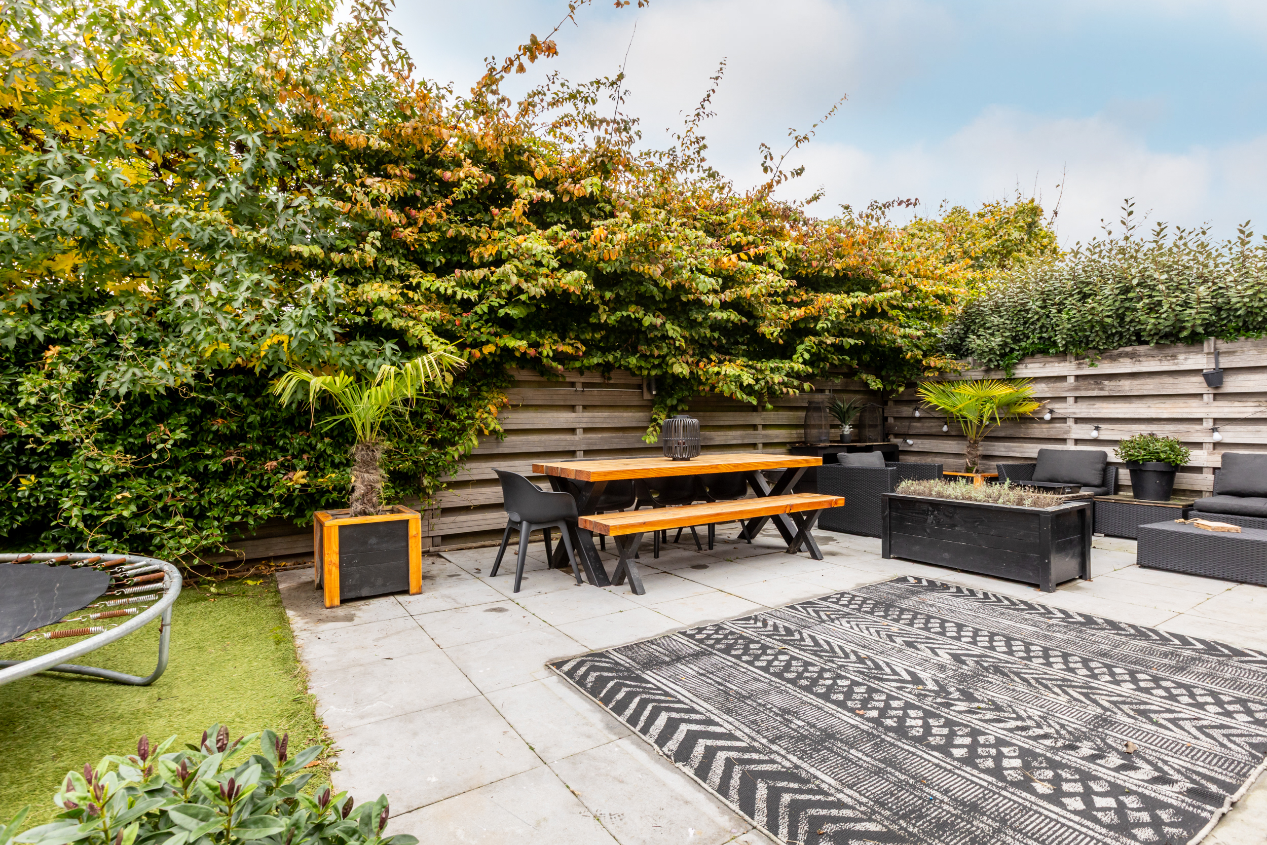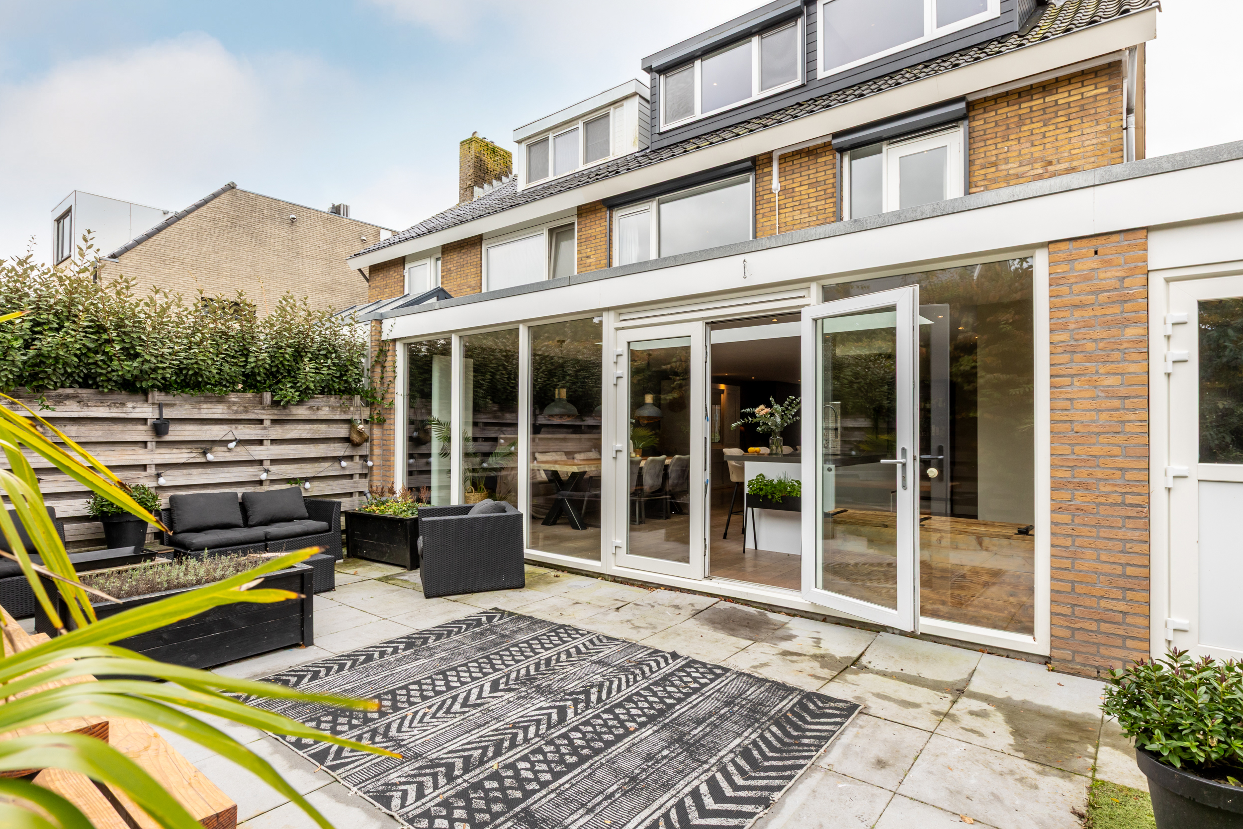 De achtertuin is in 2019 opnieuw aangelegd en opgehoogd, waardoor u hier het hele jaar door comfortabel kunt genieten. De onderhoudsvriendelijke tuin is stijlvol ingericht met sierbestrating en kunstgras, en wordt volledig omsloten door hardhouten schuttingen voor optimale privacy. Een fijne plek om in alle rust buiten te leven en te ontspannen.