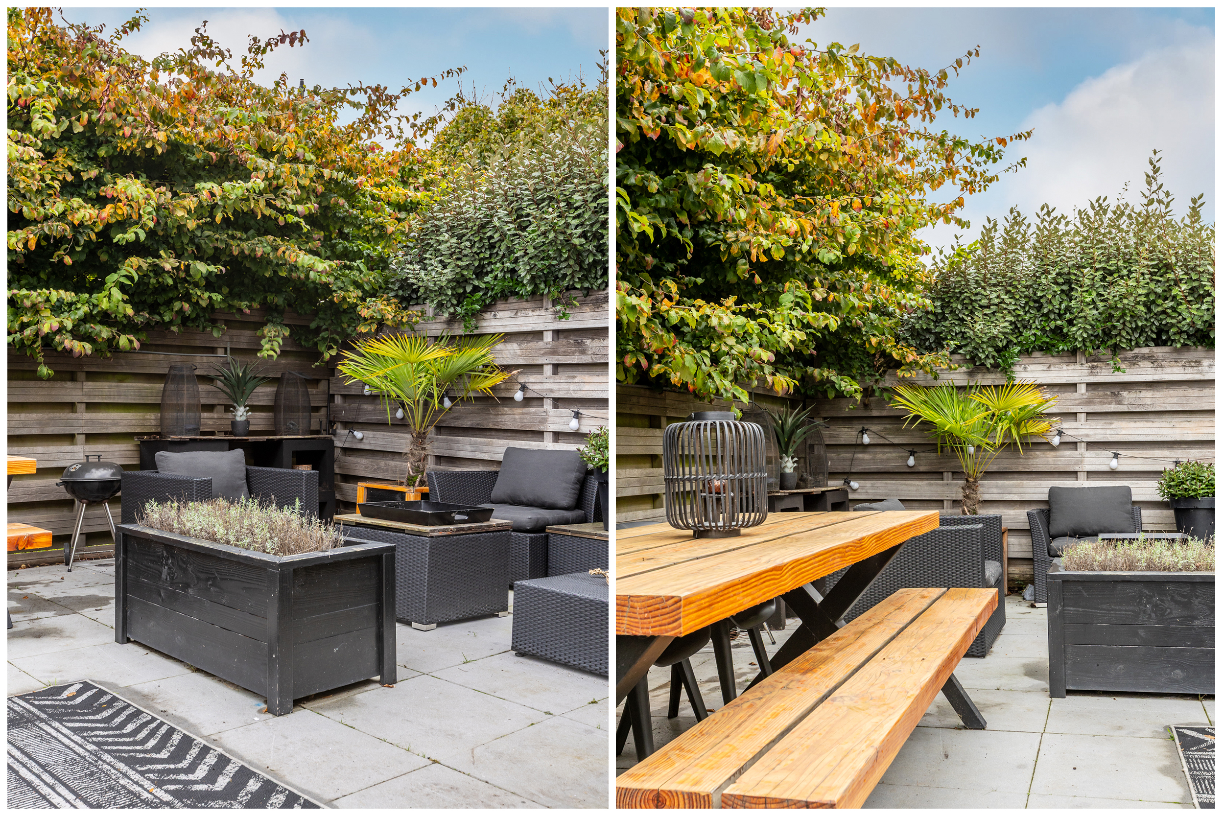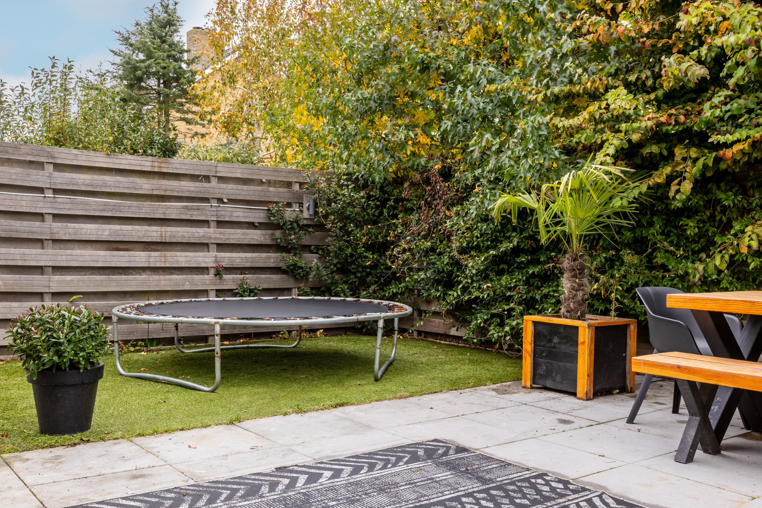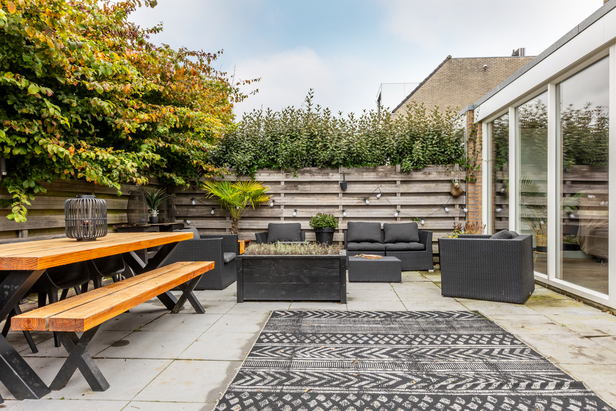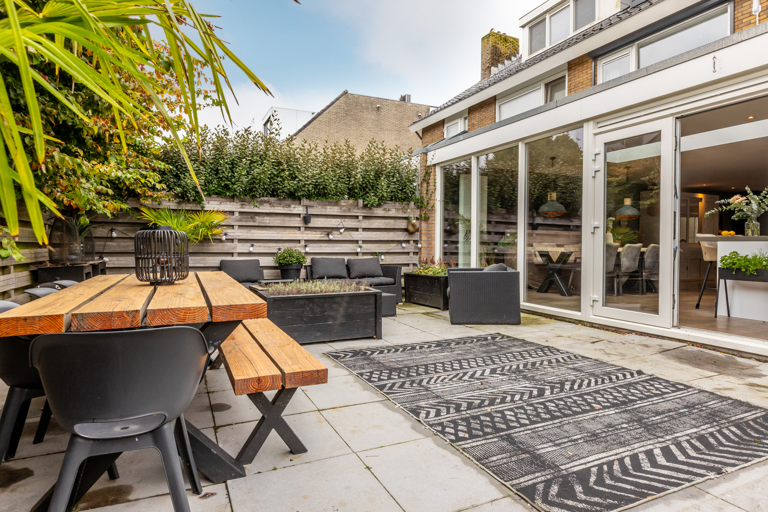 De achtertuin is in 2019 opnieuw aangelegd en opgehoogd, waardoor u hier het hele jaar door comfortabel kunt genieten. De onderhoudsvriendelijke tuin is stijlvol ingericht met sierbestrating en kunstgras, en wordt volledig omsloten door hardhouten schuttingen voor optimale privacy. Een fijne plek om in alle rust buiten te leven en te ontspannen.