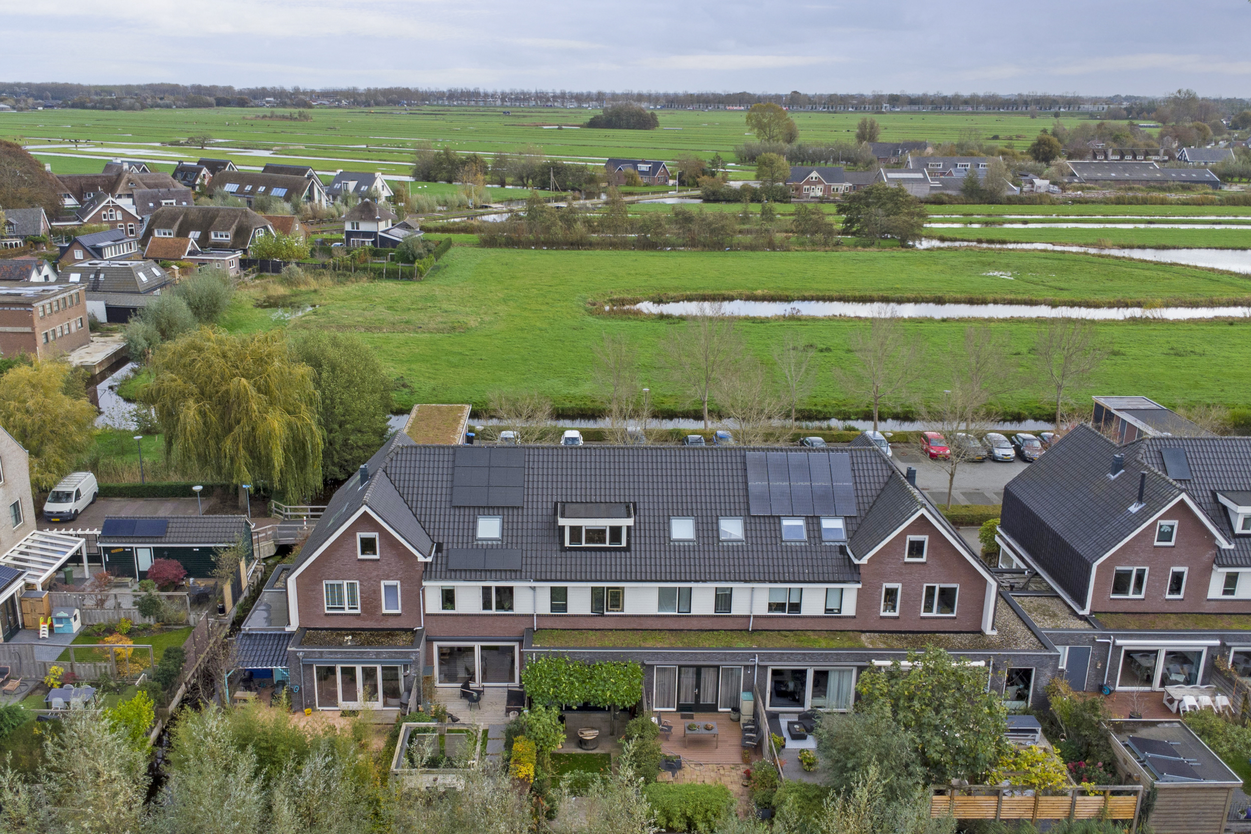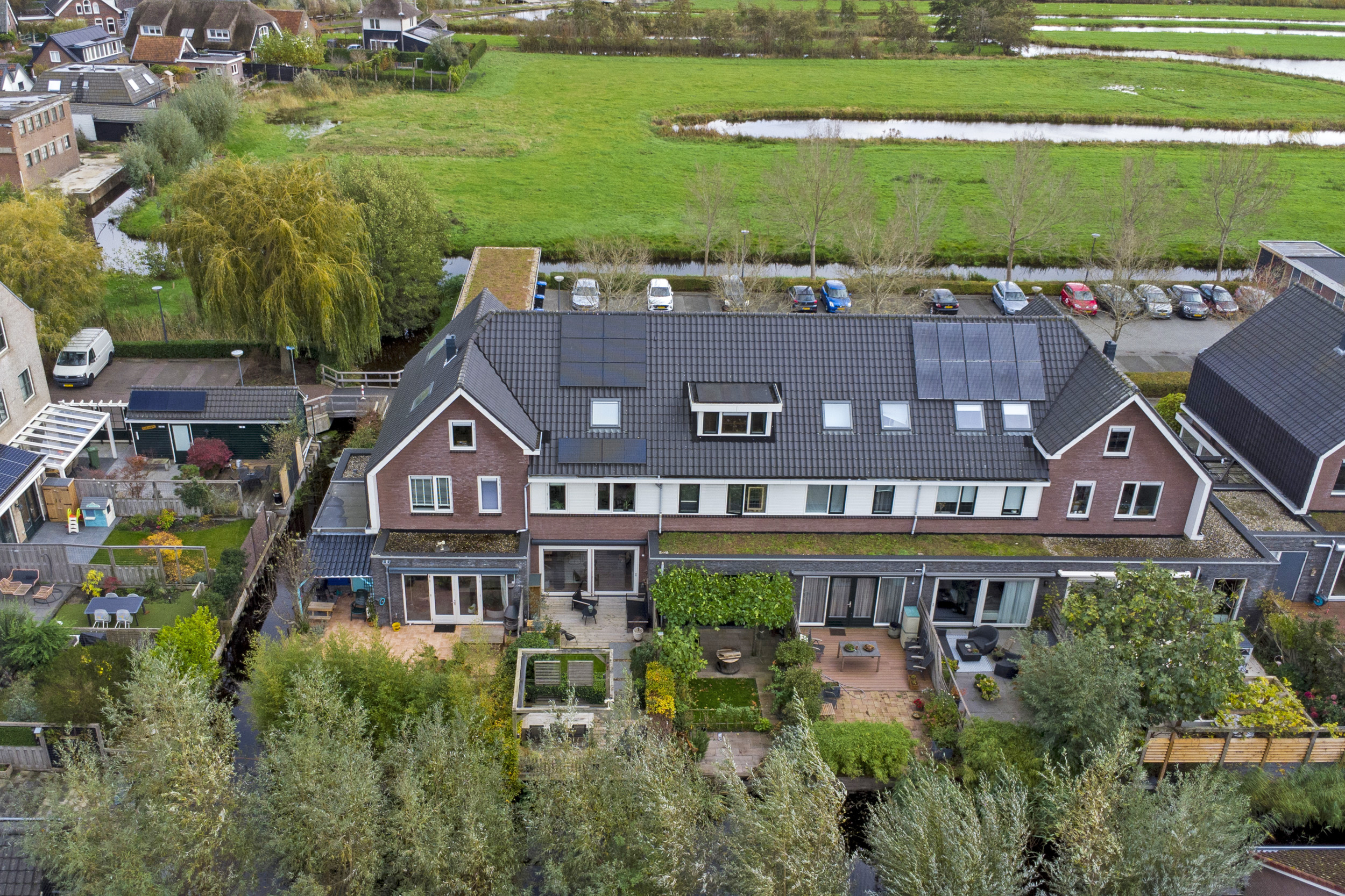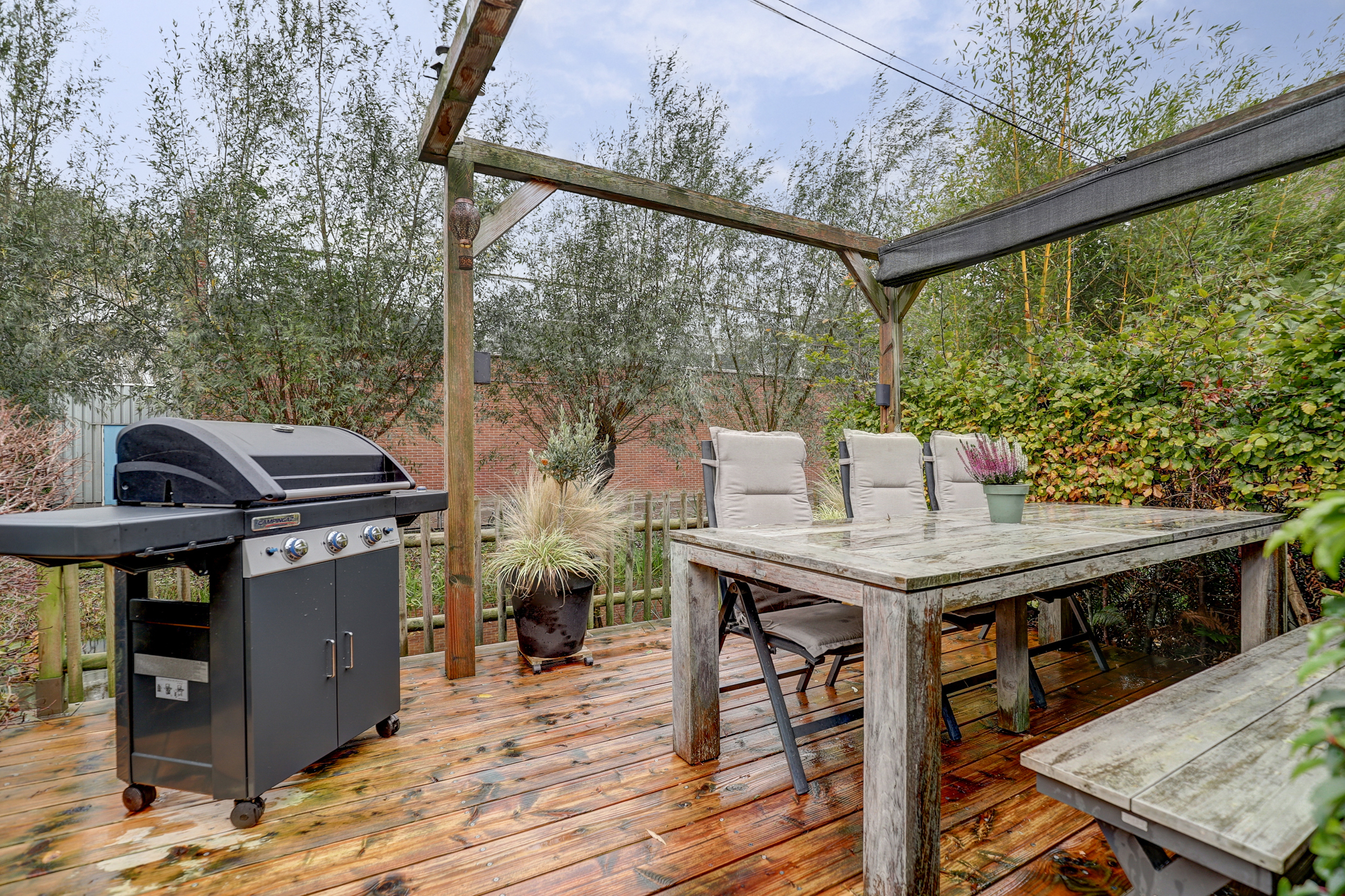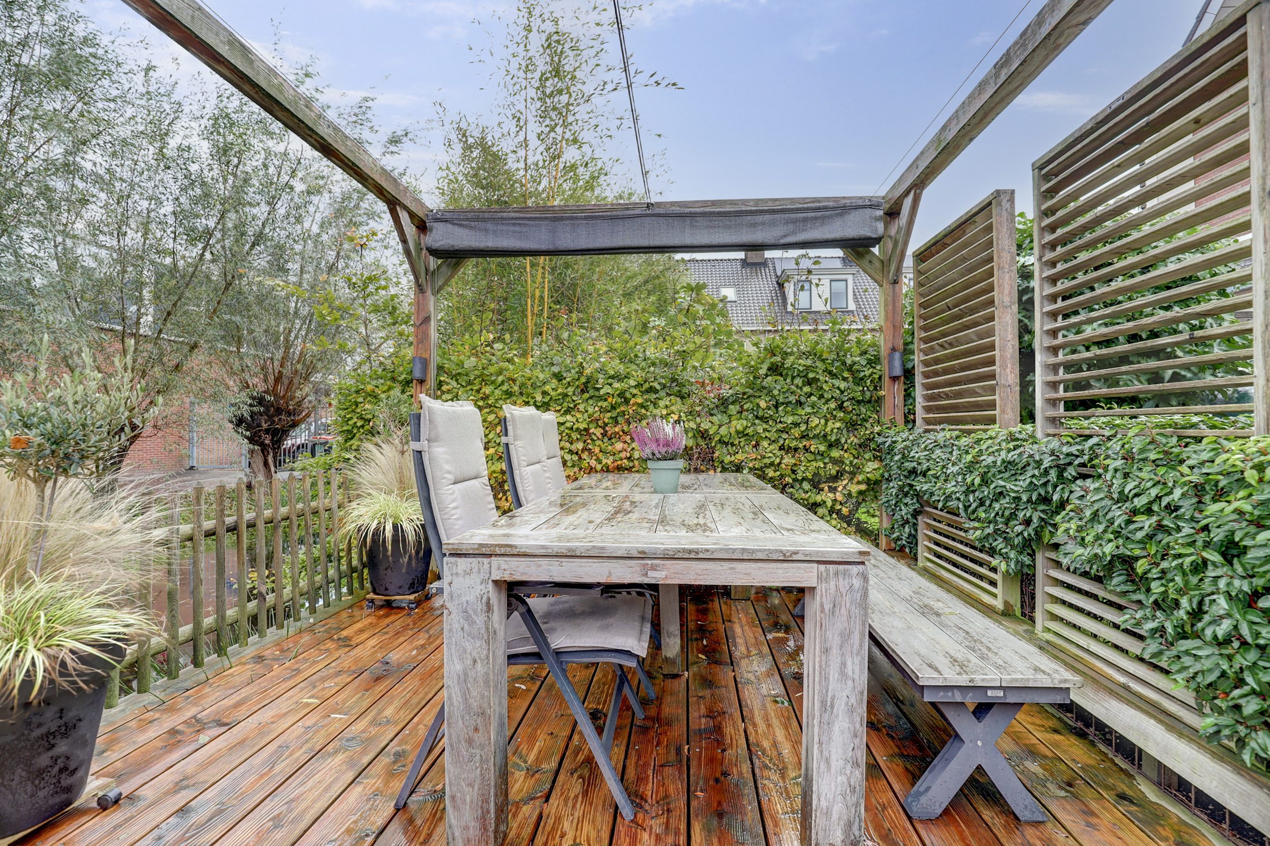 De voortuin is ingericht met sierbestrating en grind, een gezellig zitje, siergrassen, houten palen en de voor de wijk kenmerkende beukenhaag. De achtertuin biedt twee vlonderterrassen van Douglas-planken, waarvan één gelegen aan de waterzijde en voorzien van pergola met zonnedoek. Achtergevel met elektrisch zonnescherm (2020) en plissé-hor (2020), buitenkraan en sfeervolle tuinverlichting.