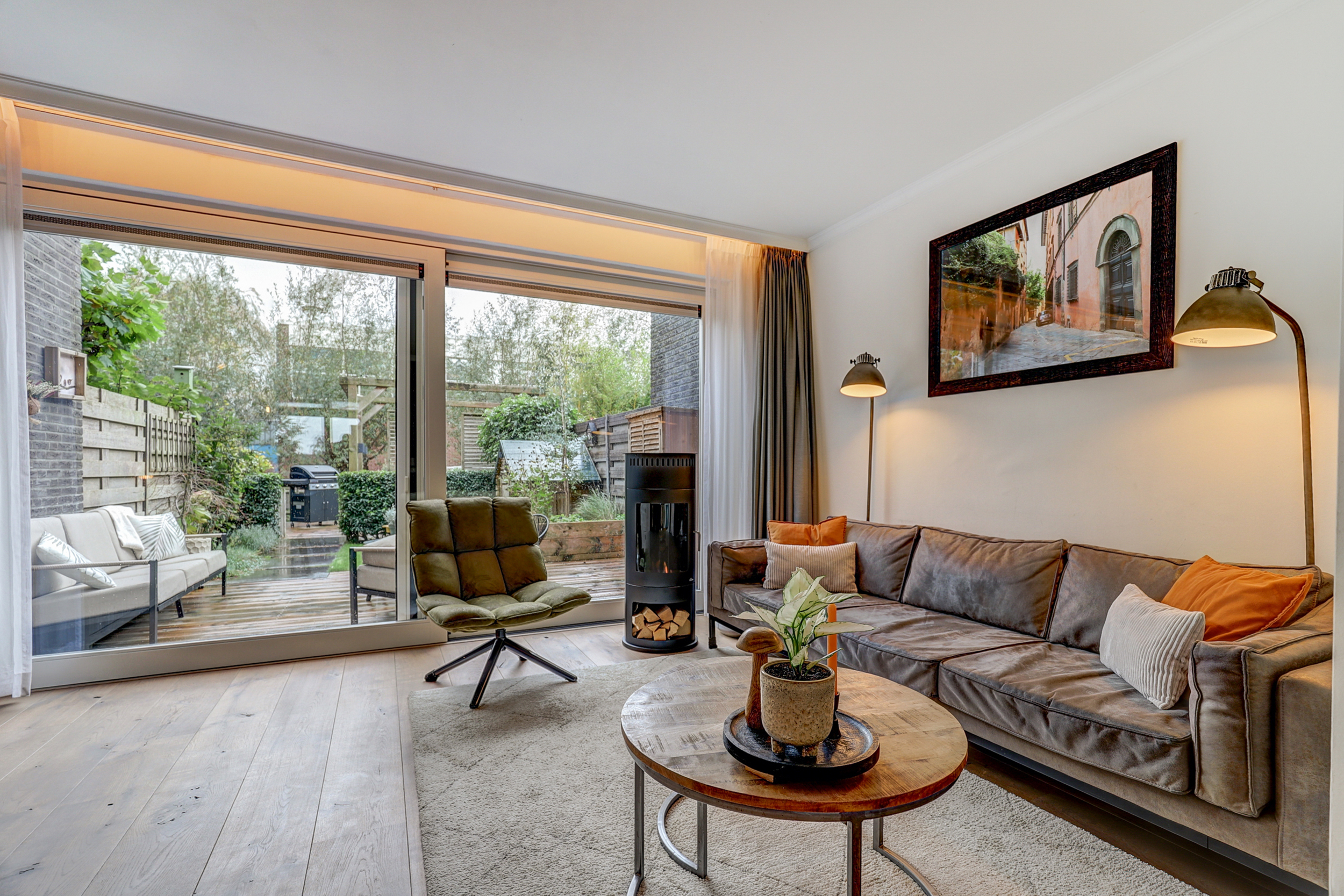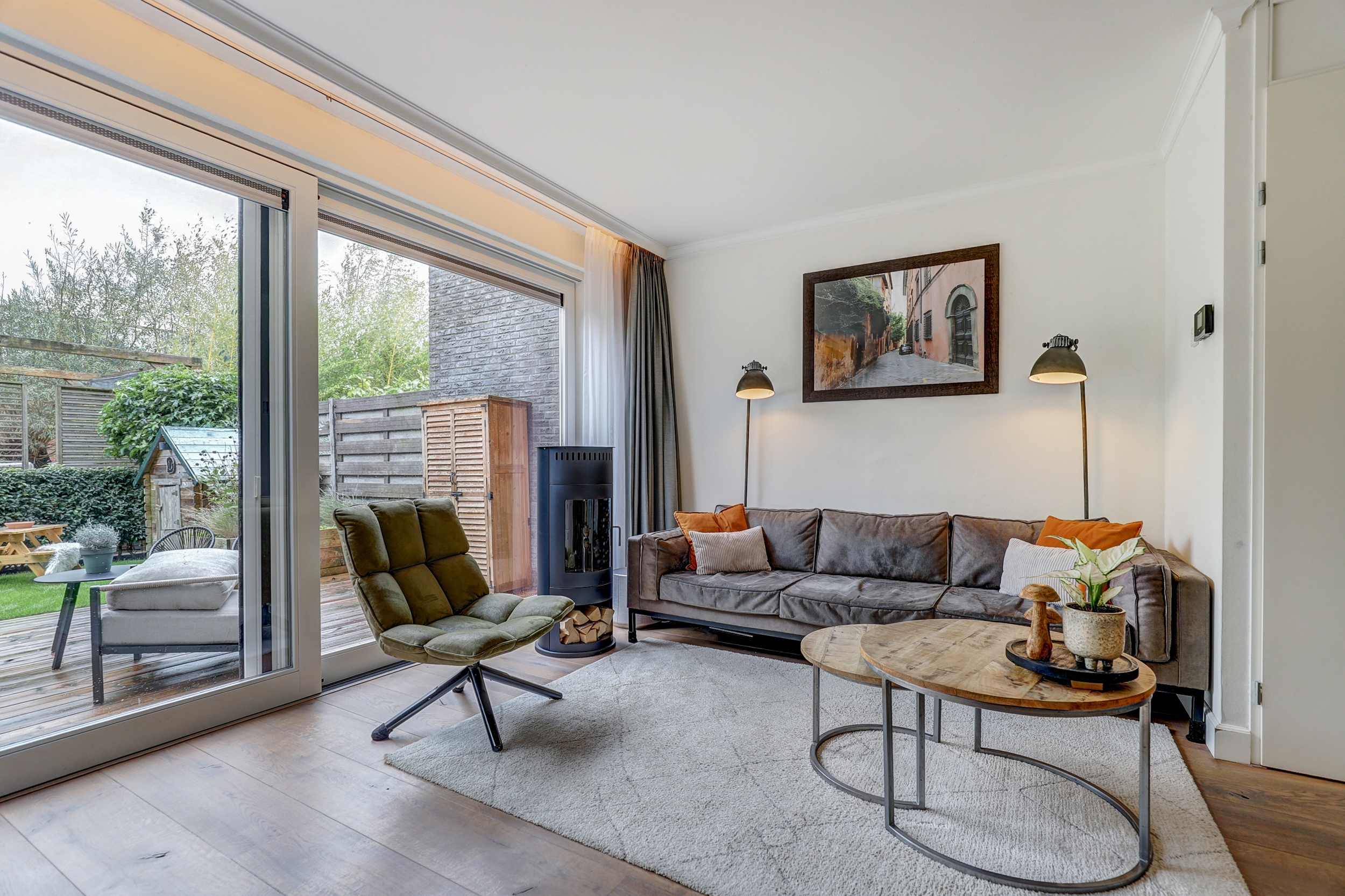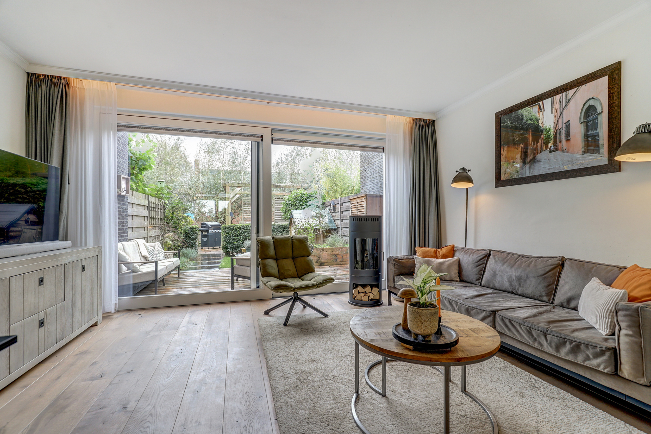 - Lichte woonkamer met schuifpui naar de tuin;