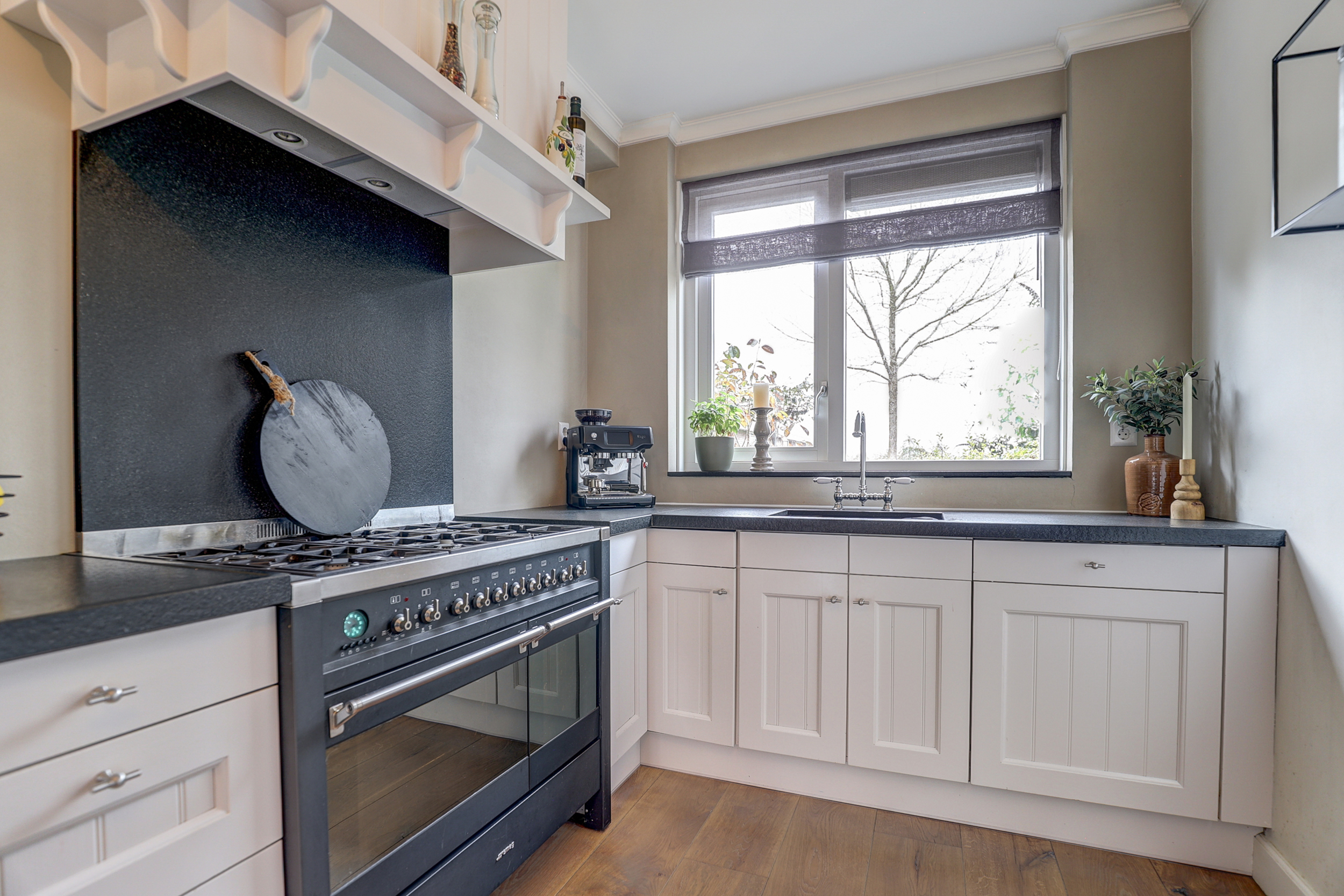 De keuken aan de voorzijde is uitgevoerd in landelijke stijl met houten fronten en een geborsteld granieten aanrechtblad, dat doorloopt in de spoelbak. De keuken is voorzien van hoogwaardige inbouwapparatuur, waaronder een 6-pits gasfornuis van SMEG met dubbele oven (waarvan één met spit), een afzuigkap in schouw, een vaatwasmachine, een koelkast met vriesvak, een carrouselkast, een apothekerskast en softclose-laden.