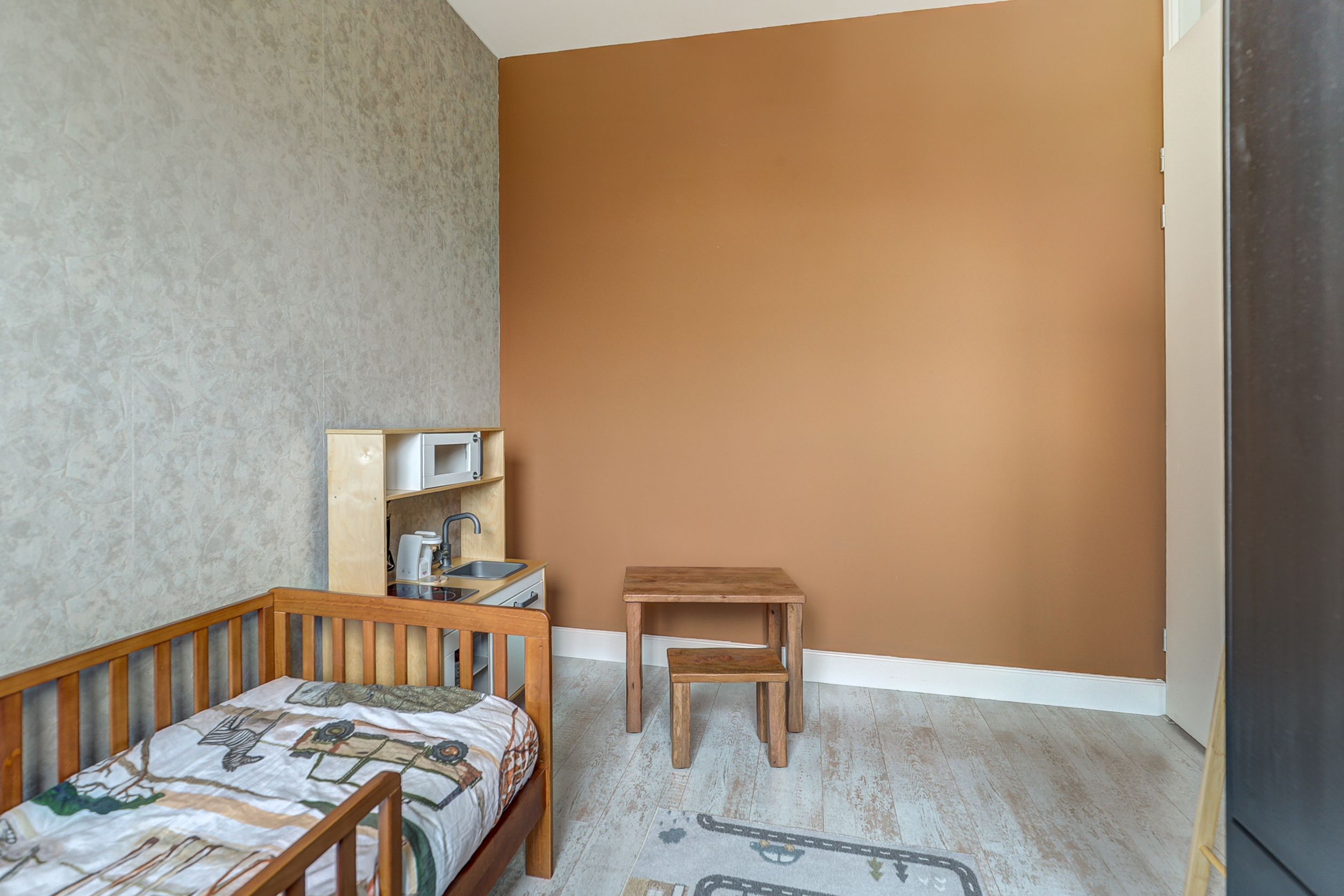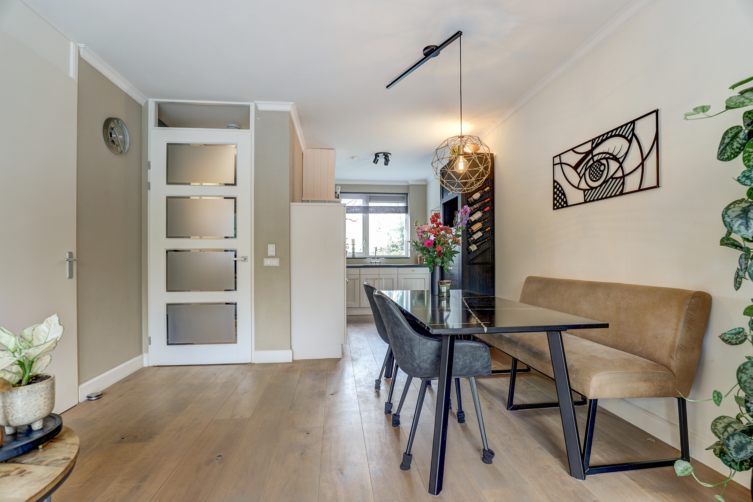 De tuingerichte woonkamer beschikt over een praktische trapkast, voorzien van een op maat gemaakte vaste kast met uittrekladen, direct onder de trap. Over de gehele breedte van de woonkamer bevindt zich een schuifpui, die veel licht binnenlaat en toegang geeft tot de tuin. De wanden zijn afgewerkt met een combinatie van glad stucwerk en glad glasvliesbehang, terwijl het plafond strak is gestuukt.