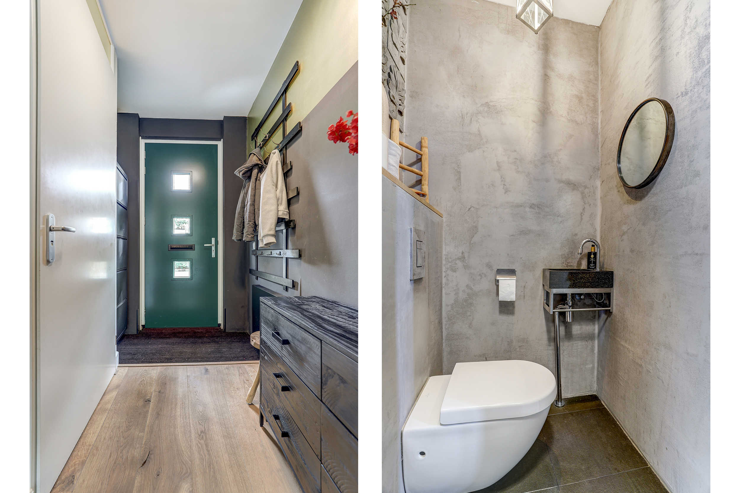Entree, meterkast (10 groepen, 3 aardlekschakelaars), garderobe, toilet en trapopgang naar de eerste verdieping. Het toilet is voorzien van wanden in betonciré en uitgerust met een fontein en een wandmodel toilet. Via een deur met glas is er toegang tot de woonkamer.