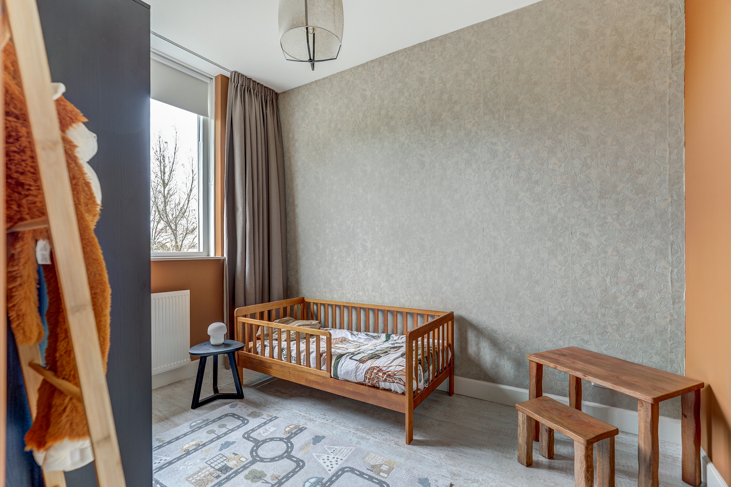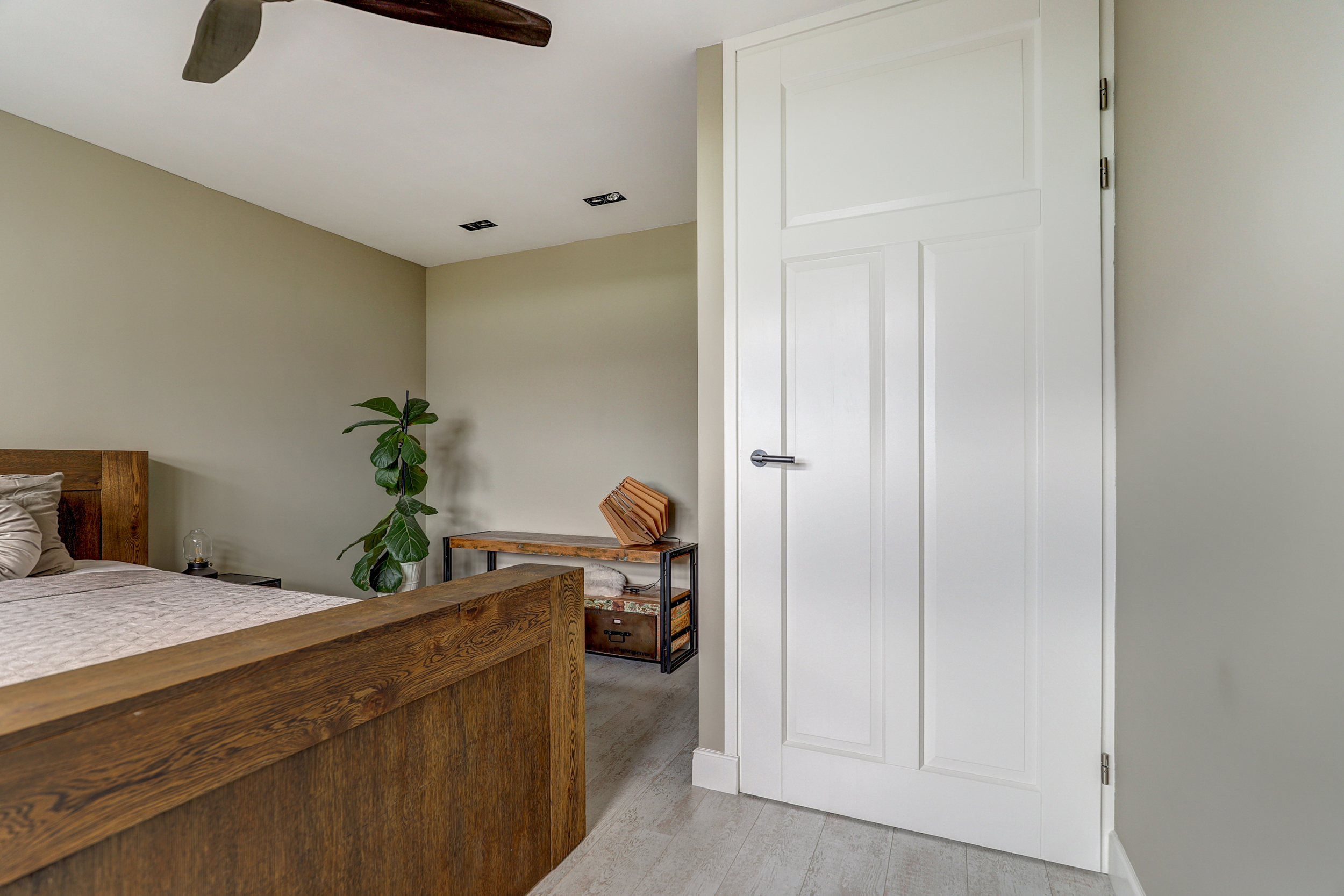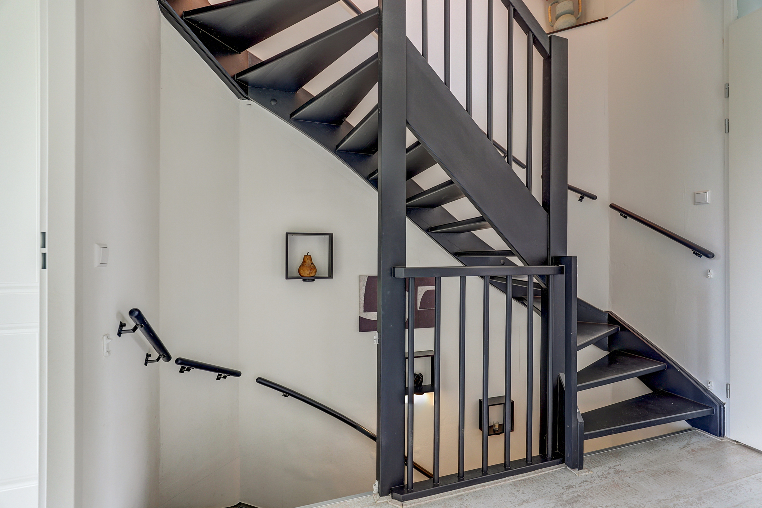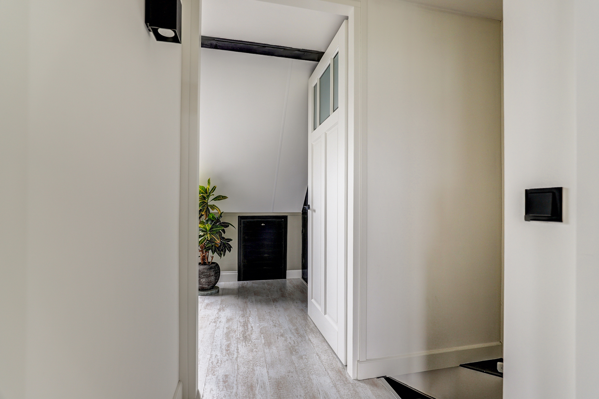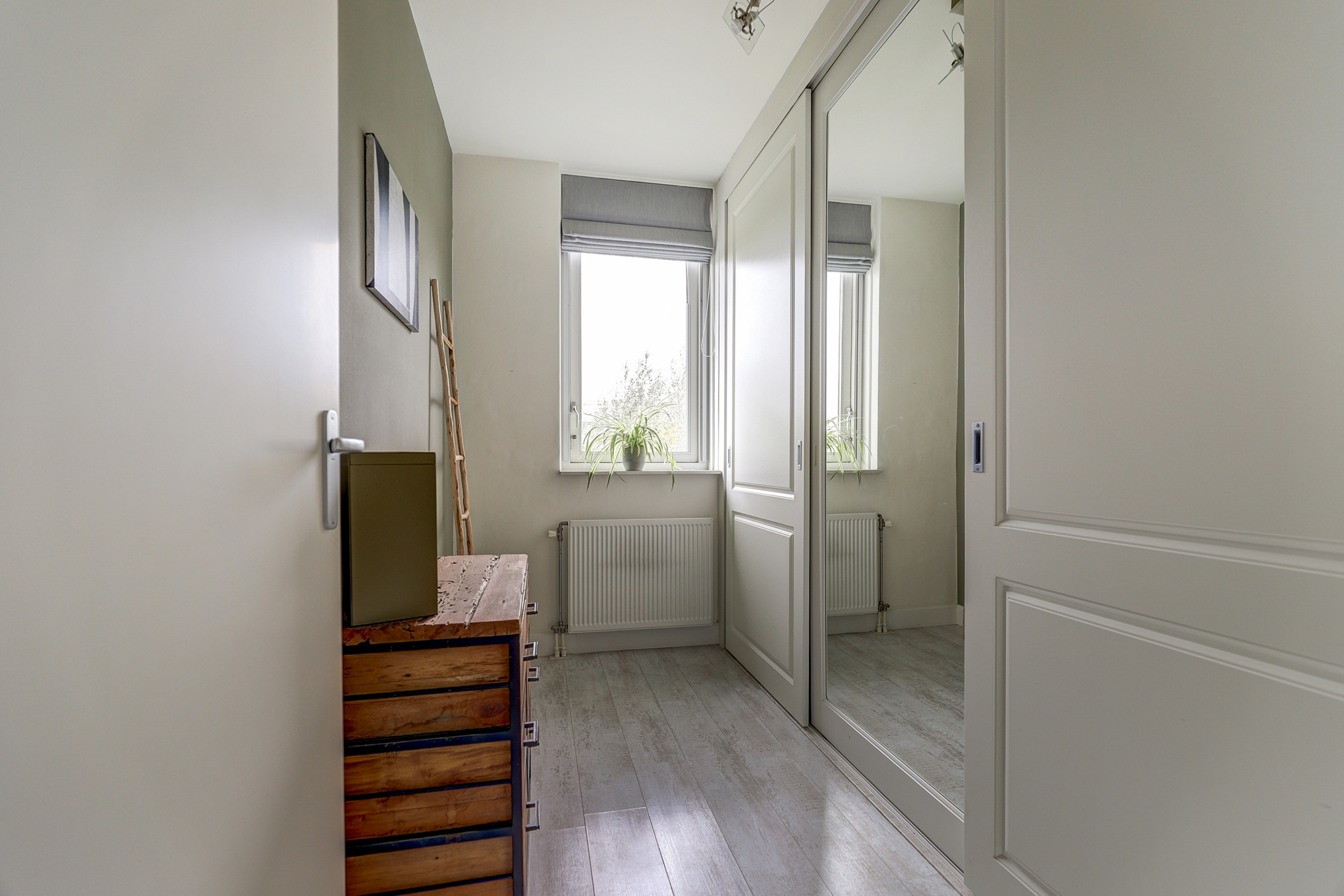 Overloop met toegang tot alle vertrekken. Slaapkamer één is aan de voorzijde van de woning gelegen. Aan de achterzijde van de woning bevinden zich slaapkamer twee en drie. Eén van deze kamers is uitgerust met een praktische, ingebouwde kledingkast, voorzien van kledingstangen en handige lades.De badkamer is afgewerkt met wanden in gecoat betonciré en voorzien van een inloopdouche met glazen wand, waarbij de achterwand is betegeld. Verder beschikt de badkamer over een wandtoilet, een wastafelmeubel van Belgisch hardsteen met dubbele kraan, en een spiegel met geïntegreerde verlichting en verwarming. De ruimte is uitgerust met vloerverwarming en heeft een vloer van natuurstenen tegels.
