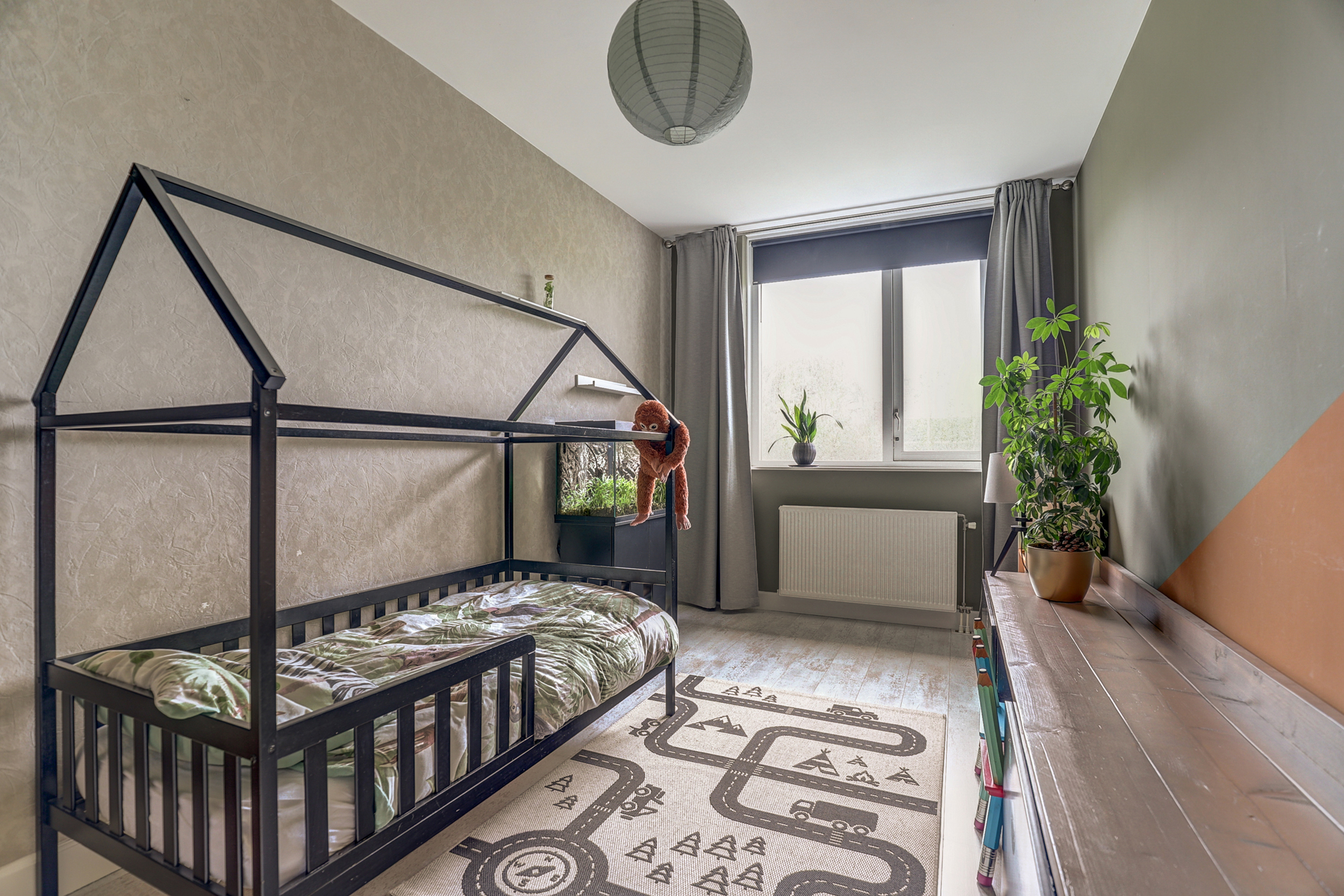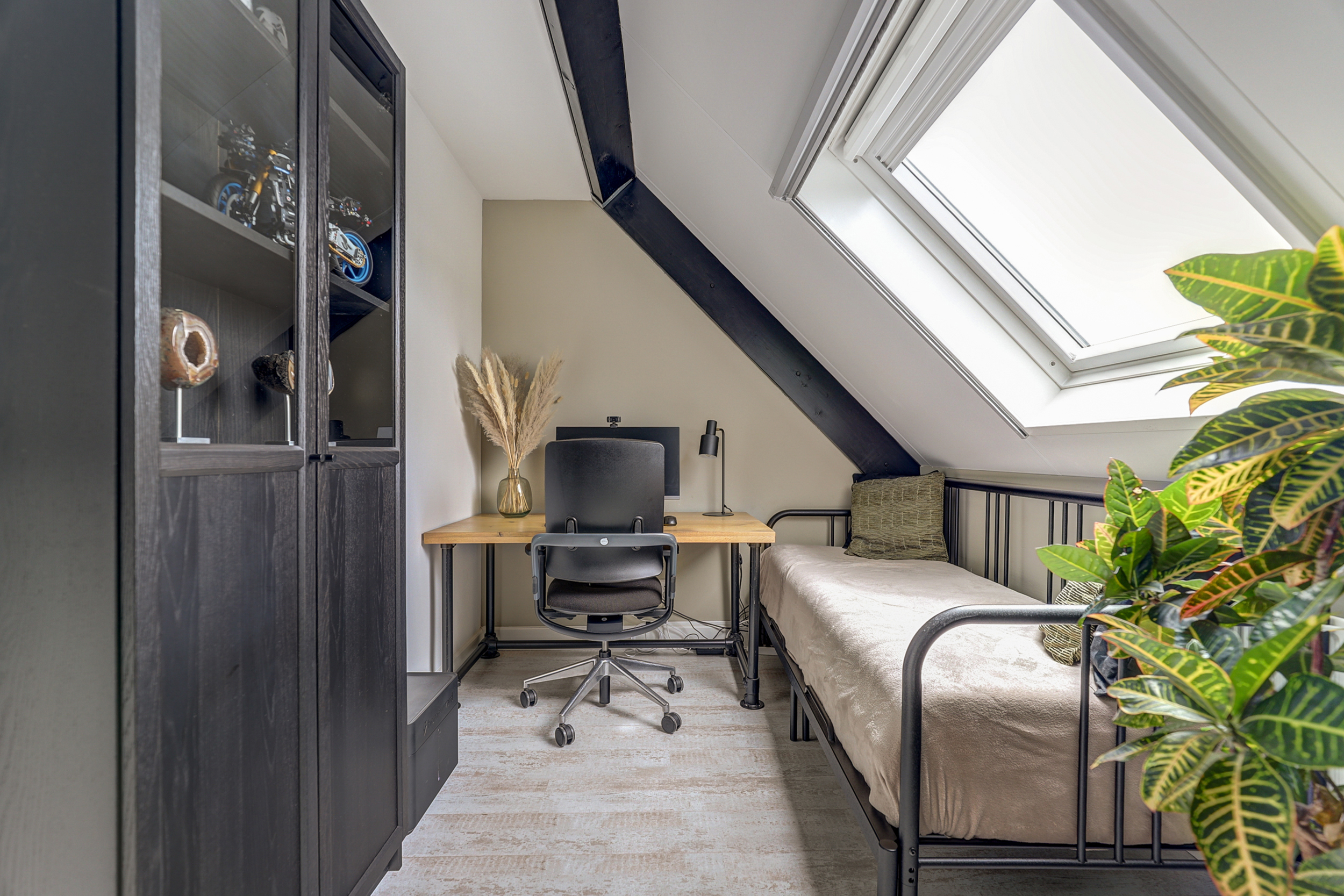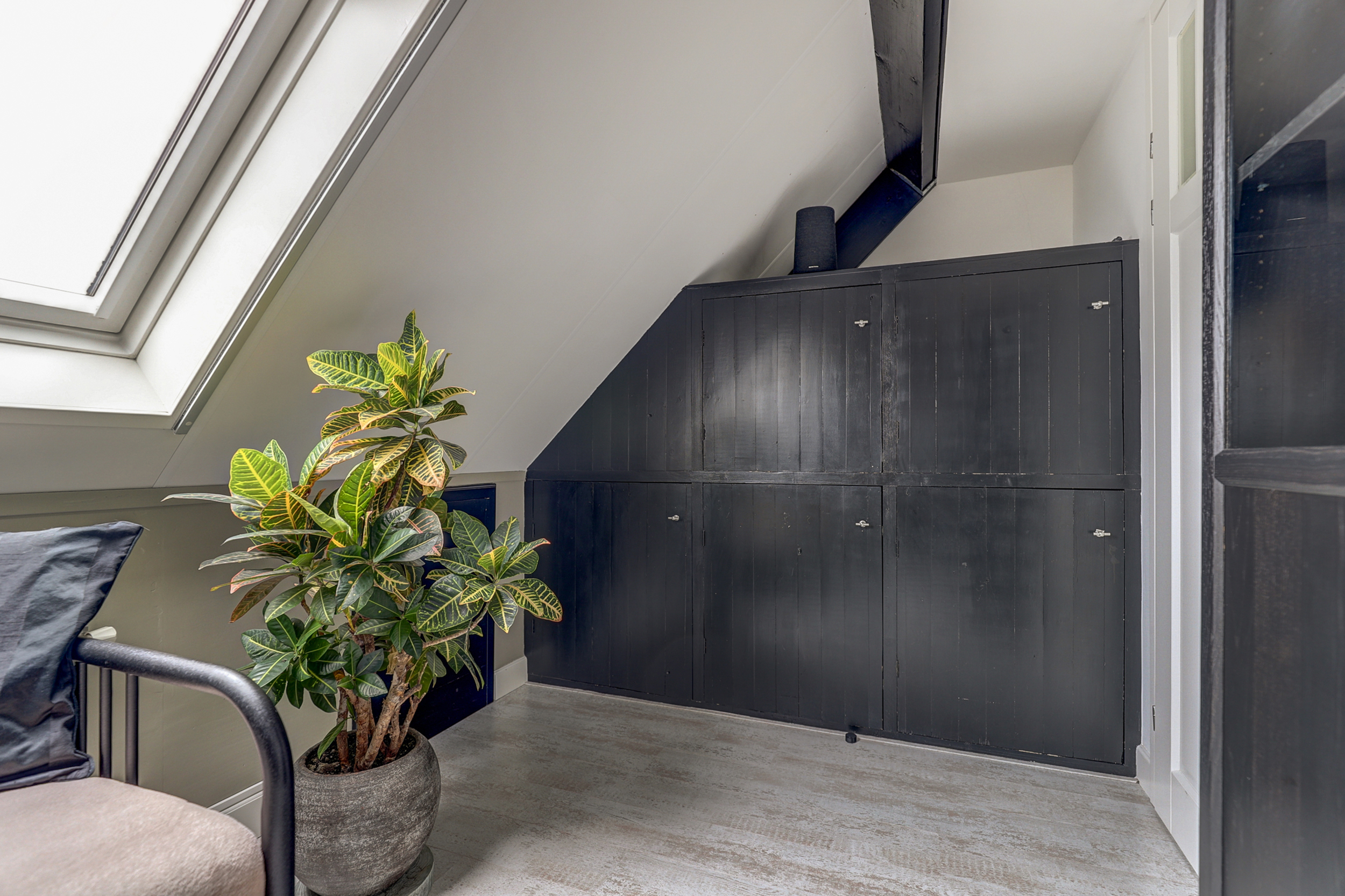 Voorzolder met vlizotrap naar de bergvliering en toegang tot slaapkamers vier en vijf. De vierde, zeer royale slaapkamer aan de voorzijde is voorzien van een in 2020 nieuw geplaatste dakkapel, met een vensterbank afgewerkt in Belgisch hardsteen. De kamer beschikt over een ingebouwd elektrische rolluik, horren, inbouwspots en op maat gemaakte raambekleding. Vaste kast met opstelling van de C.V.-ketel (type HR, bouwjaar 2024) en de unit voor mechanische ventilatie. De vijfde slaapkamer aan de achterzijde is voorzien van een groot Velux-dakraam met plissé en verduisterend rolgordijn-in-1, alsook zonwering aan de buitenzijde. Deze ruimte biedt ook toegang tot bergruimte onder het schuine dak. Daarnaast beschikt de kamer over een op maat gemaakte vaste kastenwand, inclusief aansluitingen voor wasmachine en droger.