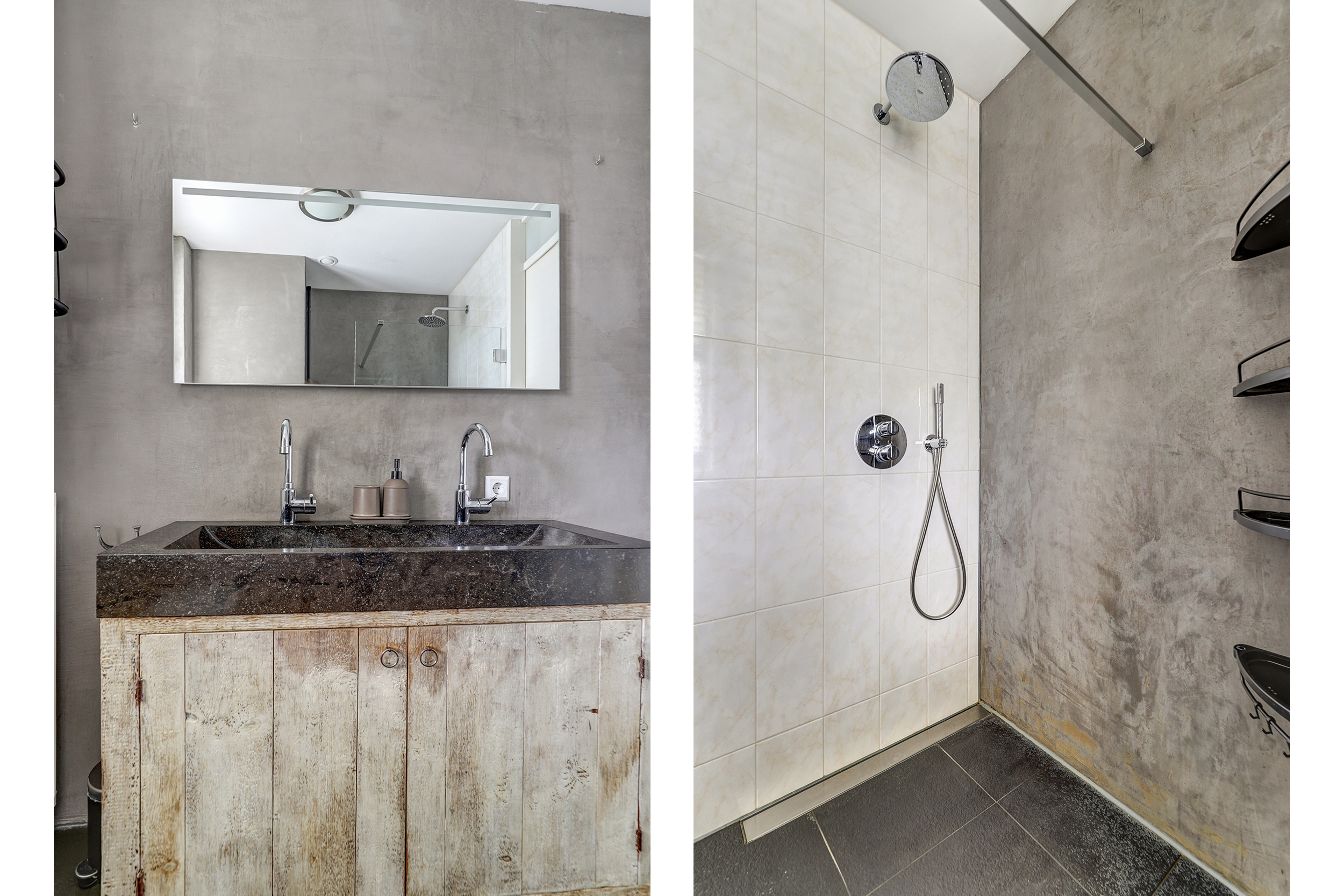 - Moderne badkamer met inloopdouche en dubbele wastafel;