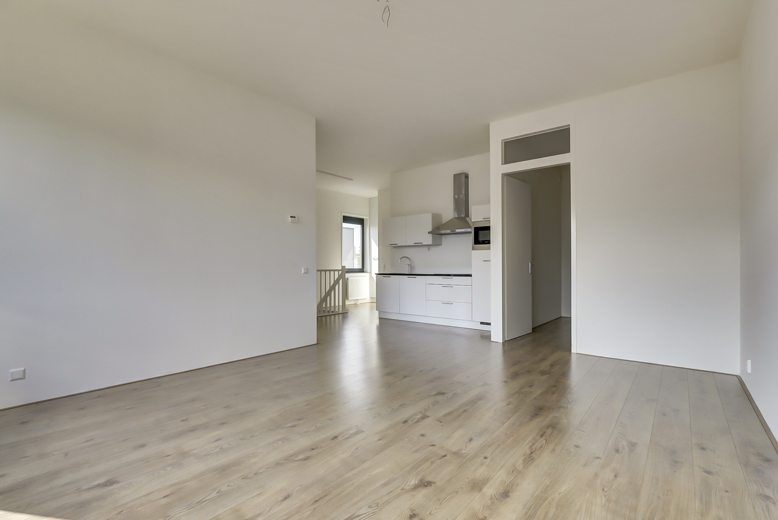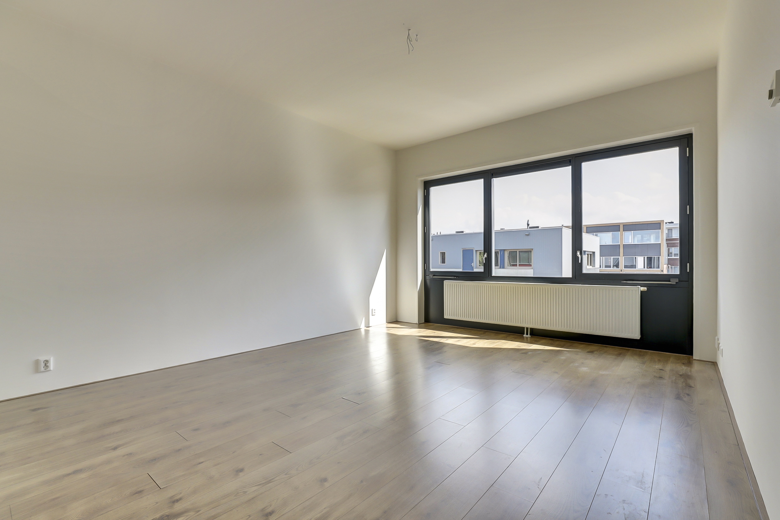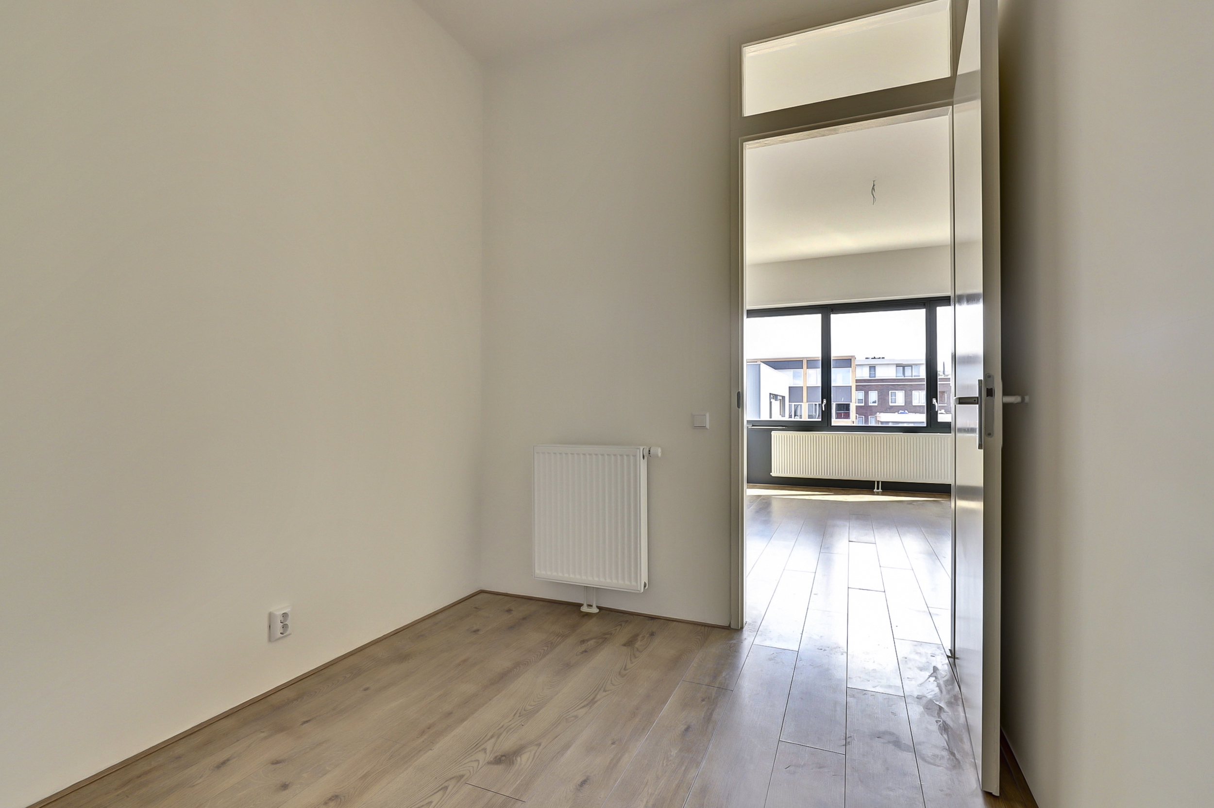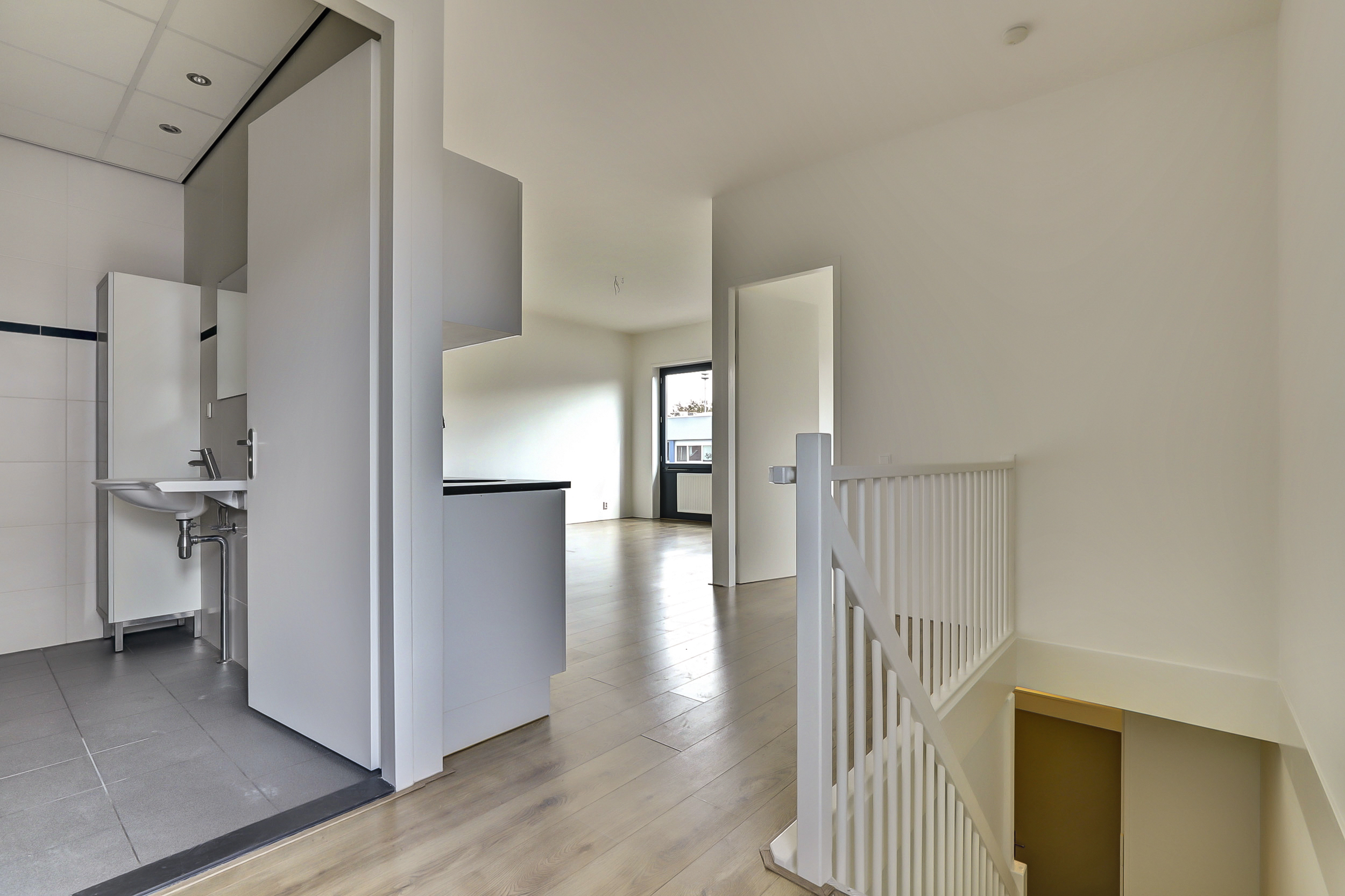 Overloop met toegang tot alle vertrekken op deze verdieping. De woonkamer staat in verbinding met de moderne open keuken, die is uitgerust met een combimagnetron, koelkast met vriesvak, keramische kookplaat en vaatwasmachine. In de aparte kast bevinden zich de cv-installatie (Nefit) en de unit voor mechanische ventilatie. Er is een separate toiletruimte met mechanische ventilatie, een zwevend toilet en een fontein. De badkamer is voorzien van een wastafel, douchecabine, aansluiting voor wasmachine en droger, en een designradiator/handdoekradiator. Slaapkamer één heeft een grootte van 3,48m x 3,09m beschikt over een Frans balkon. Slaapkamer twee heeft een grootte van 2,4m x 3.15m.