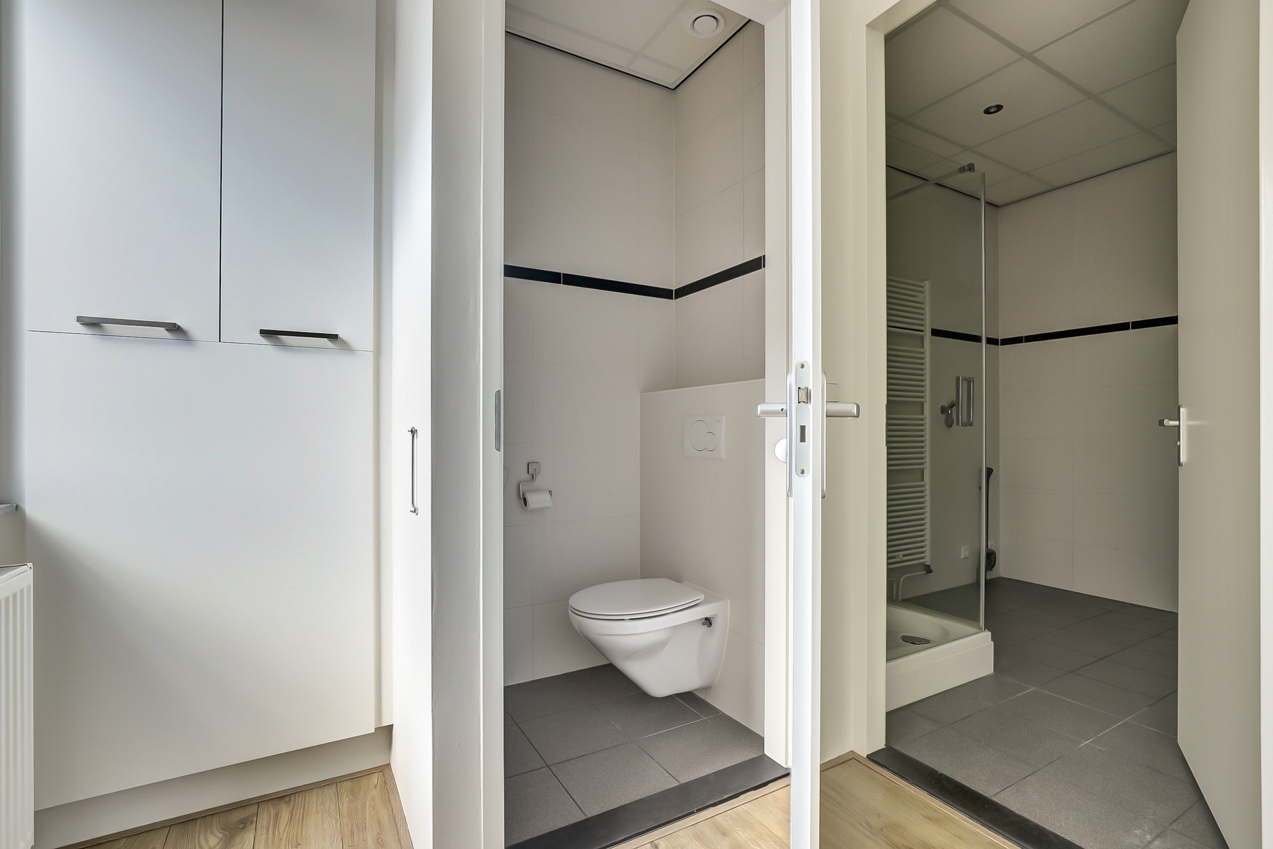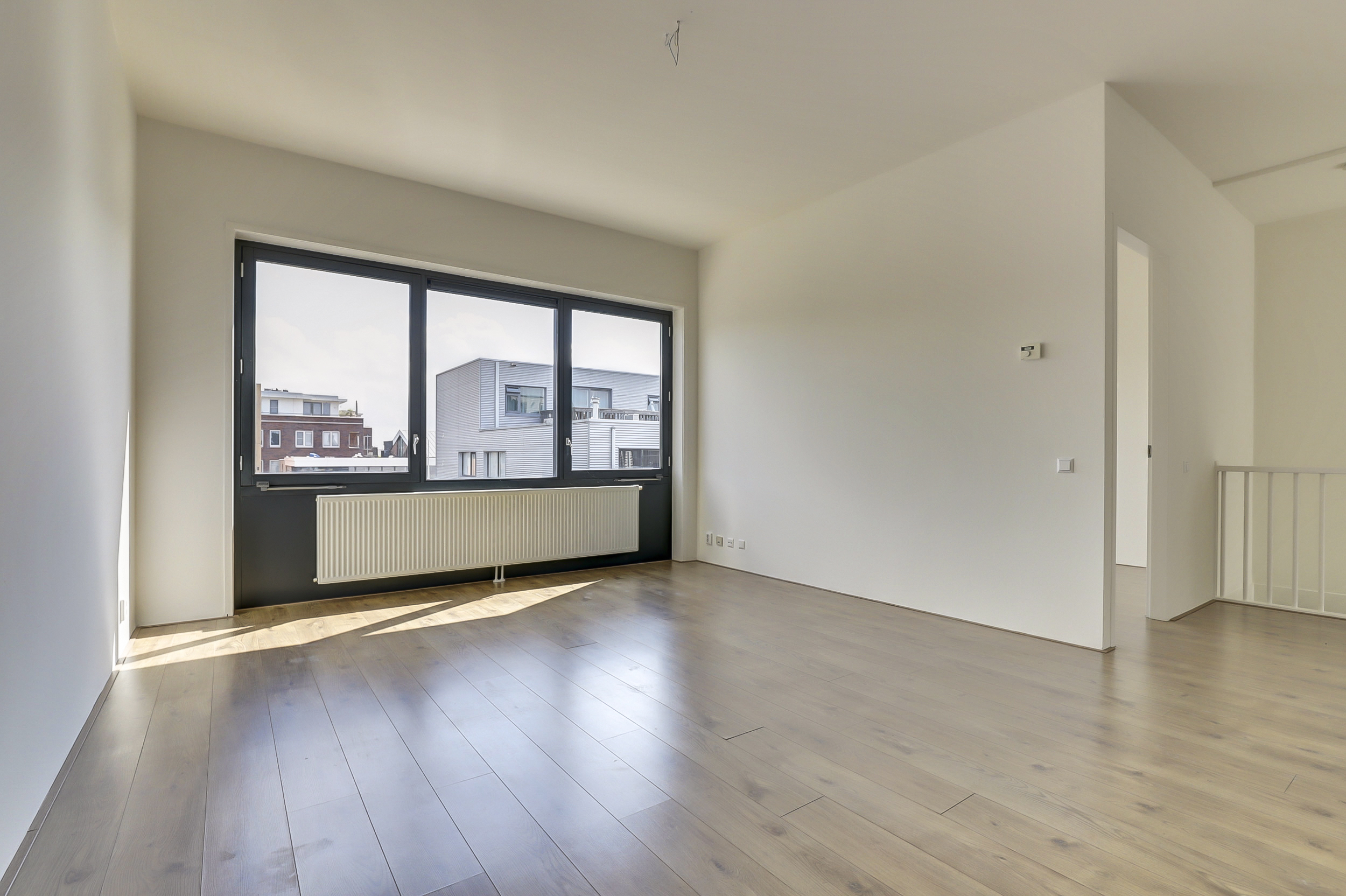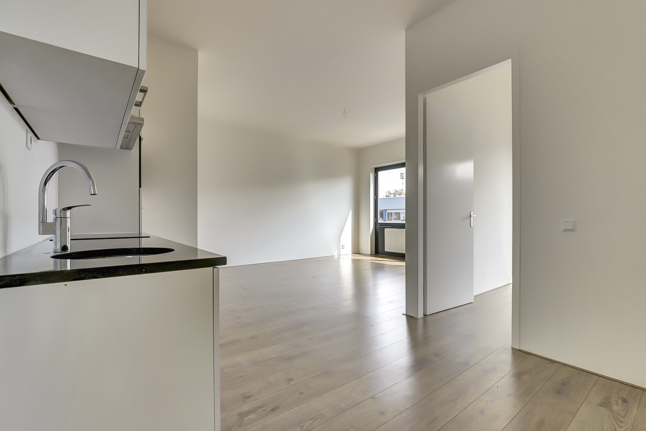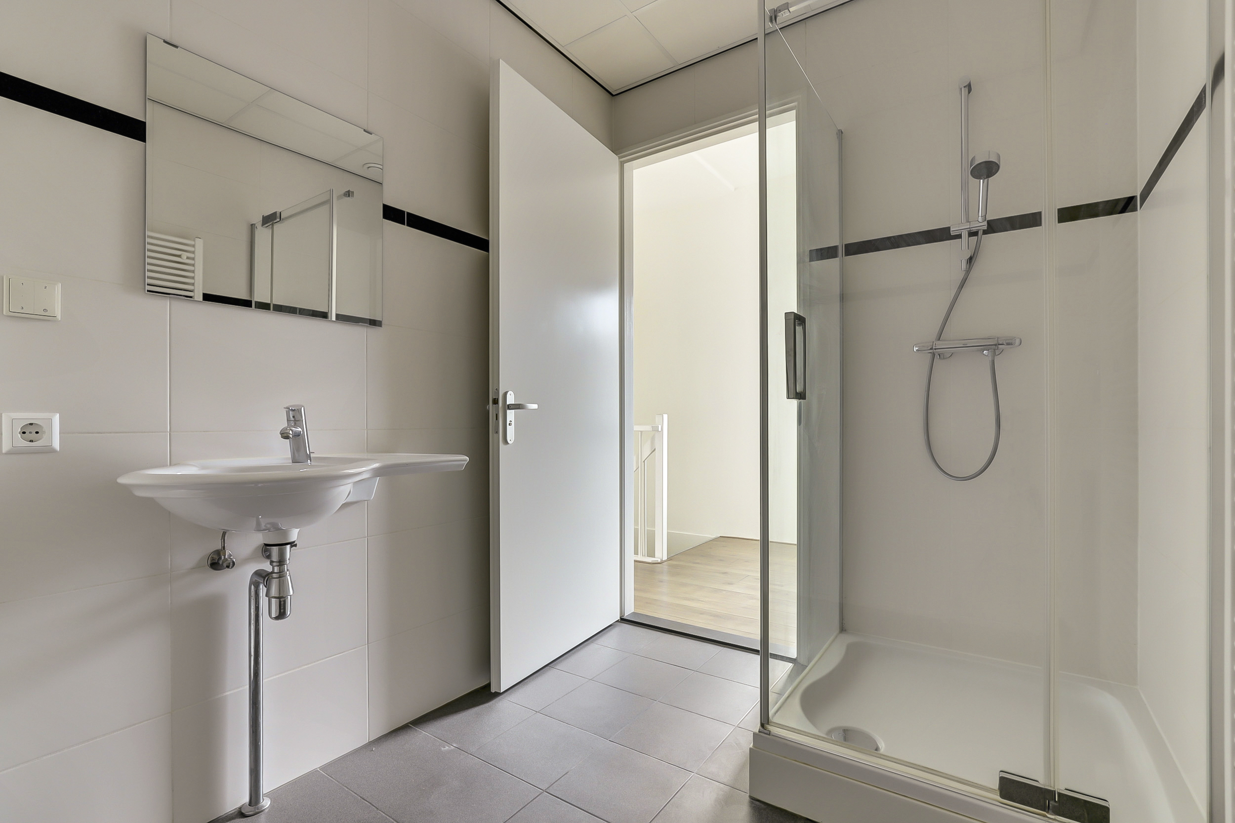 Overloop met toegang tot alle vertrekken op deze verdieping. De woonkamer staat in verbinding met de moderne open keuken, die is uitgerust met een combimagnetron, koelkast met vriesvak, keramische kookplaat en vaatwasmachine. In de aparte kast bevinden zich de cv-installatie (Nefit) en de unit voor mechanische ventilatie. Er is een separate toiletruimte met mechanische ventilatie, een zwevend toilet en een fontein. De badkamer is voorzien van een wastafel, douchecabine, aansluiting voor wasmachine en droger, en een designradiator/handdoekradiator. Slaapkamer één heeft een grootte van 3,48m x 3,09m beschikt over een Frans balkon. Slaapkamer twee heeft een grootte van 2,4m x 3.15m.