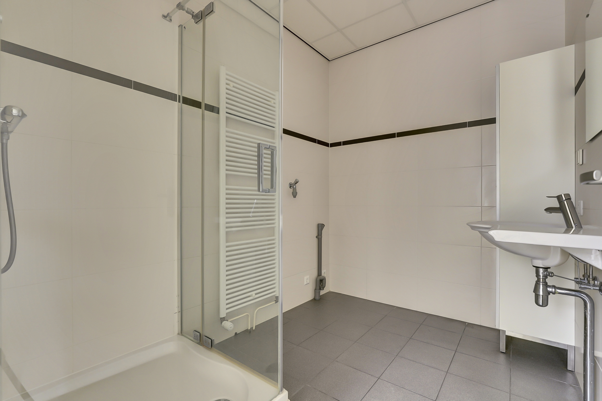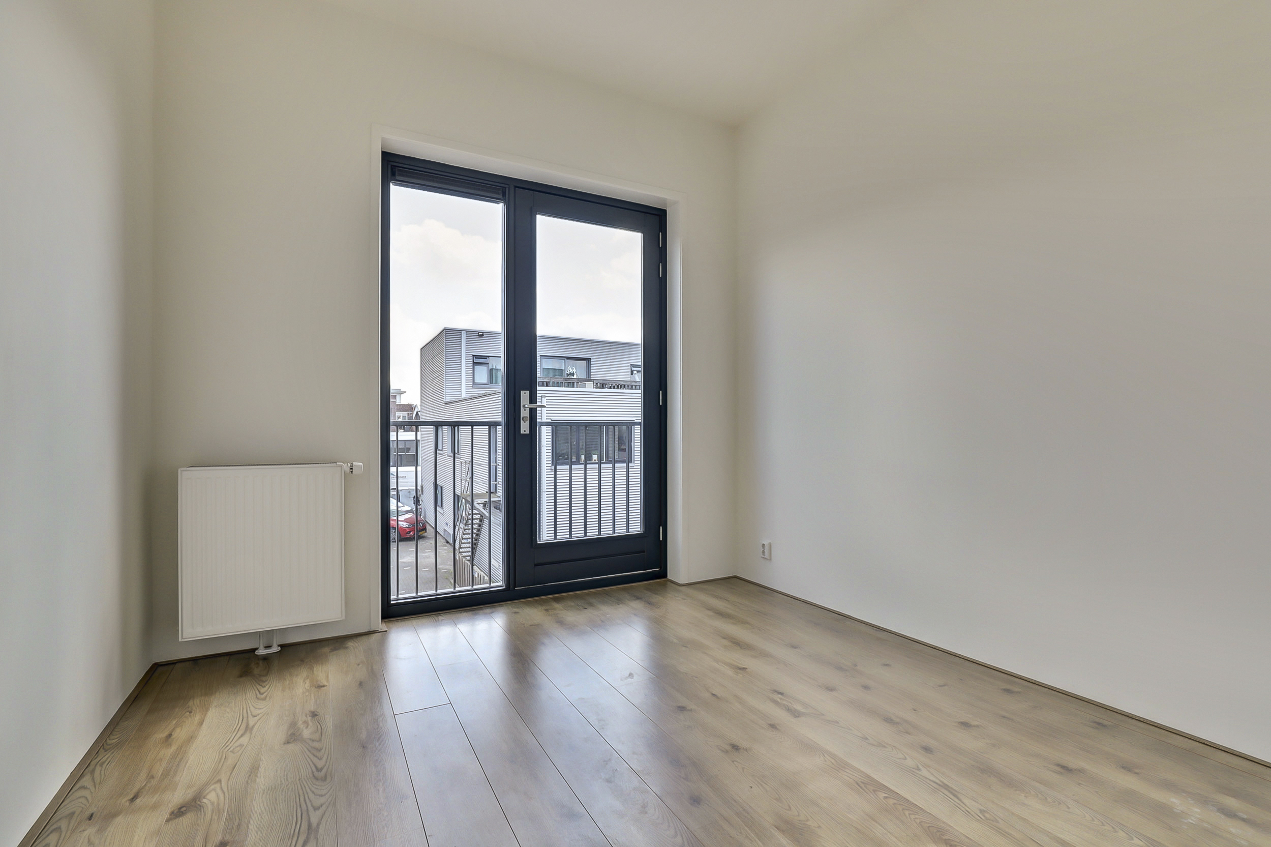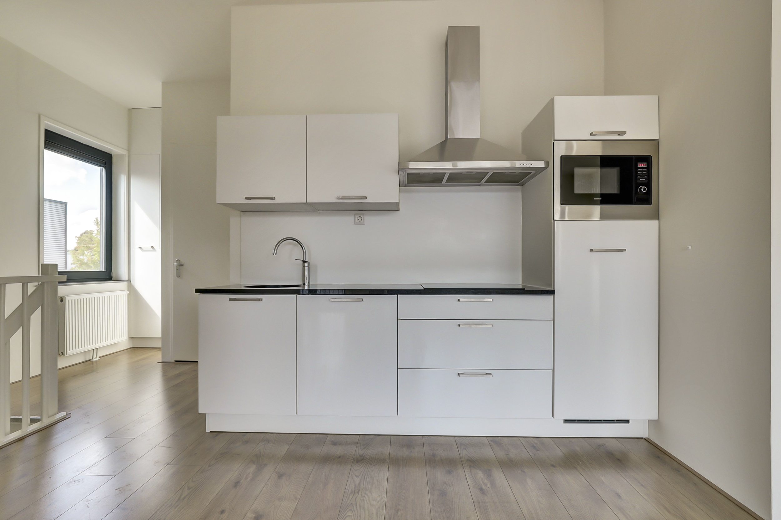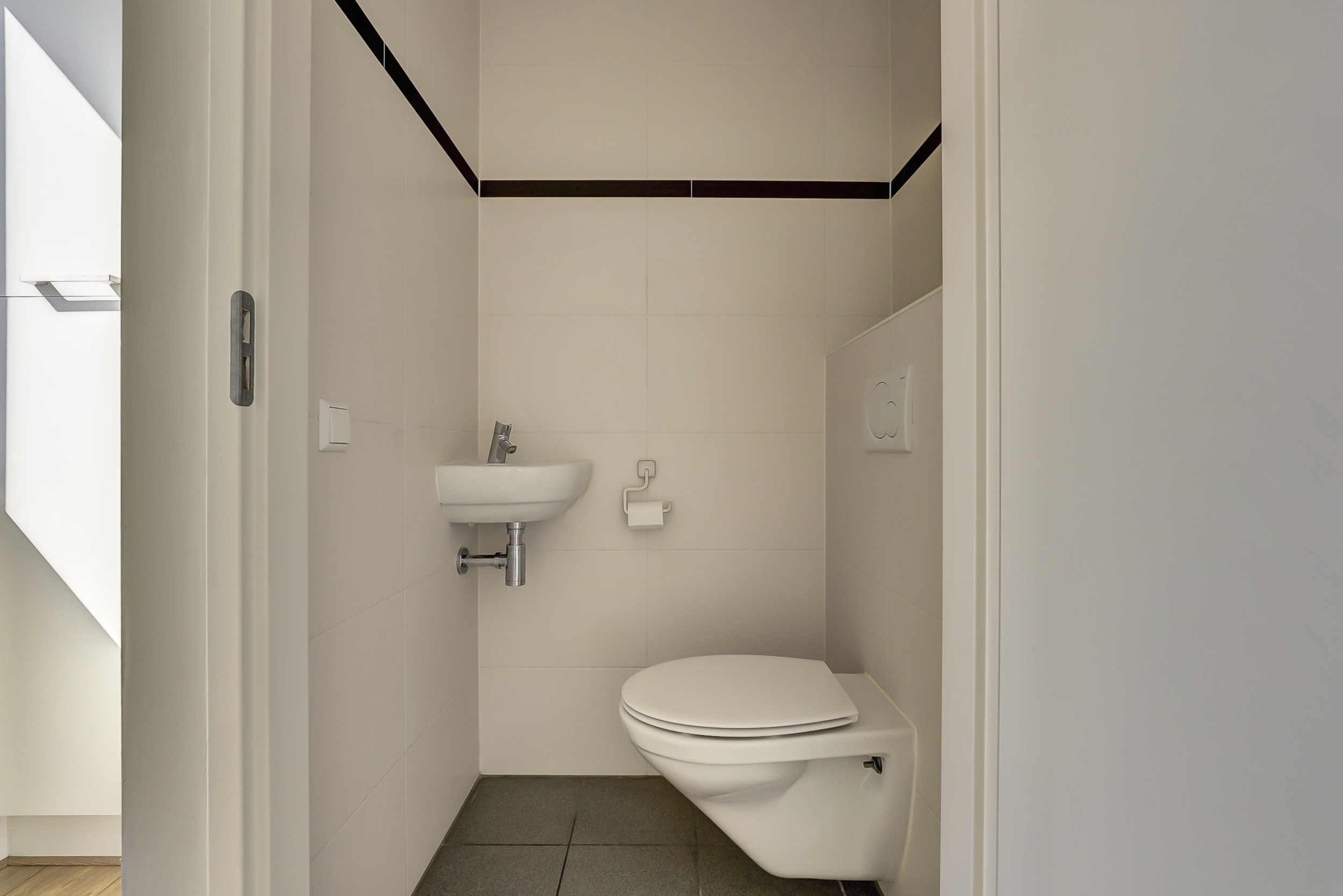 Overloop met toegang tot alle vertrekken op deze verdieping. De woonkamer staat in verbinding met de moderne open keuken, die is uitgerust met een combimagnetron, koelkast met vriesvak, keramische kookplaat en vaatwasmachine. In de aparte kast bevinden zich de cv-installatie (Nefit) en de unit voor mechanische ventilatie. Er is een separate toiletruimte met mechanische ventilatie, een zwevend toilet en een fontein. De badkamer is voorzien van een wastafel, douchecabine, aansluiting voor wasmachine en droger, en een designradiator/handdoekradiator. Slaapkamer één heeft een grootte van 3,48m x 3,09m beschikt over een Frans balkon. Slaapkamer twee heeft een grootte van 2,4m x 3.15m.
