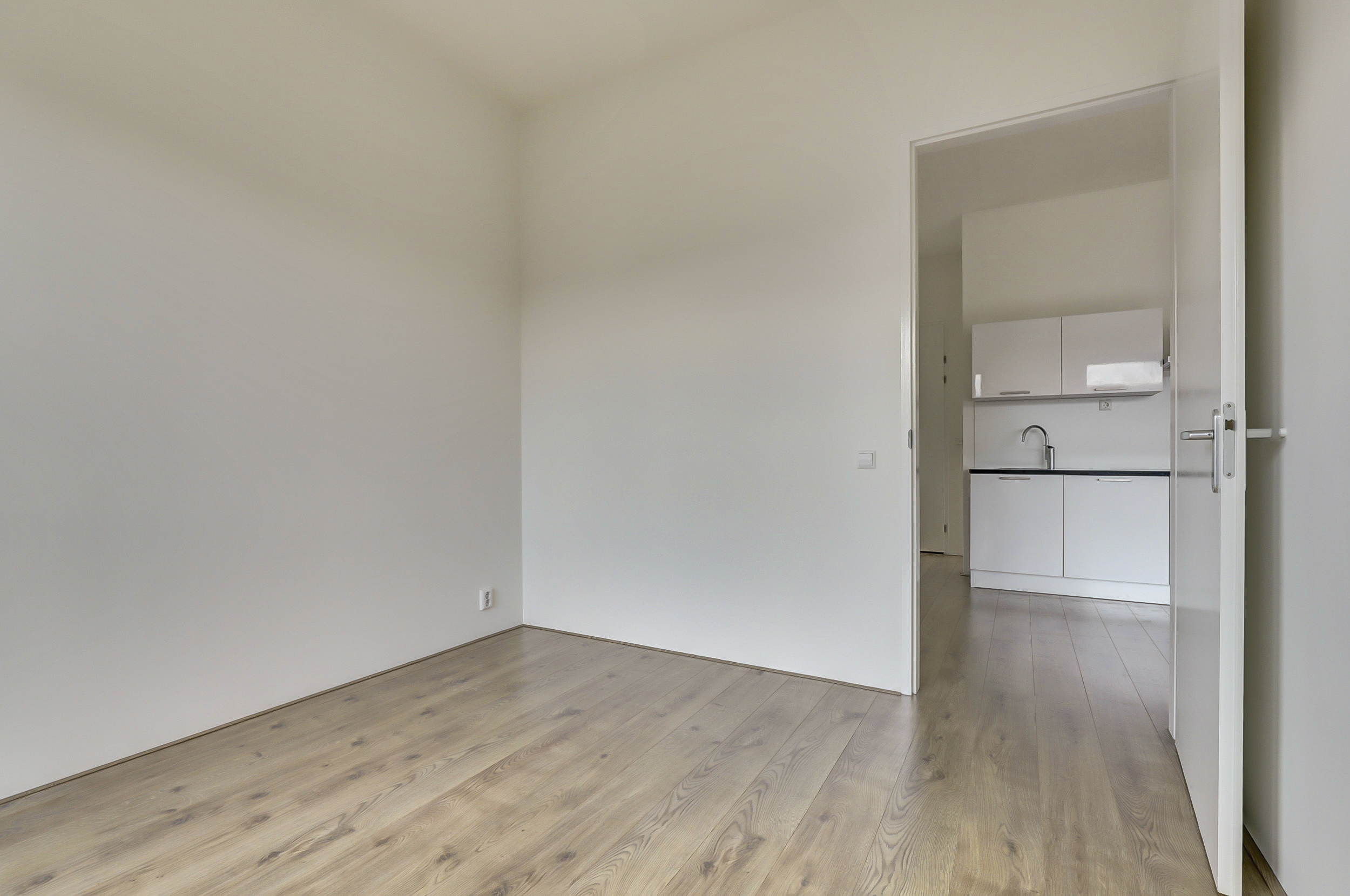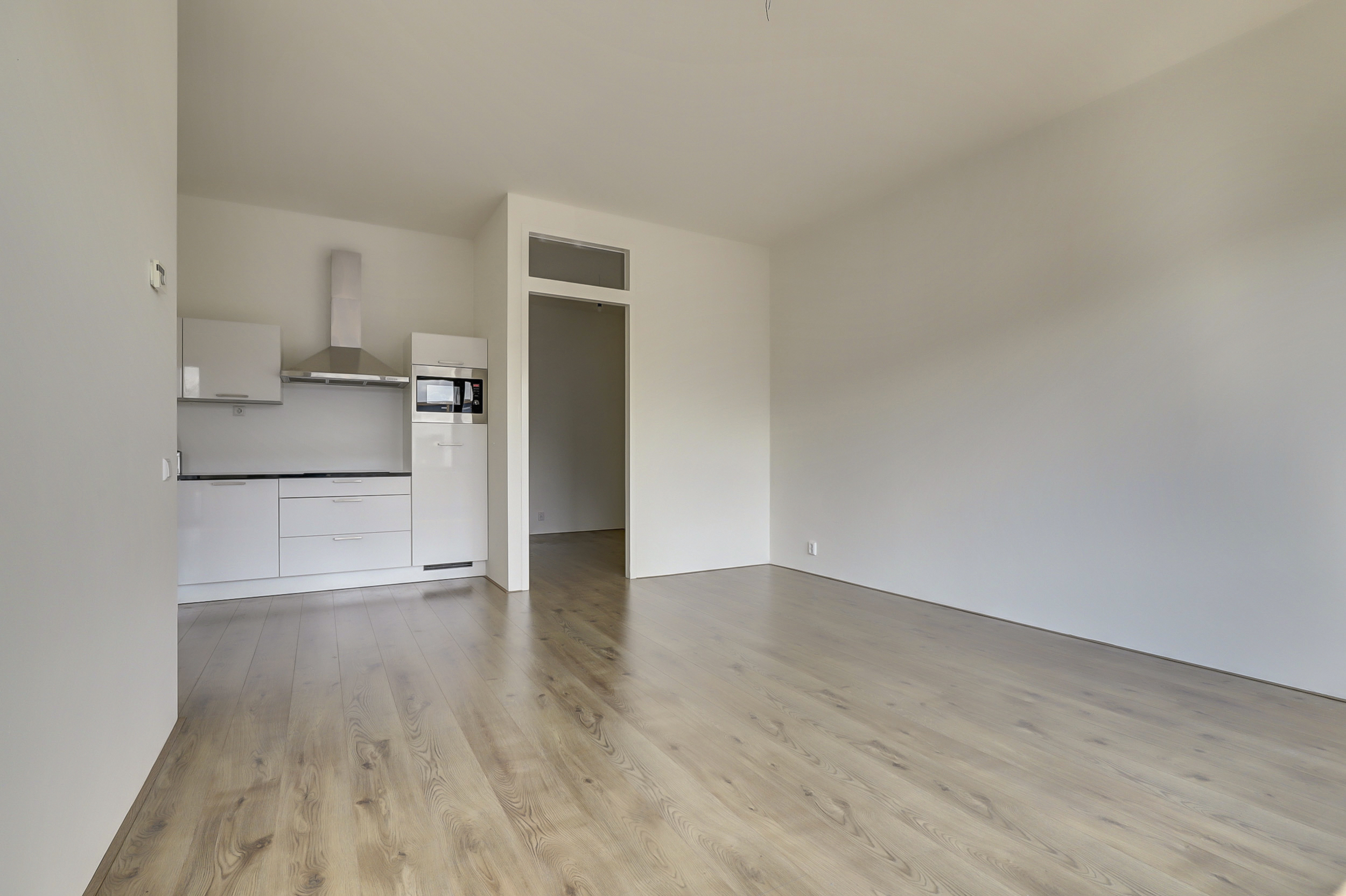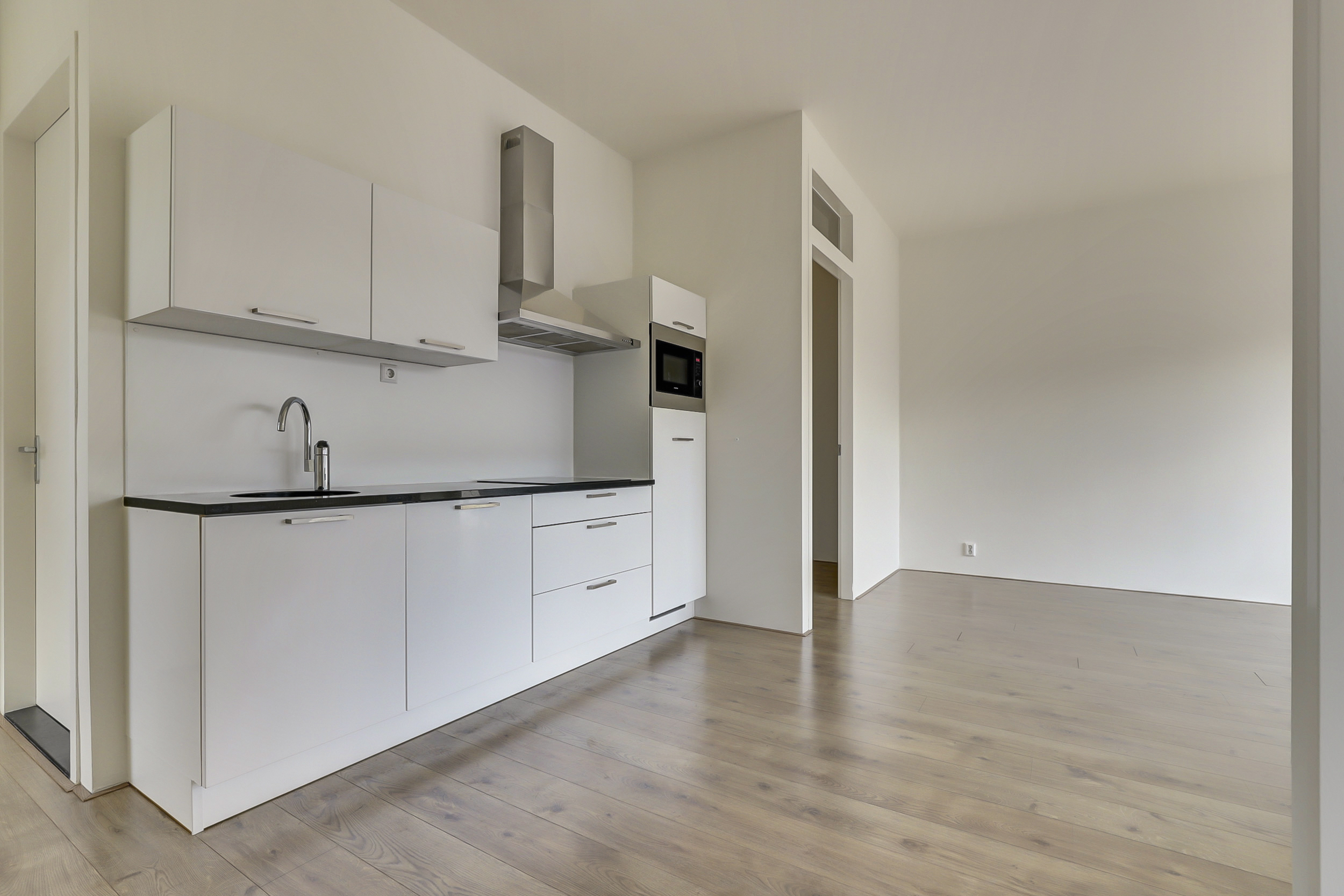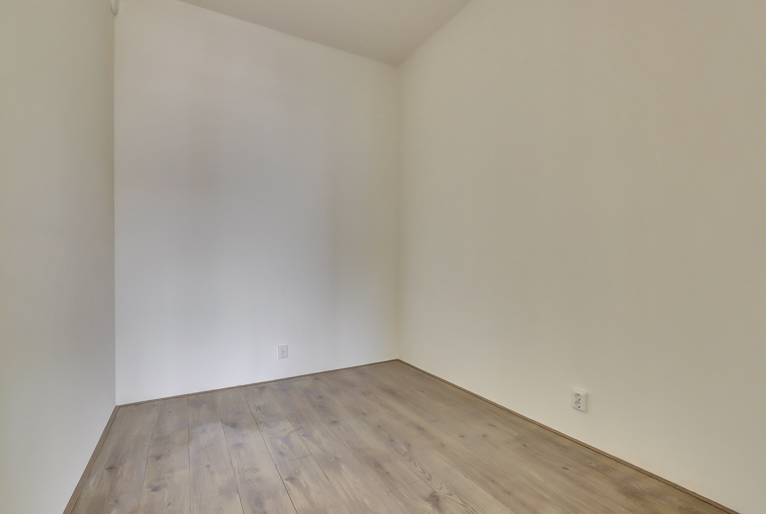 Overloop met toegang tot alle vertrekken op deze verdieping. De woonkamer staat in verbinding met de moderne open keuken, die is uitgerust met een combimagnetron, koelkast met vriesvak, keramische kookplaat en vaatwasmachine. In de aparte kast bevinden zich de cv-installatie (Nefit) en de unit voor mechanische ventilatie. Er is een separate toiletruimte met mechanische ventilatie, een zwevend toilet en een fontein. De badkamer is voorzien van een wastafel, douchecabine, aansluiting voor wasmachine en droger, en een designradiator/handdoekradiator. Slaapkamer één heeft een grootte van 3,48m x 3,09m beschikt over een Frans balkon. Slaapkamer twee heeft een grootte van 2,4m x 3.15m.