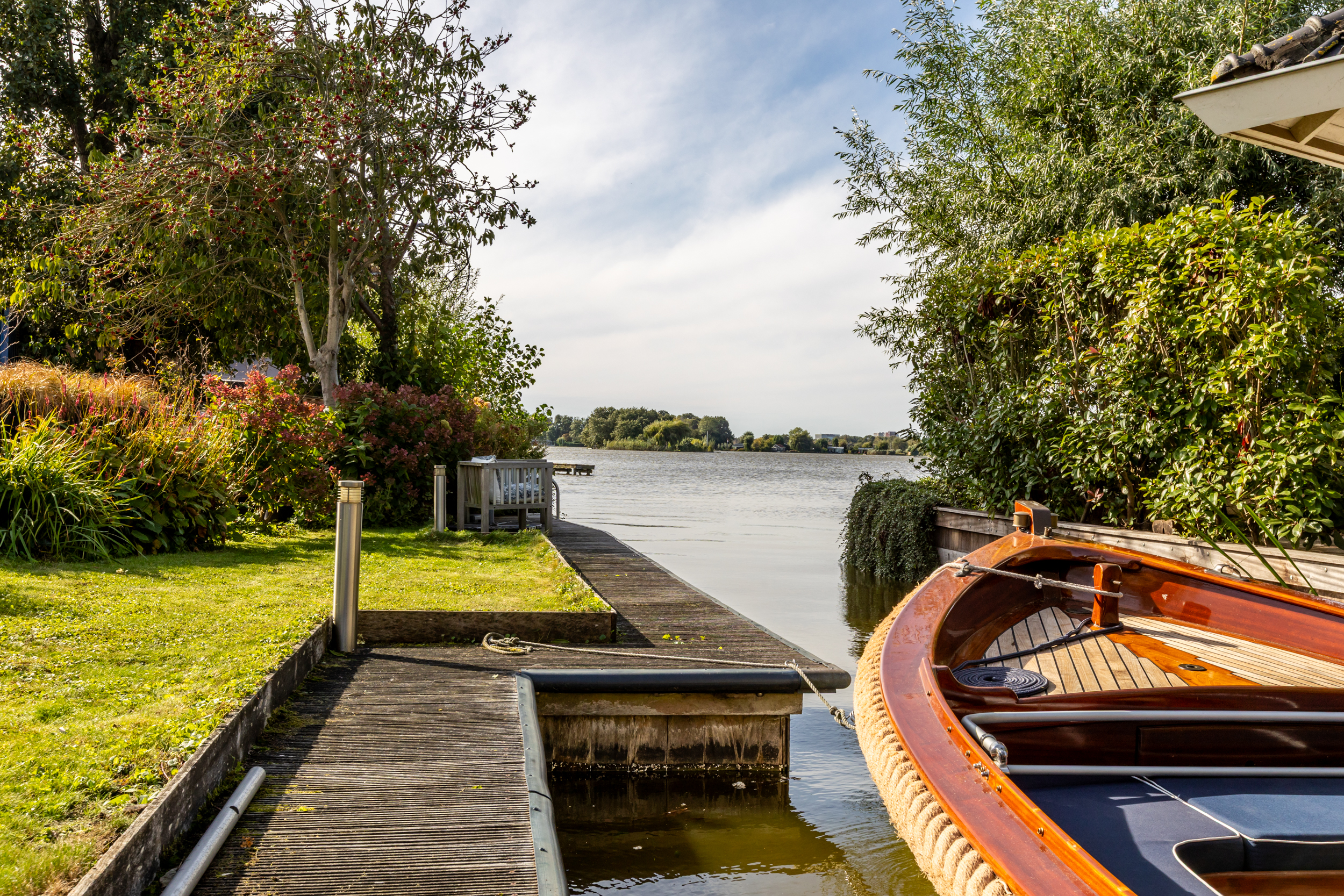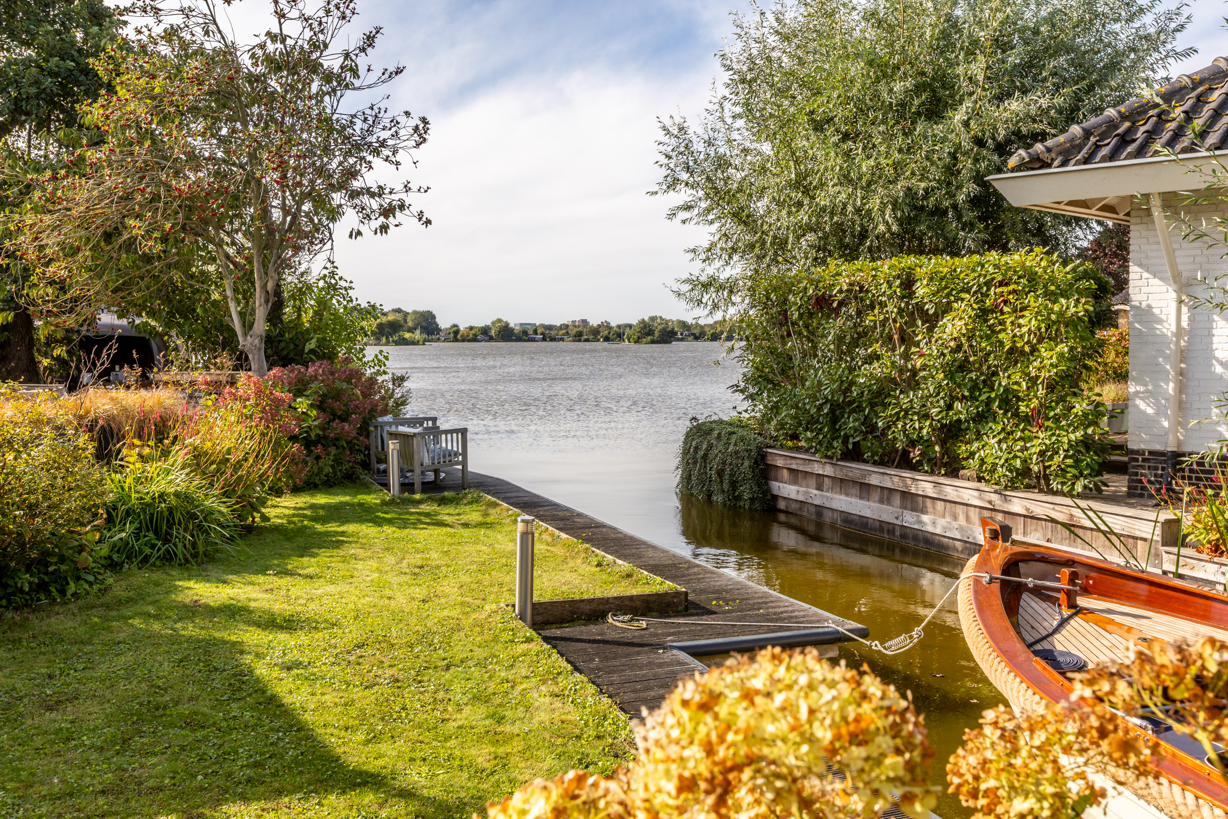De zonnige achtertuin op het zuidwesten grenst direct aan de ‘s-Gravenbroekseplas en beschikt over een eigen steiger en havenligplaats. Hier is directe zwemgelegenheid vanuit de tuin. Het royale onderheide terras biedt volop plek om te ontspannen. Daarnaast is er een houten berging met elektra en een jacuzzi.