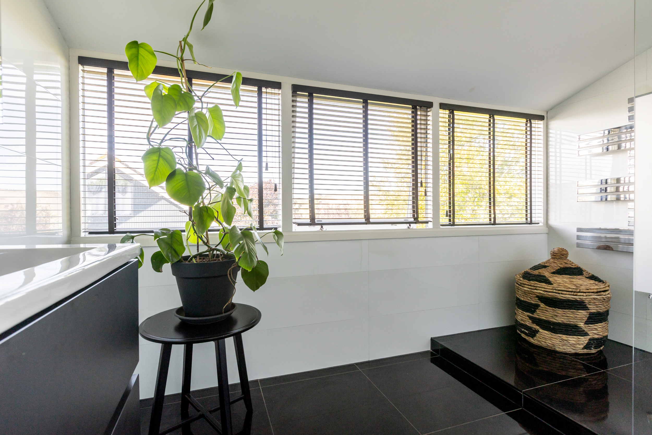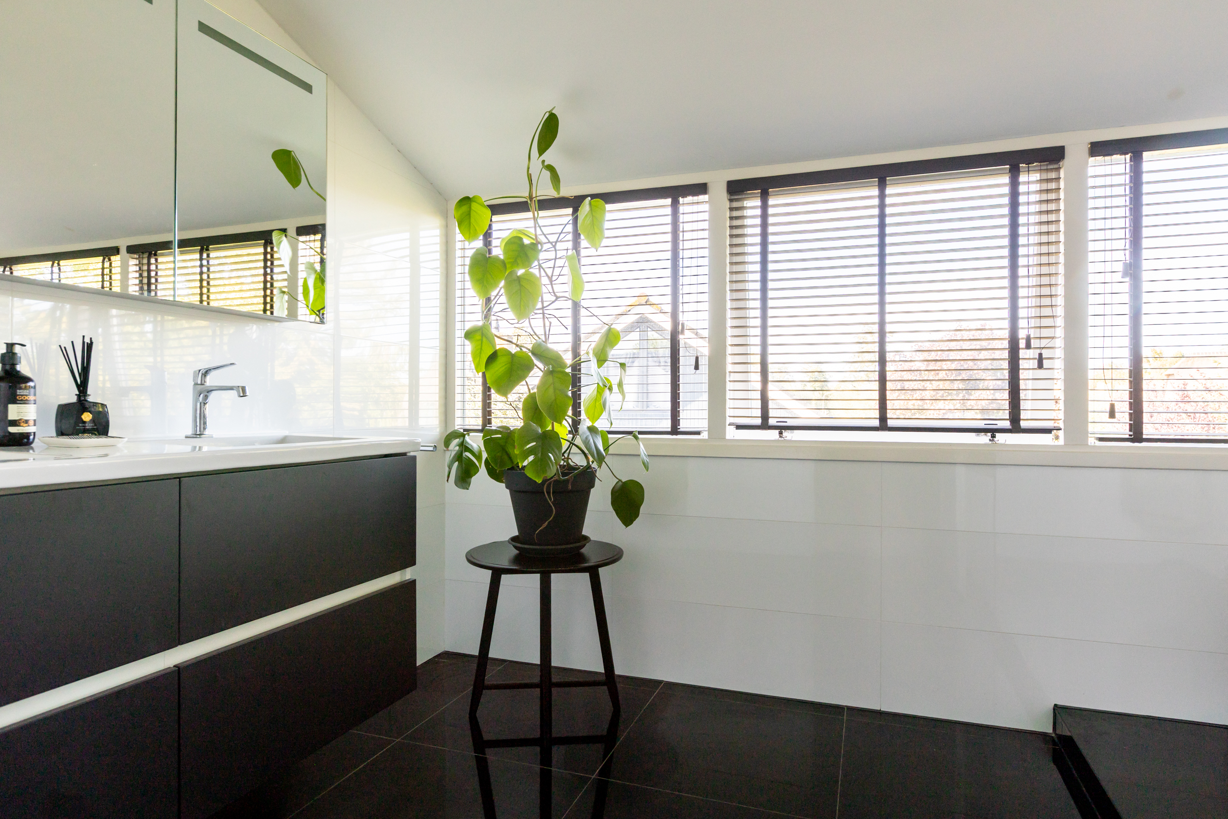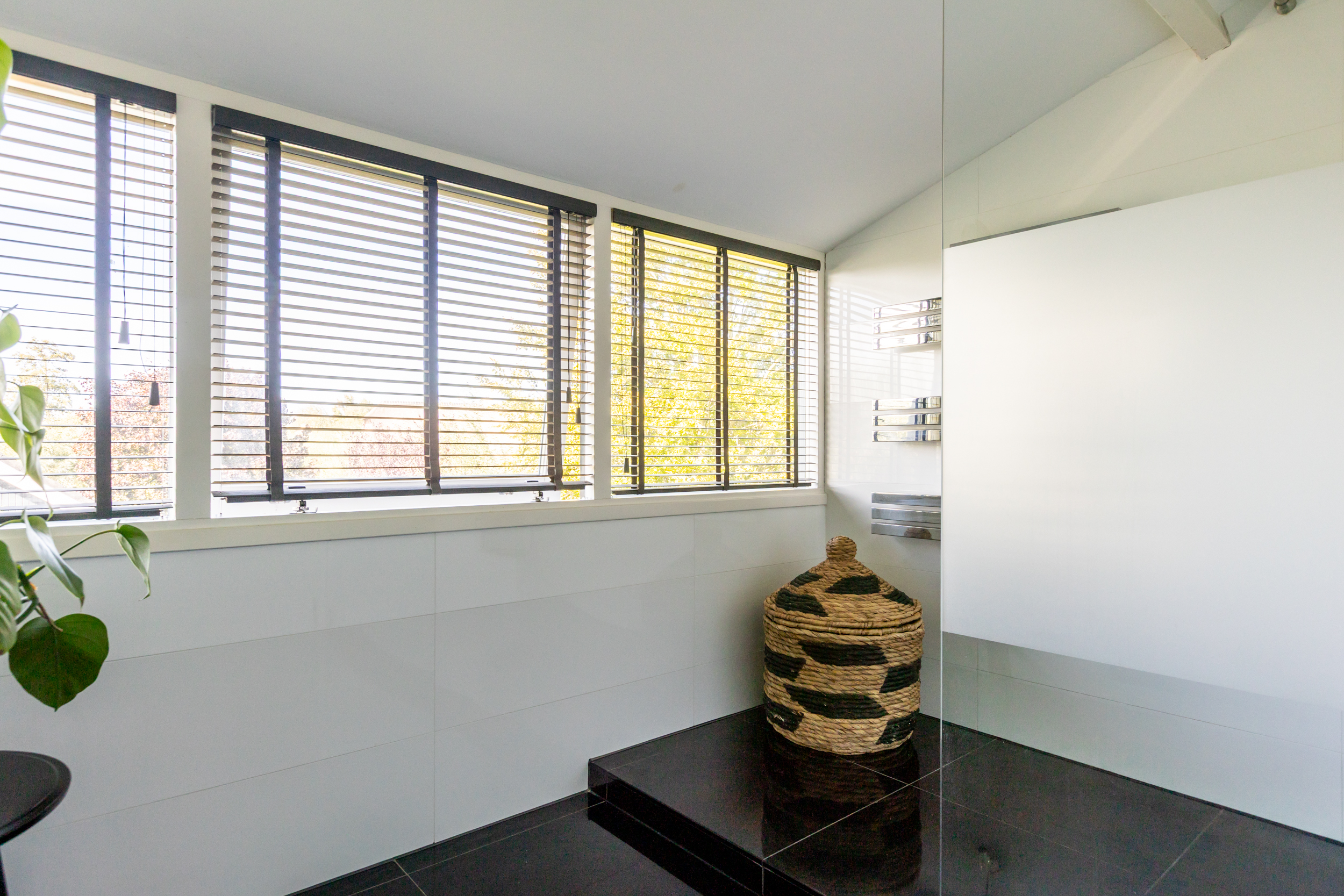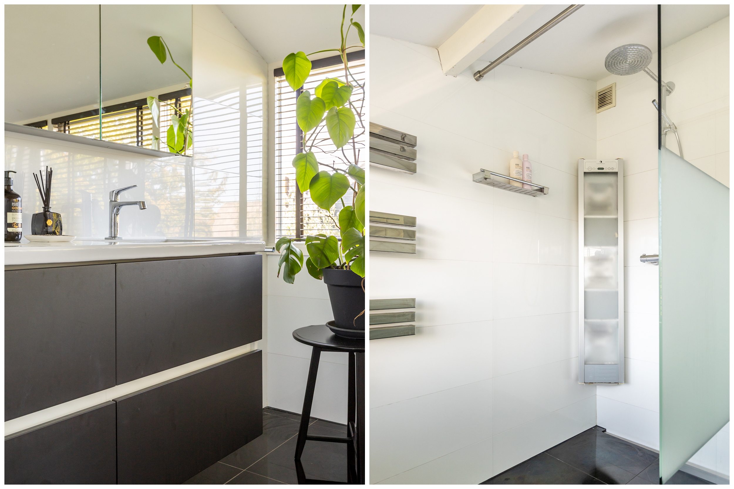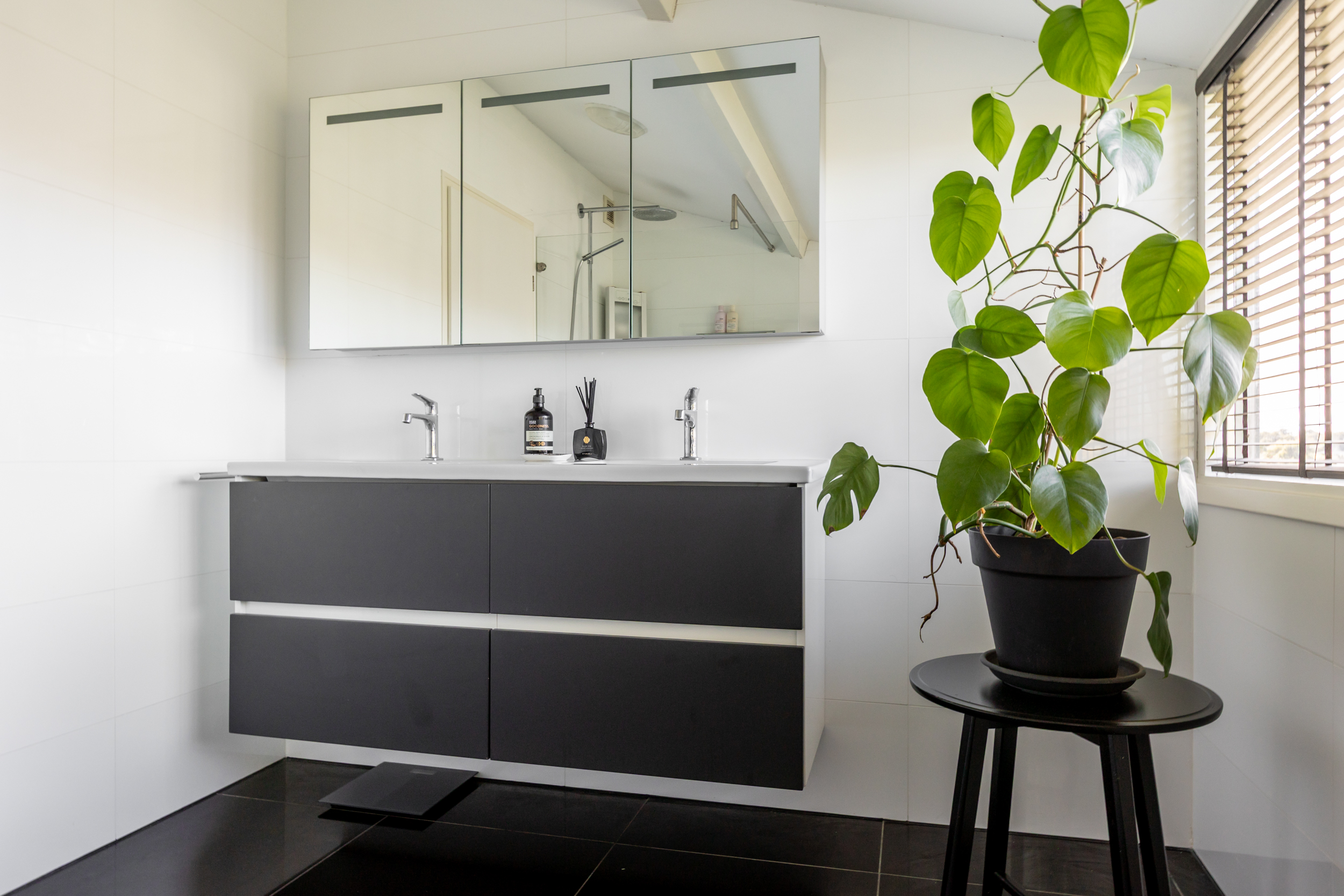 De luxe badkamer met dakkapel is voorzien van een inloopdouche met glazen wand en sunshower, een design wastafelmeubel (Detremmerie, Belgisch design) met dubbele kom, dubbele kraan en softclose laden, een spiegelkast met verlichting en verwarming (beiden 2023), luxe tegelafwerking (hoogglans zwart gecombineerd met wit) en een elektrische designradiator.
