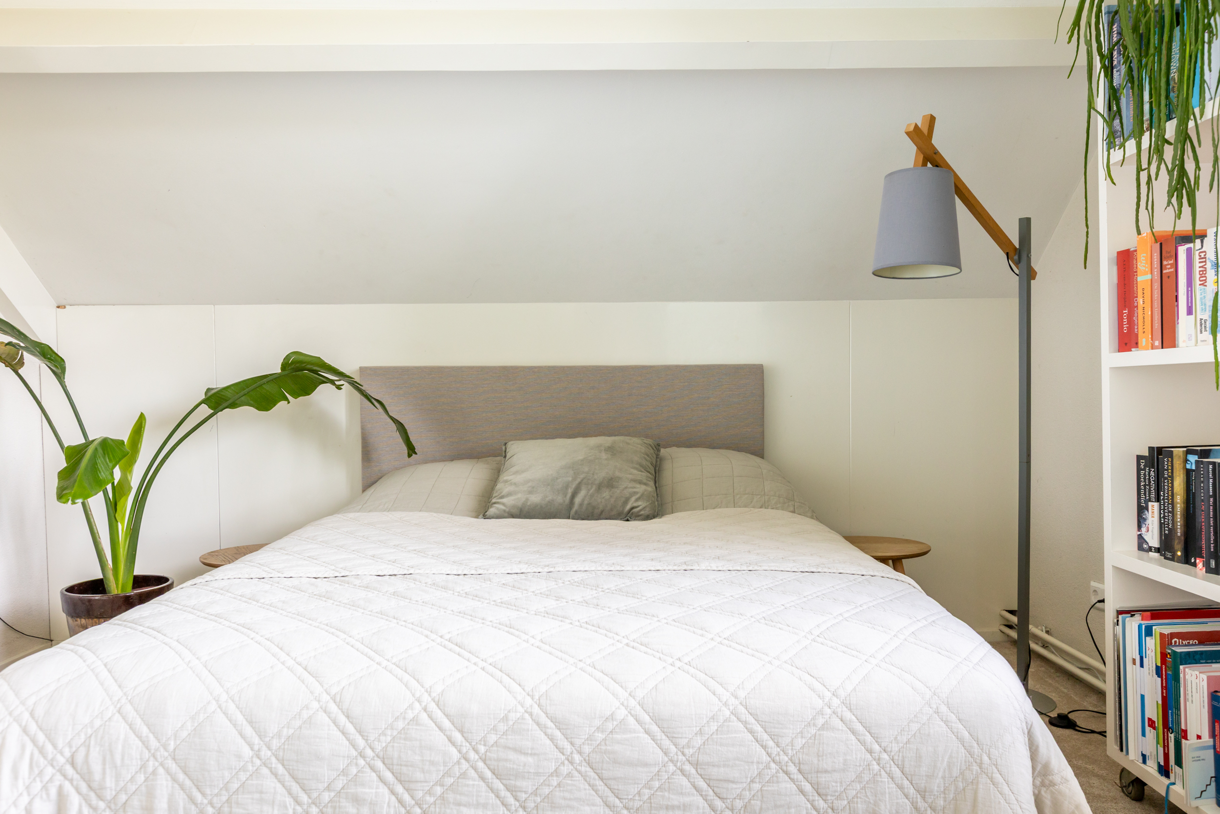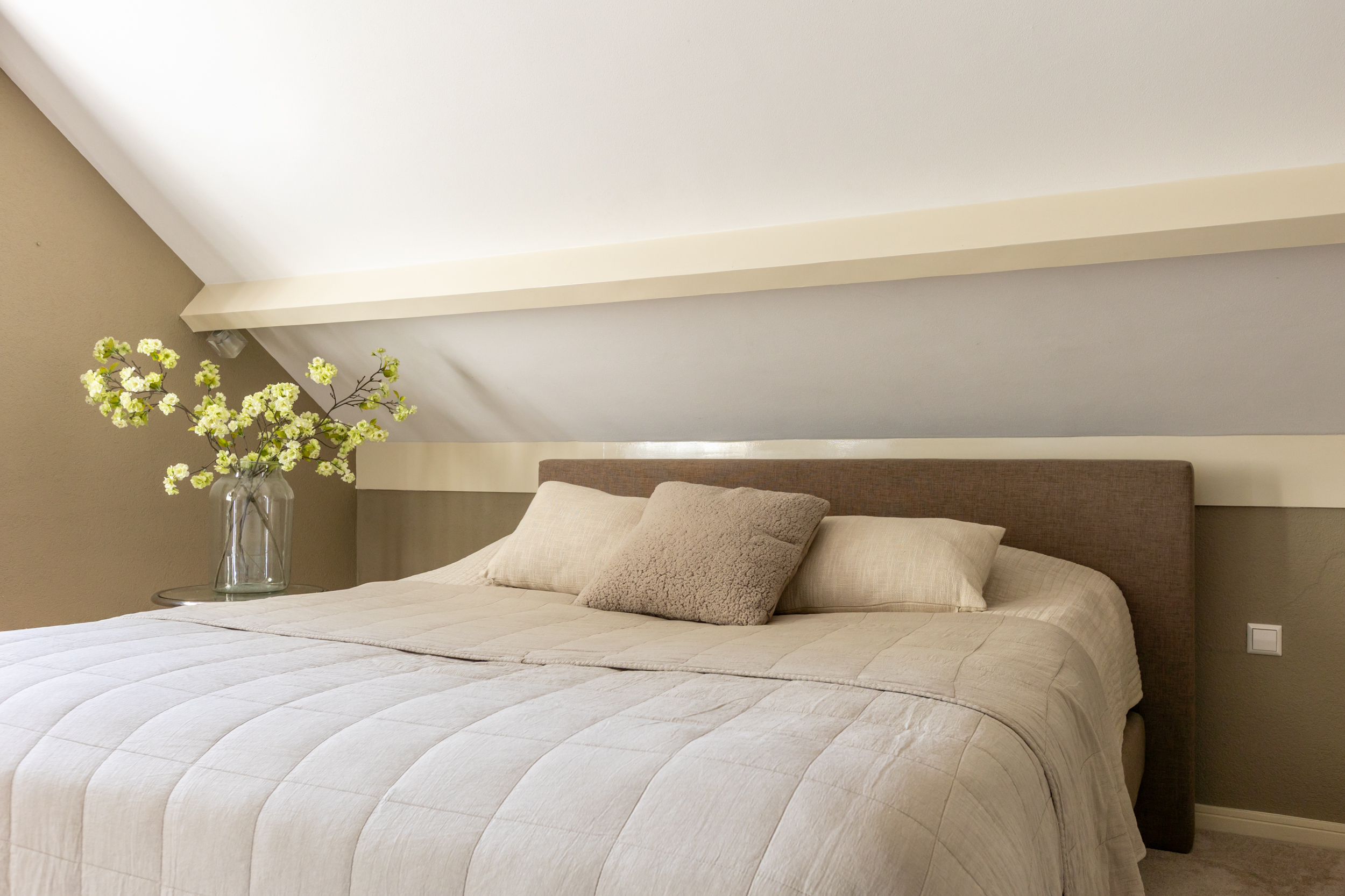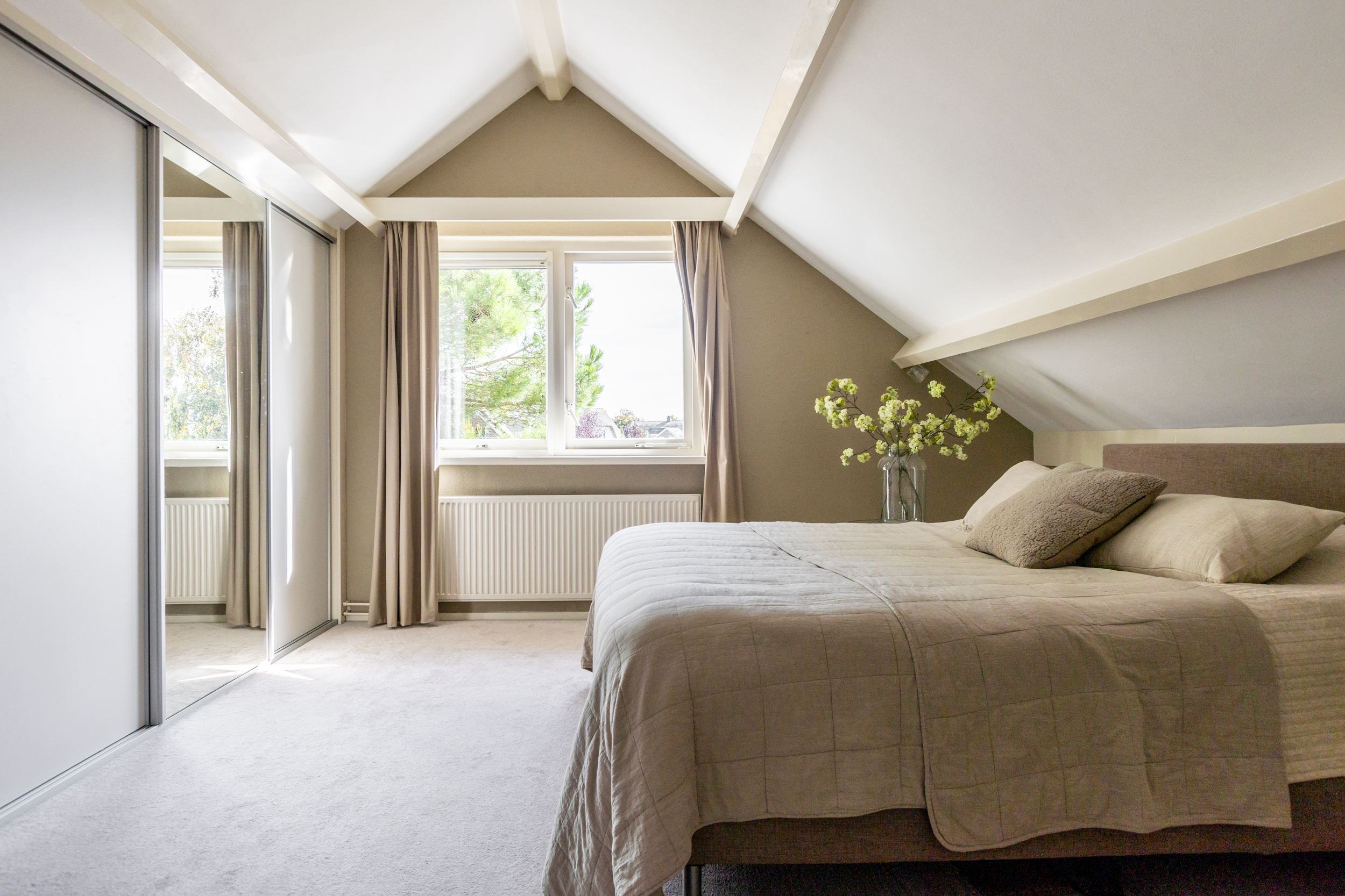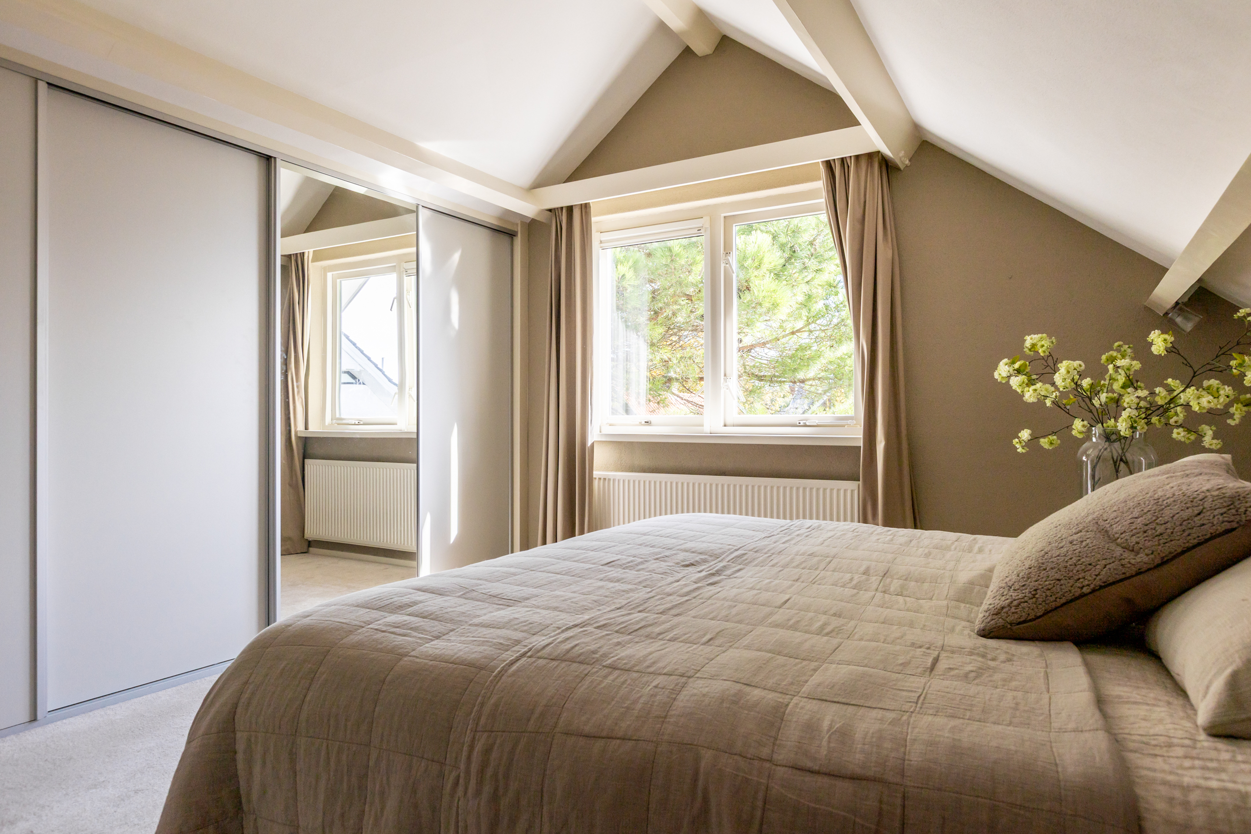 Masterbedroom: royale slaapkamer met hoge nok en diepe schuifwandkast.