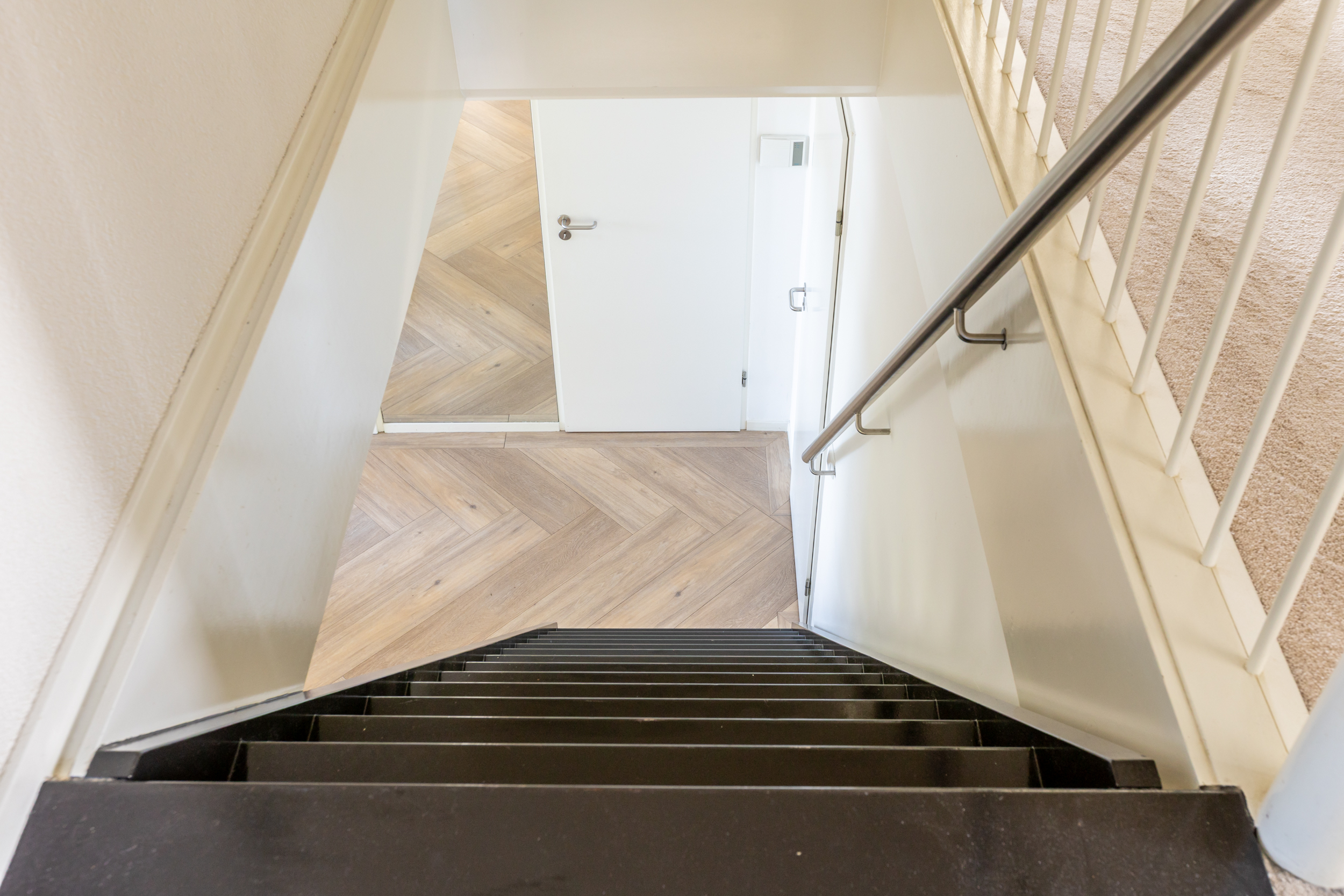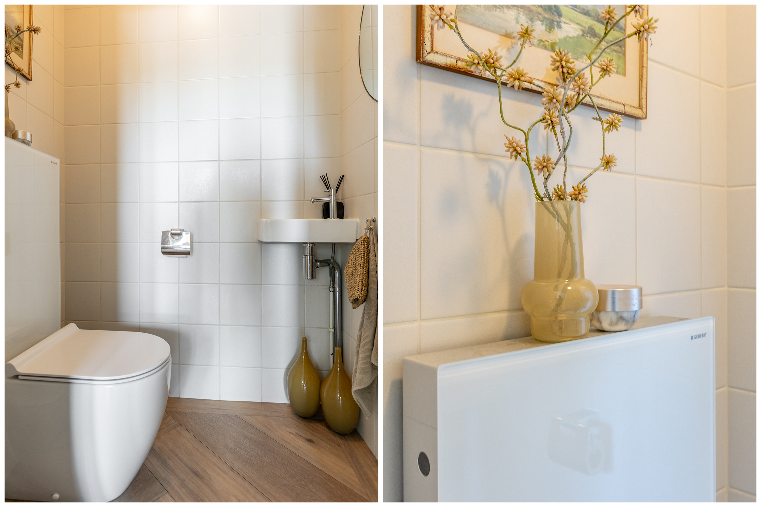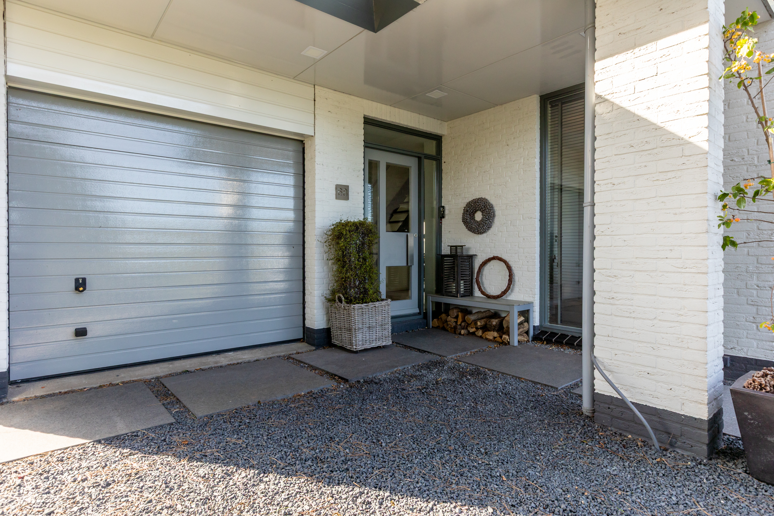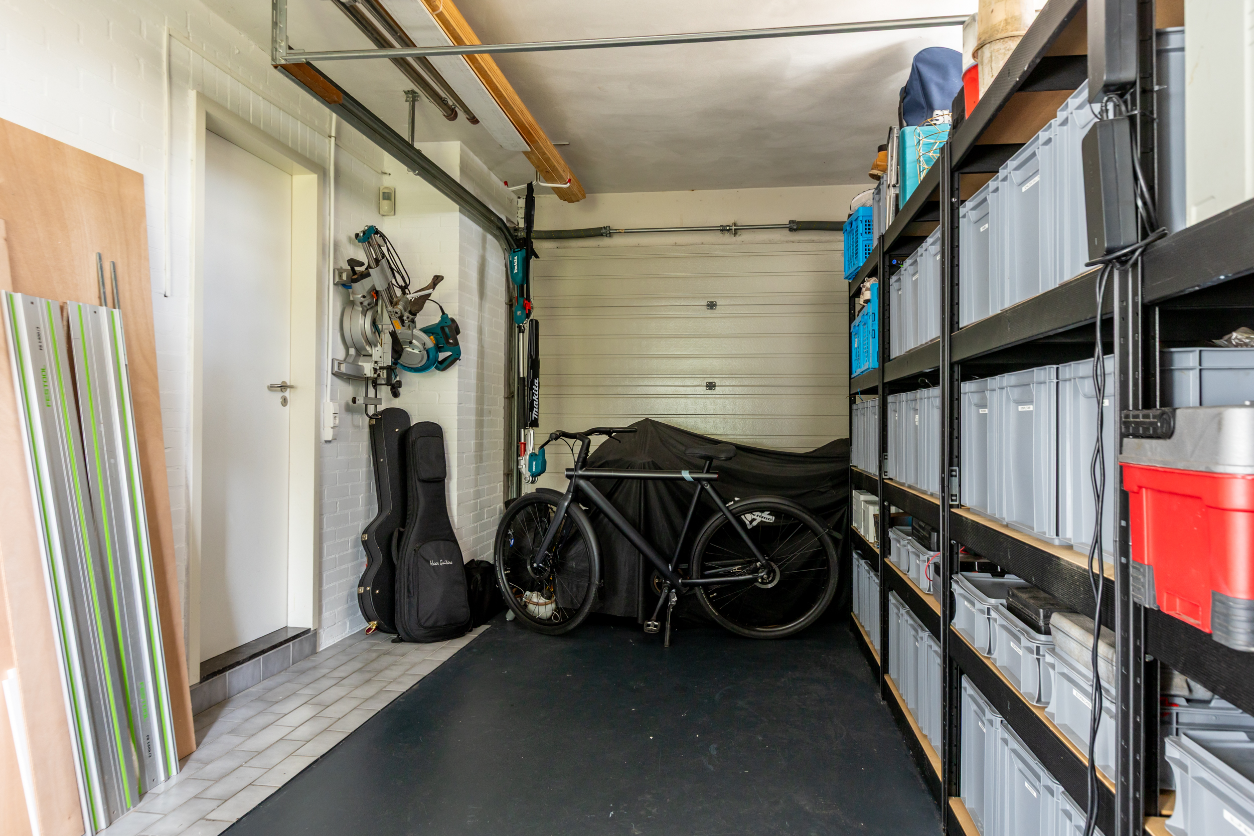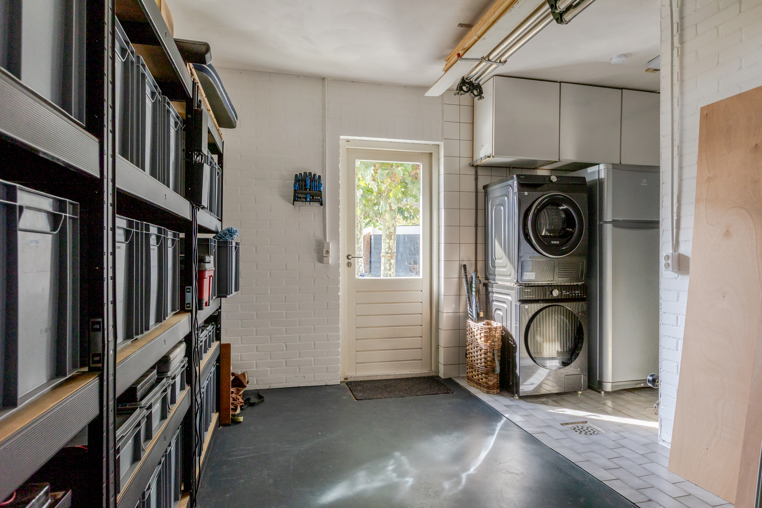 Ruime entree met garderobe, meterkast (12 groepen, krachtstroom en dubbele kookgroep) en een modern toilet met Italiaans sanitair, wastafel en volledig betegelde afwerking. De trapopgang is uitgevoerd in hout (zwart geverfd) en er is inpandig toegang tot de garage. De garage beschikt over een garagedeur aan de voorzijde en een loopdeur naar de achtertuin, aansluitingen voor wasapparatuur, verwarming, water, elektra, tegelvloer en een praktische gootsteen.