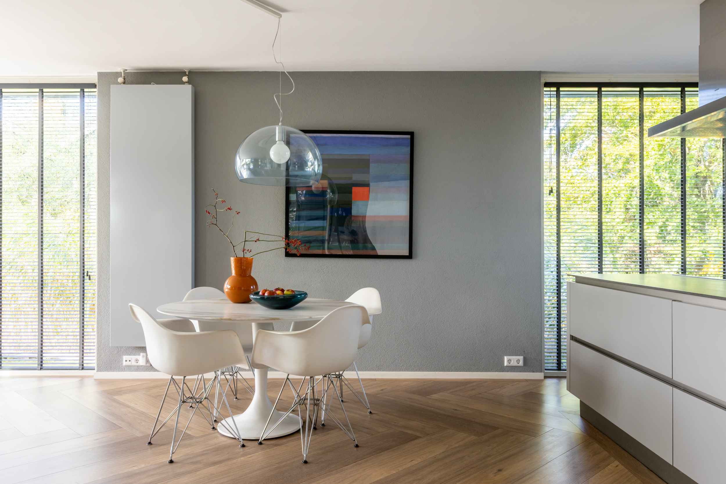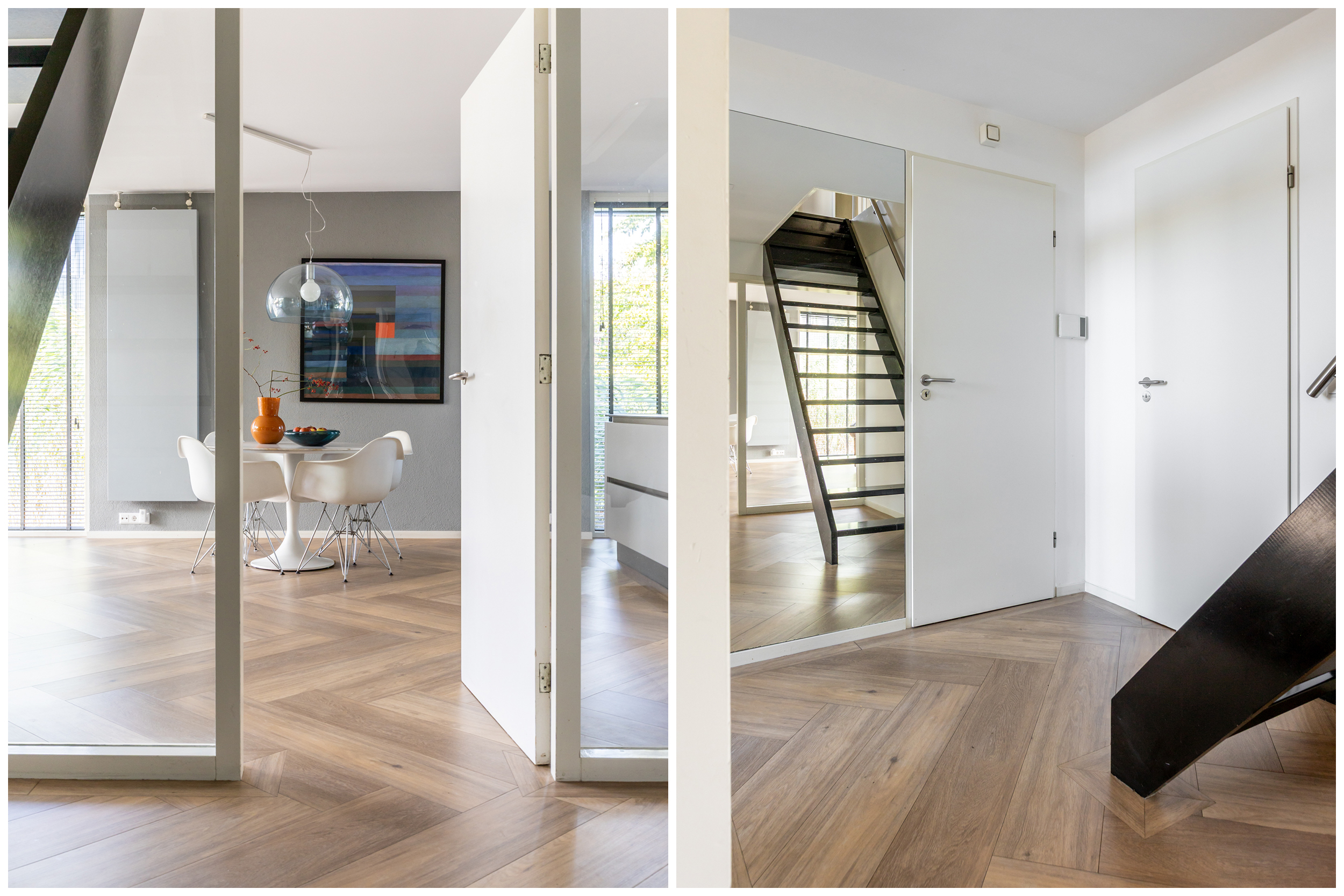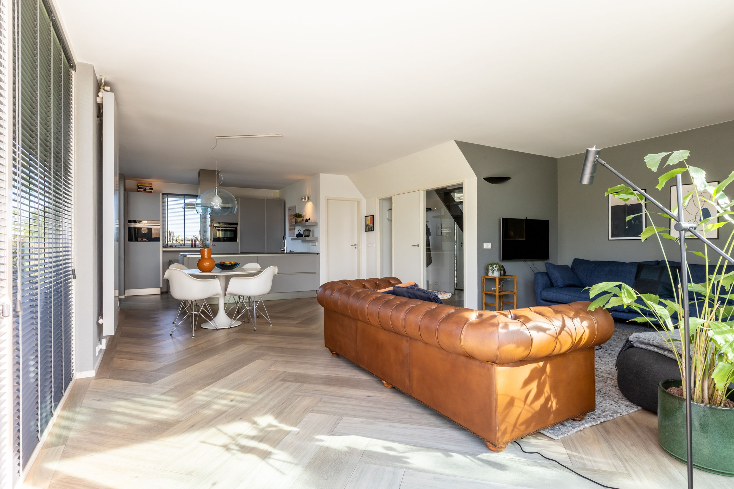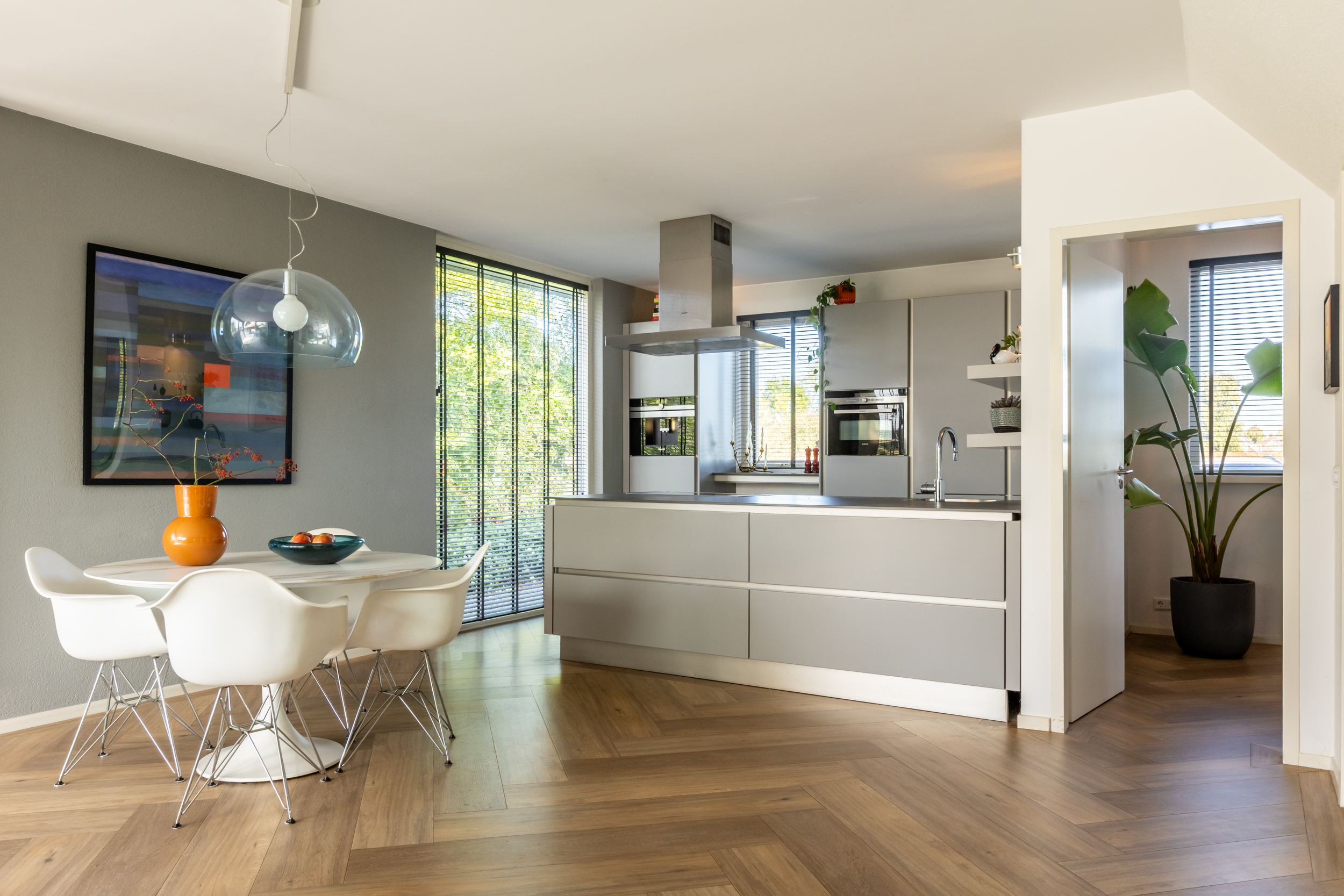 De entree, keuken, woonkamer en studeerkamer zijn voorzien van een PVC vloer in vergrijsd eikenlook met vloerverwarming (2016).