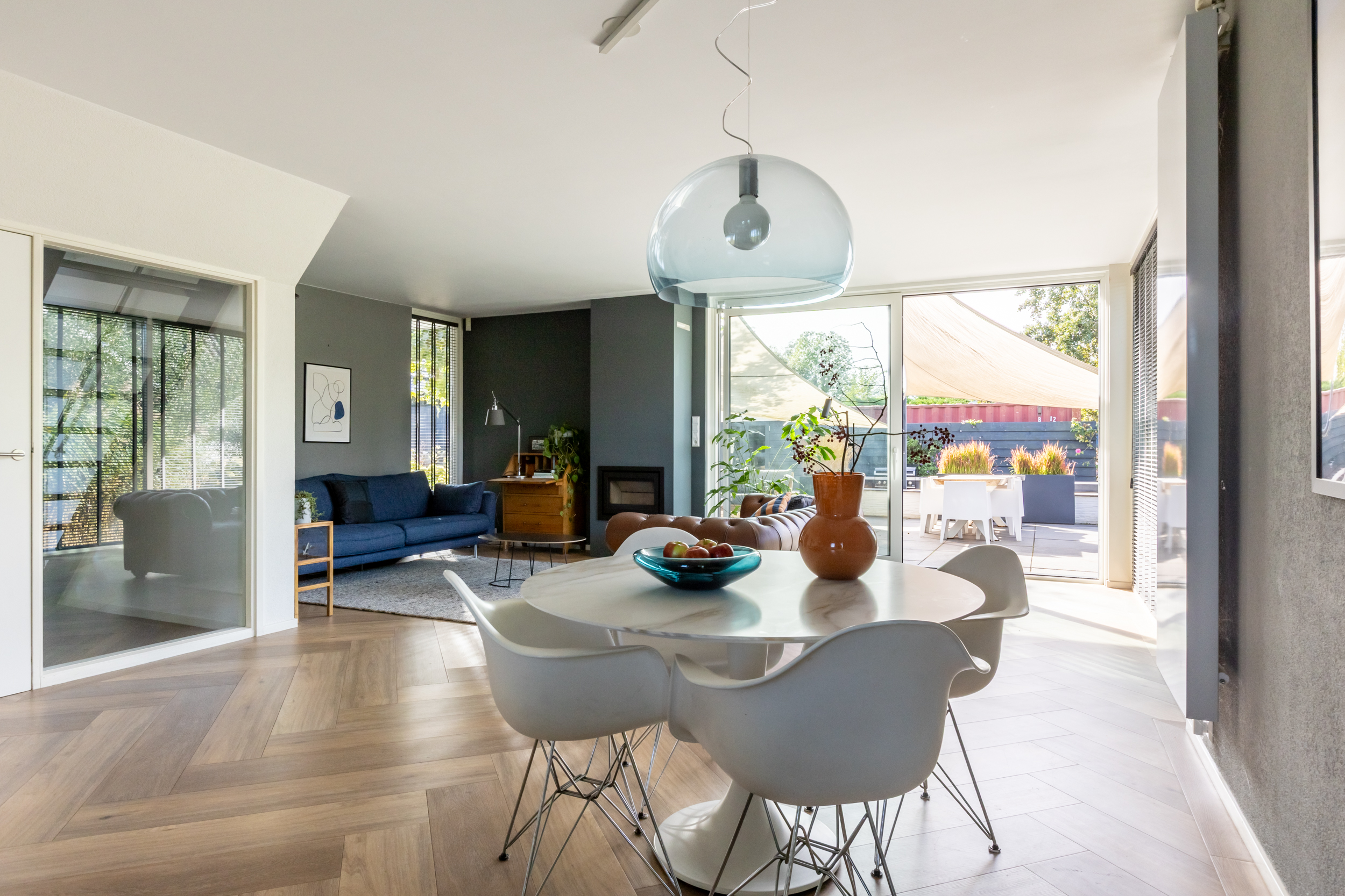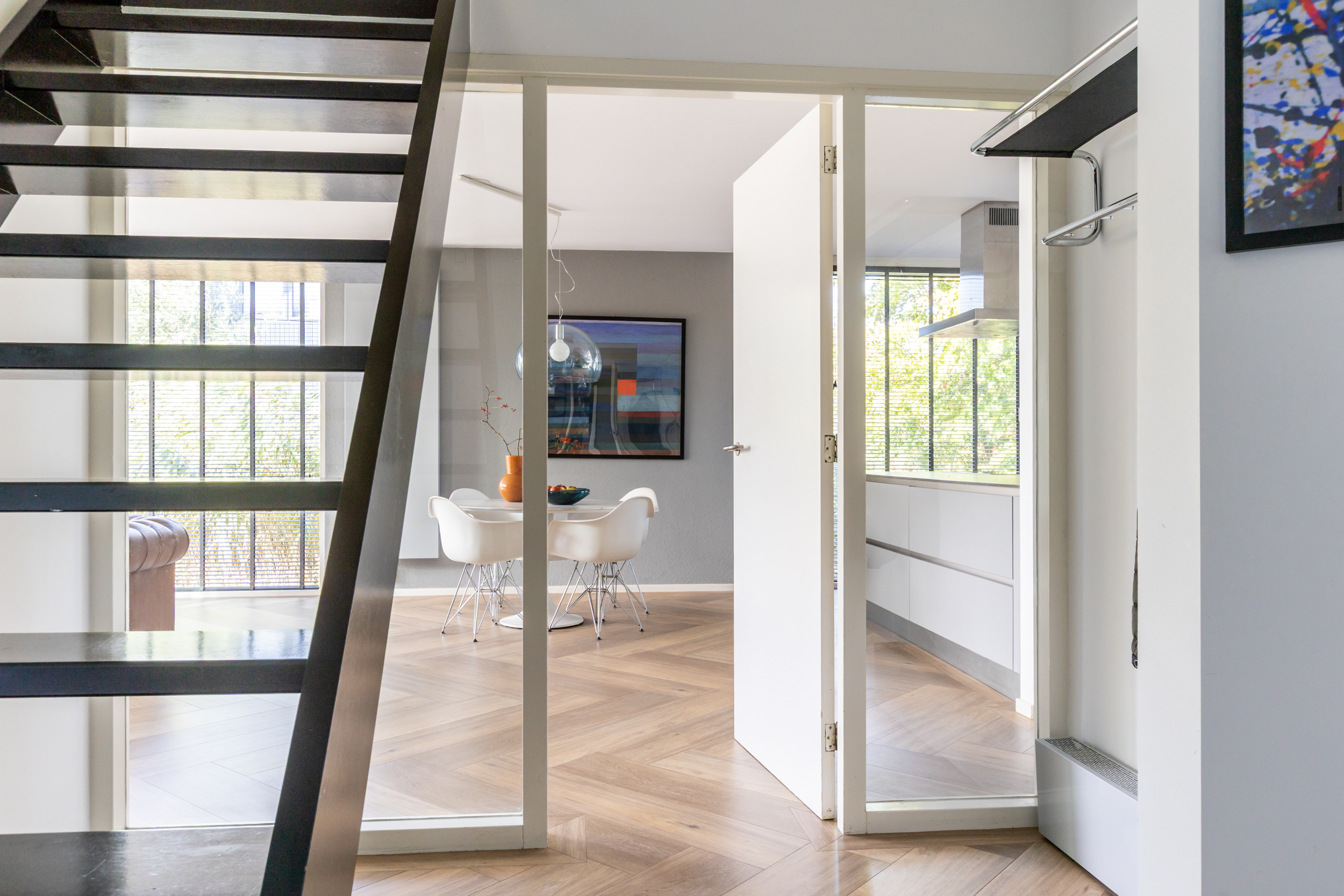 Via de glazen deur bereikt u vanuit de hal, de woonkamer en keuken.