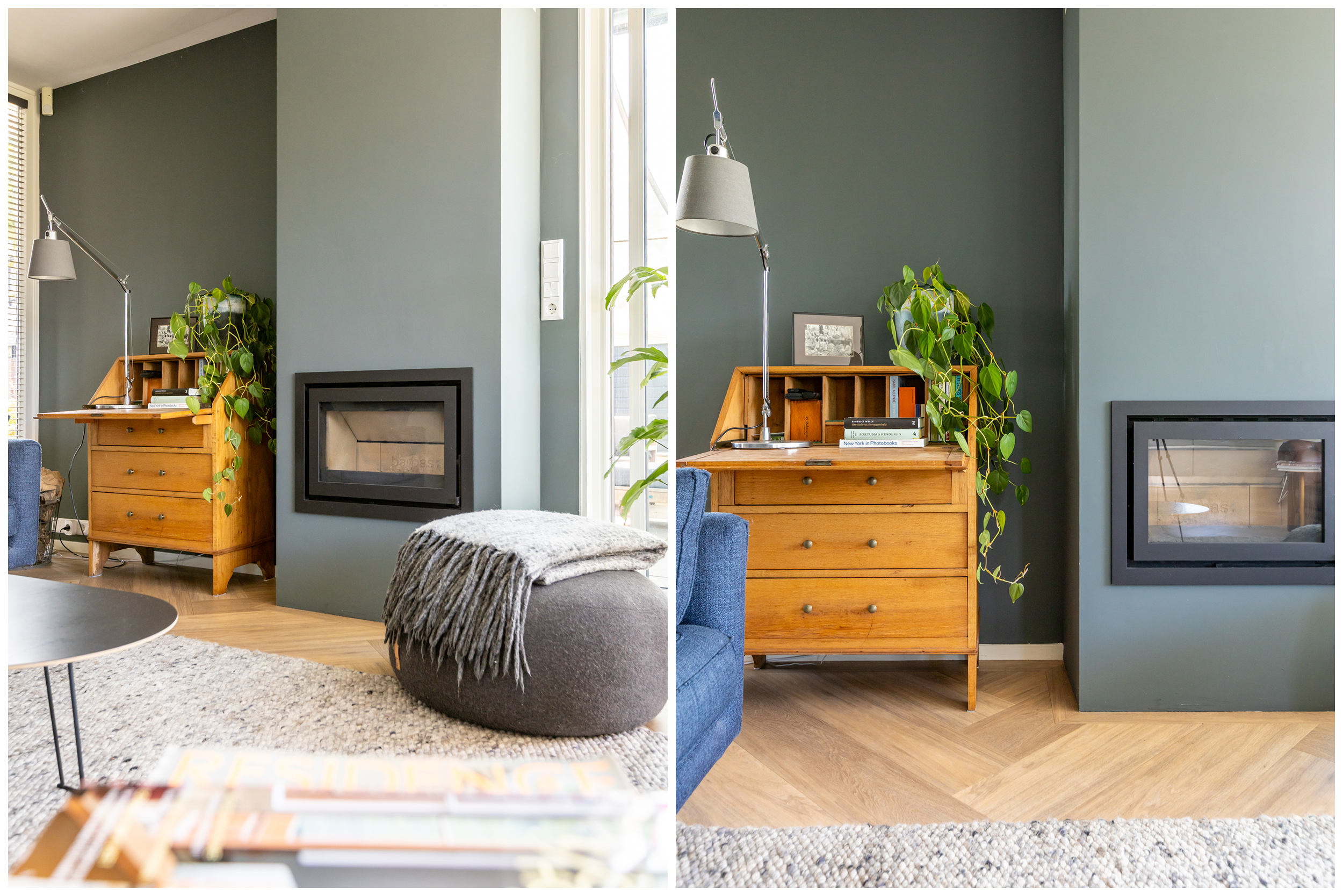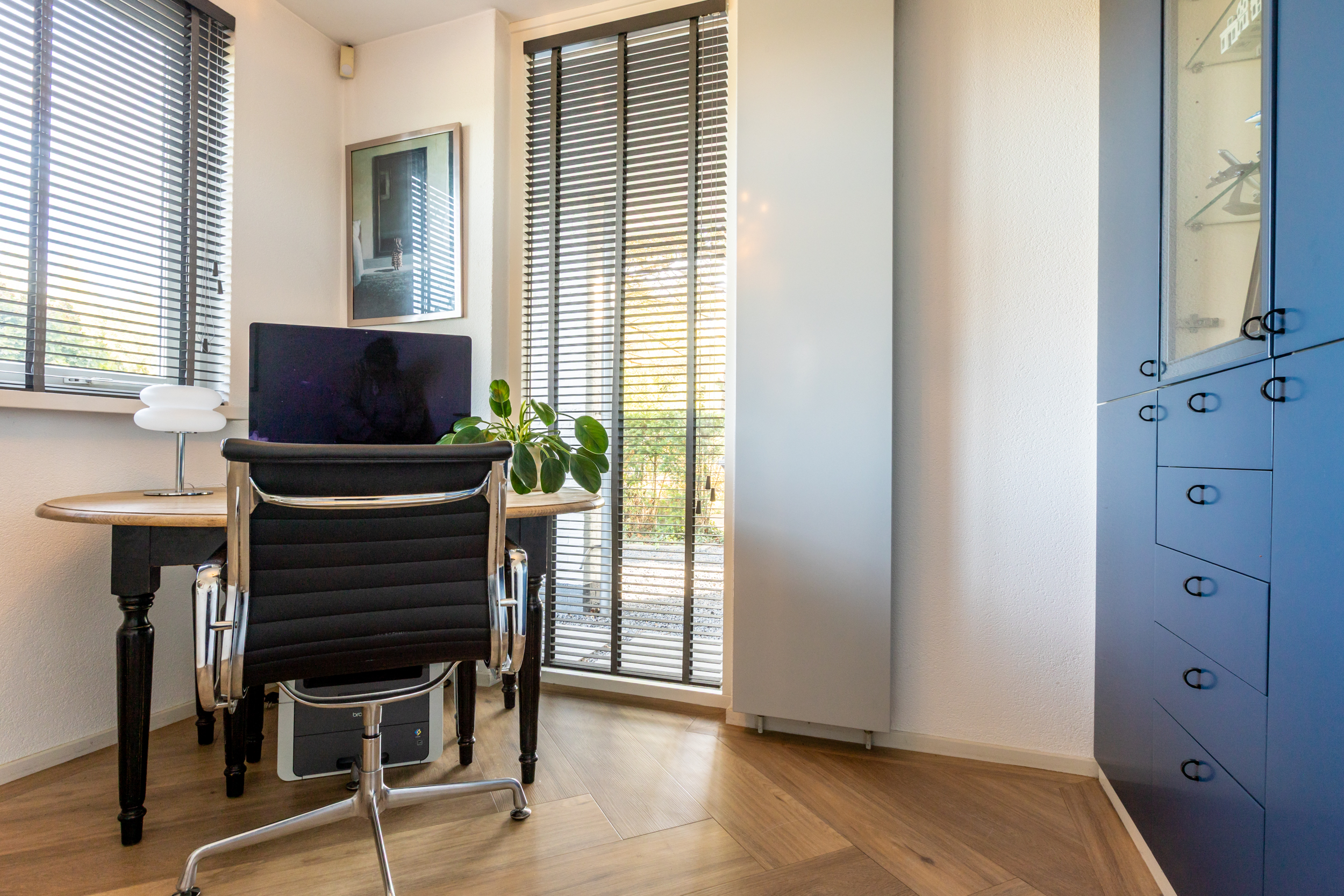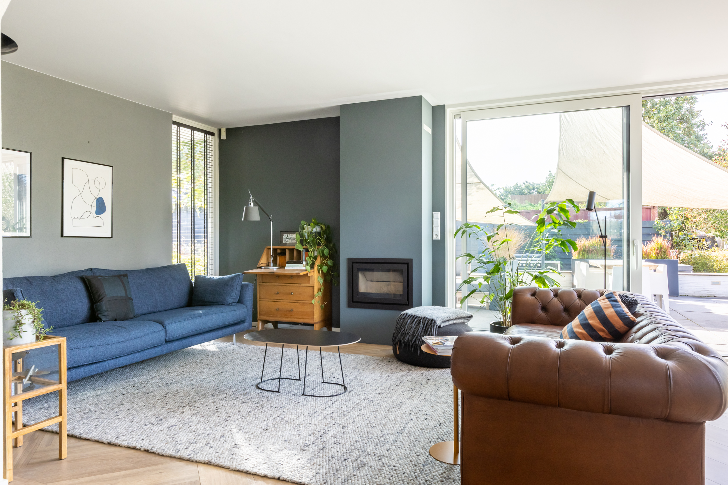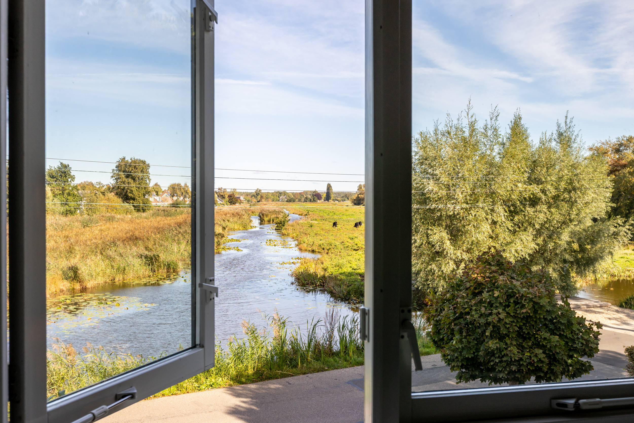 De lichte en sfeervolle woonkamer is uitgerust met een moderne inbouw houthaard (Barbas, 2023) en biedt een schitterend uitzicht op zowel de tuin als de ‘s-Gravenbroekseplas. De wanden en het plafond zijn strak afgewerkt met glad stucwerk en de aluminium schuifpui met triple glas zorgt voor extra licht en isolatie. Aan de voorzijde bevindt zich een ruime studeerkamer met vaste kastenwand.