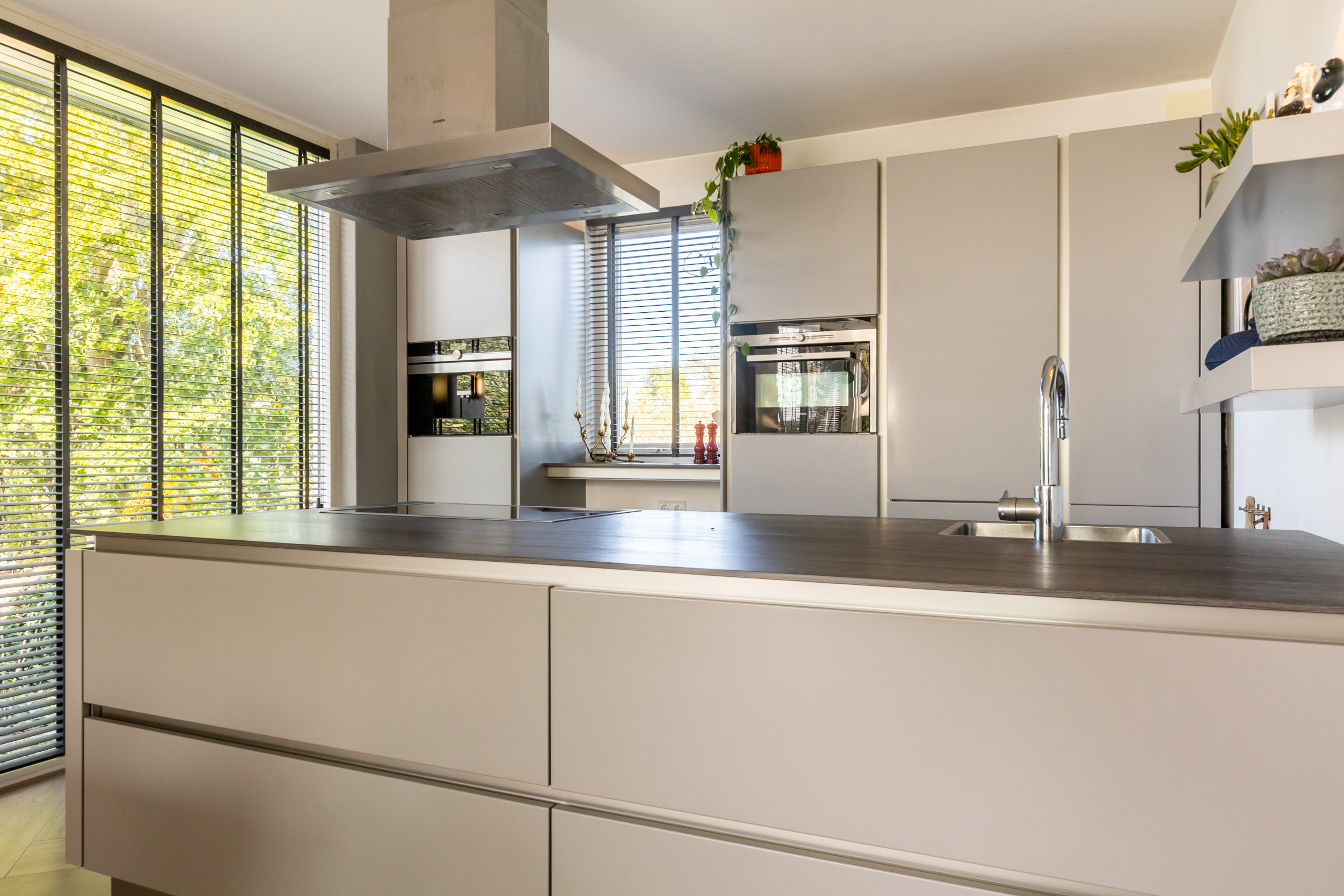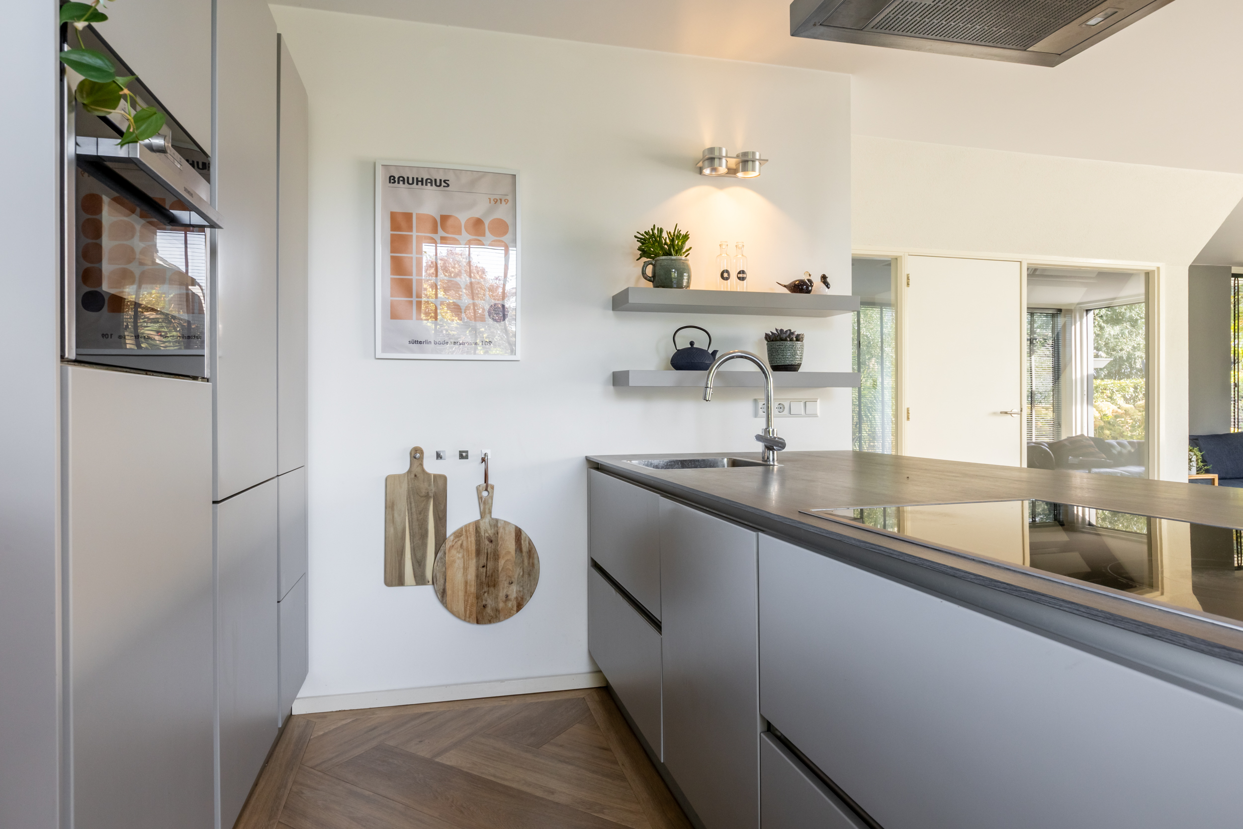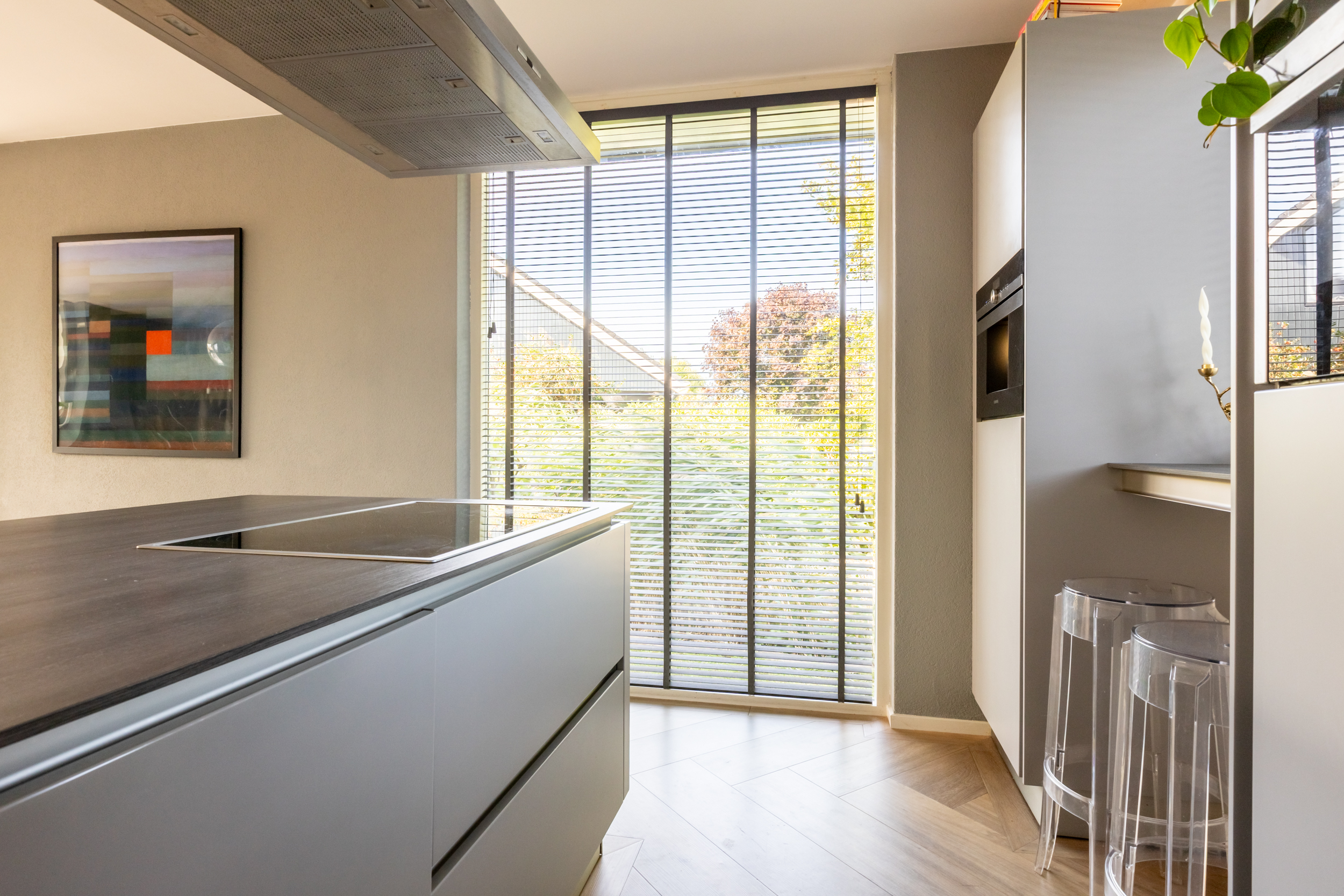 De open woonkeuken ligt eveneens aan de voorzijde en is uitgerust met een kastenwand met o.a. Siemens inbouwapparatuur (koffiemachine, oven, koel-vriescombinatie) en een apothekerskast. Het kook-/spoeleiland heeft een Volkern werkblad, spoelbak, 4-pits keramische kookplaat, rvs-afzuigkap, vaatwasser en royale softclose laden. Vanuit de keuken en de studeerkamer is er fraai uitzicht over de polder aan de voorzijde.