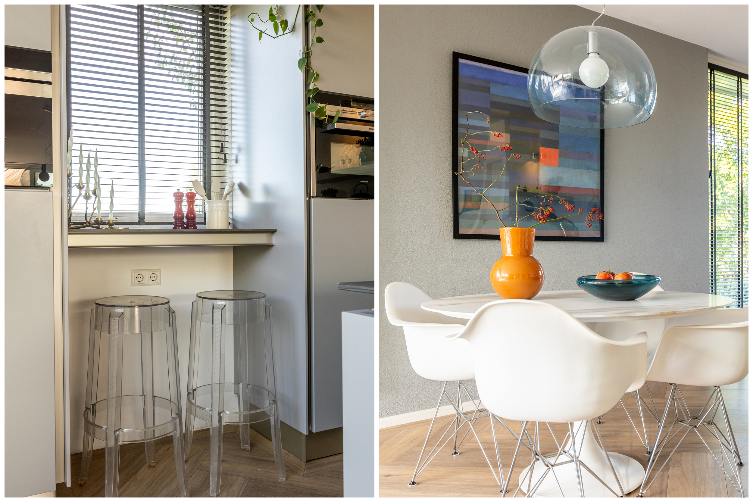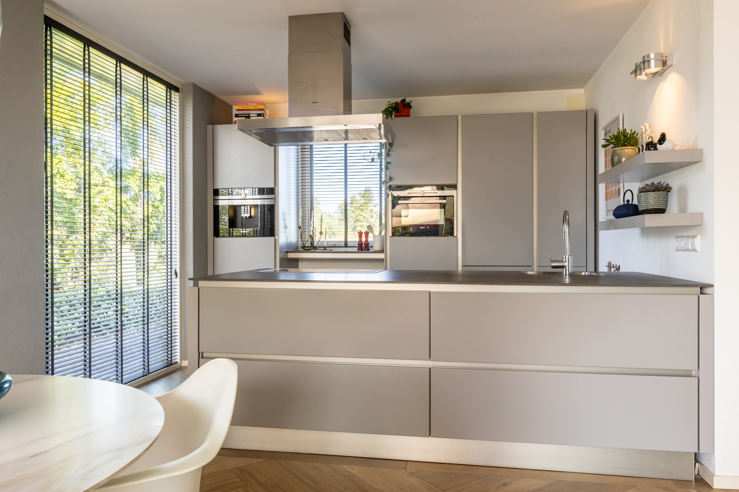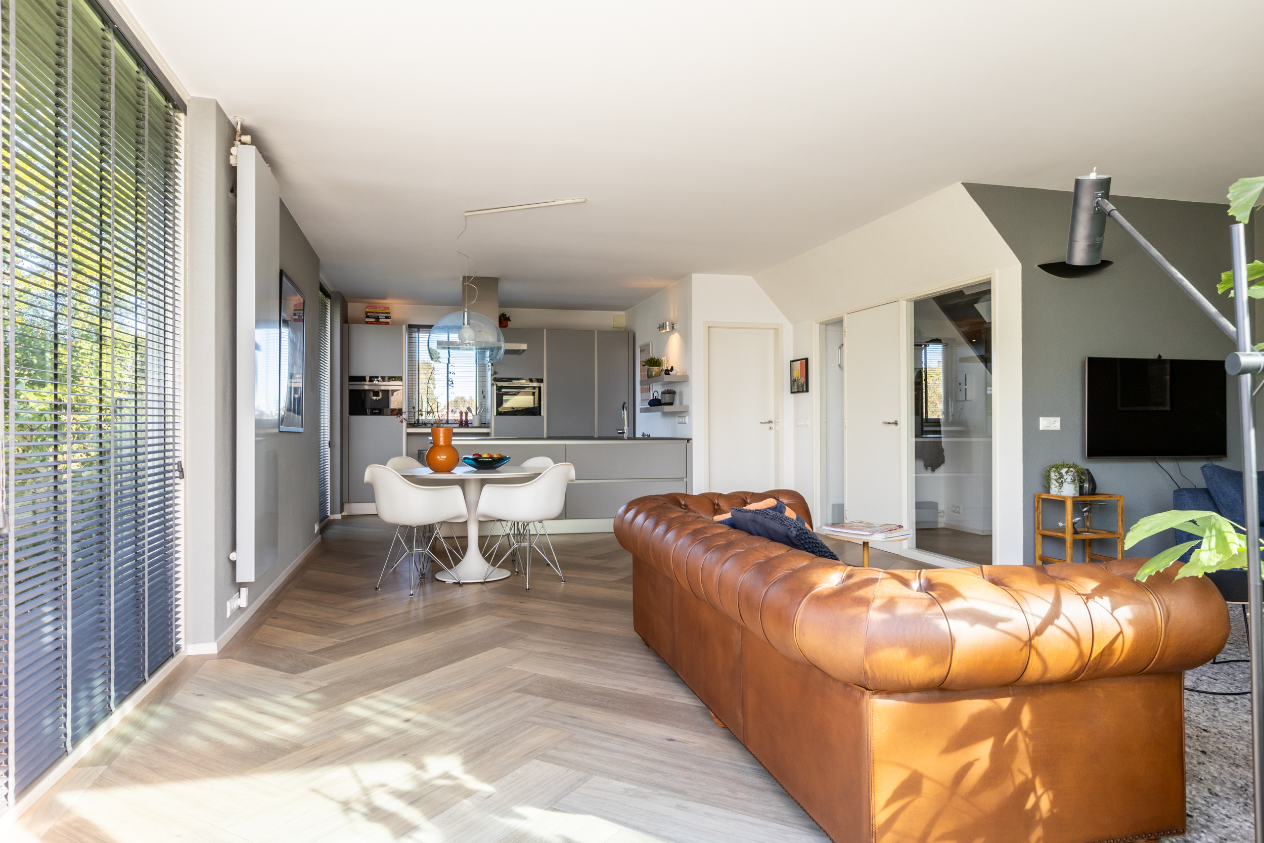 De open woonkeuken ligt eveneens aan de voorzijde en is uitgerust met een kastenwand met o.a. Siemens inbouwapparatuur (koffiemachine, oven, koel-vriescombinatie) en een apothekerskast. Het kook-/spoeleiland heeft een Volkern werkblad, spoelbak, 4-pits keramische kookplaat, rvs-afzuigkap, vaatwasser en royale softclose laden. Vanuit de keuken en de studeerkamer is er fraai uitzicht over de polder aan de voorzijde.