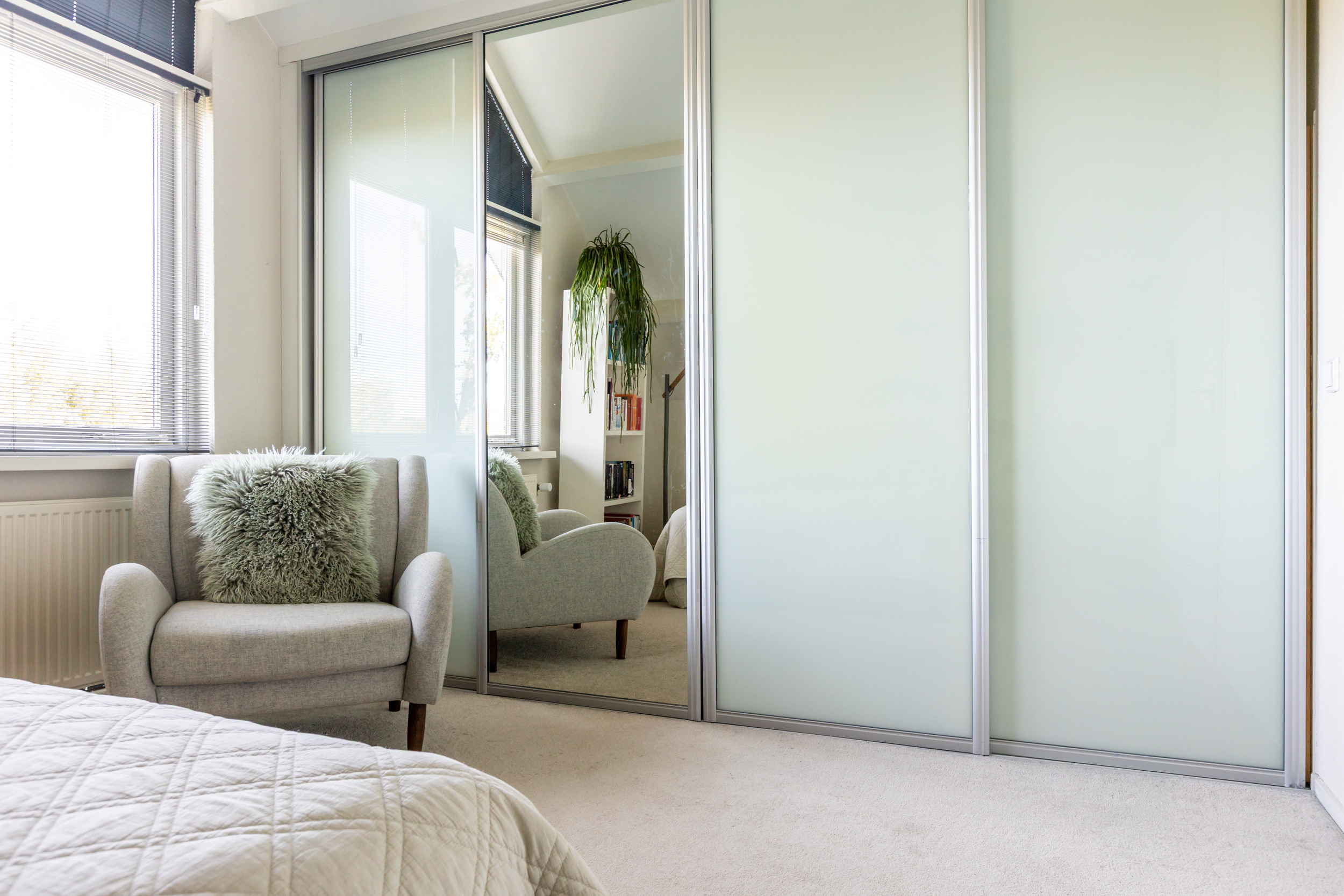 Slaapkamer 1 (voorzijde): royale kamer met extra diepe schuifwandkast en vaste kast met cv-opstelling (Nefit, 2000).
