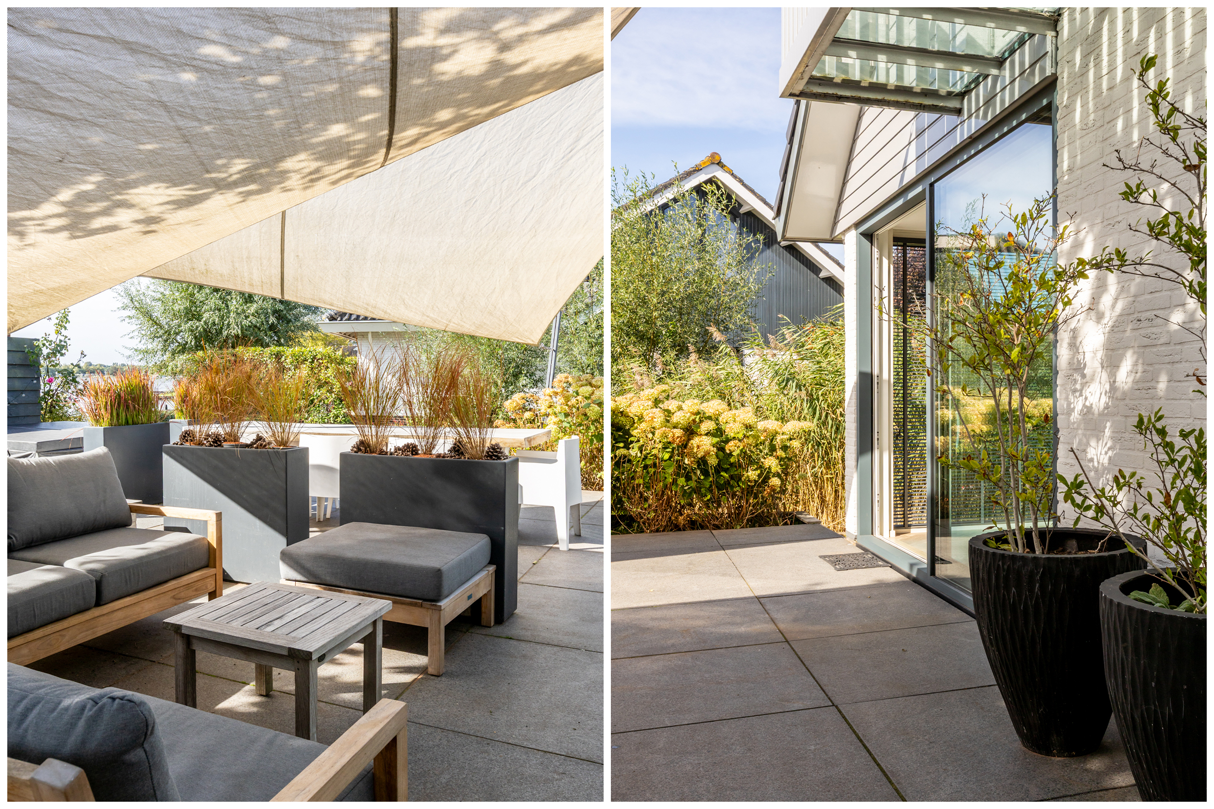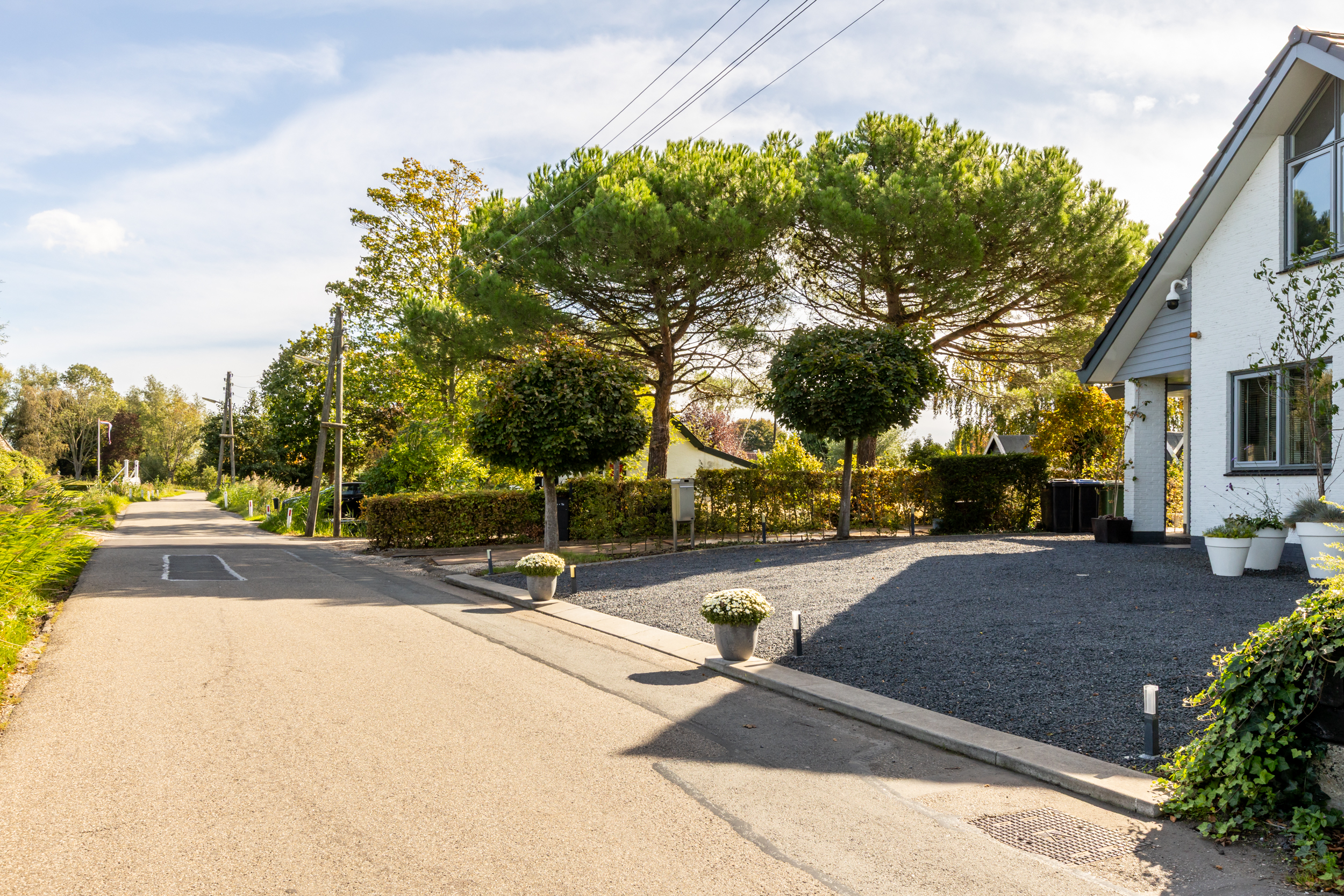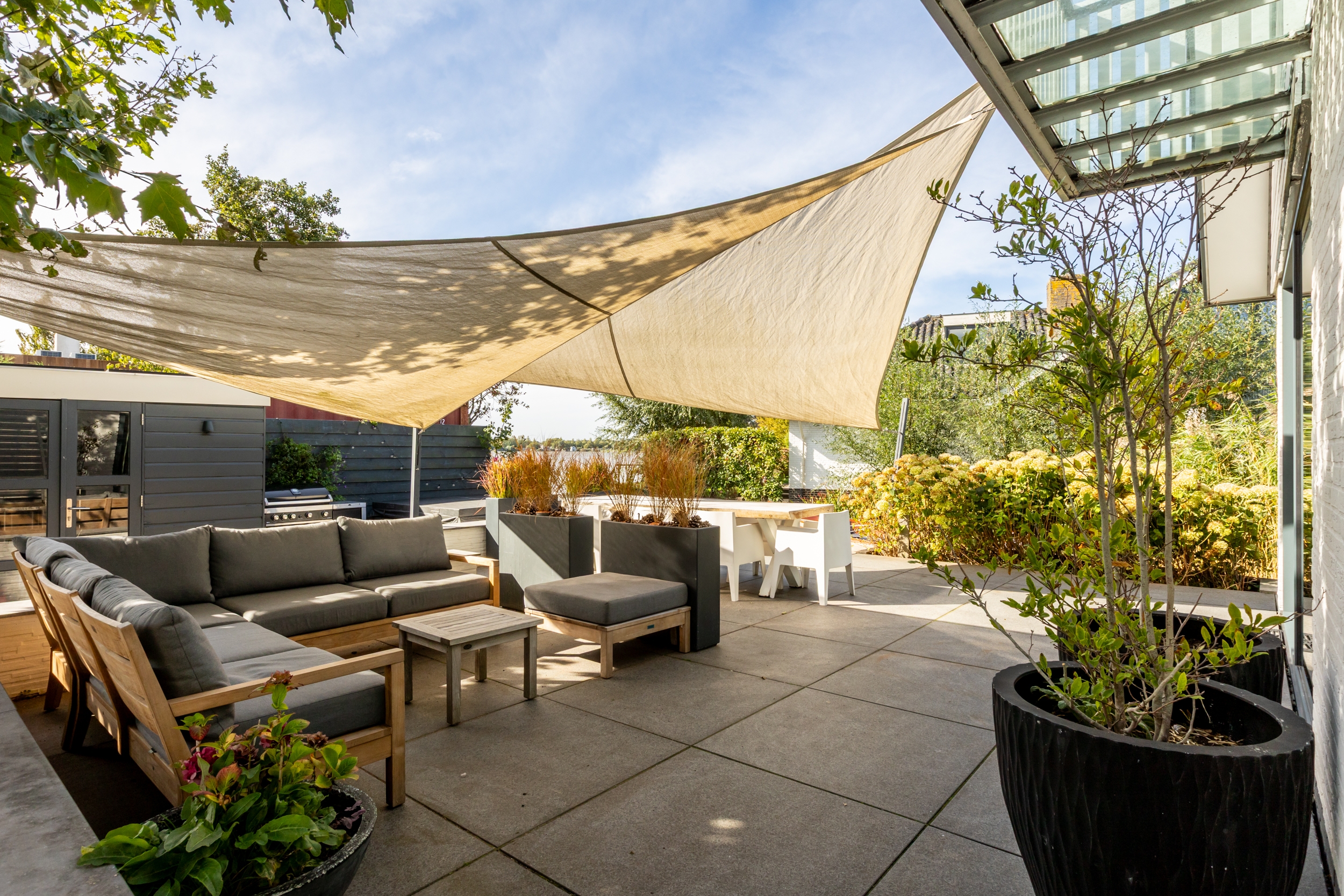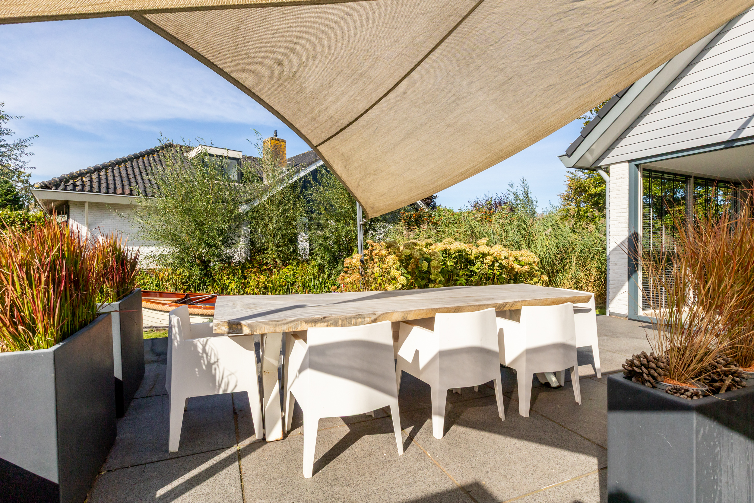 De fraai aangelegde tuin ligt rondom de woning. De voortuin is in 2021 vernieuwd en voorzien van grindmatten met grind en ruime parkeergelegenheid voor 4 tot 5 auto’s op eigen terrein. Aan de waterzijde biedt een rietkraag extra beschutting.
