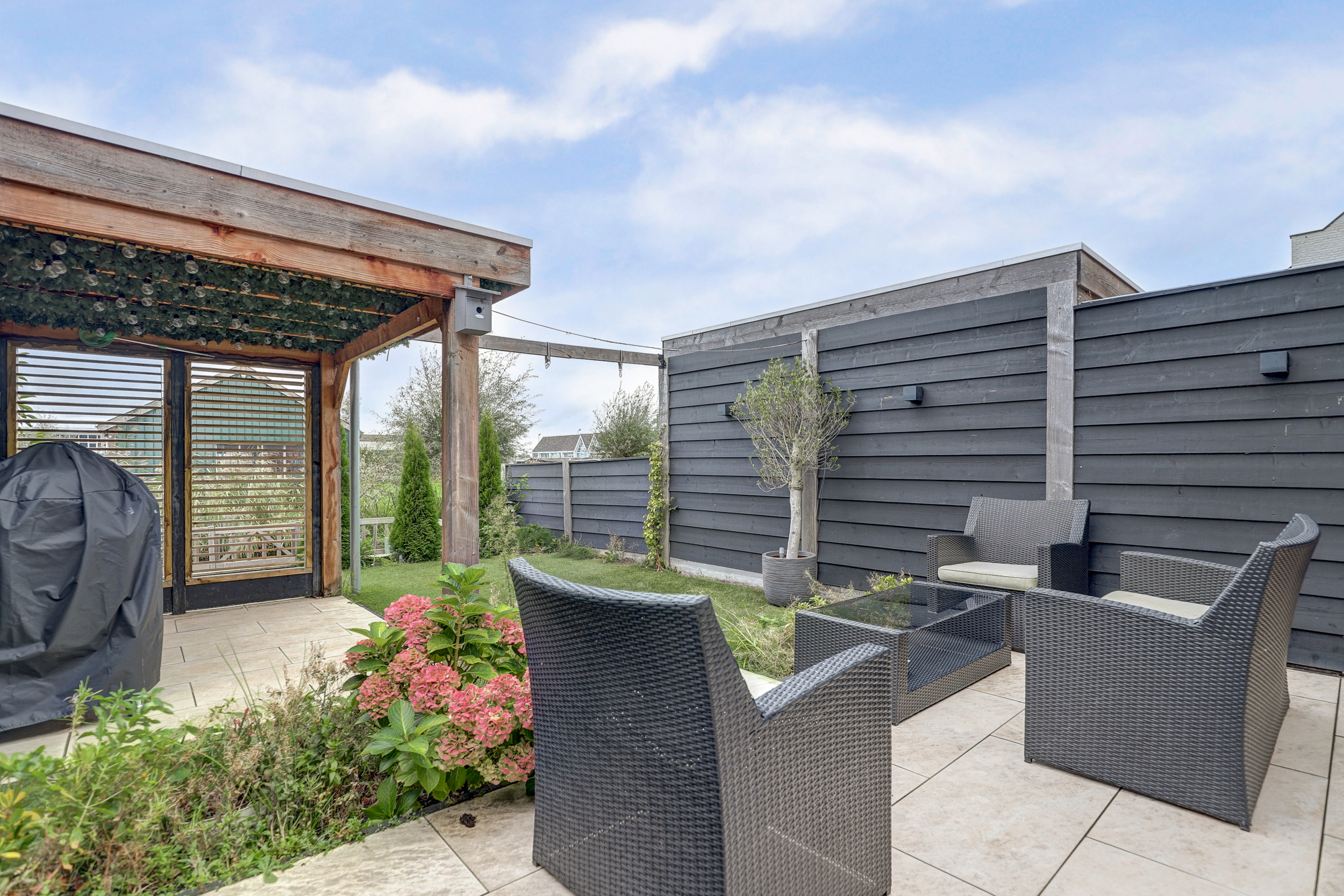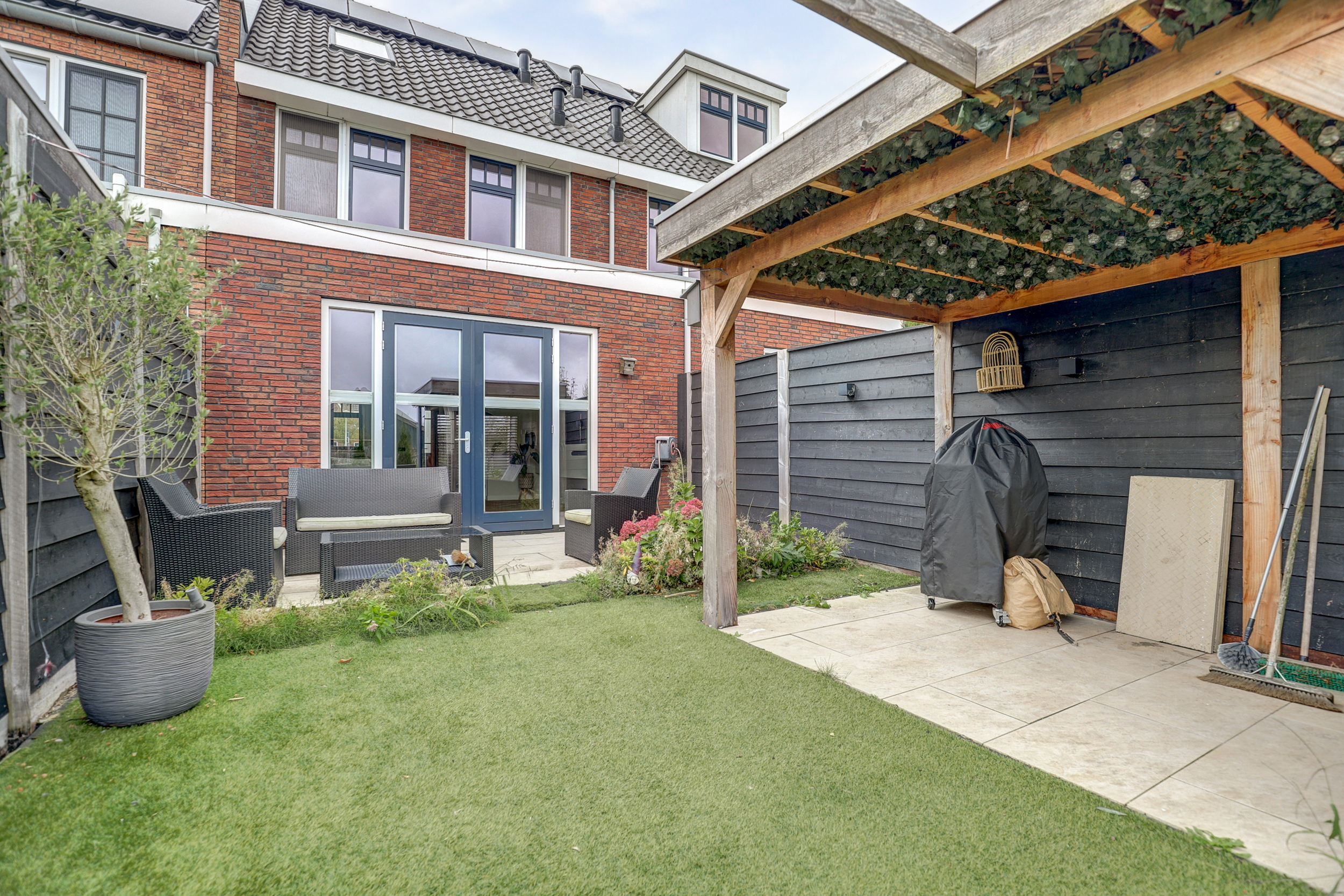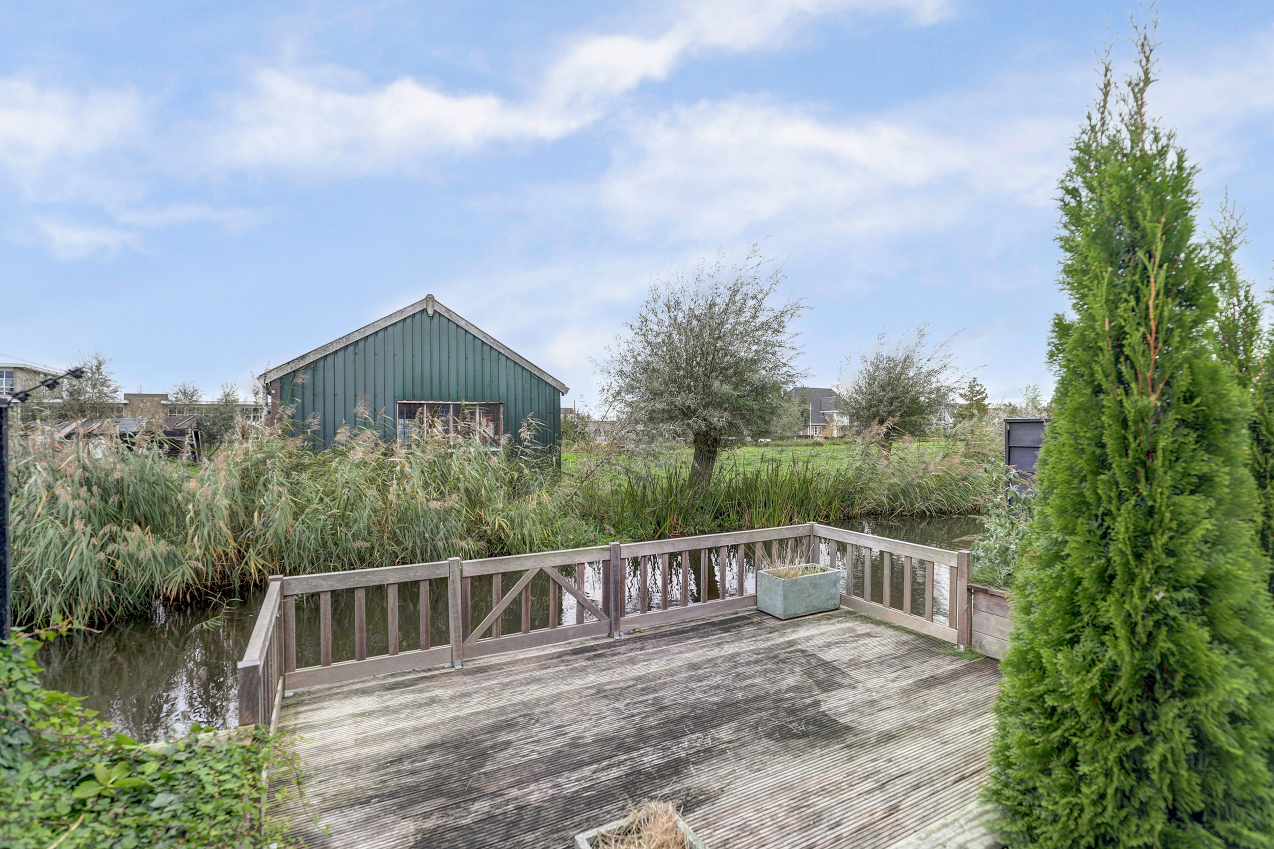 Achtertuin met een onderheid terras van ca. 3 meter diep, een buitenkraan en een stukje kunstgras. Er is een sfeervolle overkapping met twee open zijden, één dichte wand en één wand met shutters. Aan de waterzijde bevindt zich een heerlijk vlonderterras. Ook is er een eigen berging van ca. 6 m2 welke is voorzien van elektra.