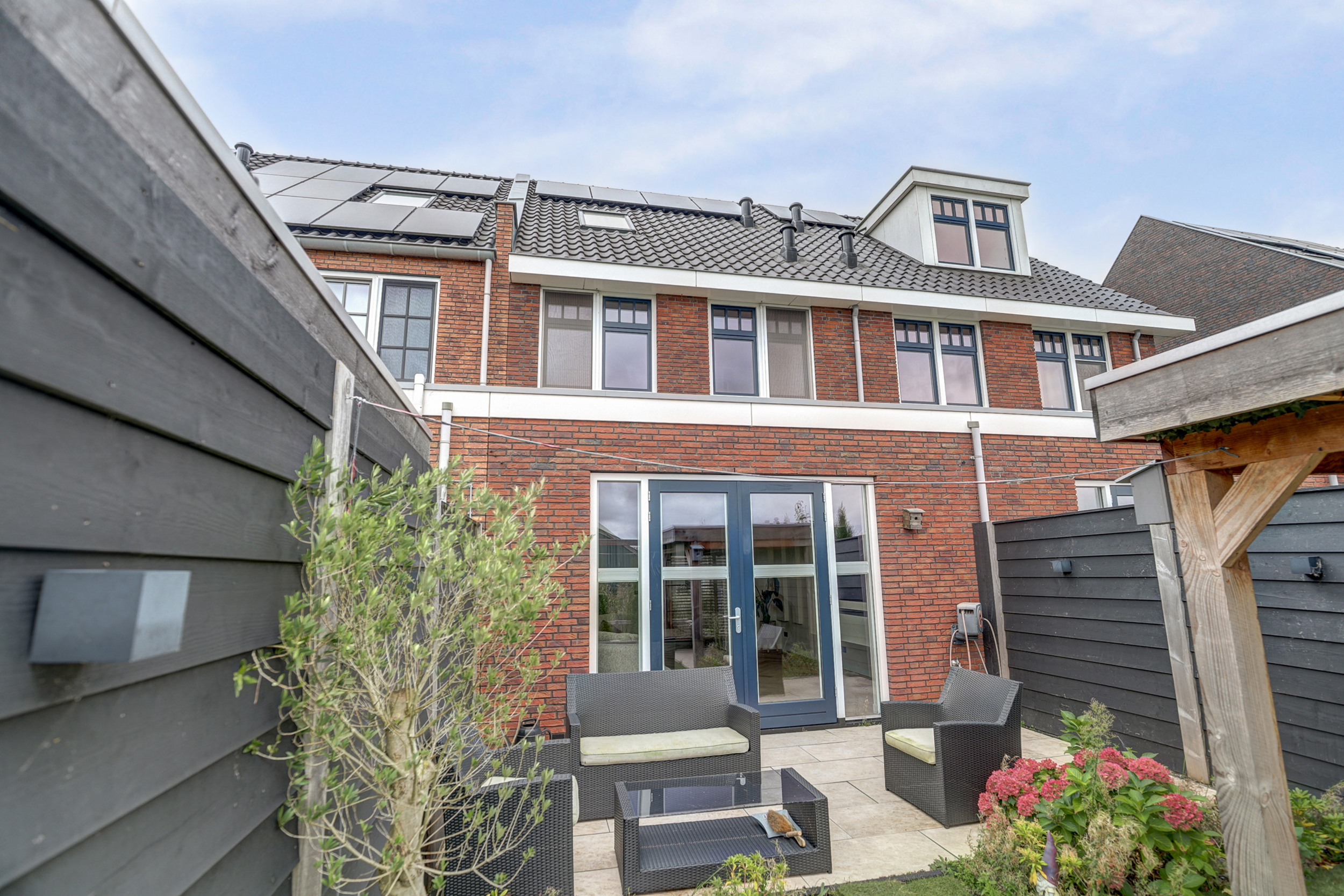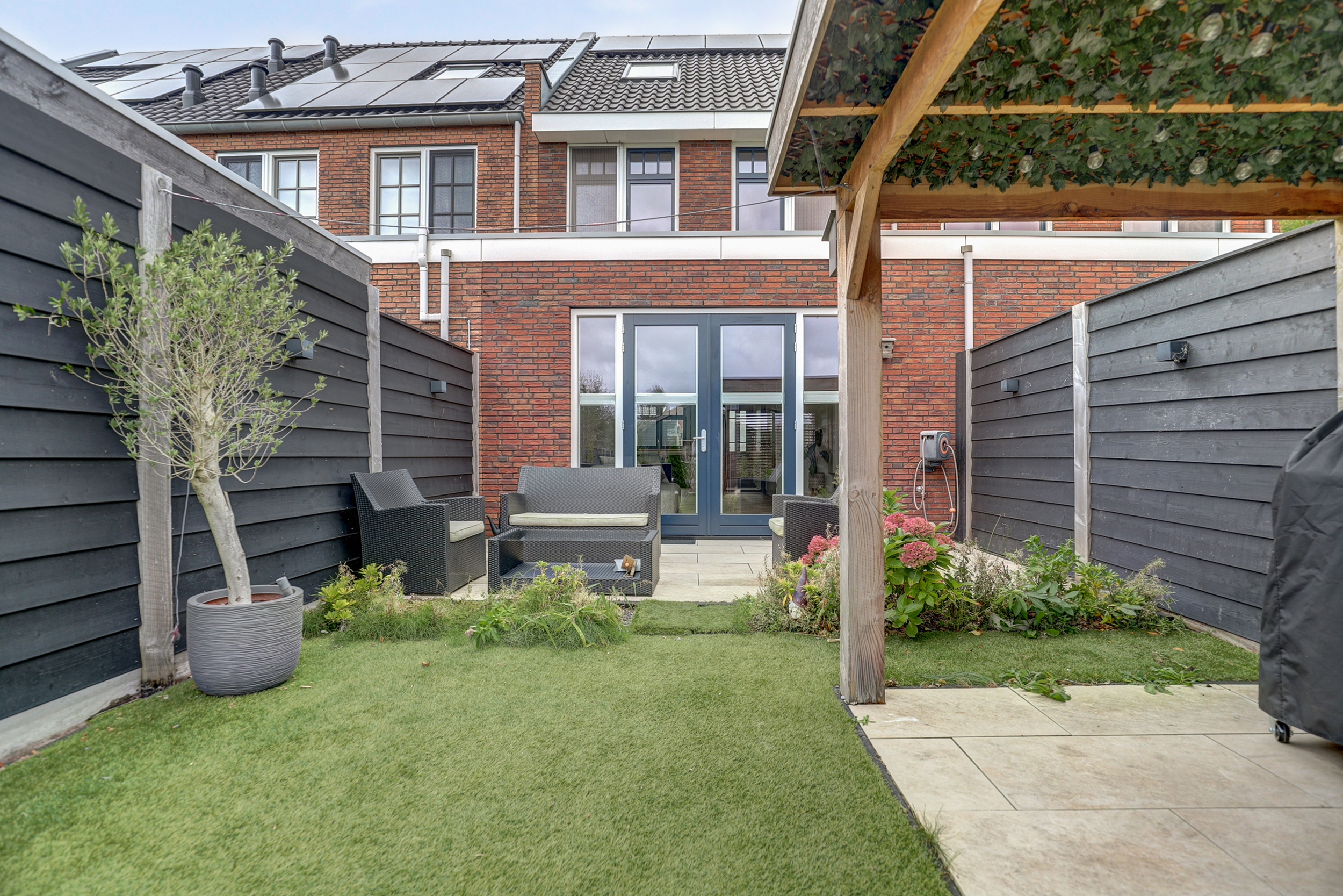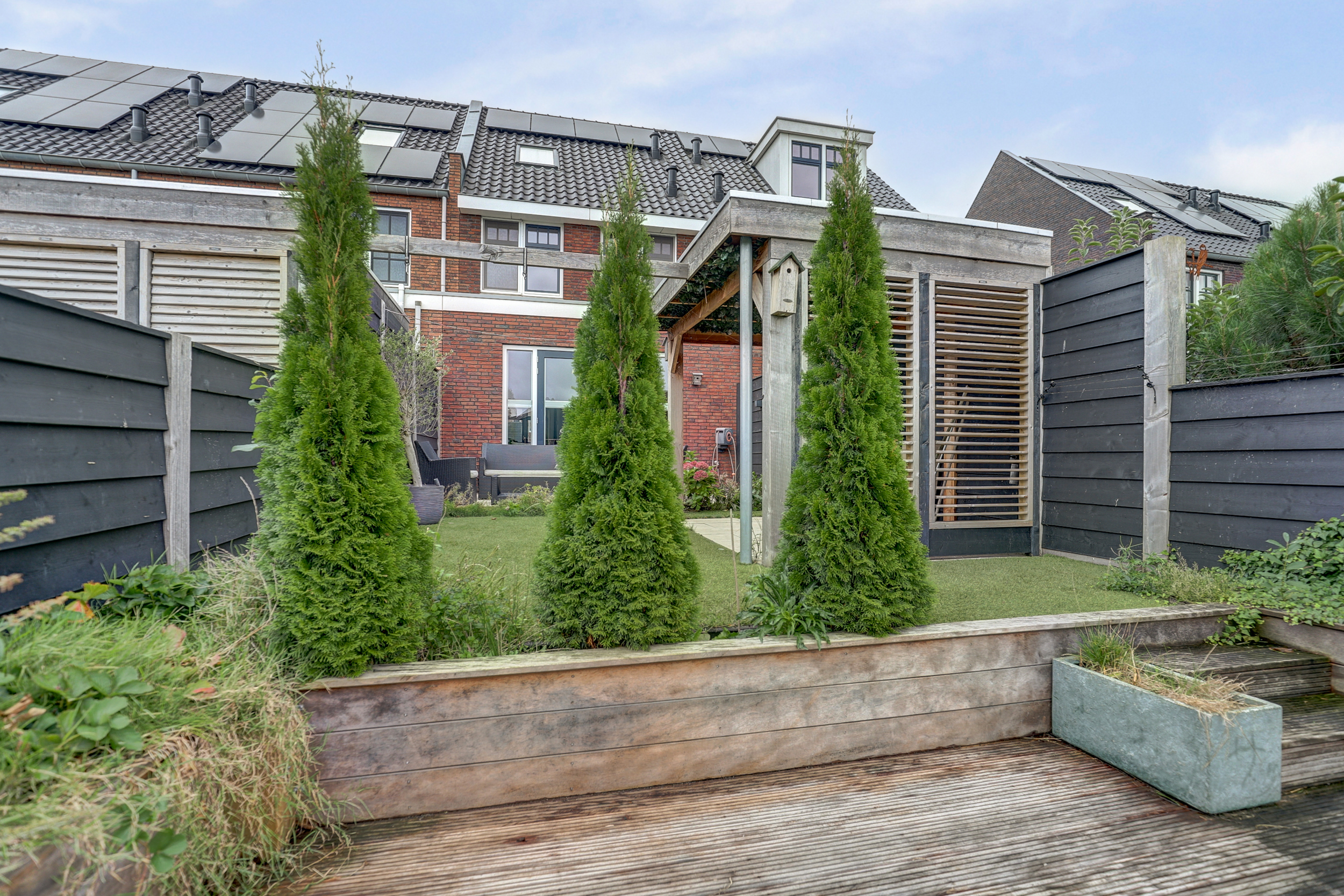 Achtertuin met een onderheid terras van ca. 3 meter diep, een buitenkraan en een stukje kunstgras. Er is een sfeervolle overkapping met twee open zijden, één dichte wand en één wand met shutters. Aan de waterzijde bevindt zich een heerlijk vlonderterras. Ook is er een eigen berging van ca. 6 m2 welke is voorzien van elektra.