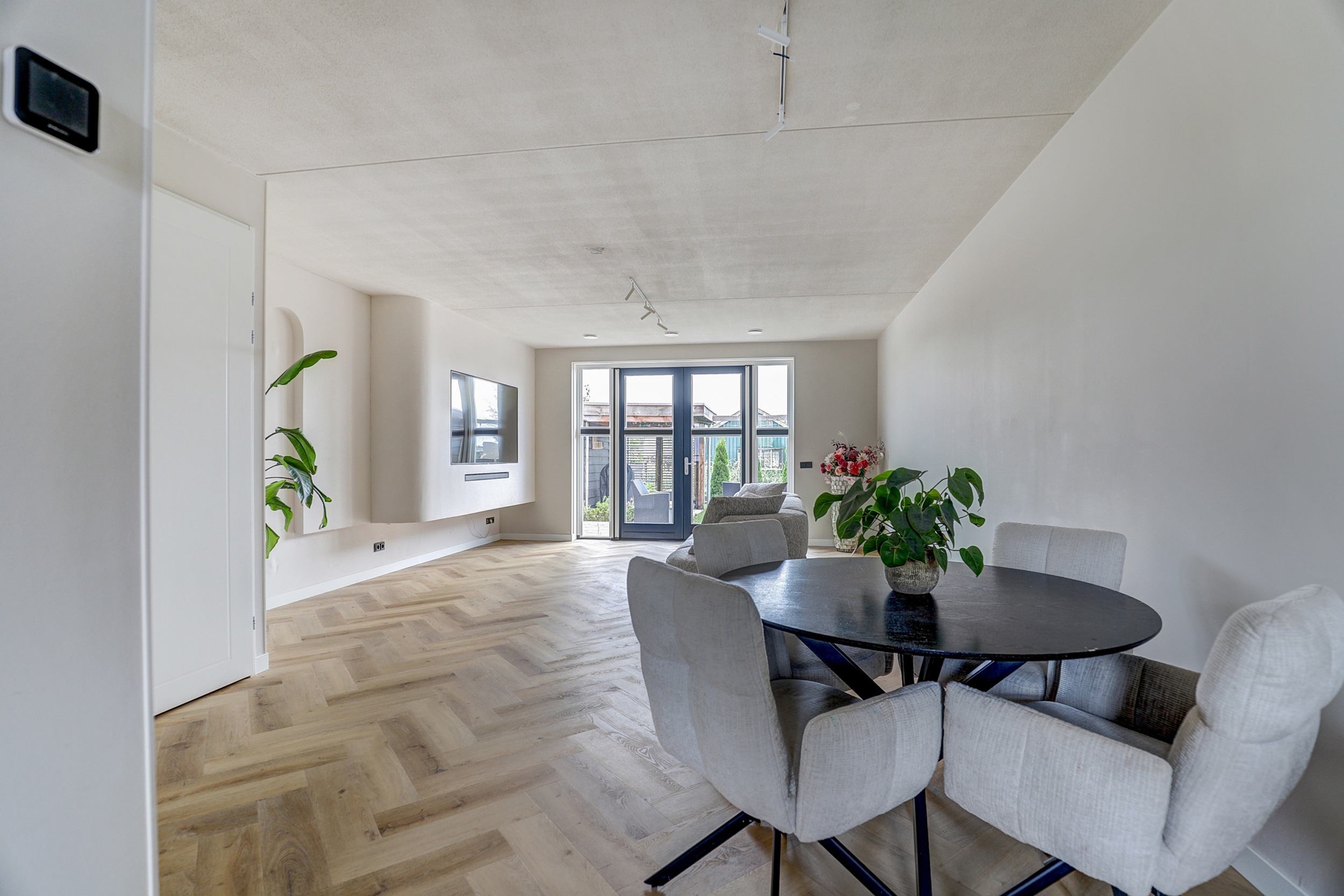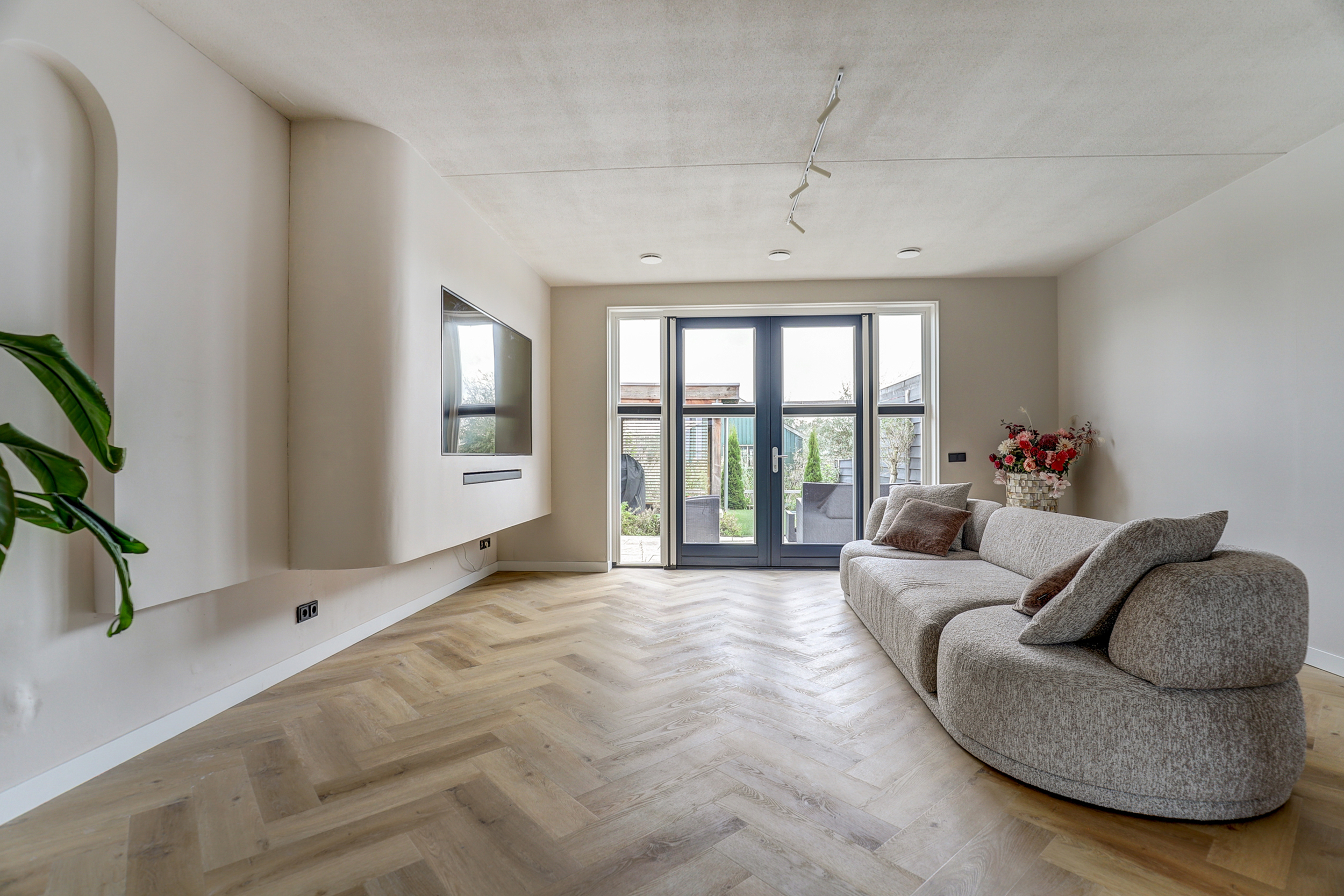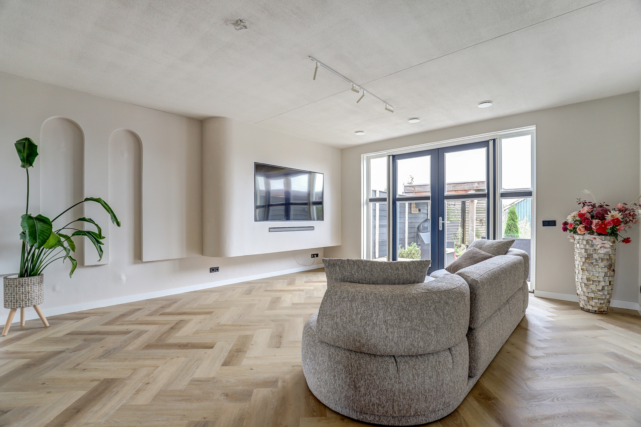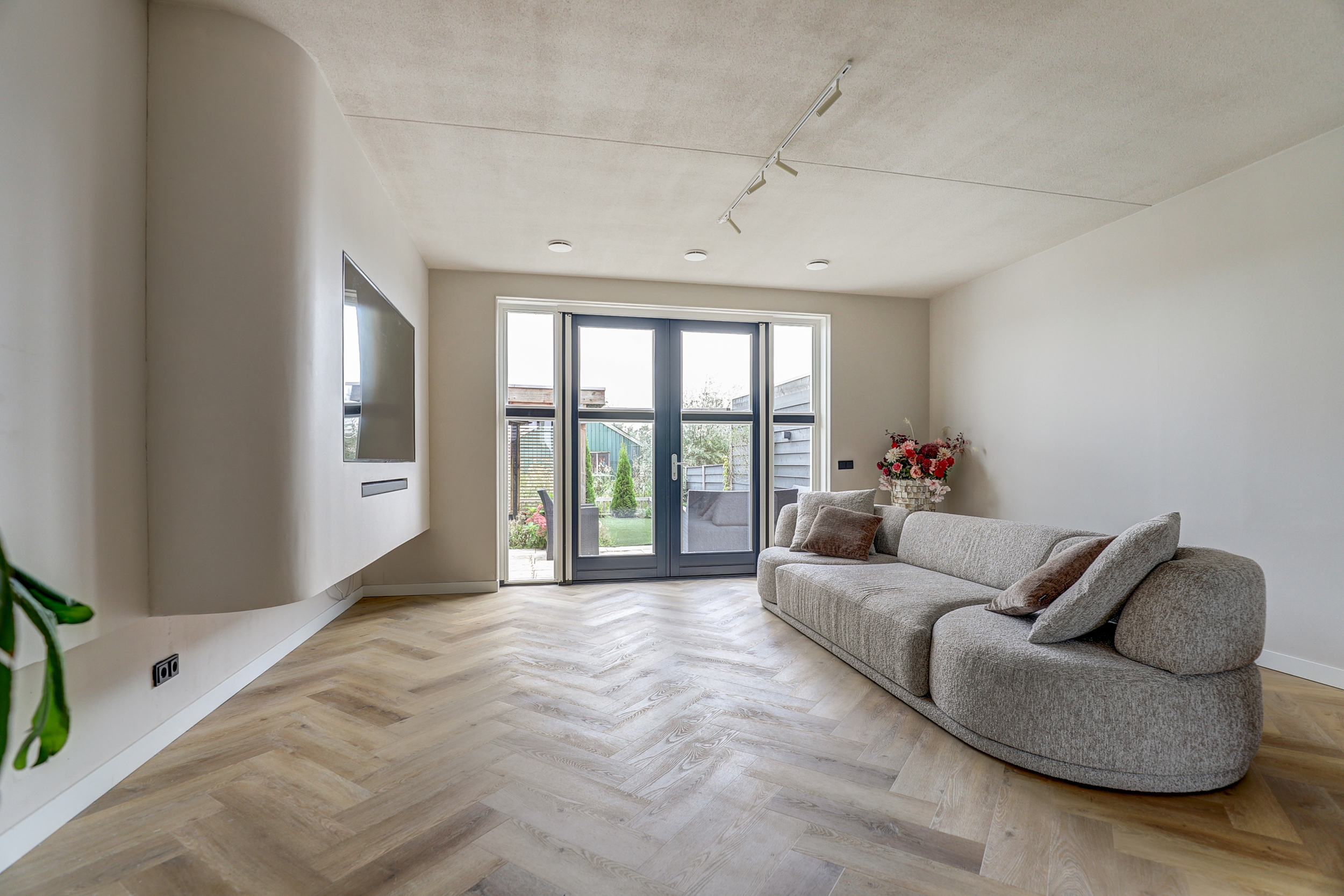 Via een glazen deur is er toegang tot de woonkamer aan de tuinzijde met openslaande deuren en een stijlvolle cinewall voor een inbouw-tv. Onder de trap bevindt zich een royale trapkast voor extra bergruimte en de unit voor vloerverwarming/-koeling.