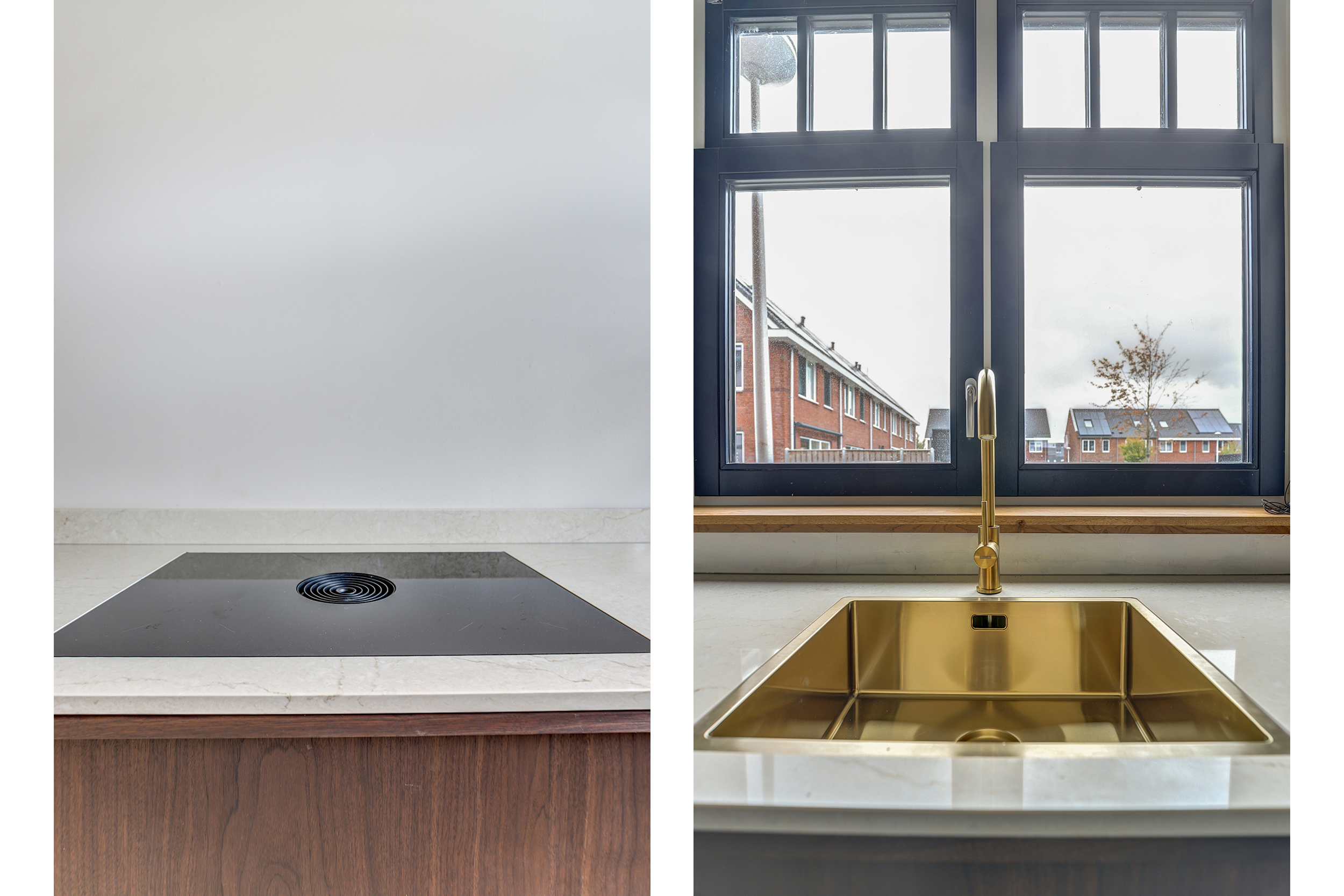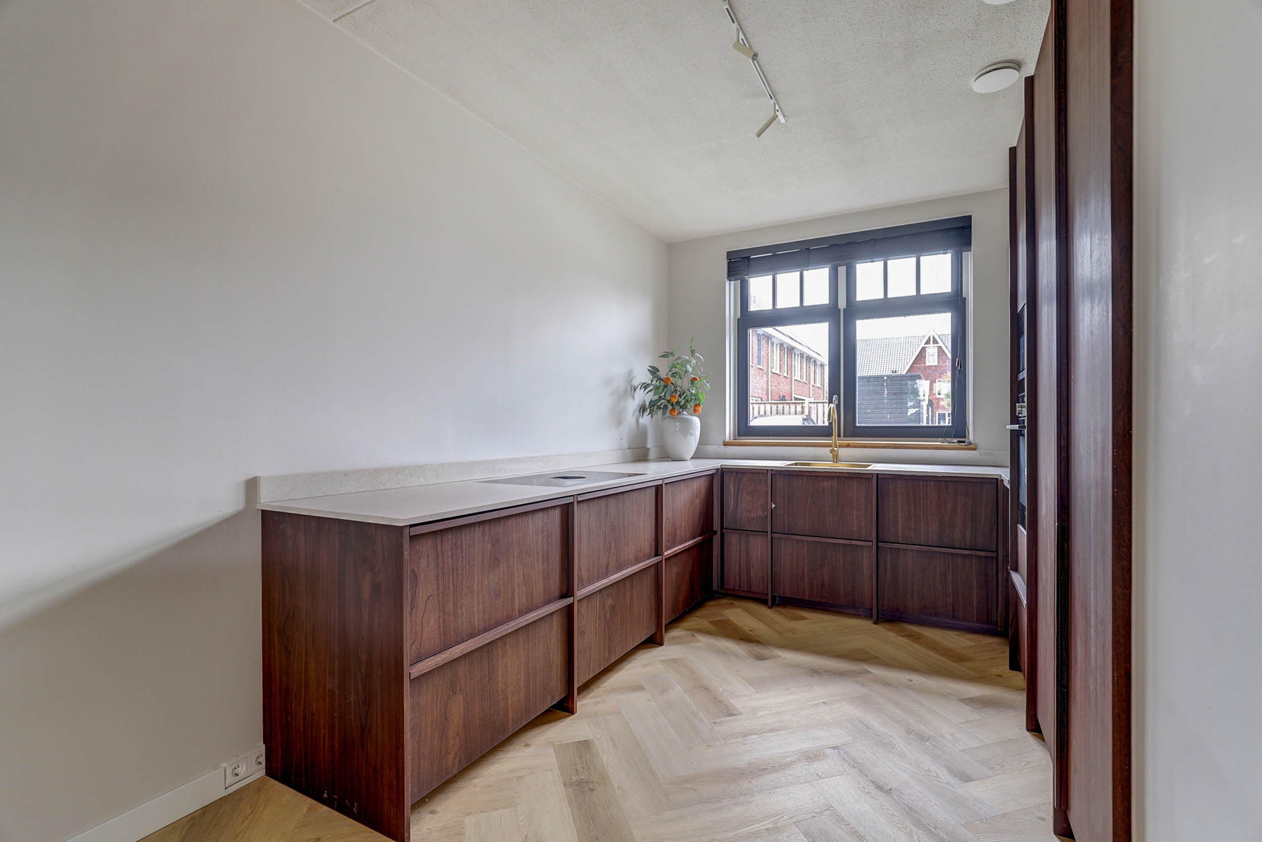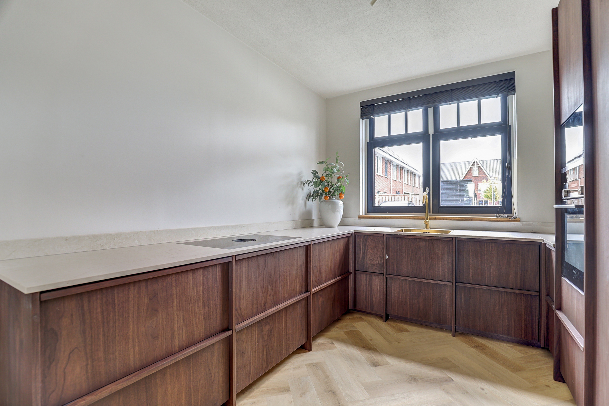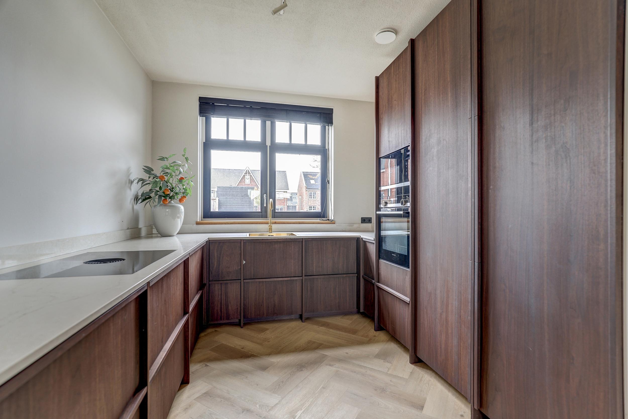 Aan de voorzijde ligt de in 2025 vernieuwde keuken in U-opstelling, uitgevoerd in massief notenhout met een marmerlook composiet blad. De apparatuur komt grotendeels uit 2021, bestaande uit: Bora inductiekookplaat (4 zones), Siemens oven en magnetron, hoogmodel koelkast (Bosch, in IKEA-kast), aparte vriezer en vaatwasser. De keuken is voorzien van softclose laden.