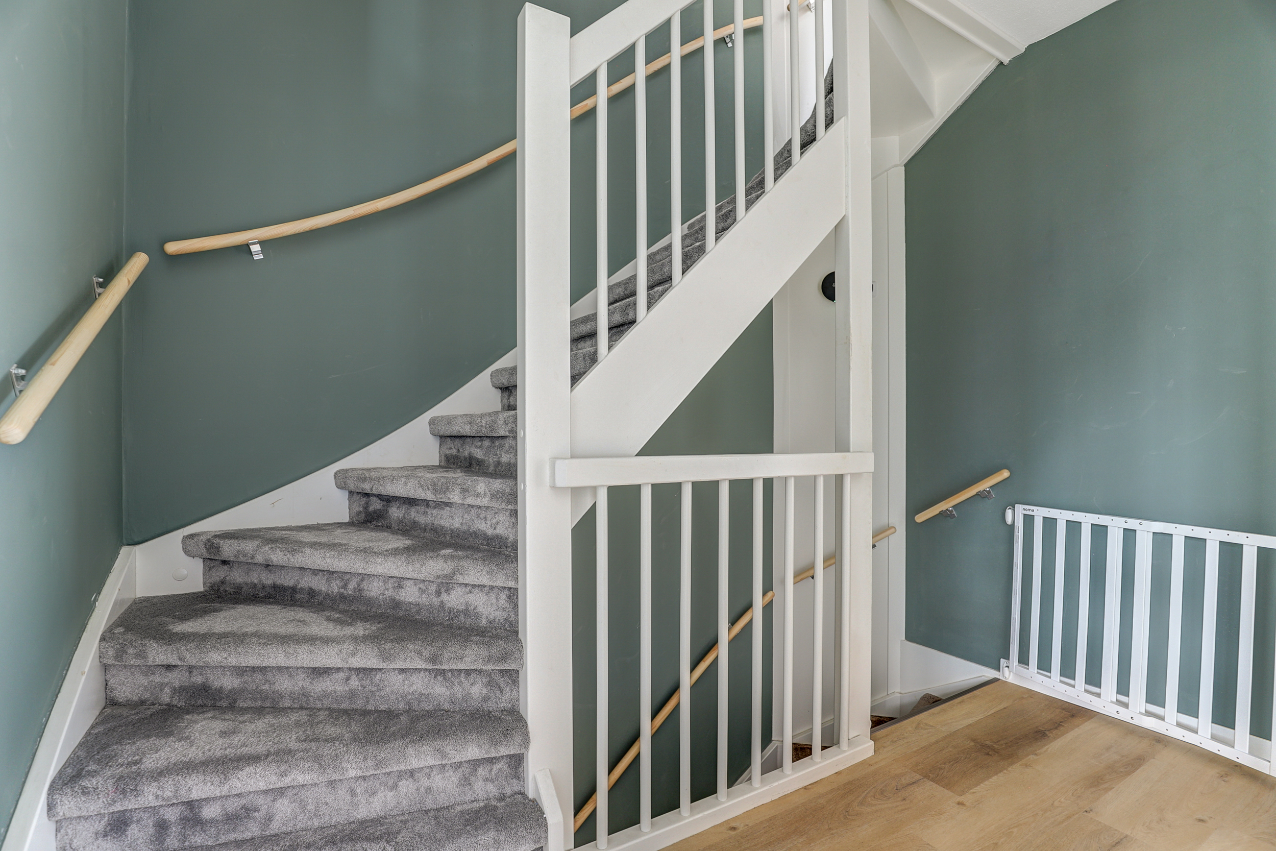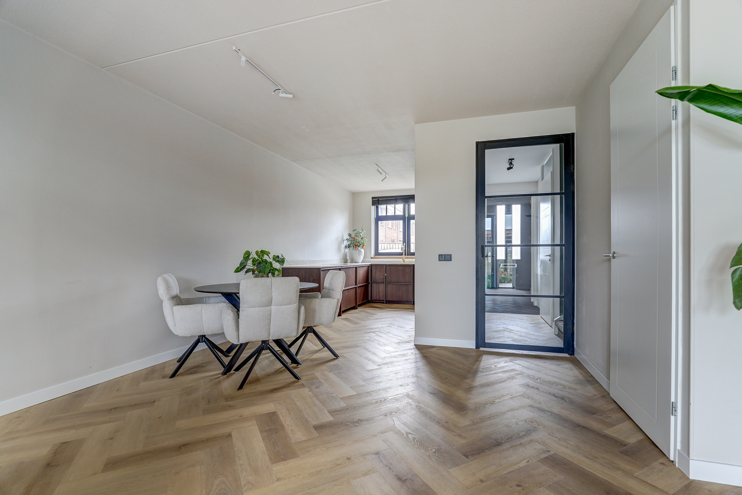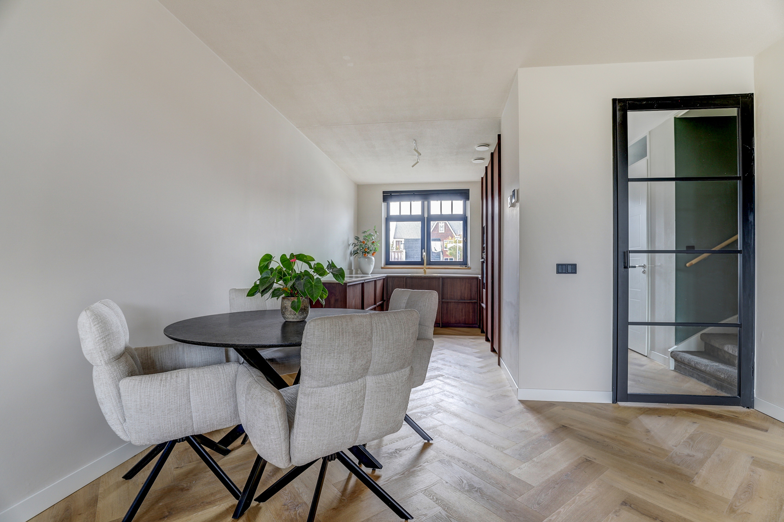 De begane grond is afgewerkt met hoge plinten en een visgraad motief PVC-vloer.