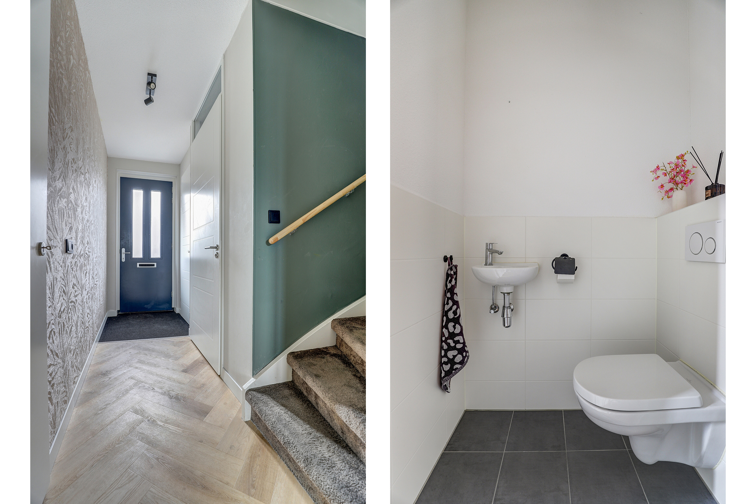 Hal, entree, meterkast (10 groepen, aardlekschakelaar, glasvezel) met vaste kast voor de opstelling van het warmtepompsysteem, trapopgang met vloerbedekking naar de eerste verdieping en toilet. Het toilet is half betegeld en voorzien van een fontein en wandcloset.