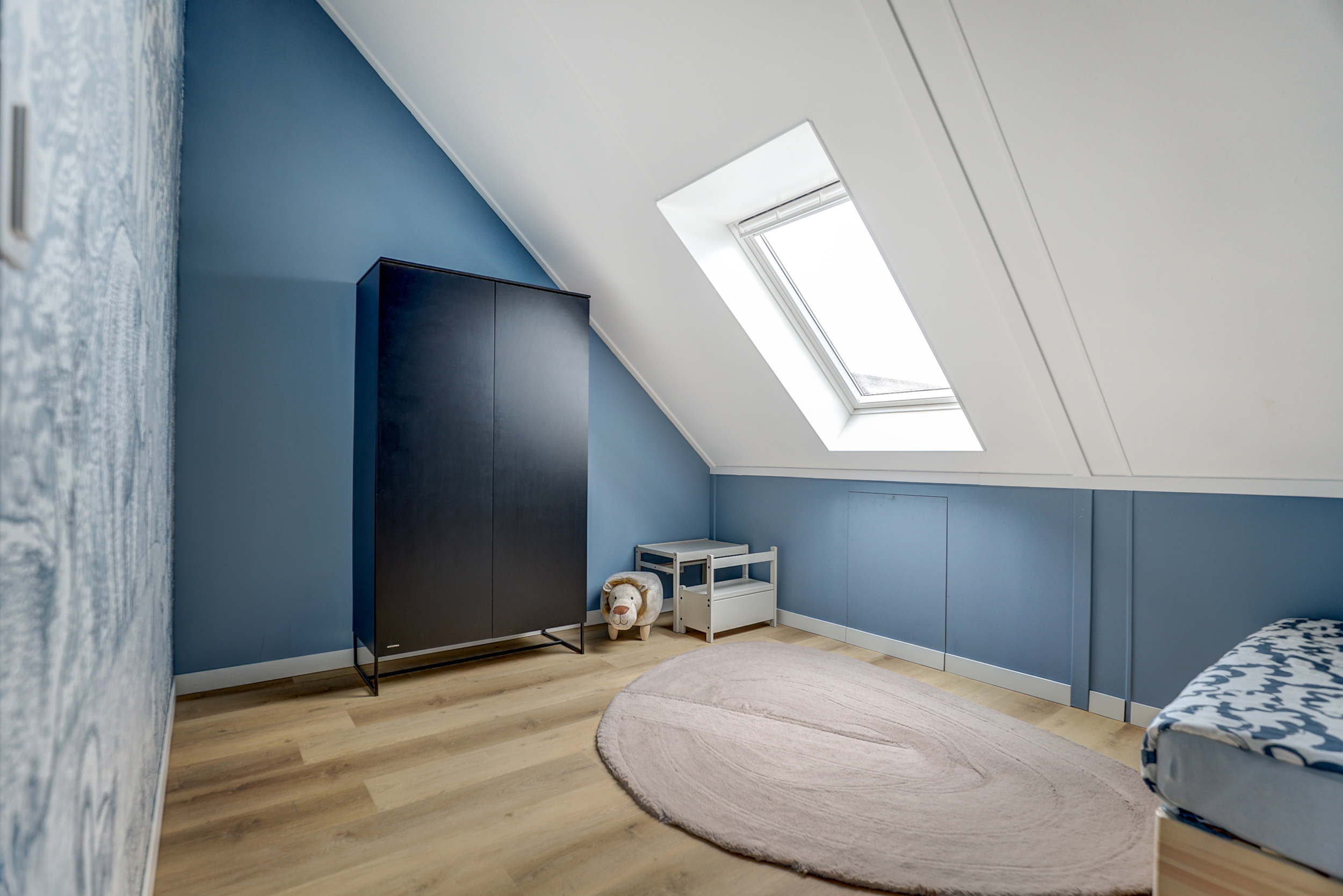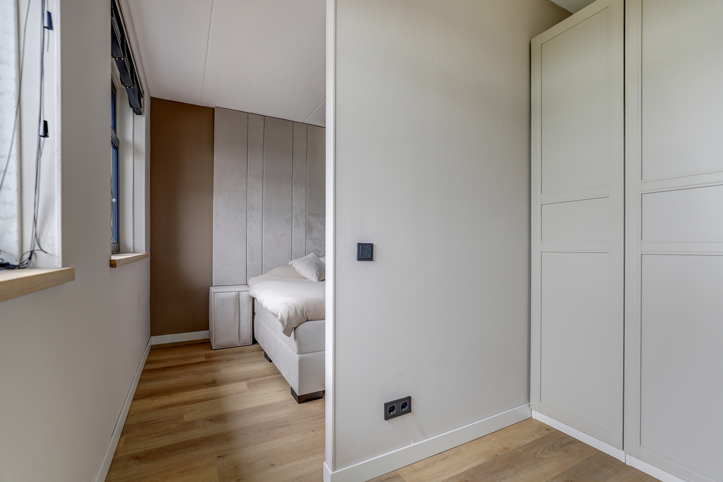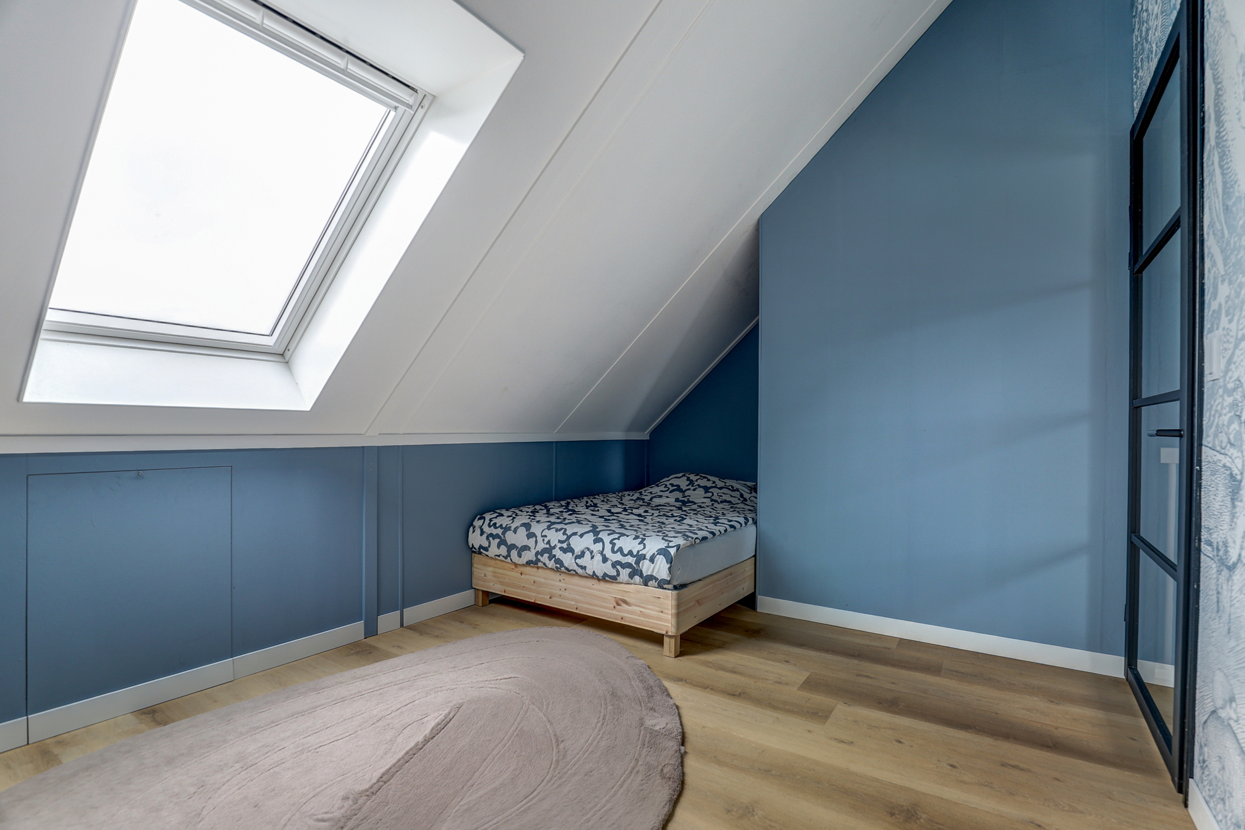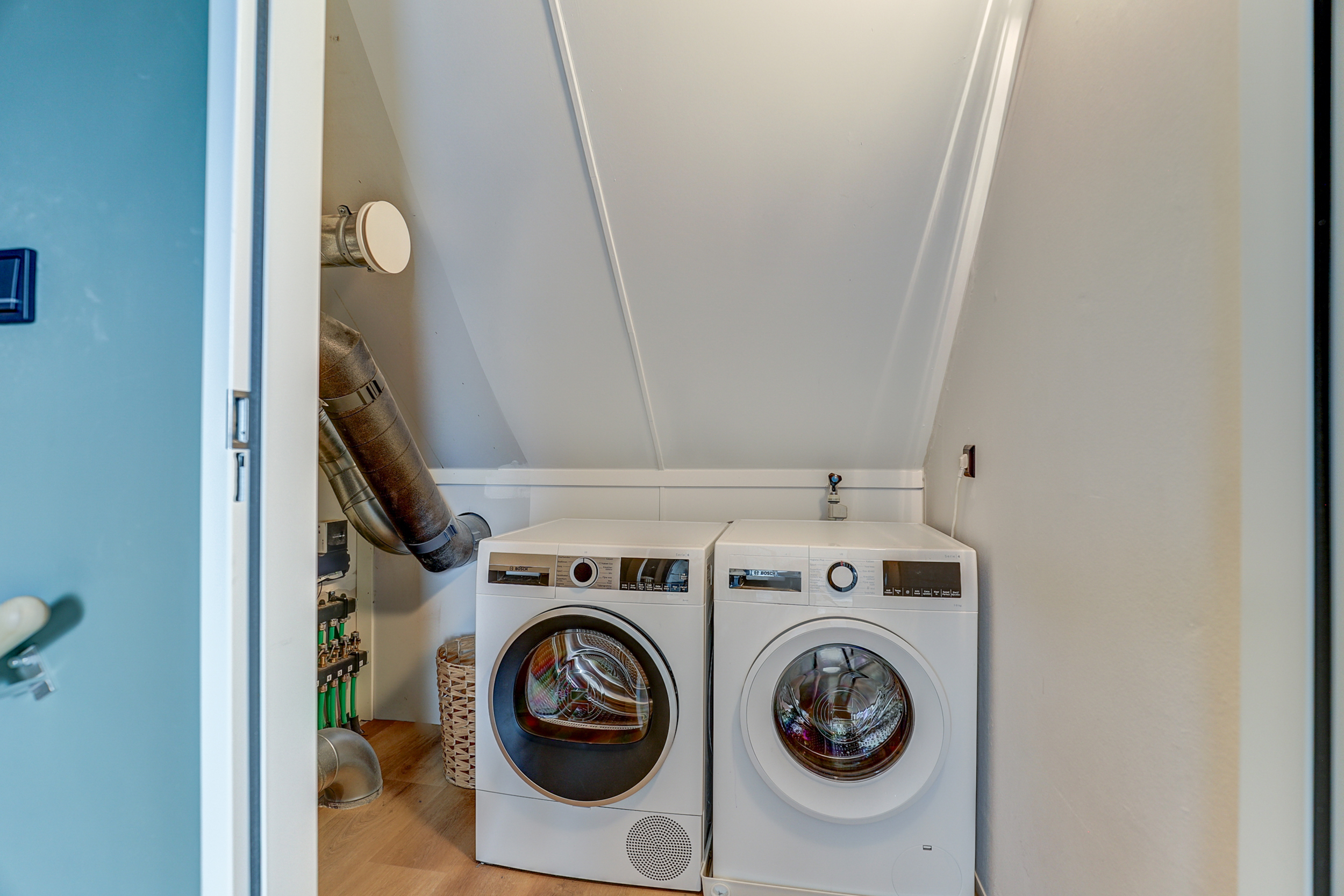 Overloop met toegang tot alle vertrekken. Hier bevindt zich de technische ruimte/wasruimte, met aansluiting voor wasapparatuur en de WTW-installatie. De derde slaapkamer is gelegen aan de achterzijde van de woning en beschikt over een dakraam en een hoge nok met opbergruimte onder het schuine dak. De vierde slaapkamer is aan de voorzijde gesitueerd en voorzien van een fraaie hoge nok, dakraam en bergruimte onder het schuine dak.