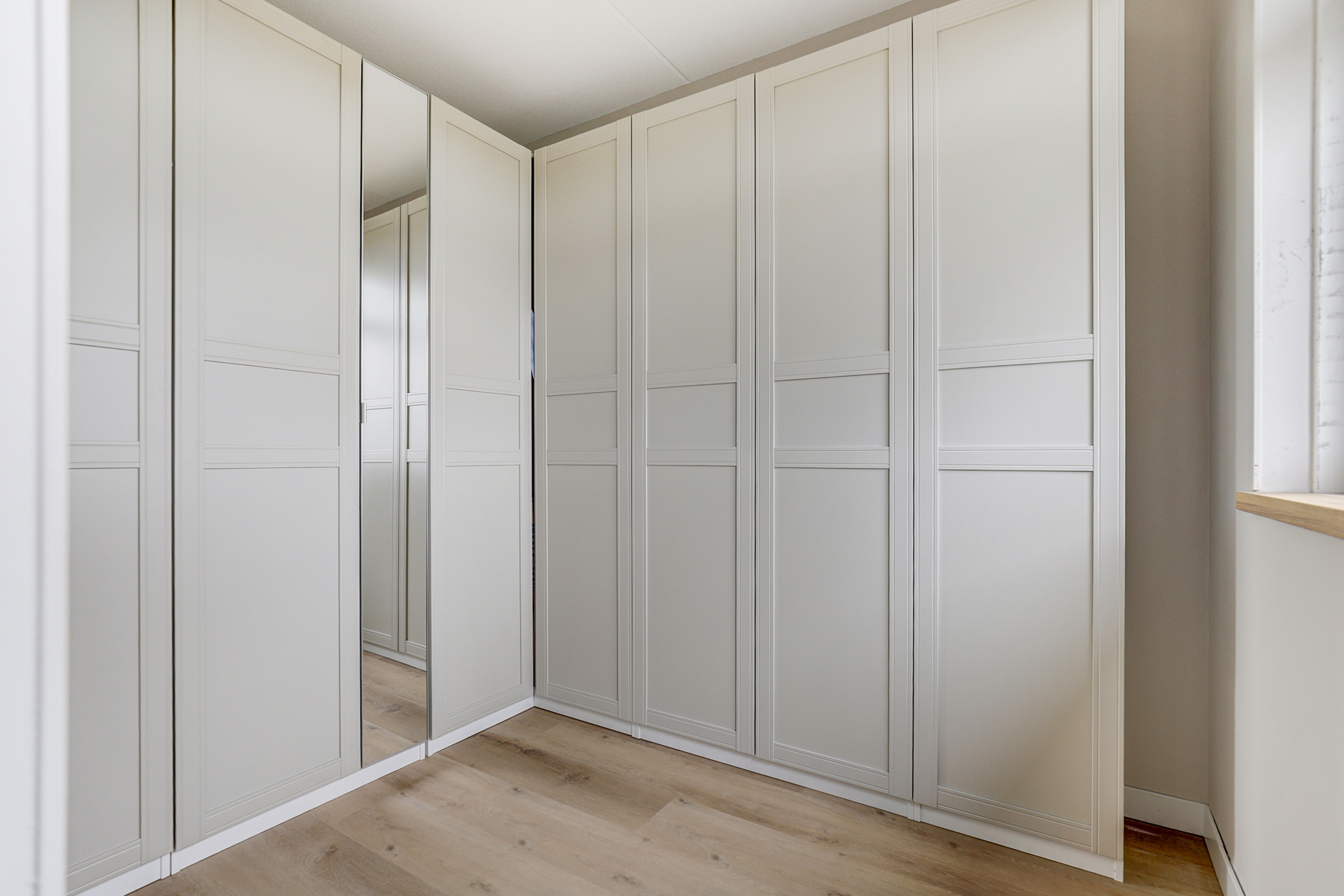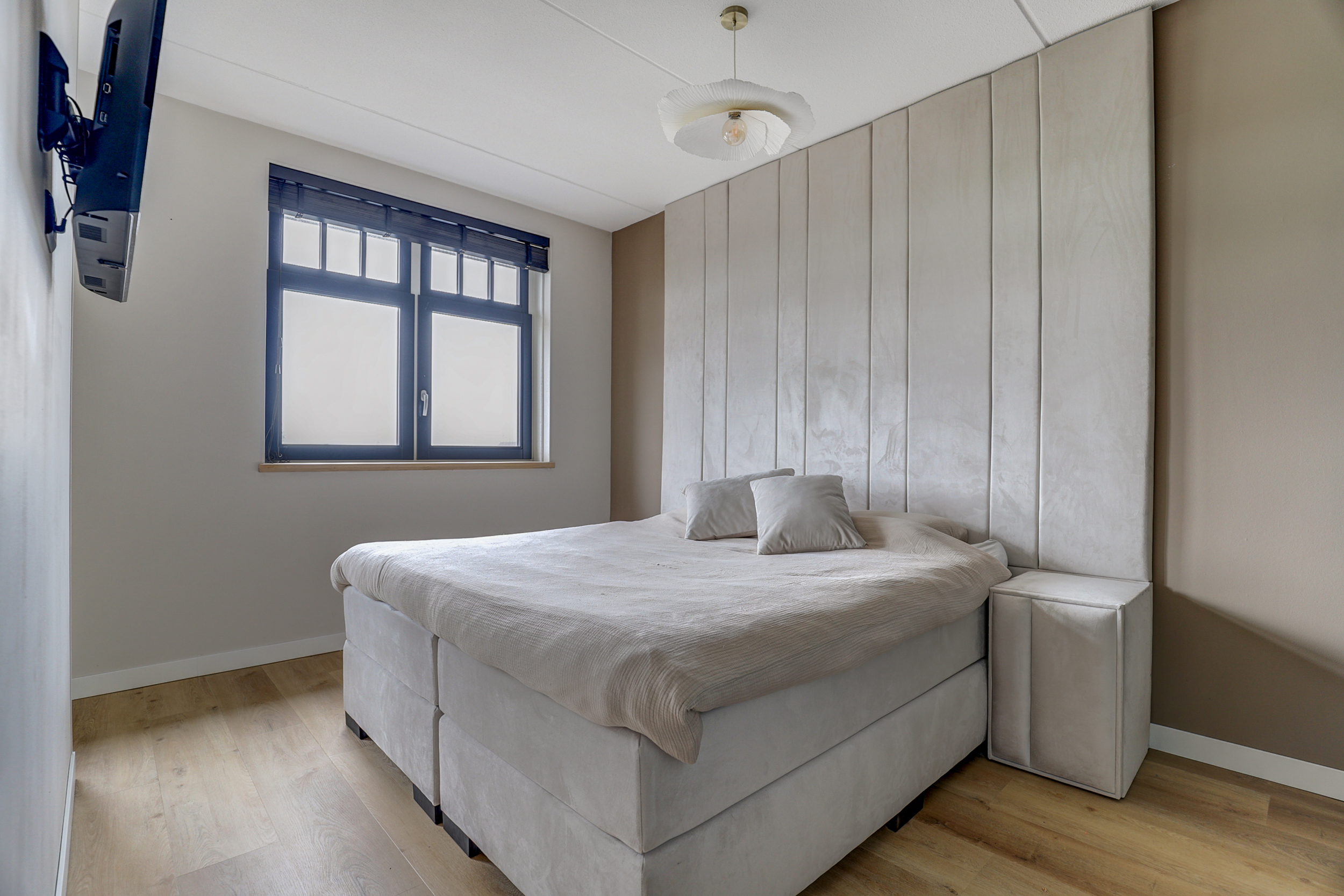Overloop met trapopgang naar de tweede verdieping en toegang tot alle vertrekken. De eerste zeer royale slaapkamer is gelegen aan de tuinzijde en beschikt over een inloopgarderobe. Deze kamer is afgewerkt met houten vensterbanken en glad stucwerk. De tweede slaapkamer is aan de voorzijde van de woning gesitueerd.