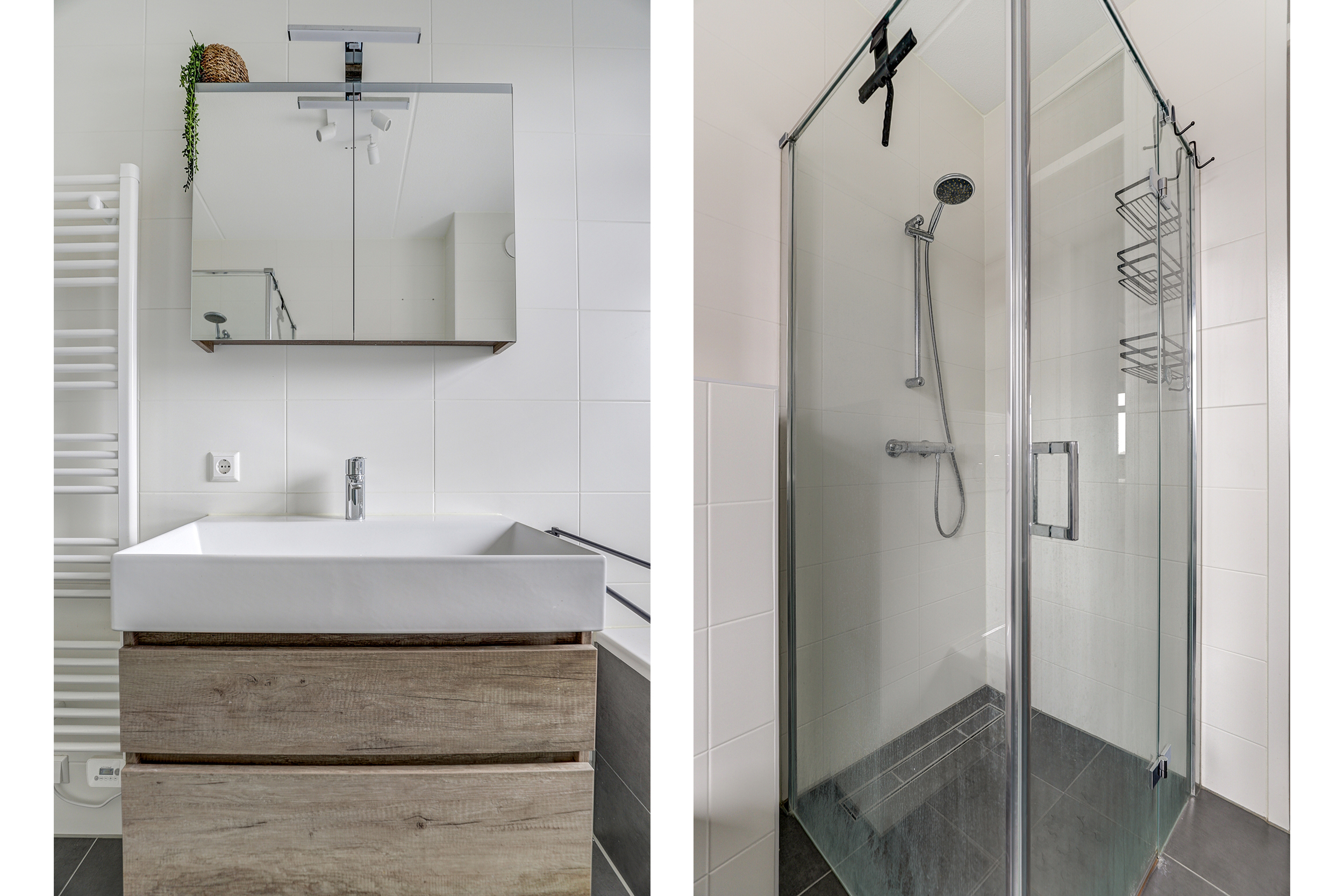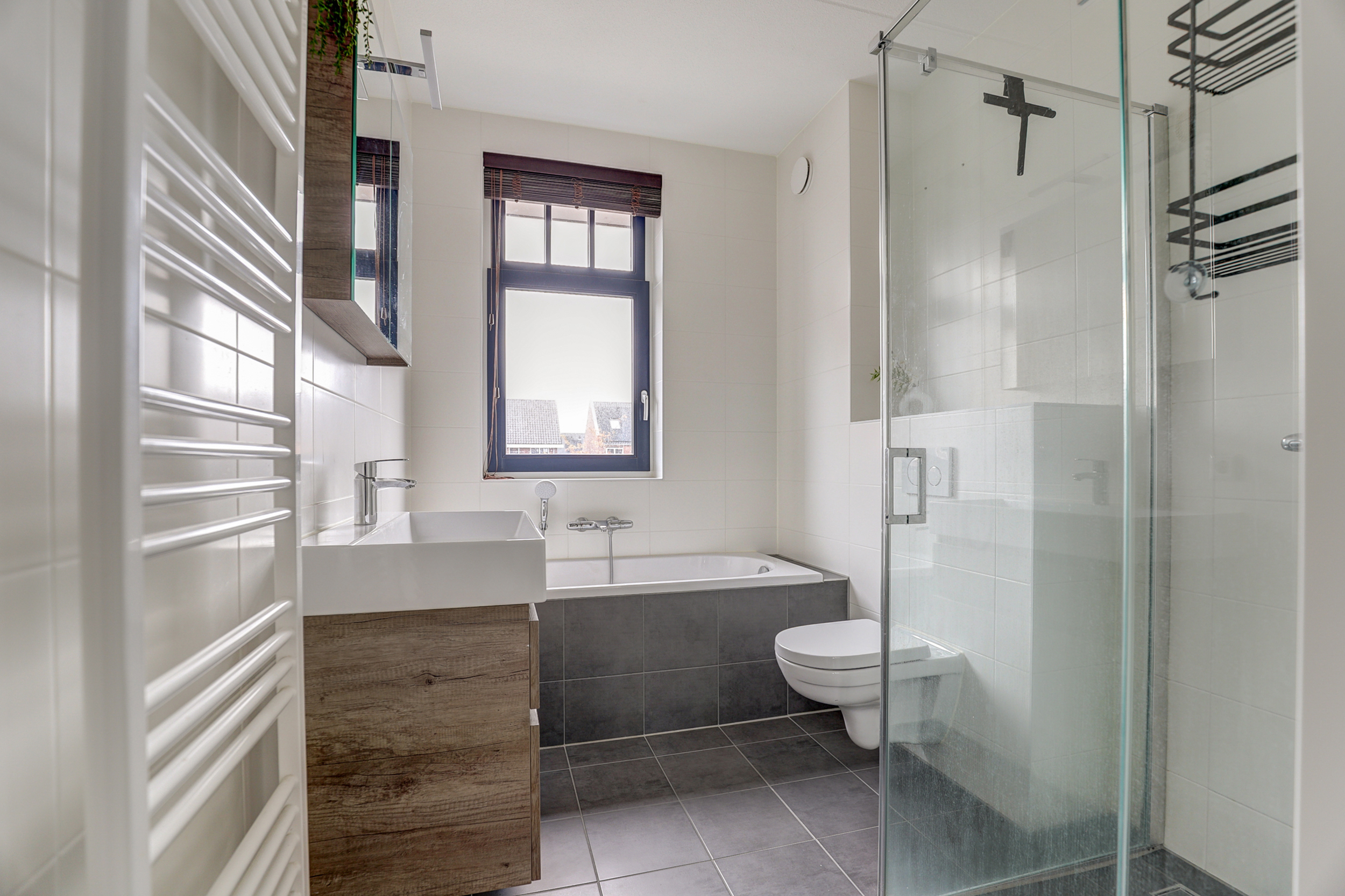 De volledig betegelde badkamer is voorzien van een ligbad, wandtoilet, wastafelmeubel met softclose laden en een douche met glazen wand en deur. De badkamer is afgewerkt met grijze vloertegels en witte wandtegels.