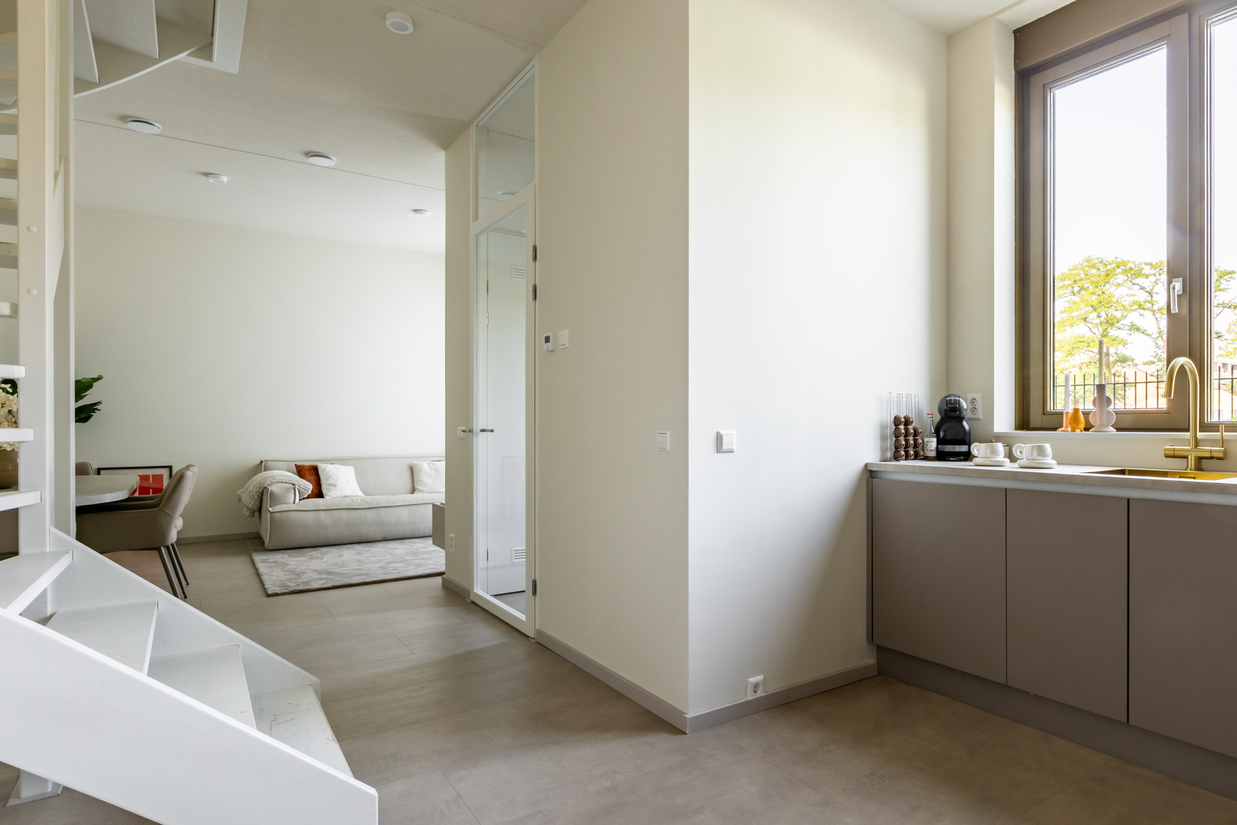 Entree met meterkast en een modern afgewerkt toilet. Vanuit de hal, middels taatsdeur toegang tot de lichte woonkamer en de open keuken. De keuken is opgesteld in L vorm en voorzien van diverse inbouwapparatuur als een kookplaat met geïntegreerde afzuiging, combi oven, vaatwasser en een koelvriescombinatie. Aangrenzend aan de keuken bevindt zich een praktische berging met de WTW-installatie, ideaal voor extra opslagruimte. De open trap naar de eerste verdieping geeft een ruimtelijk gevoel.