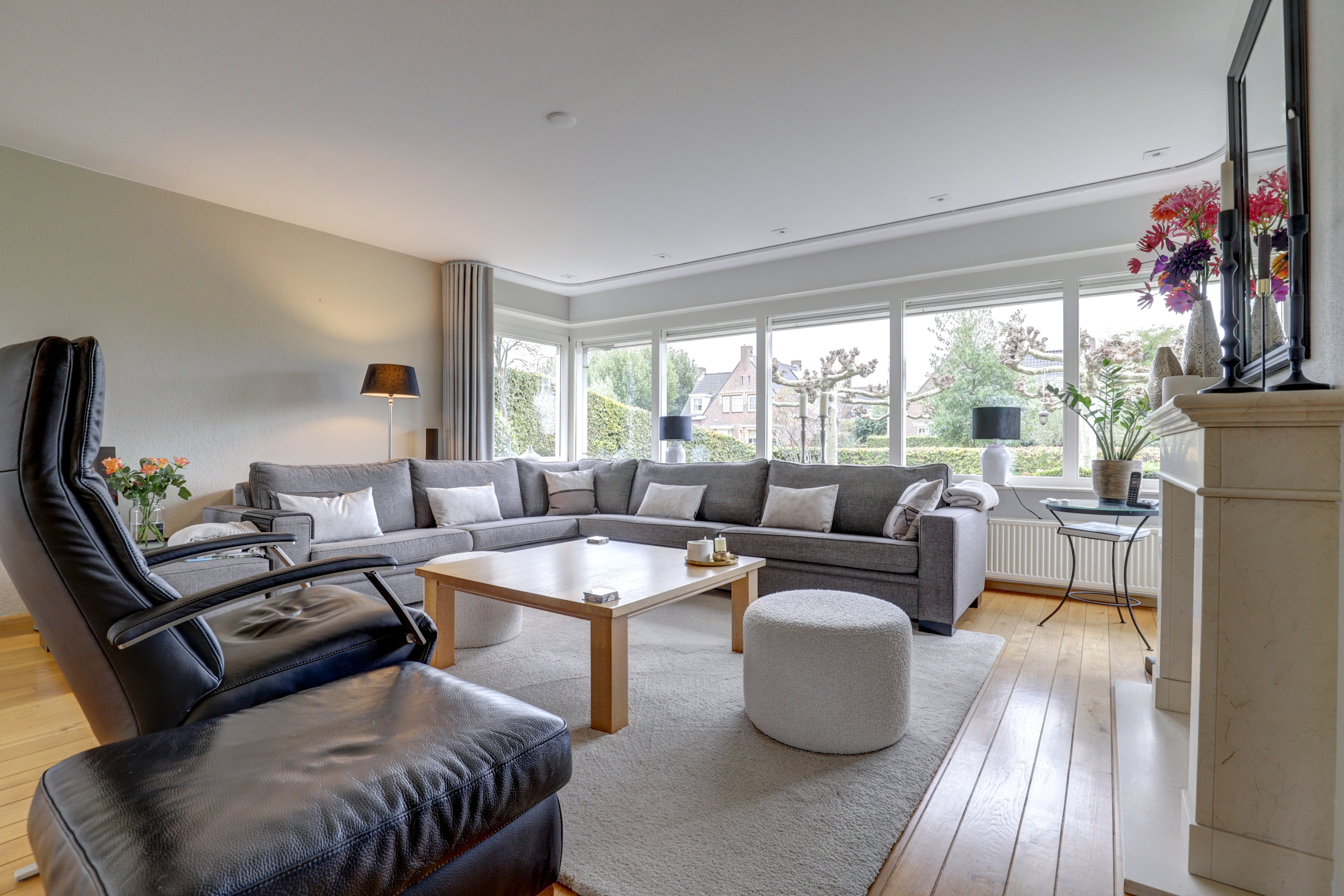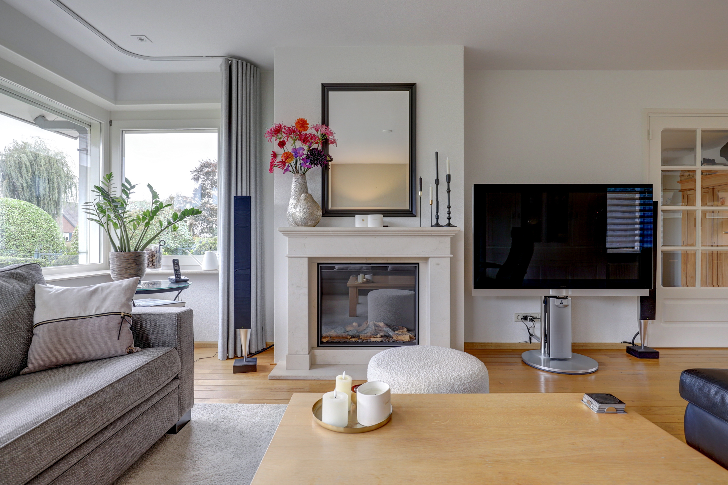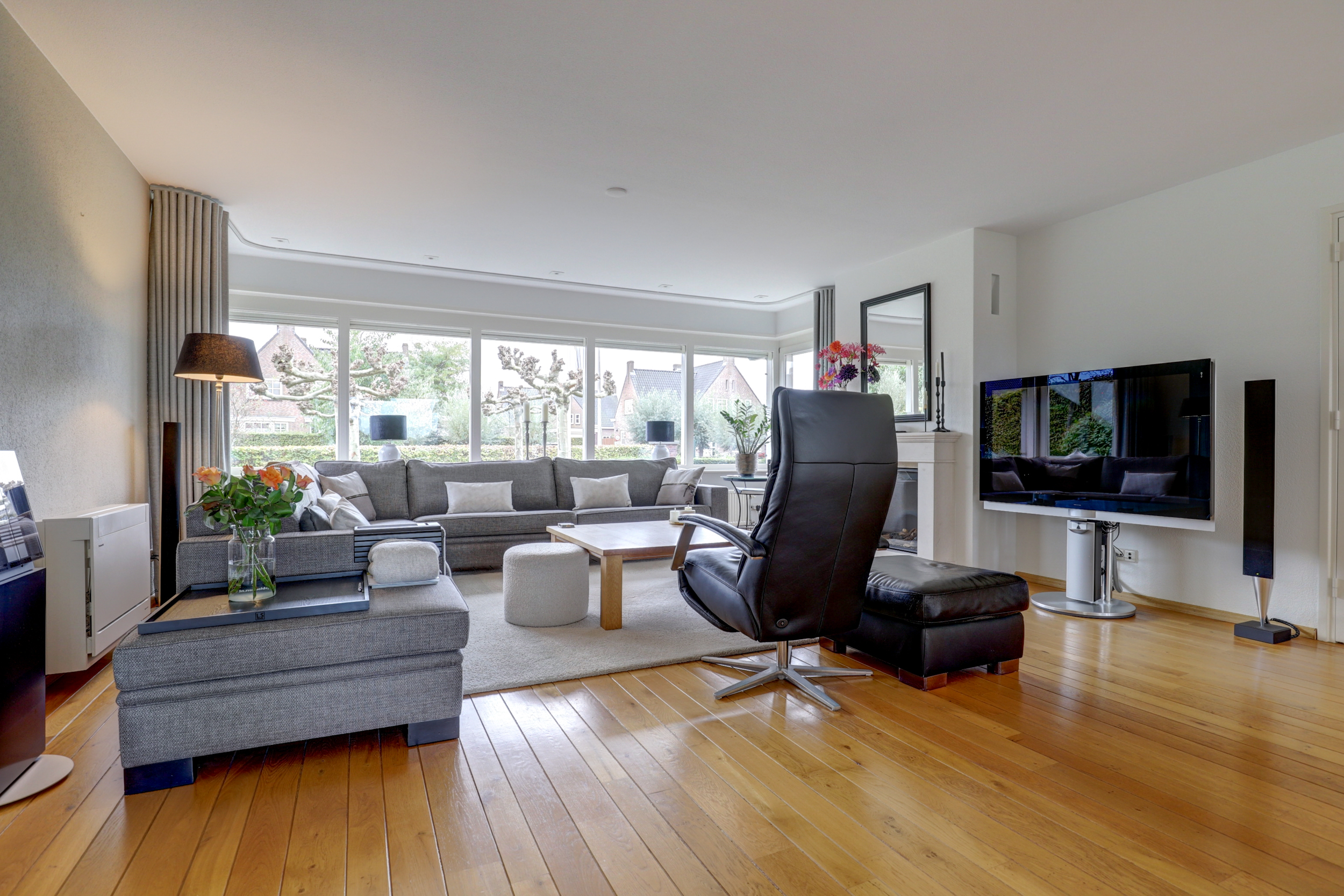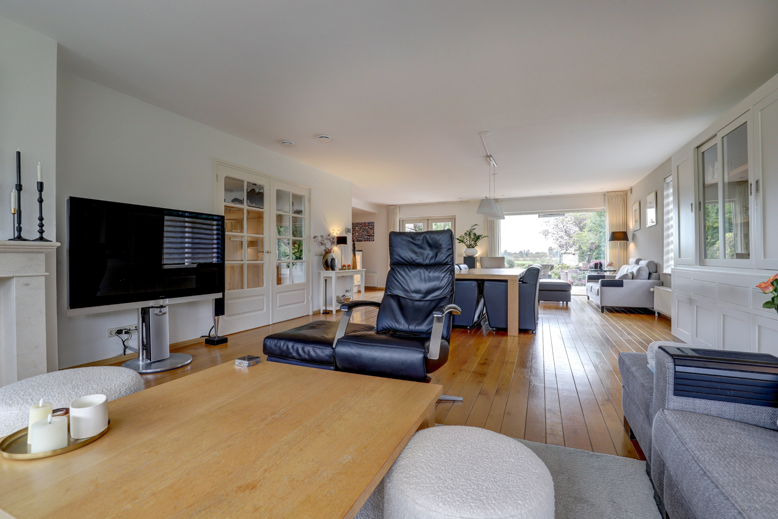- Grote, lichte living met houten vloerdelen en haard met natuurstenen schouw;