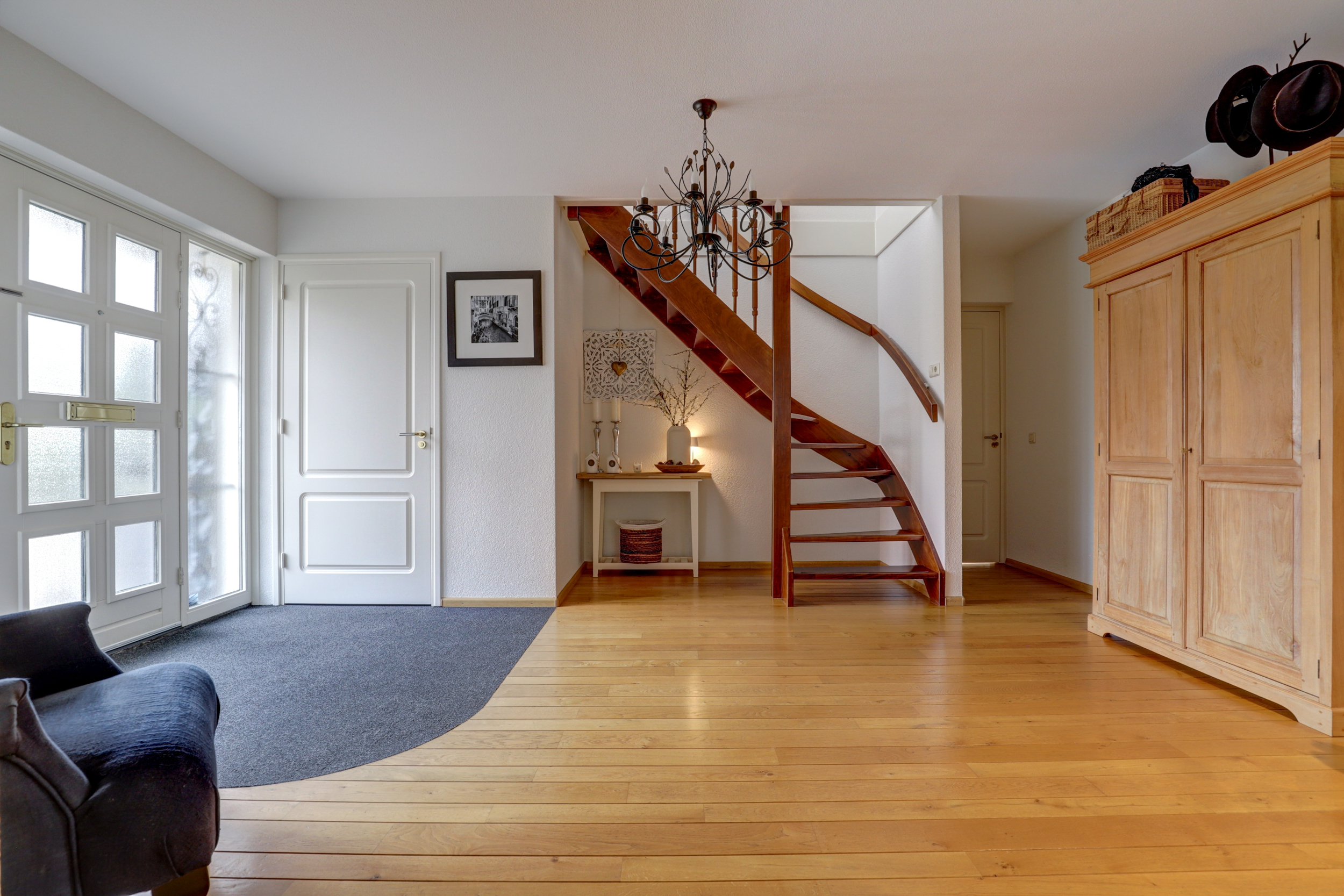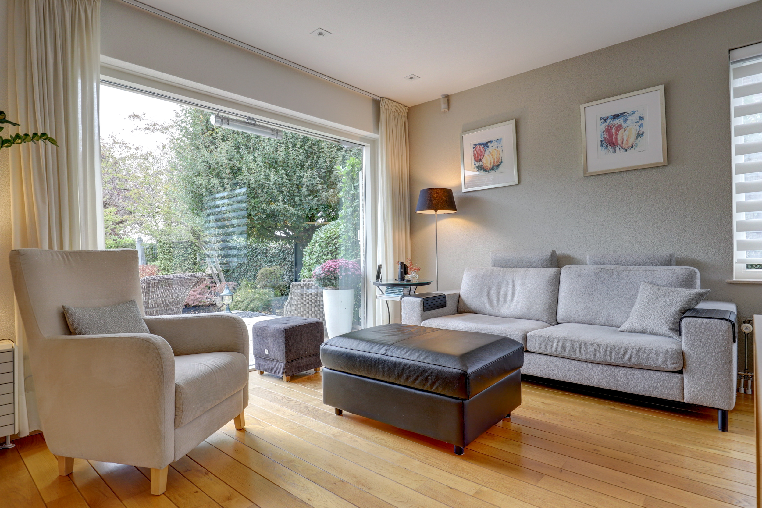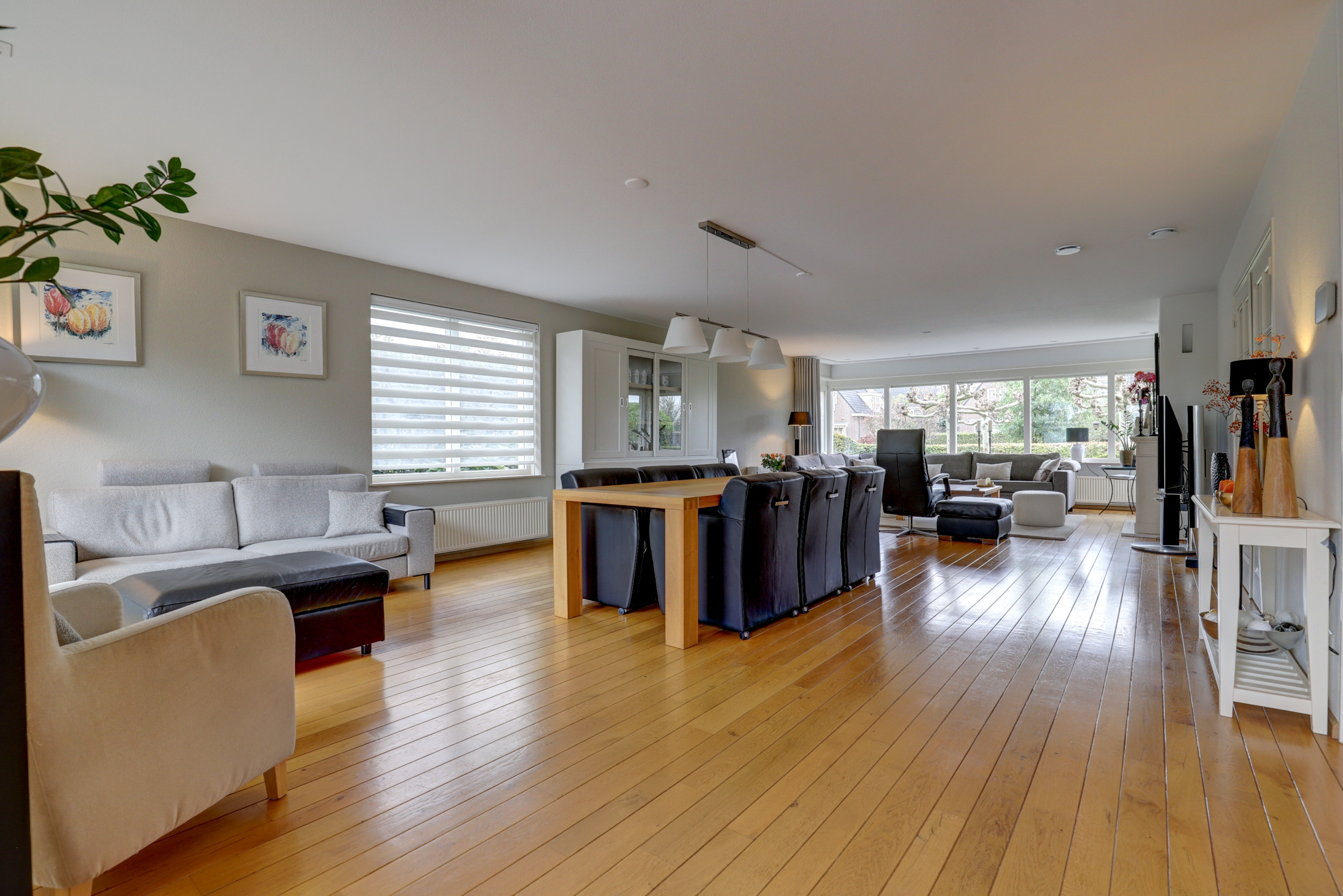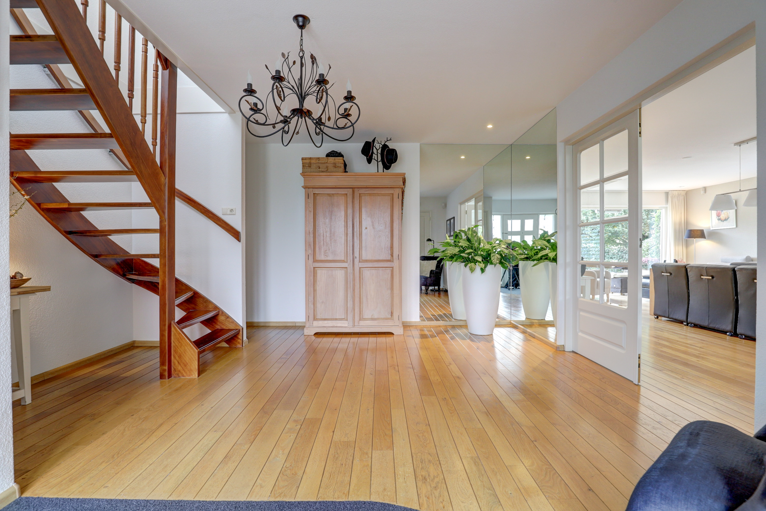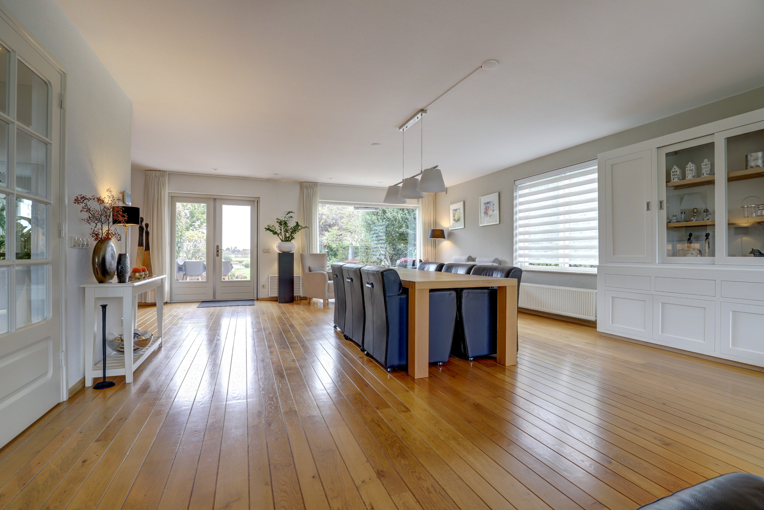 - Grote, lichte living met houten vloerdelen en haard met natuurstenen schouw;