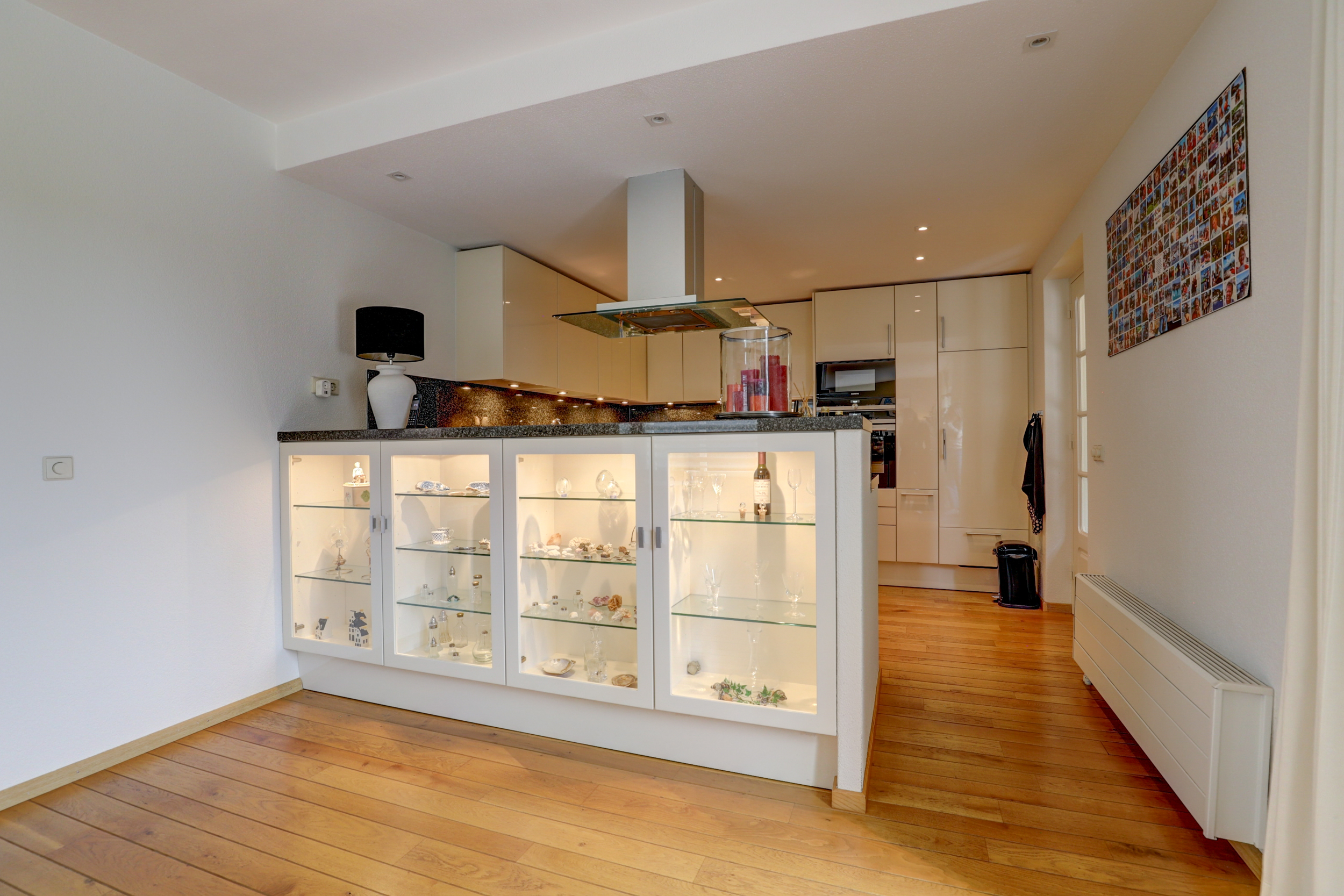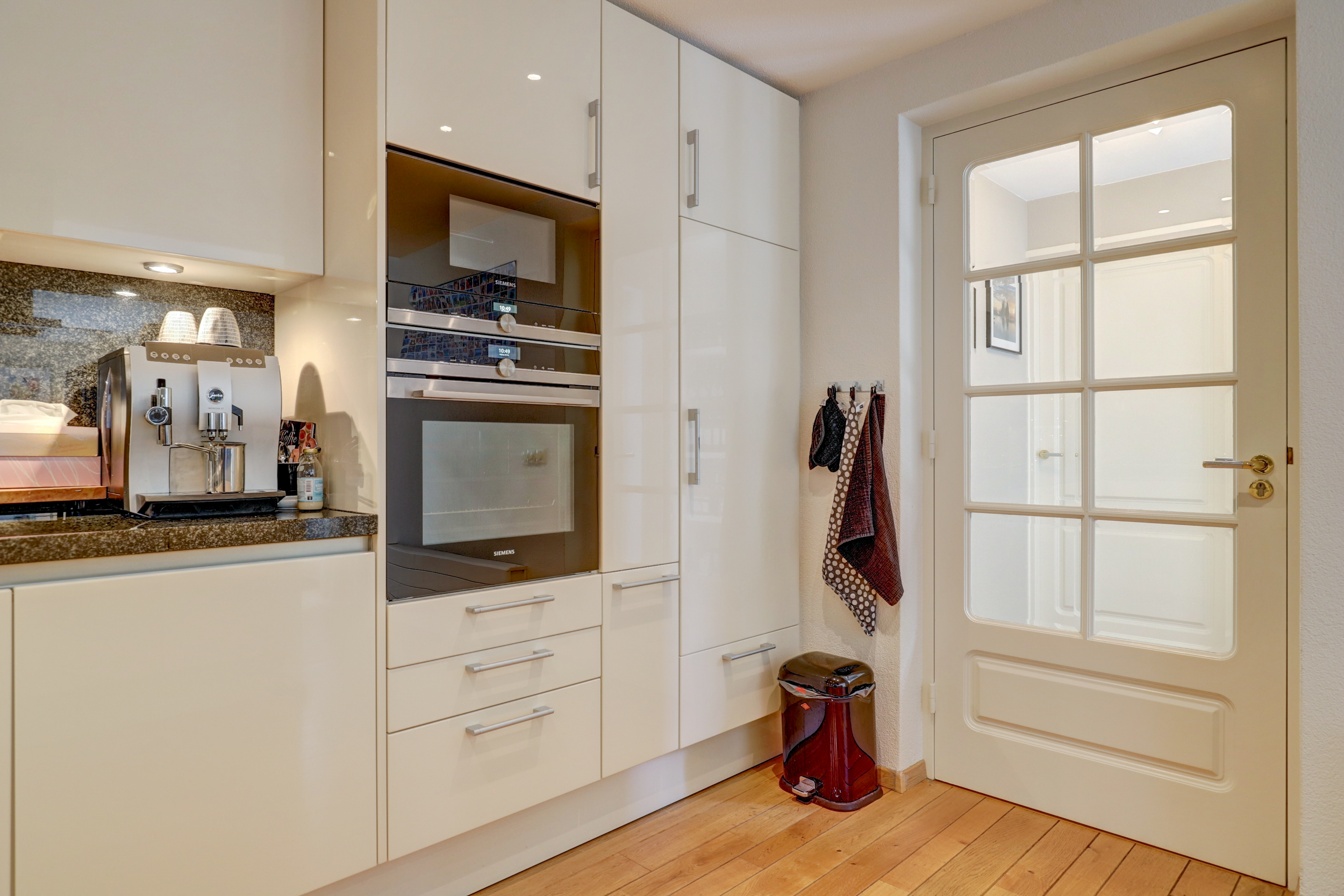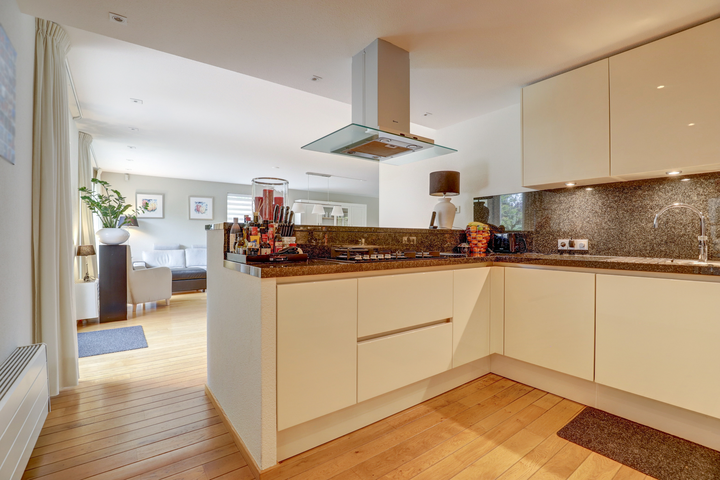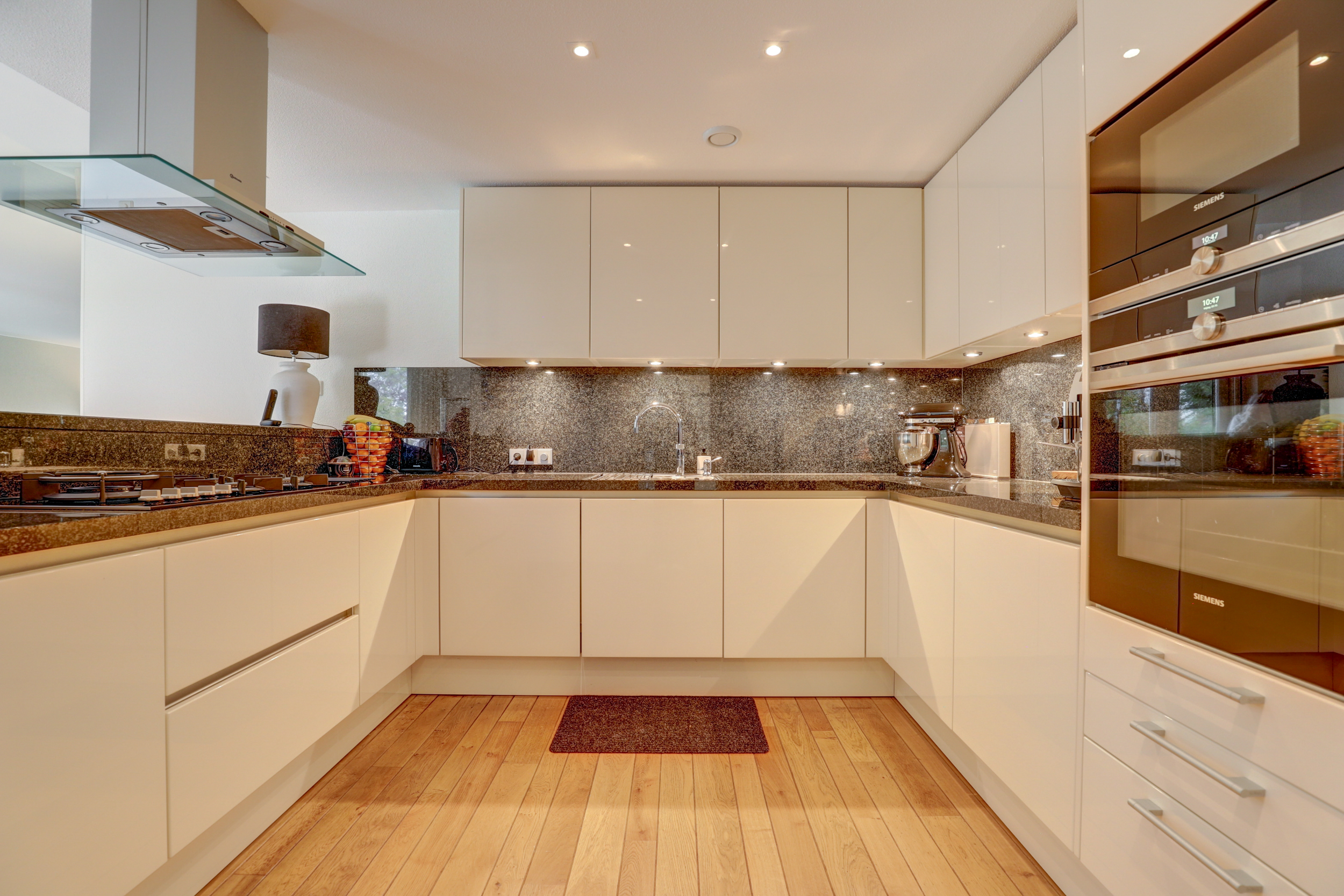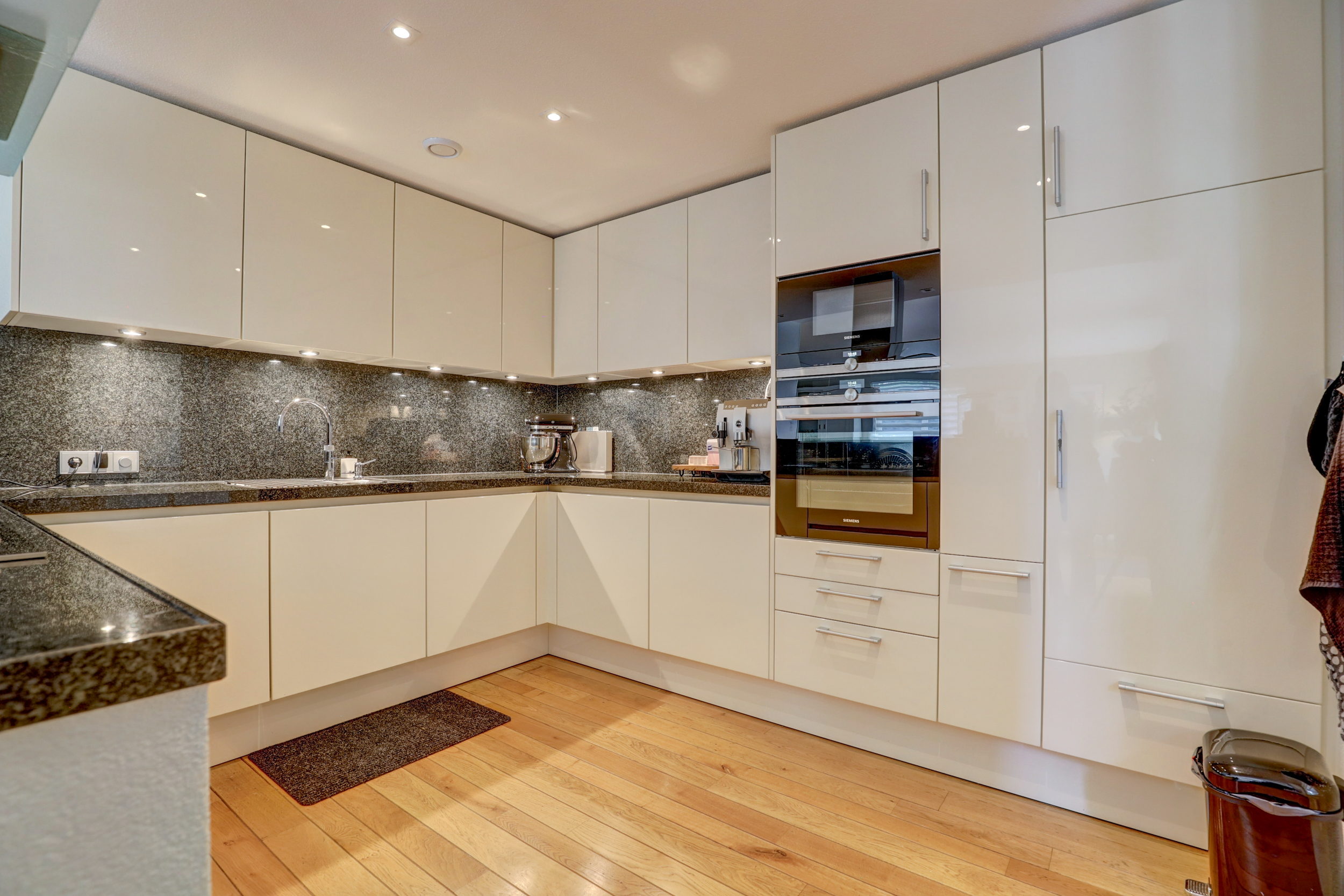De halfopen U-vormige keuken is modern en luxe uitgevoerd met greeploze, hoogglans fronten in lichte kleurstelling en een donker granieten werkblad dat als spatwand is doorgezet. Aan de zijde van de woonkamer bevindt zich bovendien een stijlvol kookeiland met een ingebouwde servieskast, die zorgt voor een elegante overgang tussen keuken en living. De opstelling biedt veel kastruimte en is voorzien van inbouwapparatuur, waaronder een breed gaskooktoestel met glazen afzuigkap, dubbele Siemens-oven (waarvan één met magnetronfunctie), vaatwasser en koel/vriescombinatie. Spots in plafond en onderkasten zorgen voor rijke werkverlichting.