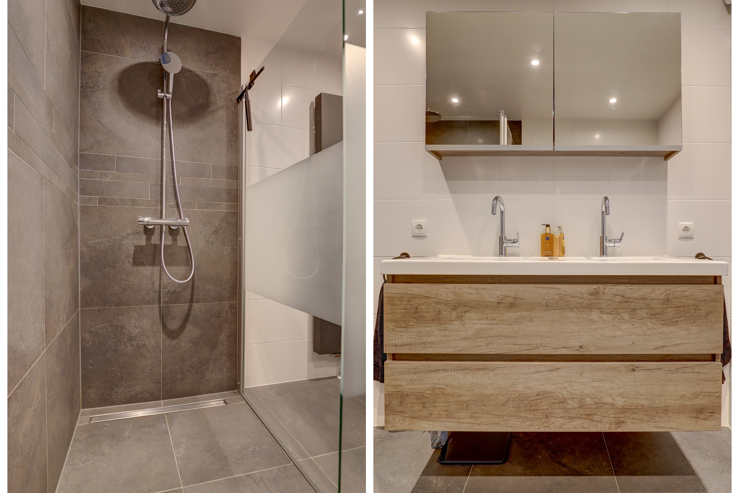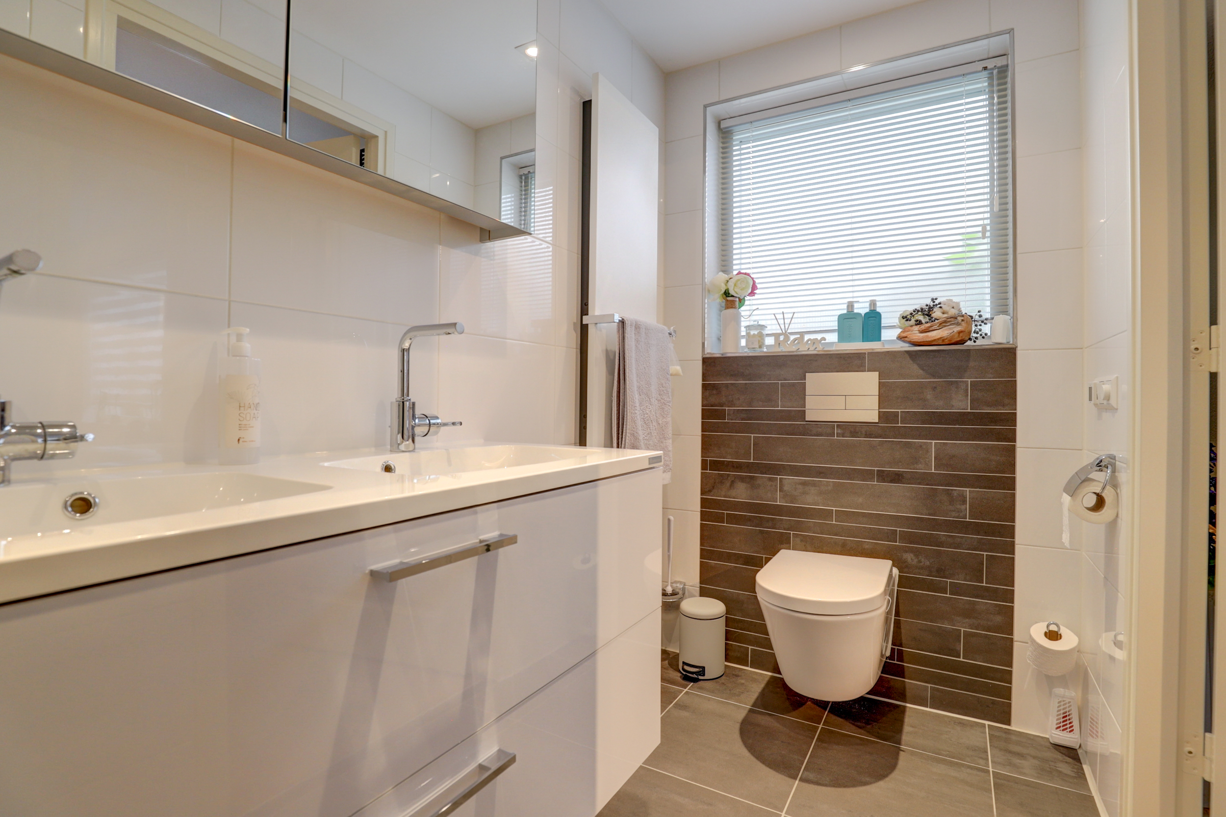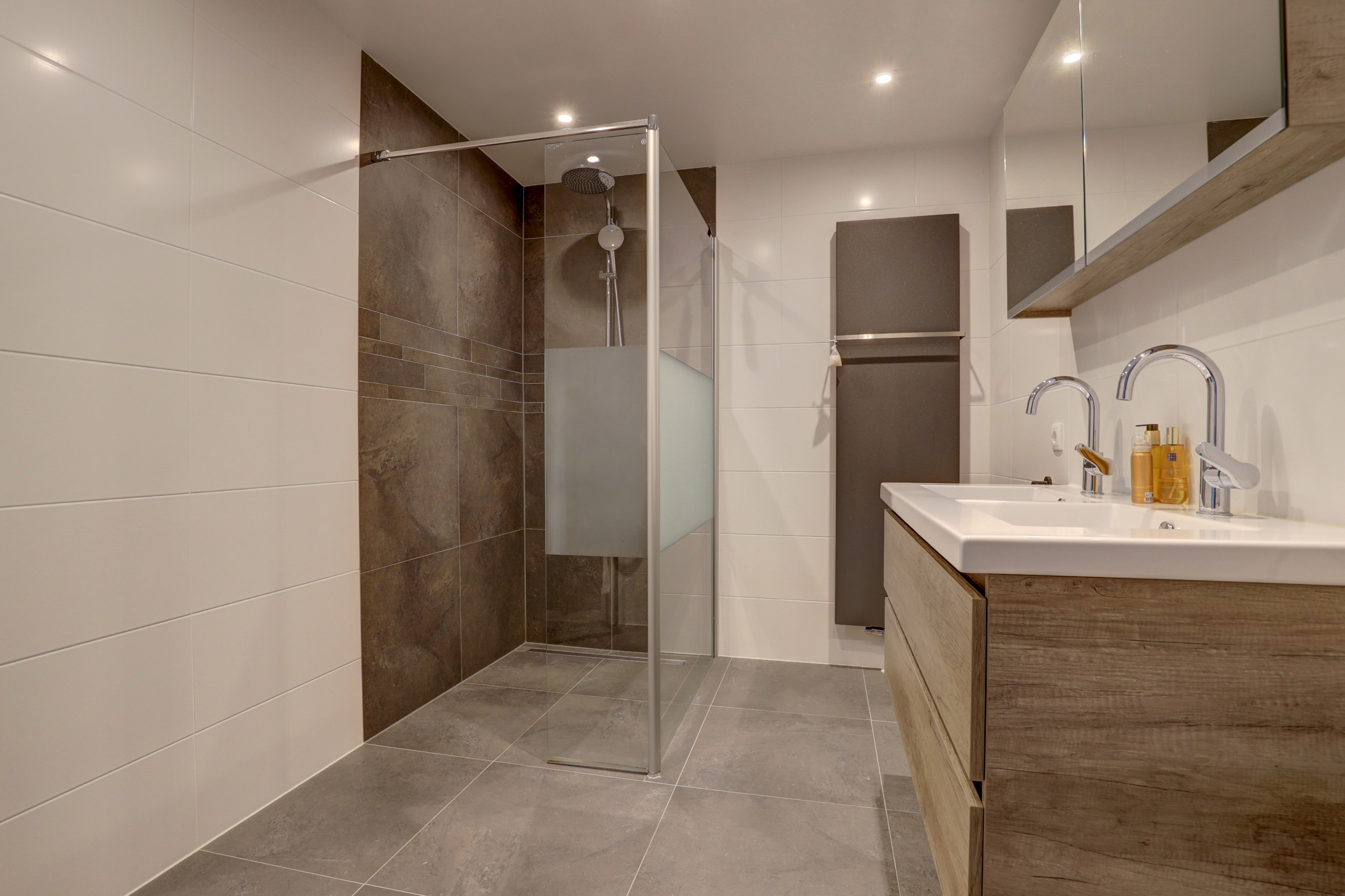 De badkamer is eigentijds en stijlvol, grote grijs/antracietkleurige vloertegels, wit wandtegelwerk en een warme bruintint accentwand met horizontale sierbaan. Er is een riante inloopdouche met regendouche en helder glas, een dubbele wastafel met houtlook meubel, brede spiegelkast en een verticale designradiator.