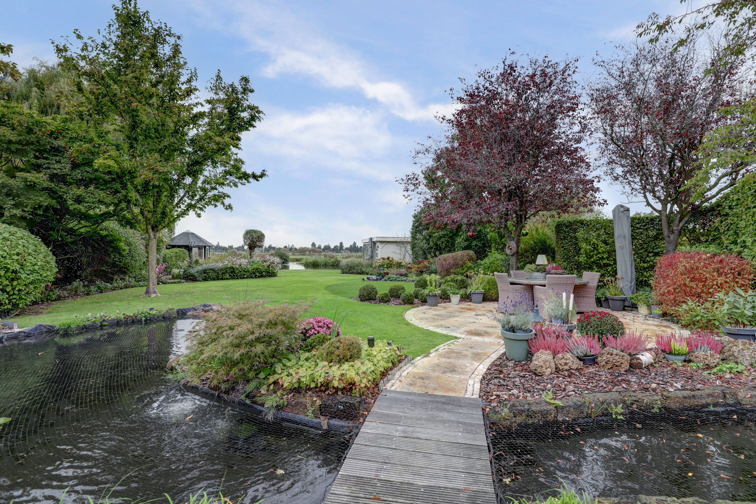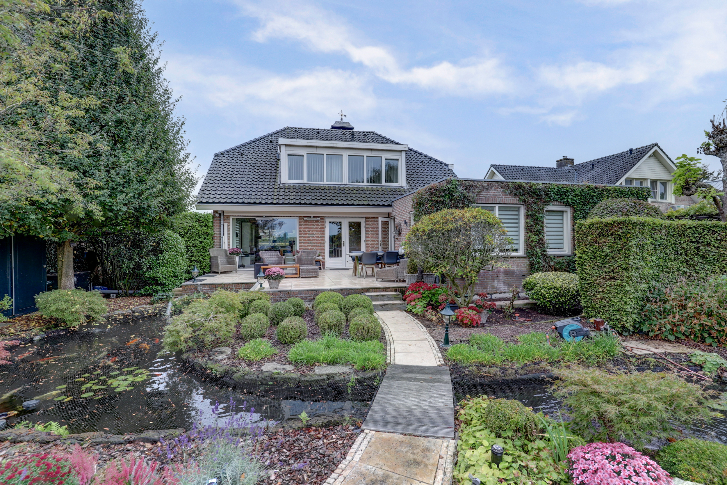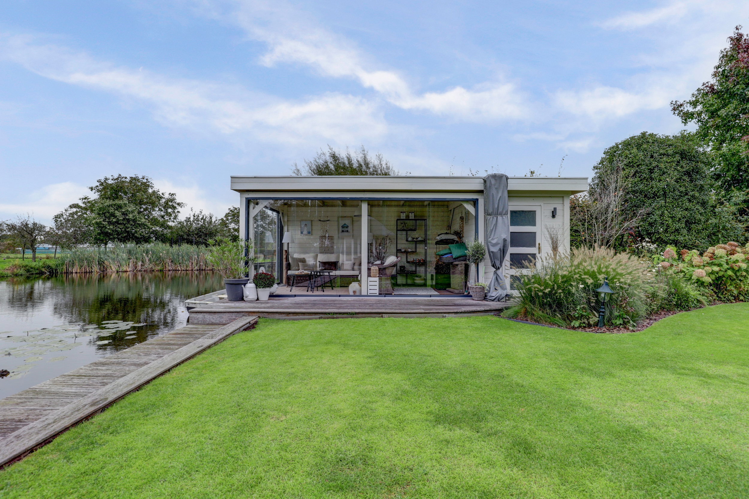– Prachtig aangelegde tuin met vijver, meerdere terrassen, tuinverblijf met glas en eigen steiger;