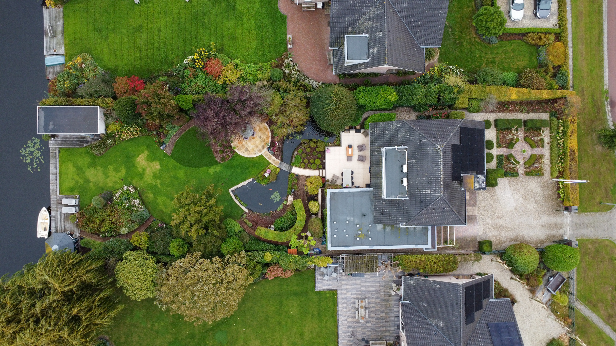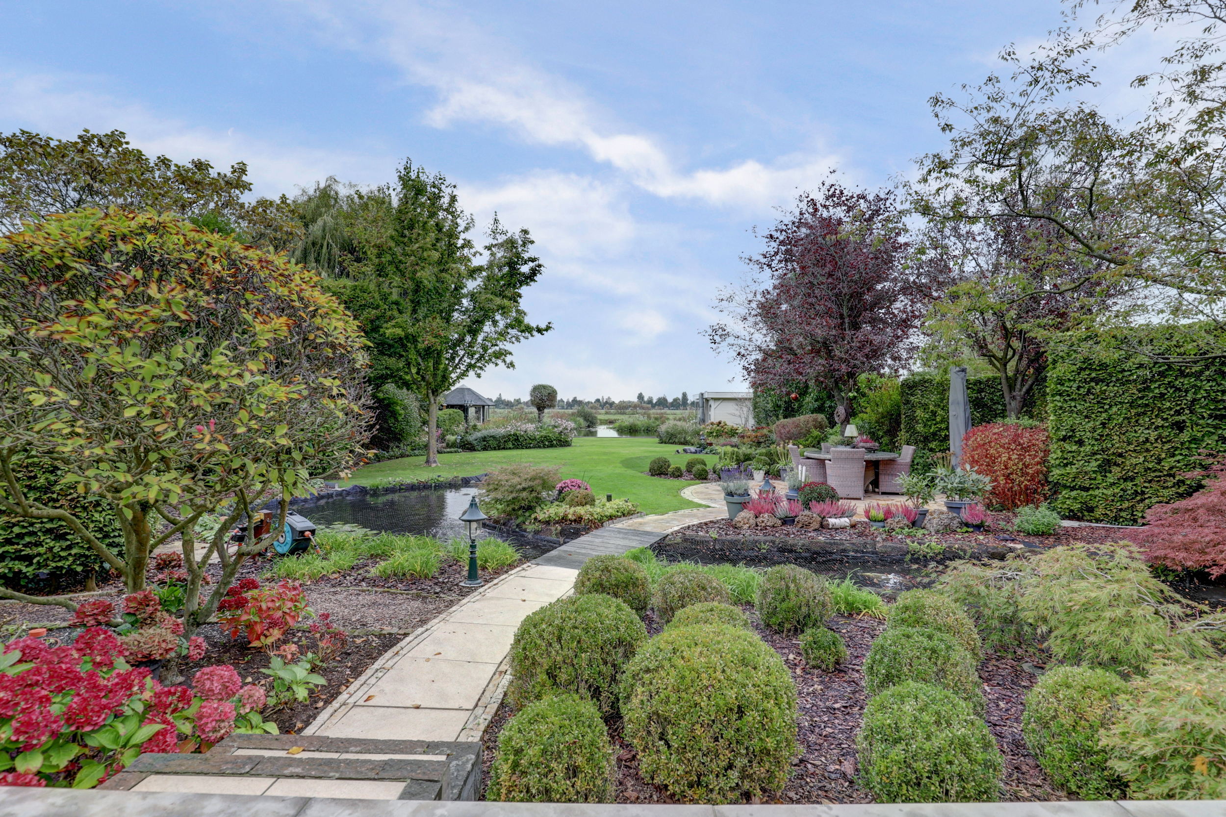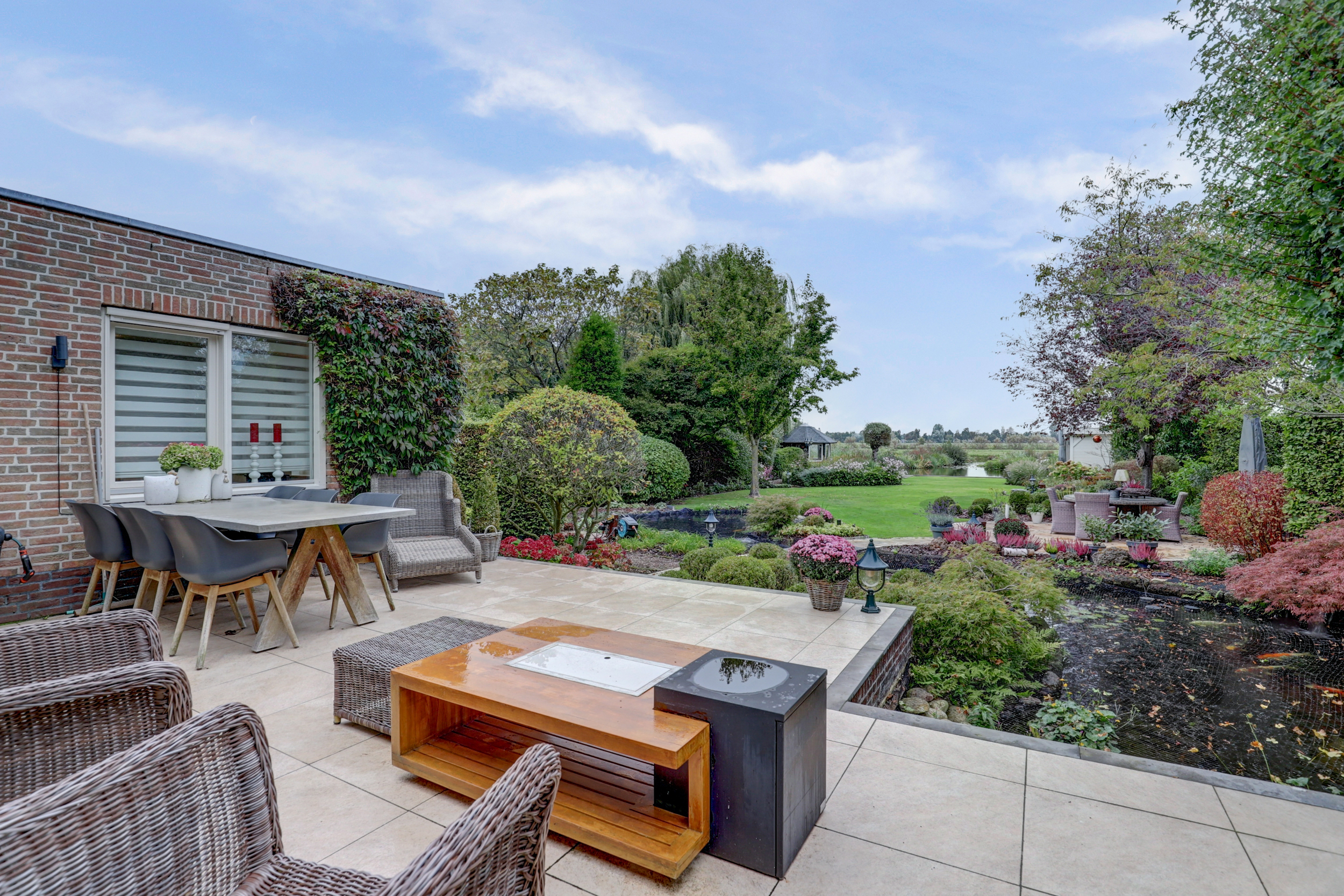 – Prachtig aangelegde tuin met vijver, meerdere terrassen, tuinverblijf met glas en eigen steiger;