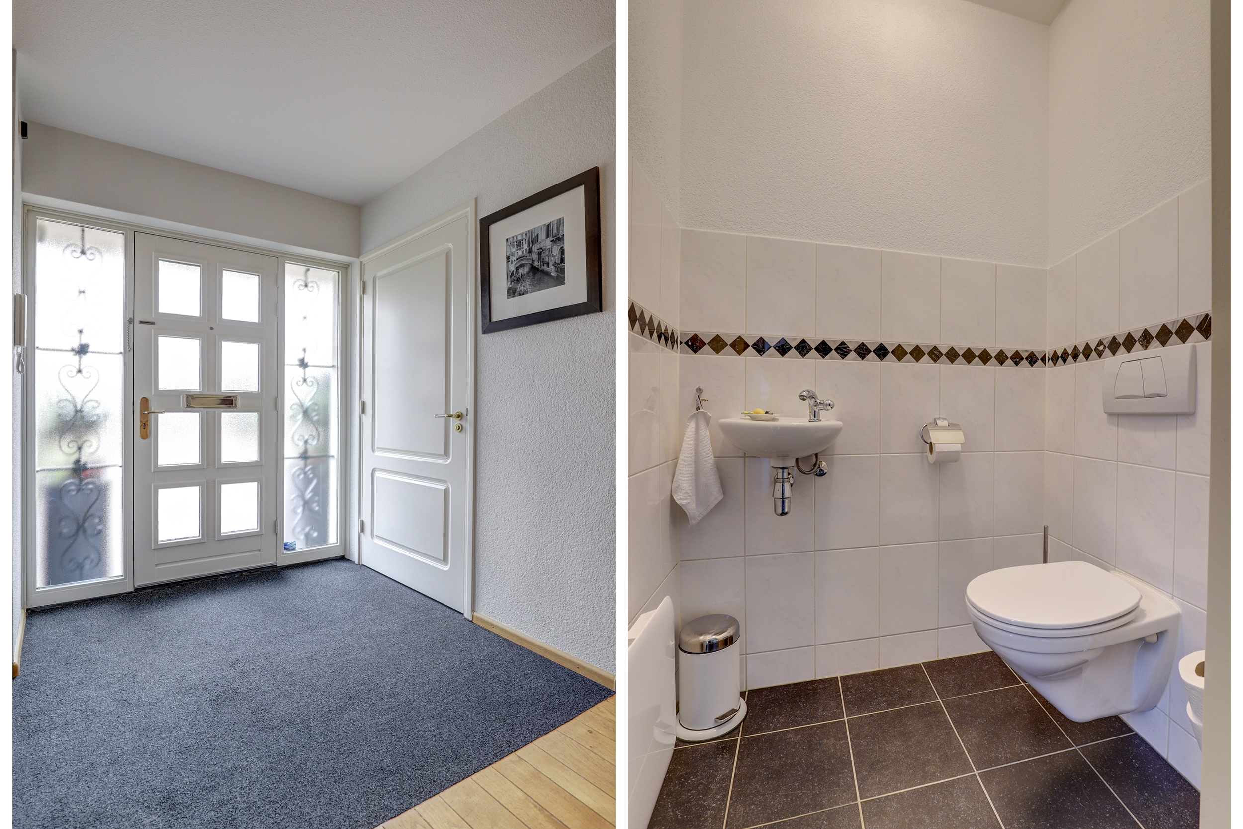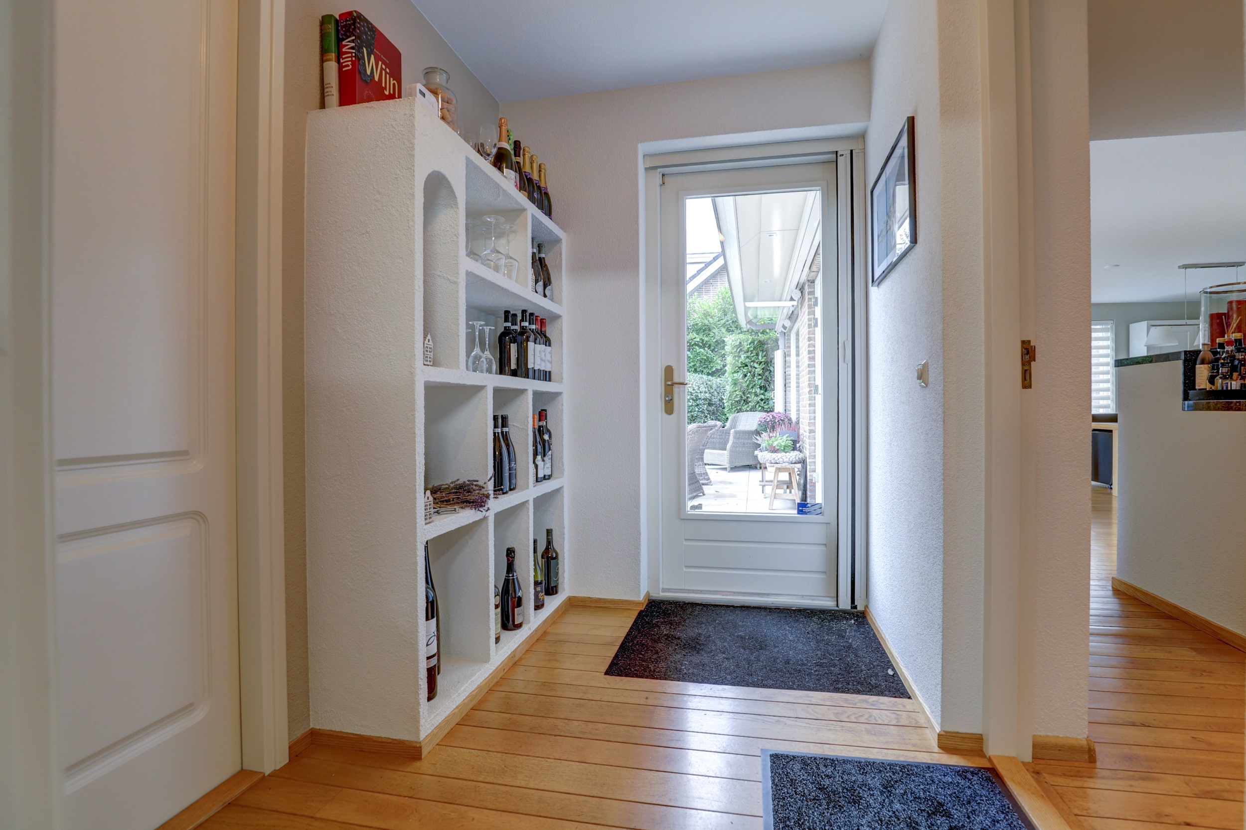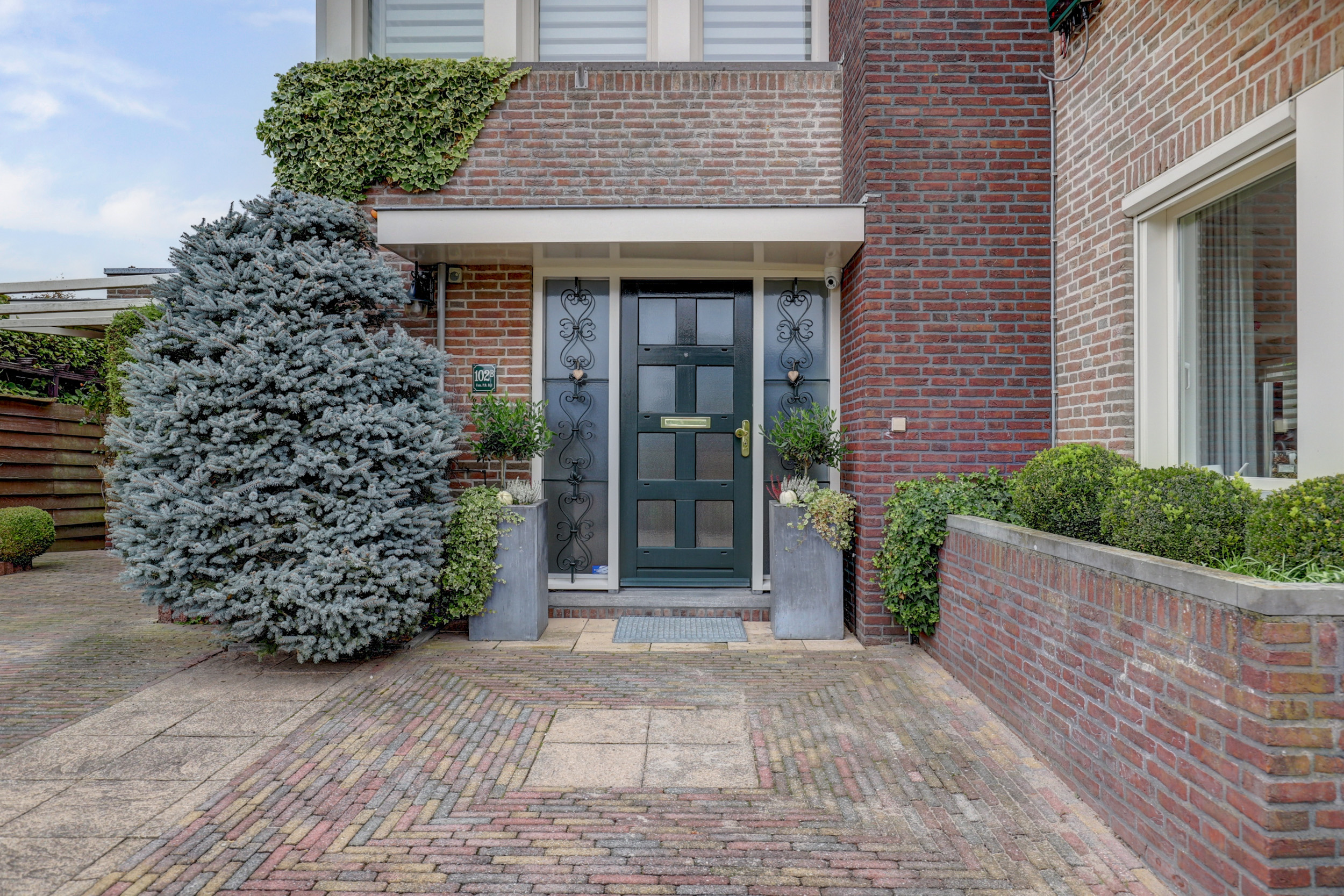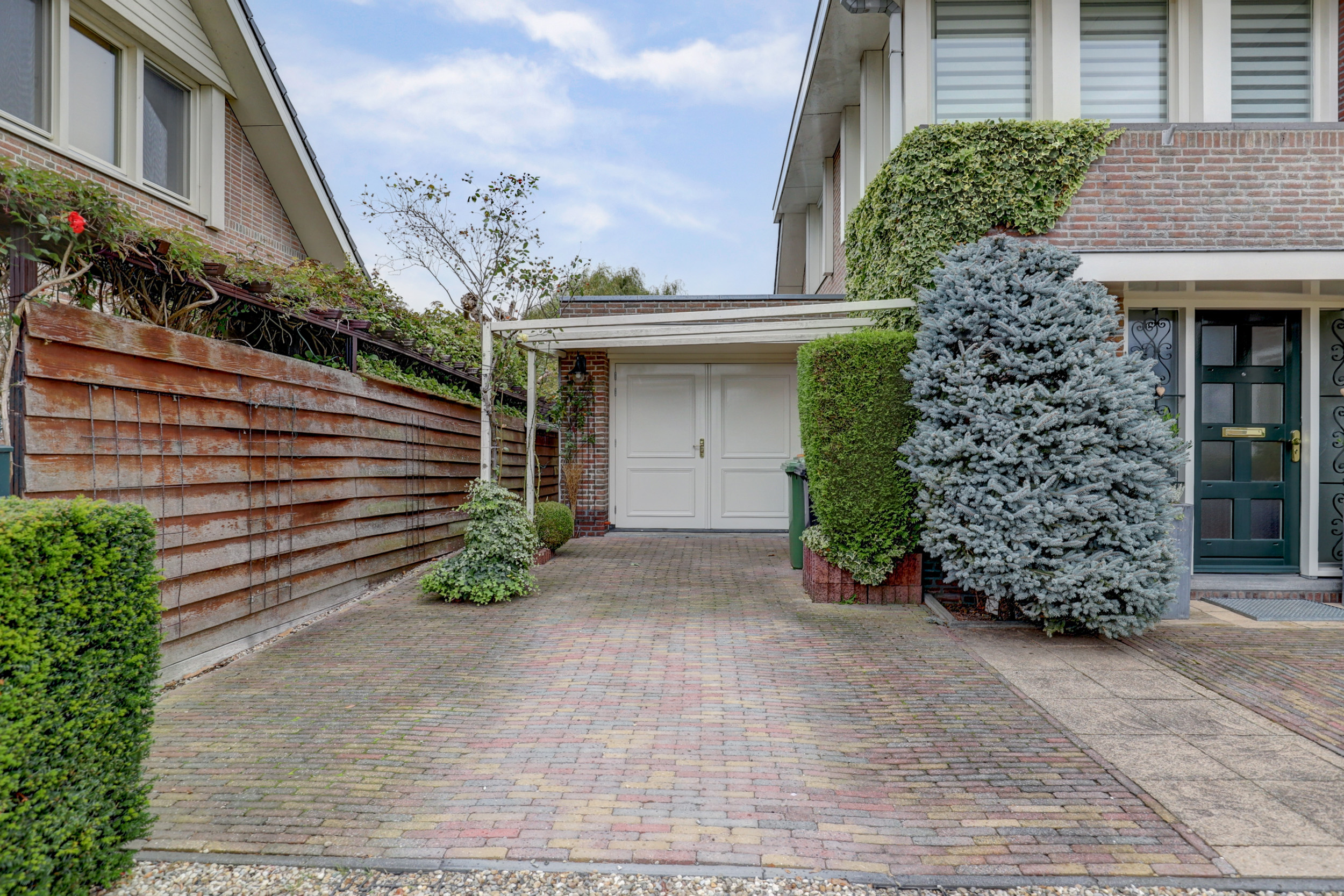 Via de brede grind oprit, met plaats voor meerdere auto’s en toegang tot de (fietsen)berging/garage met dubbele deuren, bereikt u de overdekte entree.