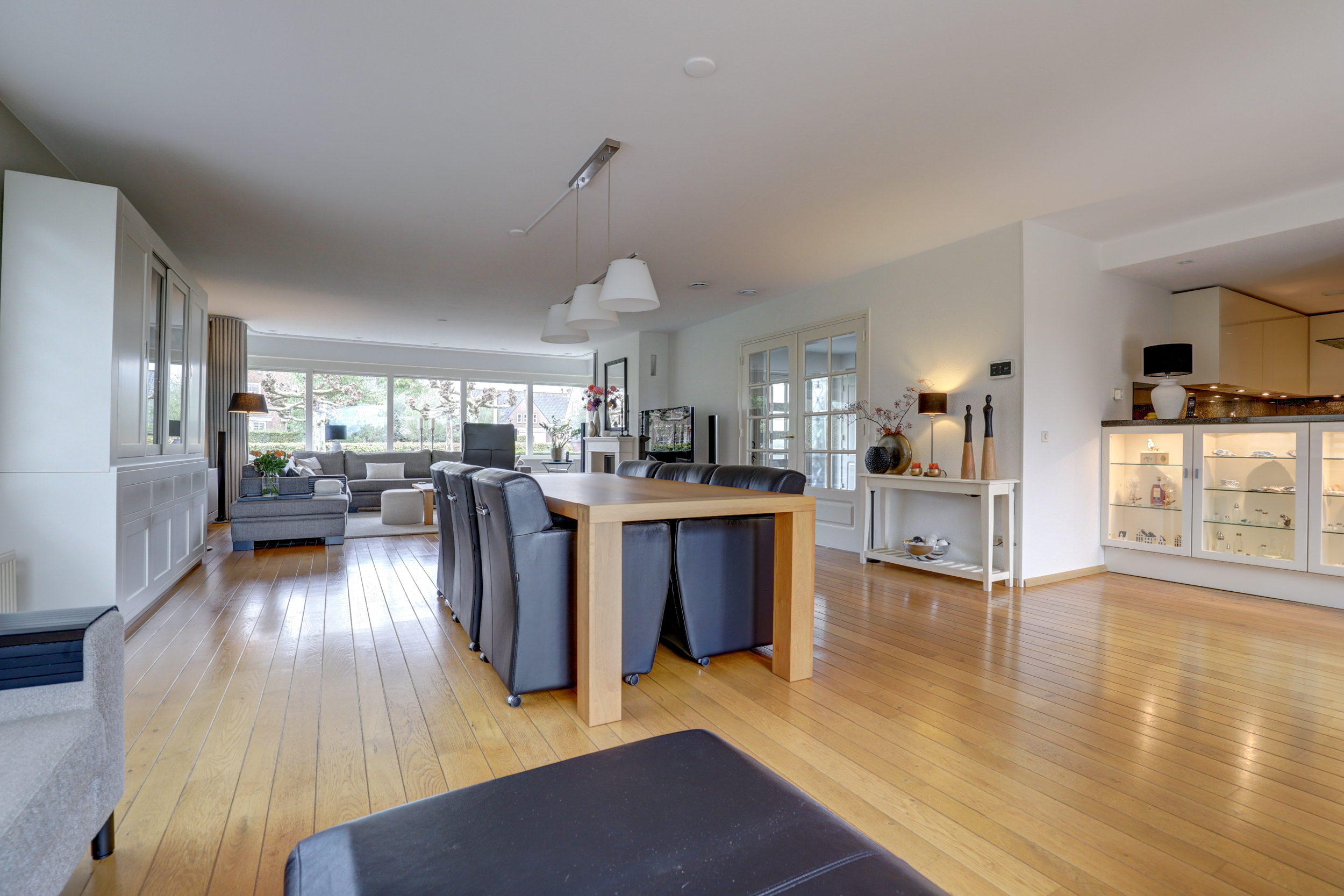 Binnen komt u in een representatieve hal met meterkast, trapopgang, toilet en garderoberuimte. De living is bijzonder royaal en heerlijk licht door de bijna kamerbrede raampartijen rondom en de prachtige erker aan de voorzijde. Deze erker, met zijn brede vensters en karakteristieke vorm, zorgt voor extra lichtinval en geeft het zitgedeelte een sfeervolle uitstraling met zicht op de voortuin. Aan de tuinzijde bevindt zich nog een extra zithoekje, perfect om te genieten van het uitzicht op de achtertuin. Tussen deze twee zitgedeeltes in ligt de eetkamer, met dubbele tuindeuren naar het grote terras. Deze centrale positie verbindt de ruimtes op natuurlijke wijze en biedt plek voor een lange eettafel, ideaal voor gezellige diners!
